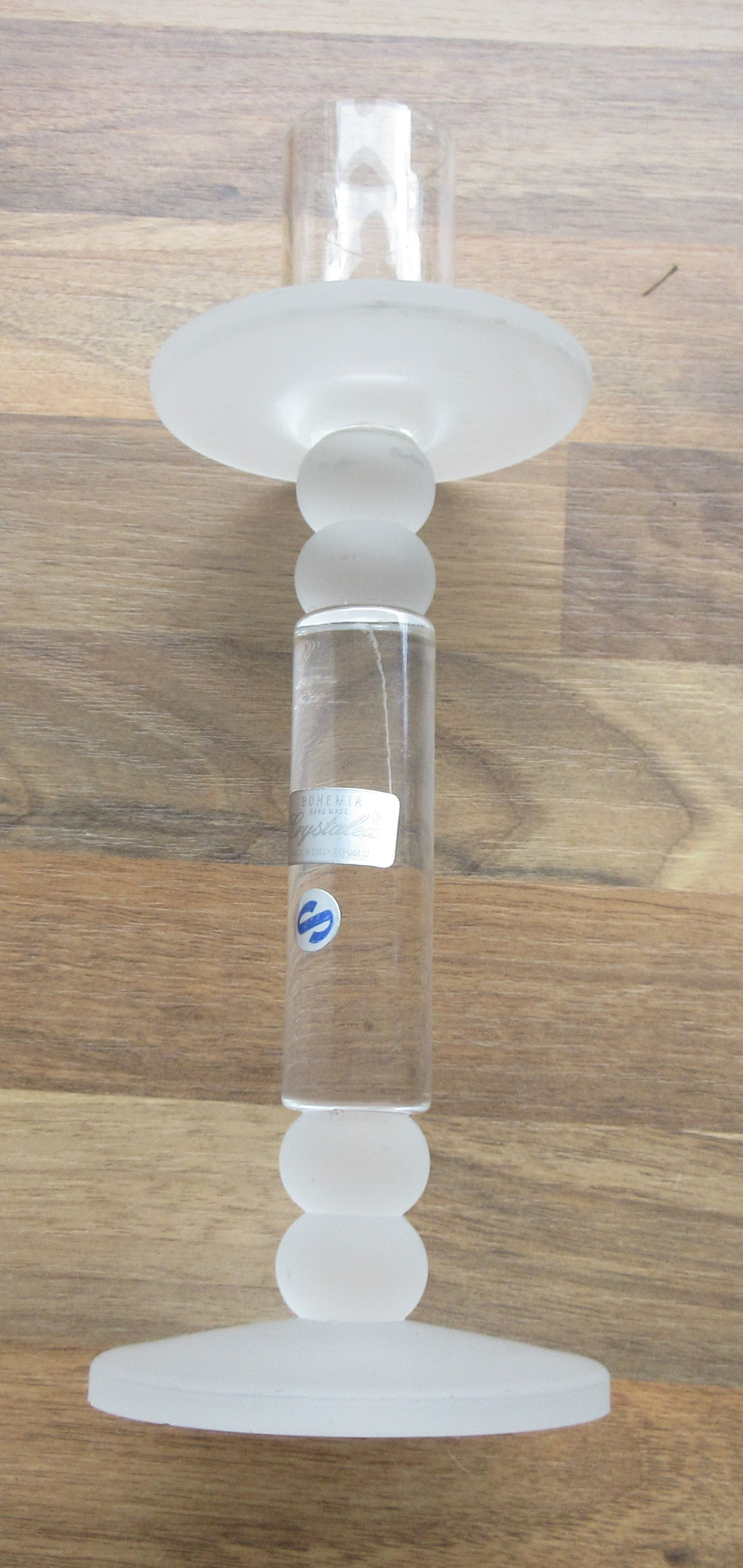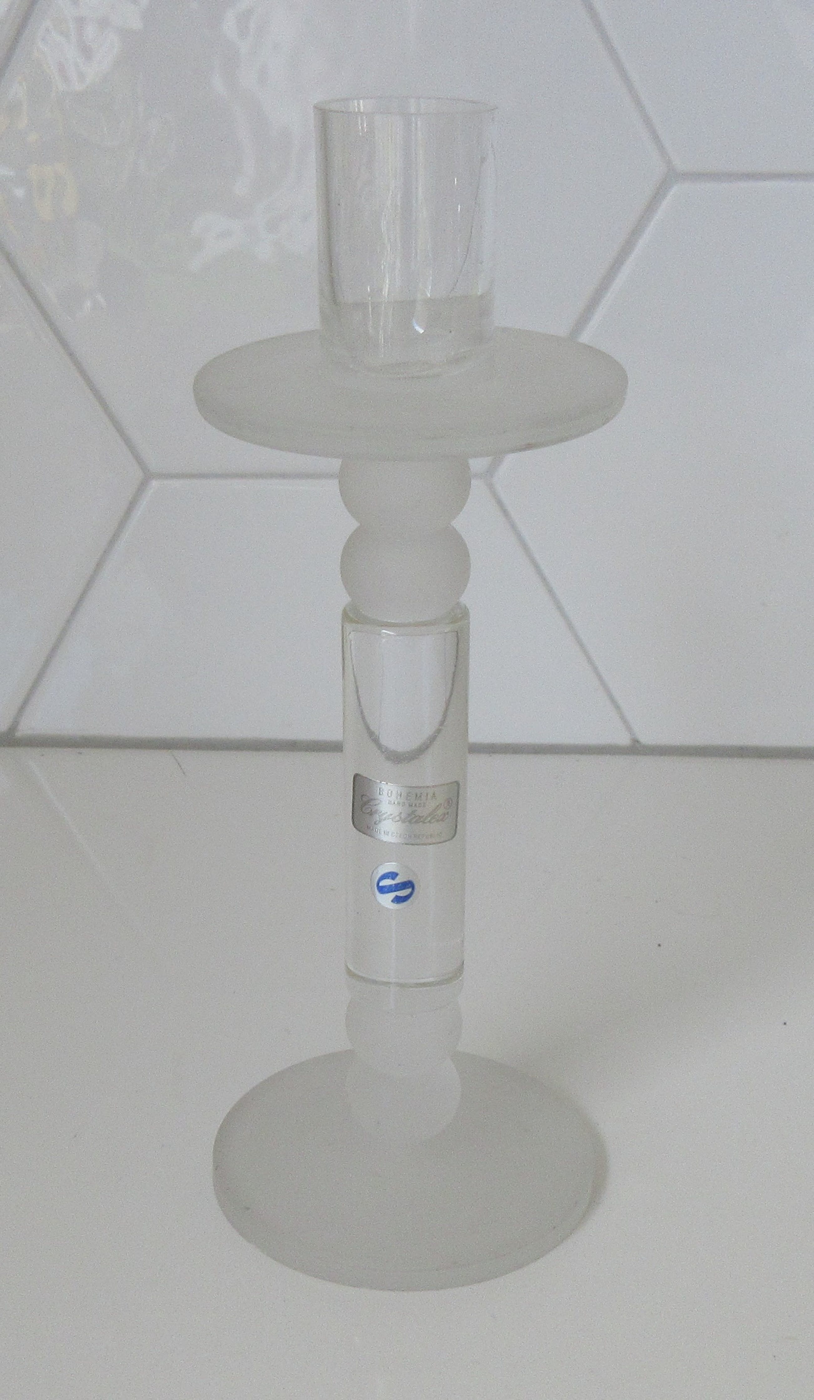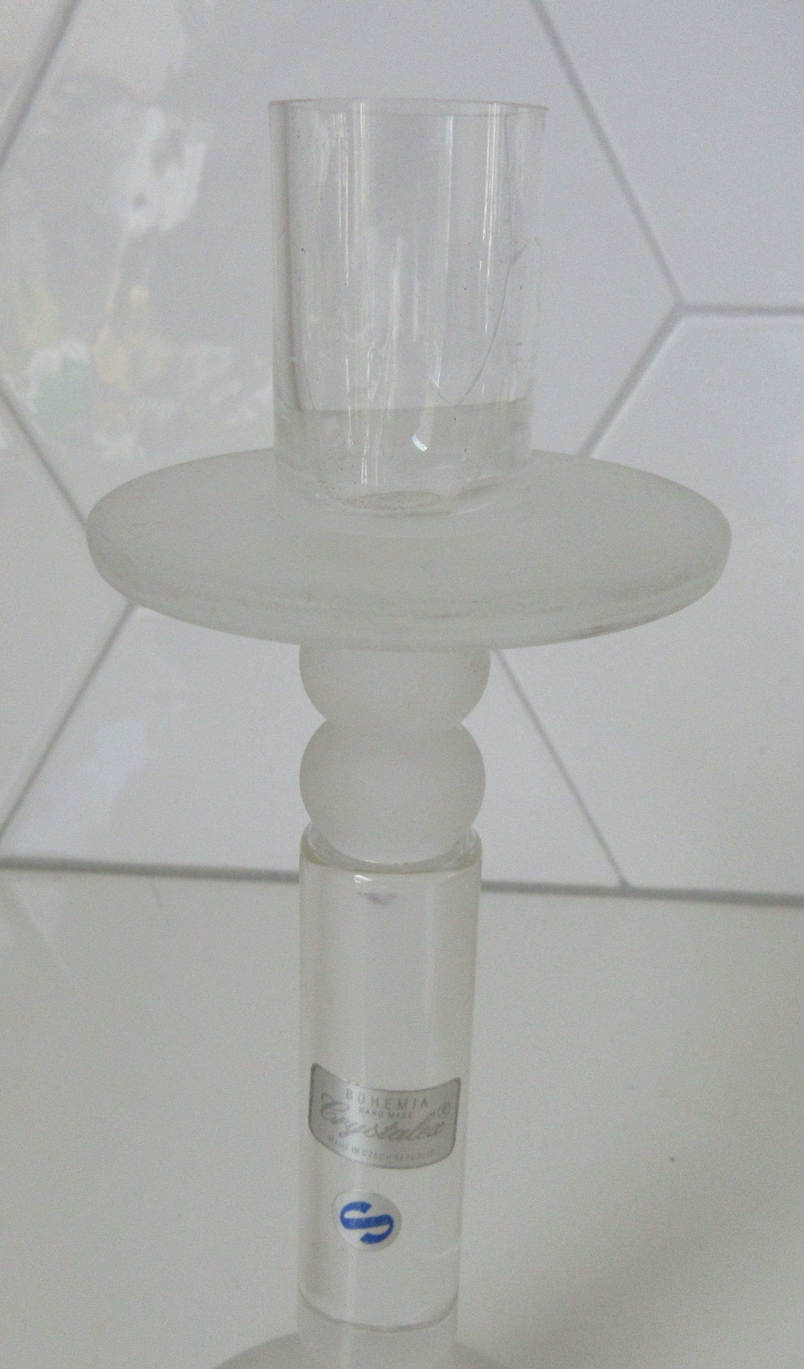 Crystalex design kristallen kandelaar, mooie rondingen en sommige delen zijn gematteerd. Gemerkt met twee merkstickers, niet gesigneerd.