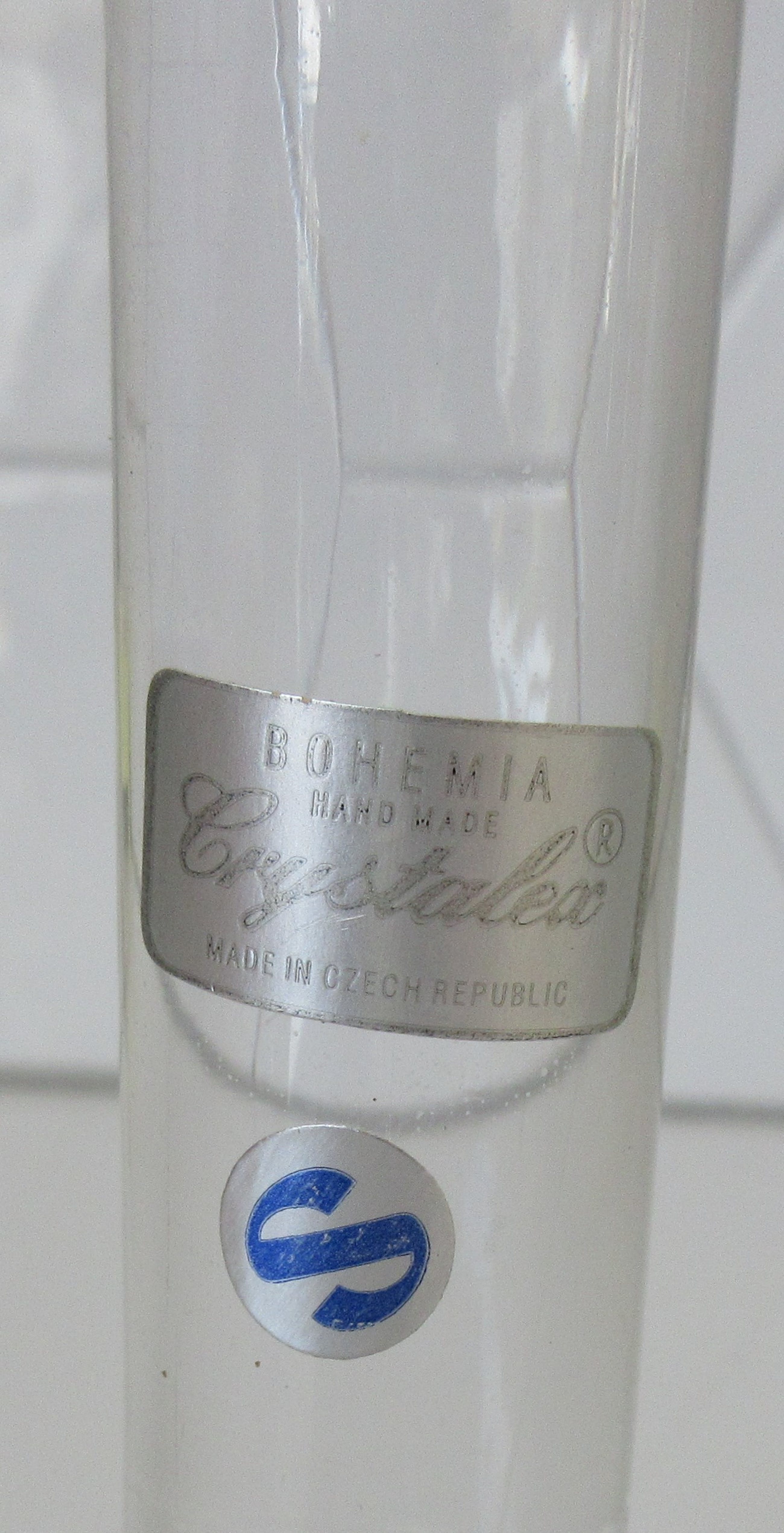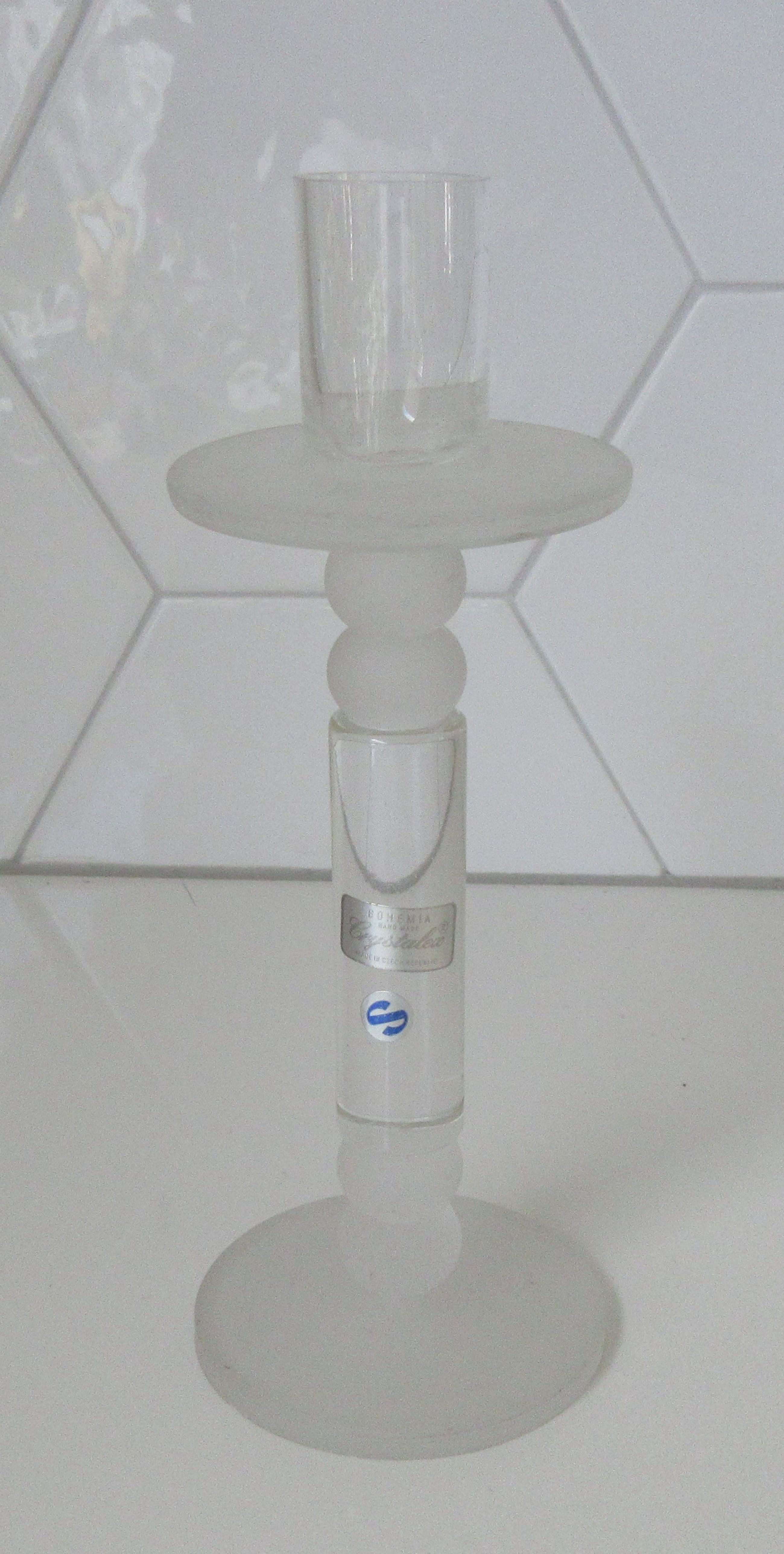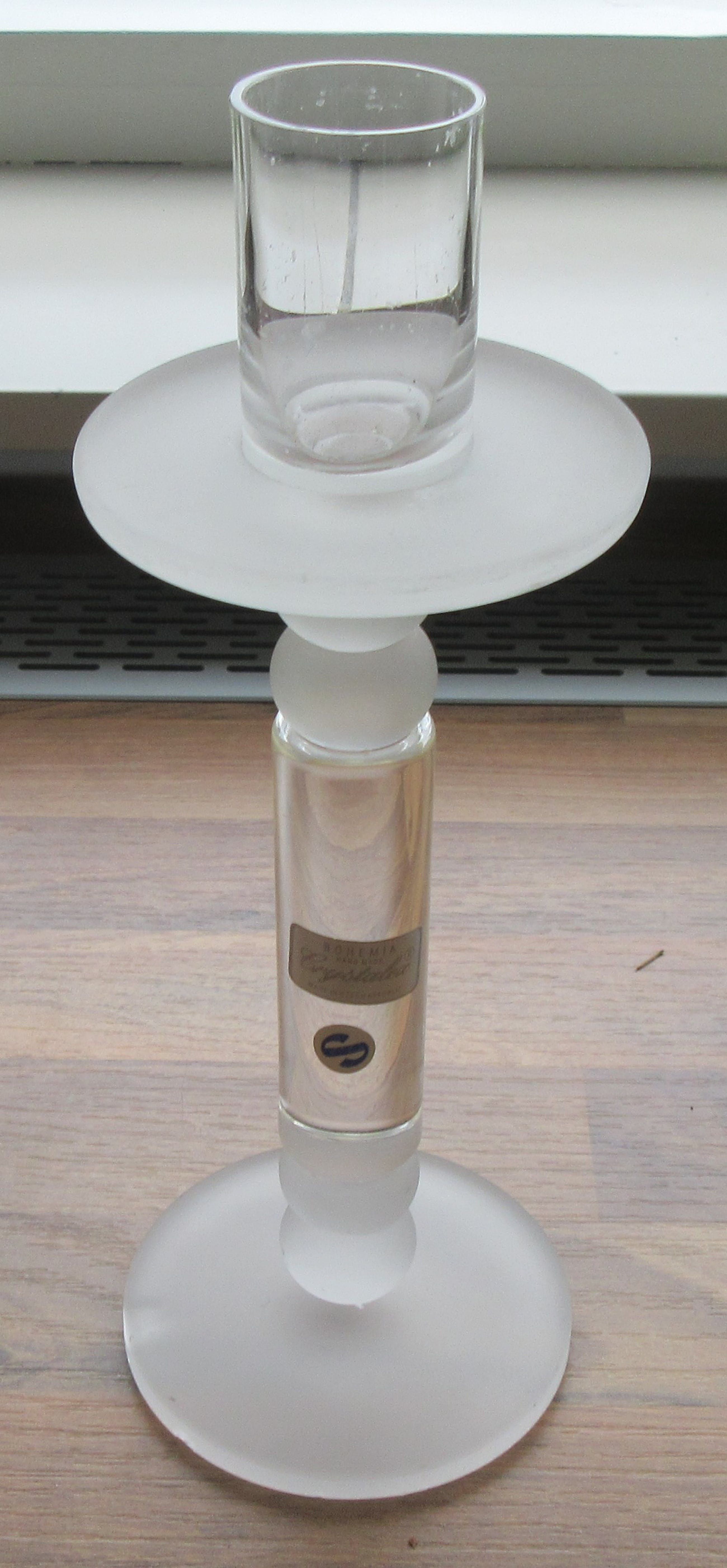 Crystalex design kristallen kandelaar, mooie rondingen en sommige delen zijn gematteerd. Gemerkt met twee merkstickers, niet gesigneerd.