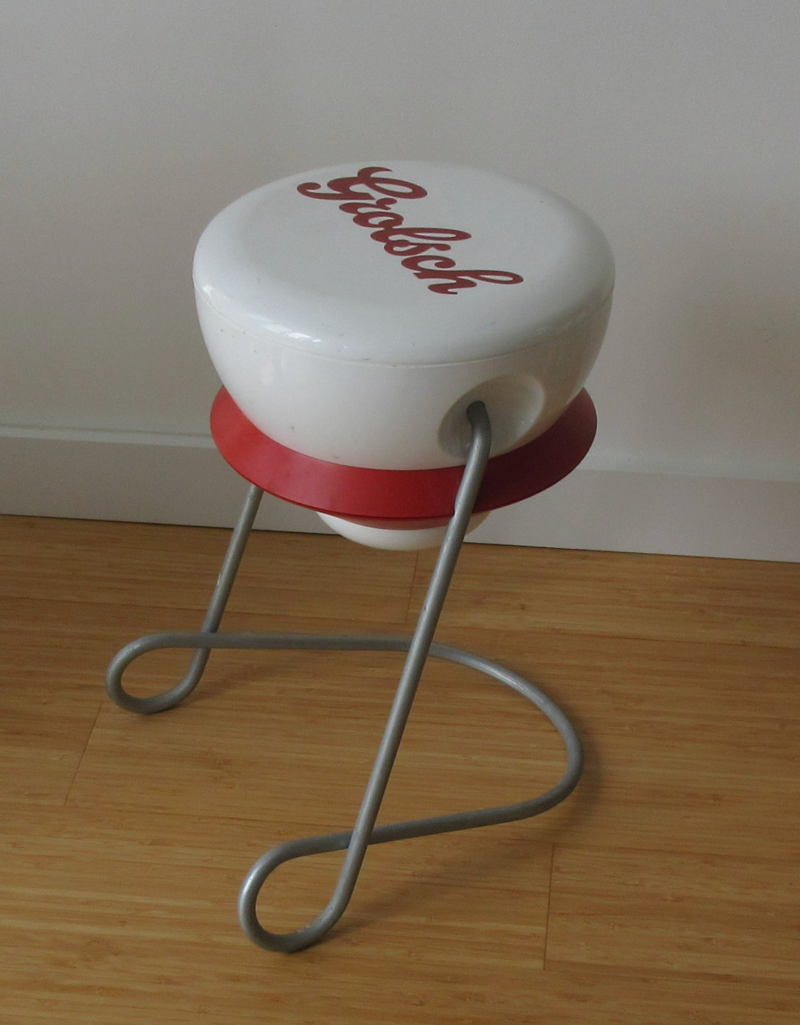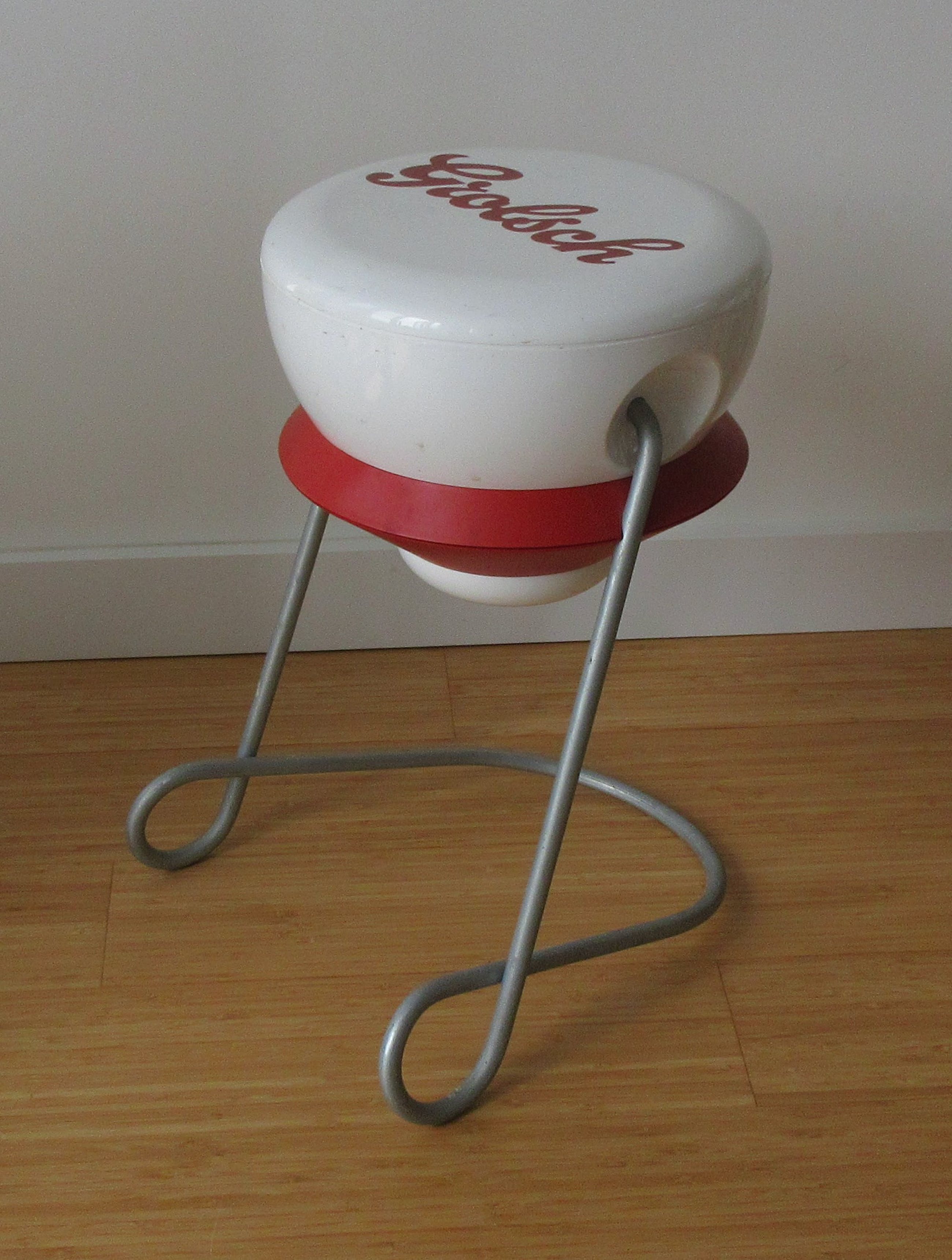 Een collectors item. De kruk van Grolsch in de vorm van een beugeldop van een fles merk Grolsch, gemaakt van kunststof en metaal.