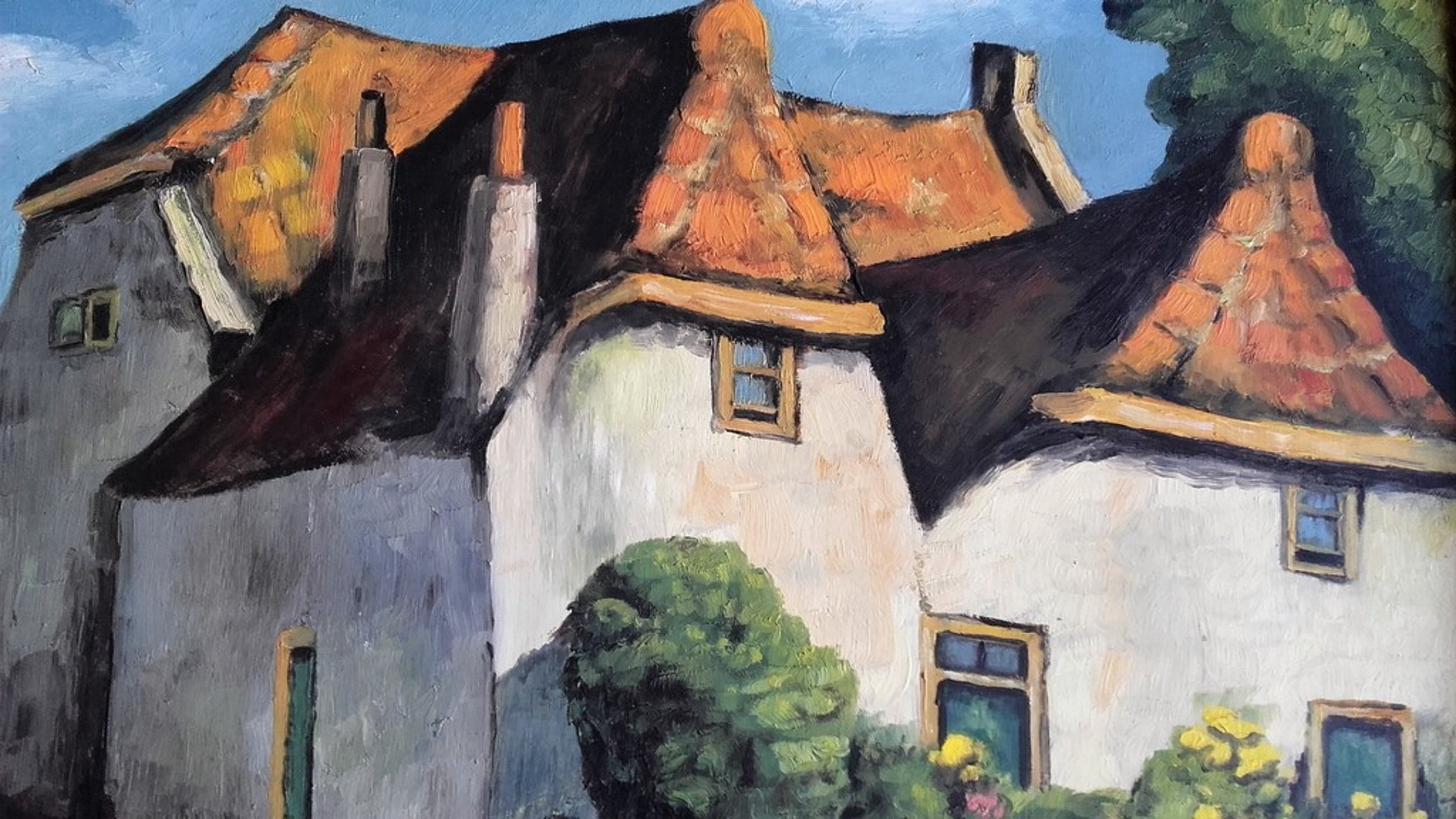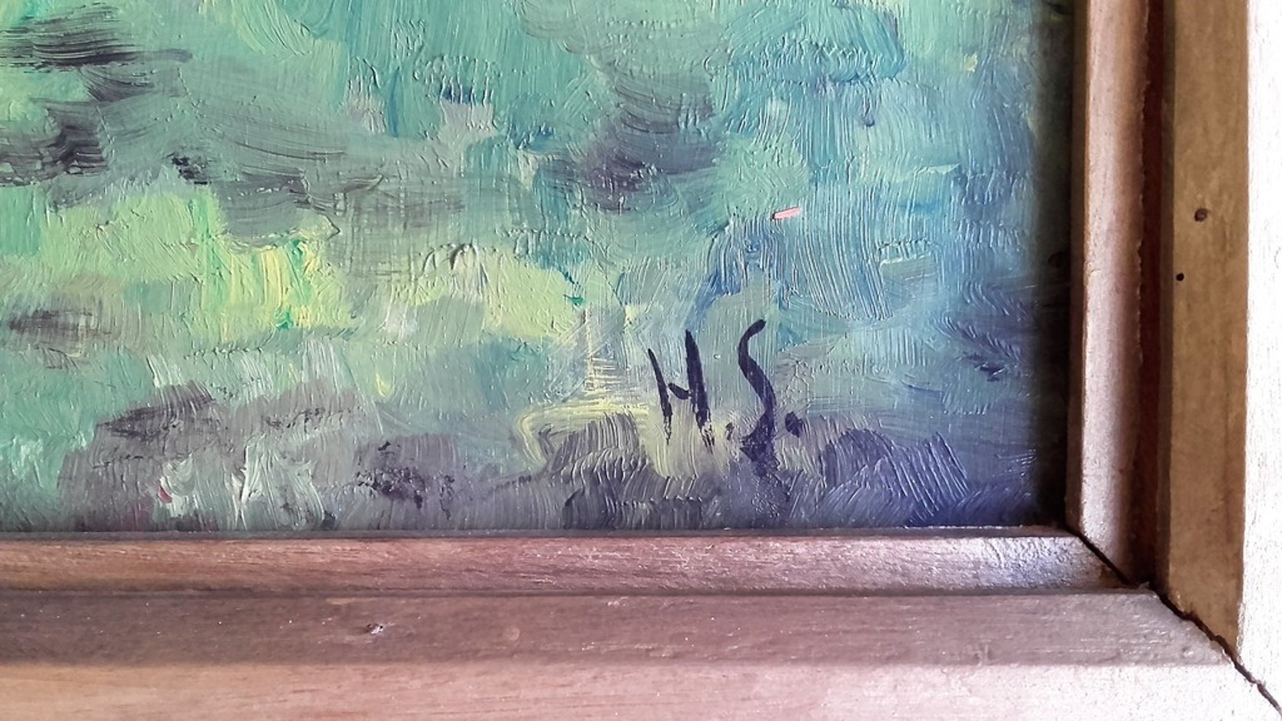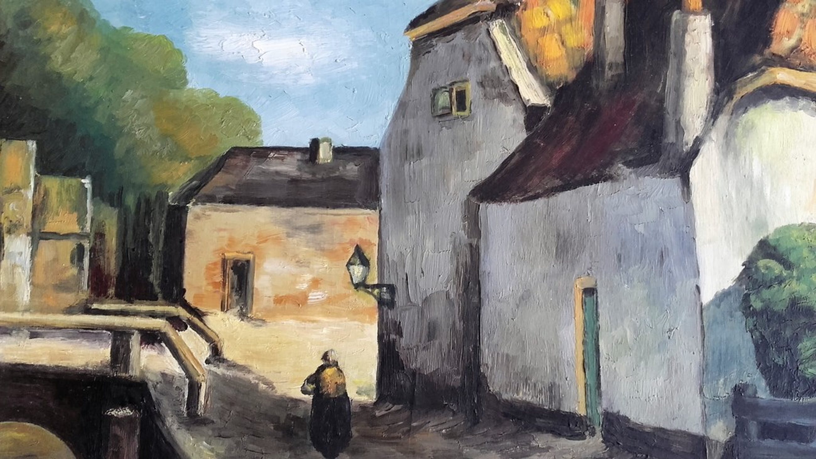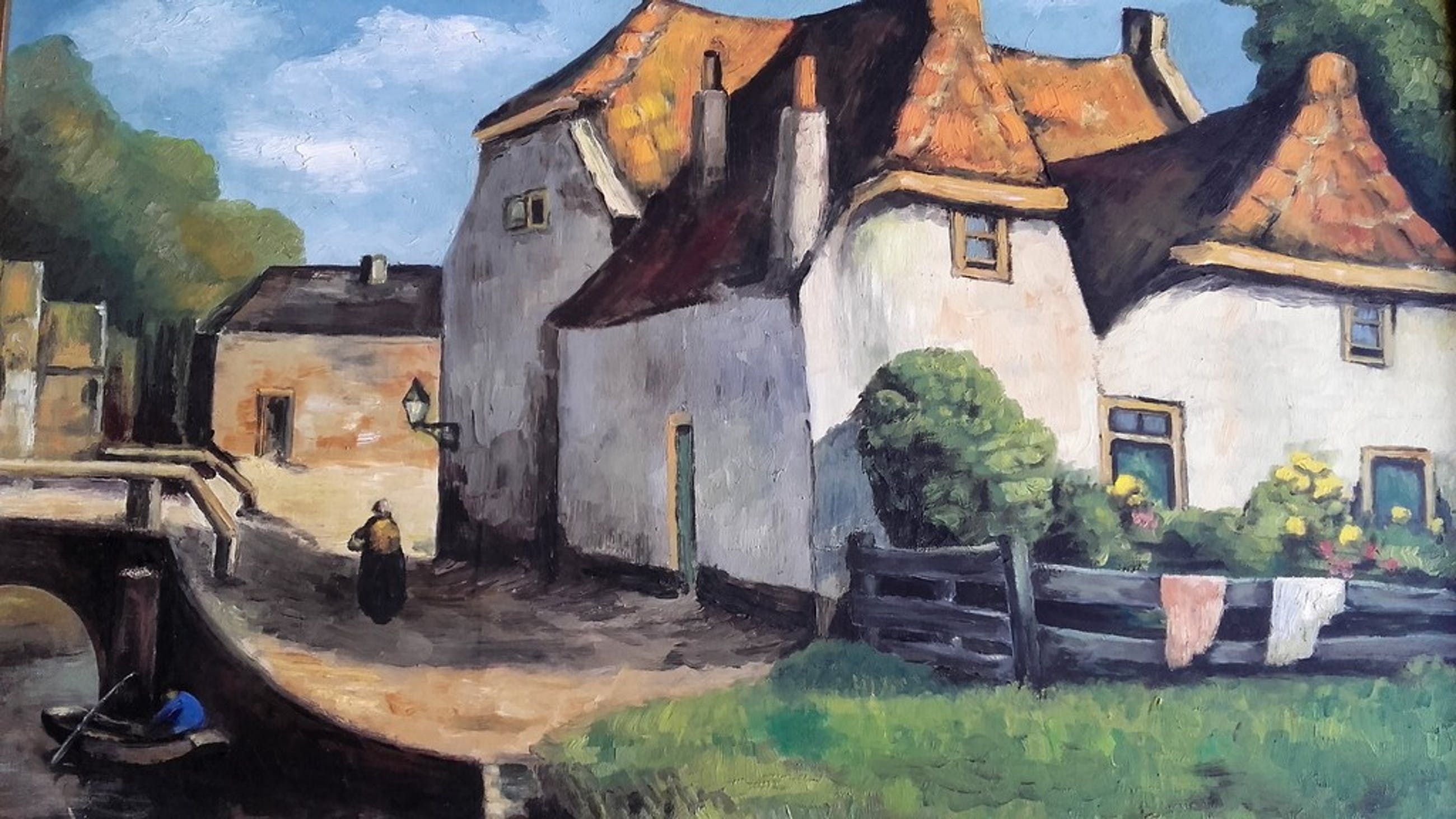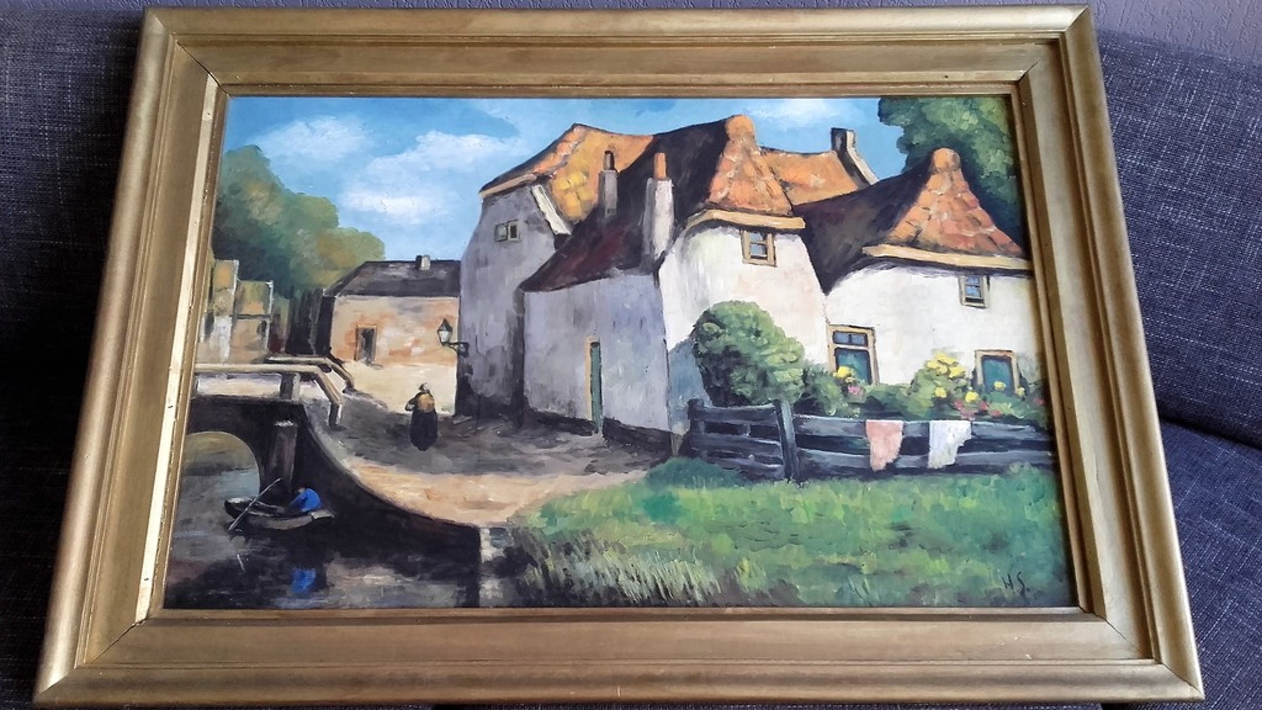Groot schilderij van een dorpsgezicht met bootje en personen. Het is geschilderd met olieverf op een oud paneel. Gesigneerd met monogram H.S. Afm totaal: 107 x 76 cm, Afm paneel: 88 x 57 cm. Inclusief ophangmogelijkheid & houten lijst. Conditie, in perfecte staat. Wegens grote afmeting kan het alleen opgehaald worden.