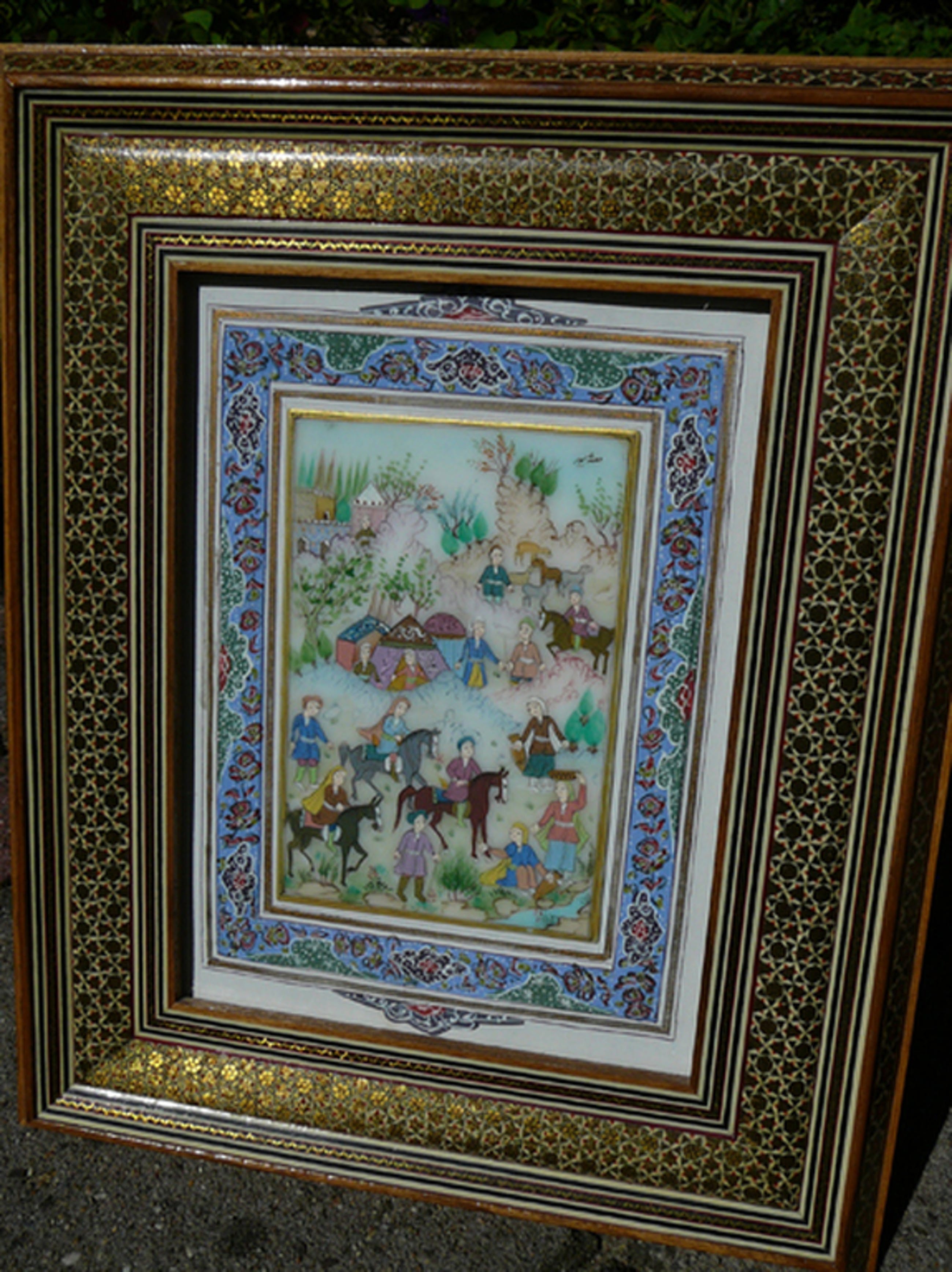 Exotisch dorpstafereel aan de oever van een beek. Herkomst vermoedelijk Noord-Afrika. De afbeelding is geplakt binnen een eveneens handmatig geillustreerd kader. Rondom bevindt zich een geprofileerde en rijk gedecoreerde lijst met strips van ingelegd hout en mogelijk ivoor, kortom een kunstwerk op zich!
