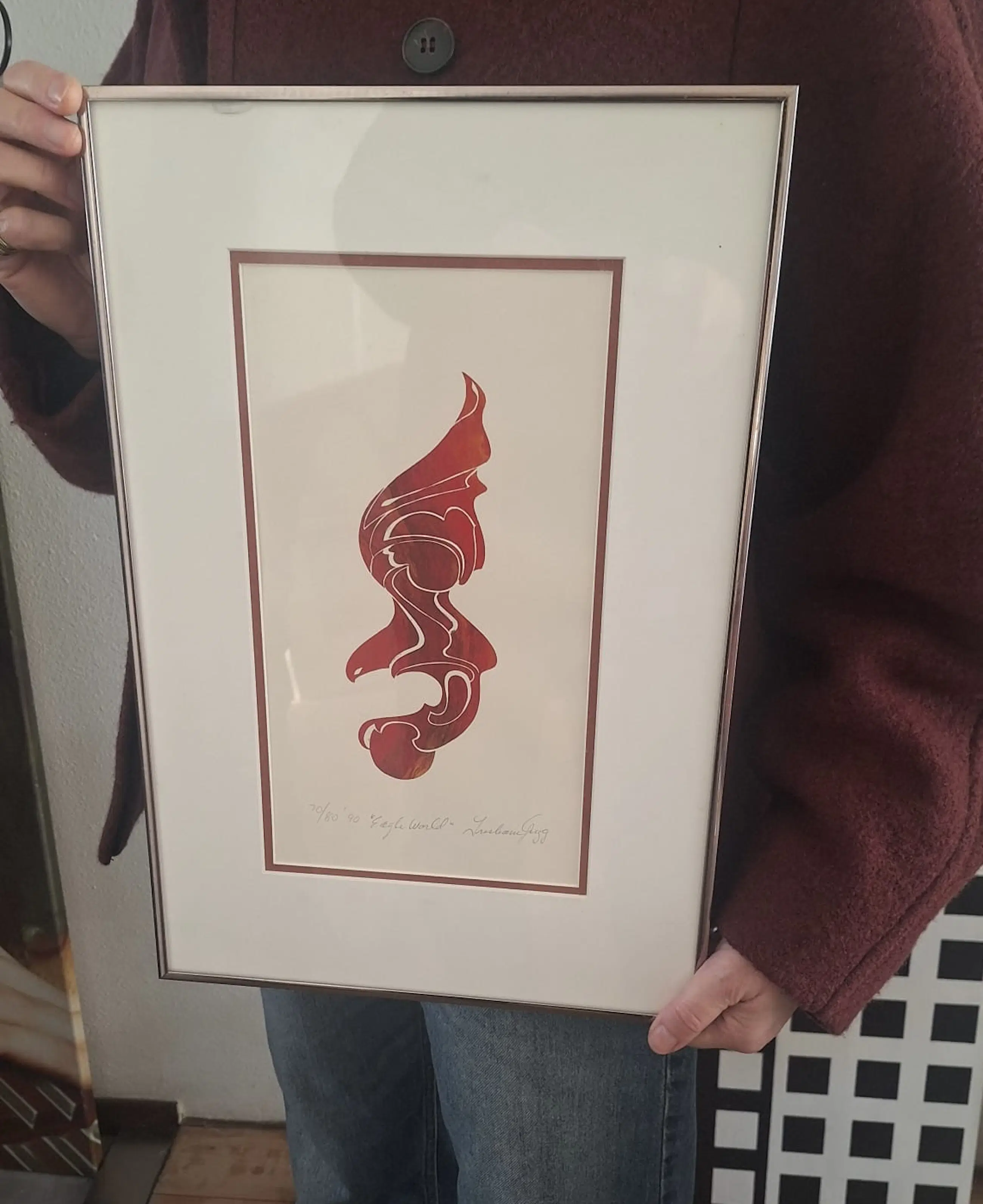 Onbekend gesigneerde zeefdruk uit 1990. Dit is nummer 80 van 90. Het werk is ingelijst met een dubbele passe partout. Conditie: heel goed. Er is wel een lichte bobbel in het papier maar nauwelijks zichtbaar.