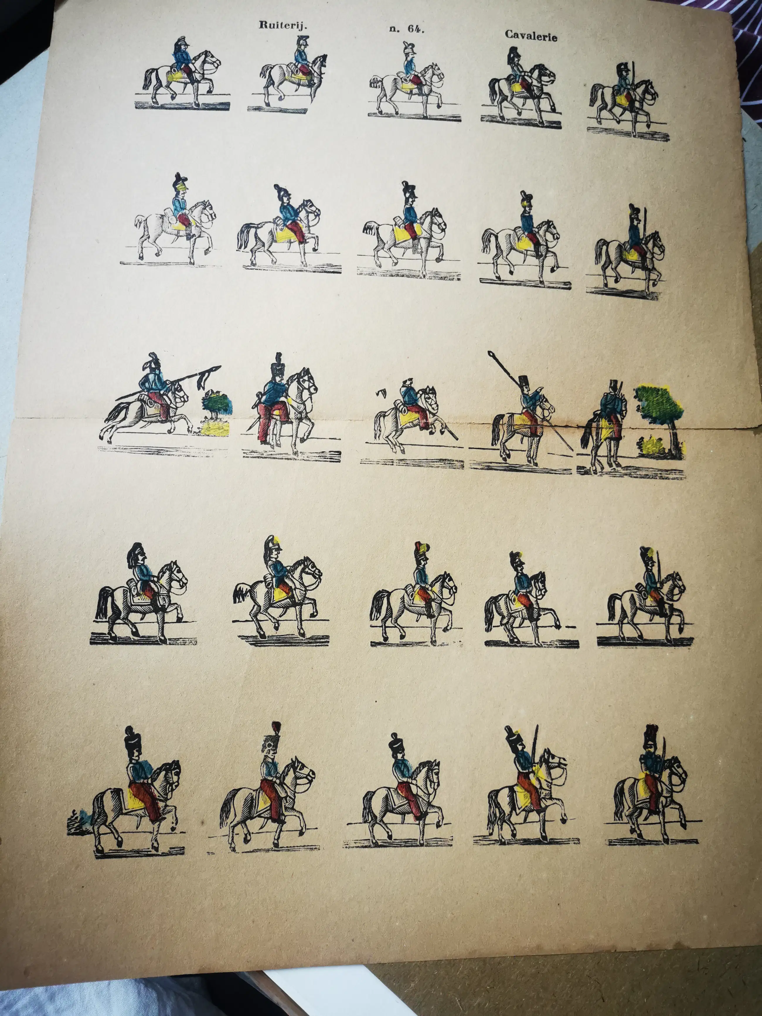 Centsprent met 5 x 5 niet omkaderde houtsneden van soldaten te paard, deels voorzien van lansen en zwaarden. Bevat behalve de titel geen tekst.