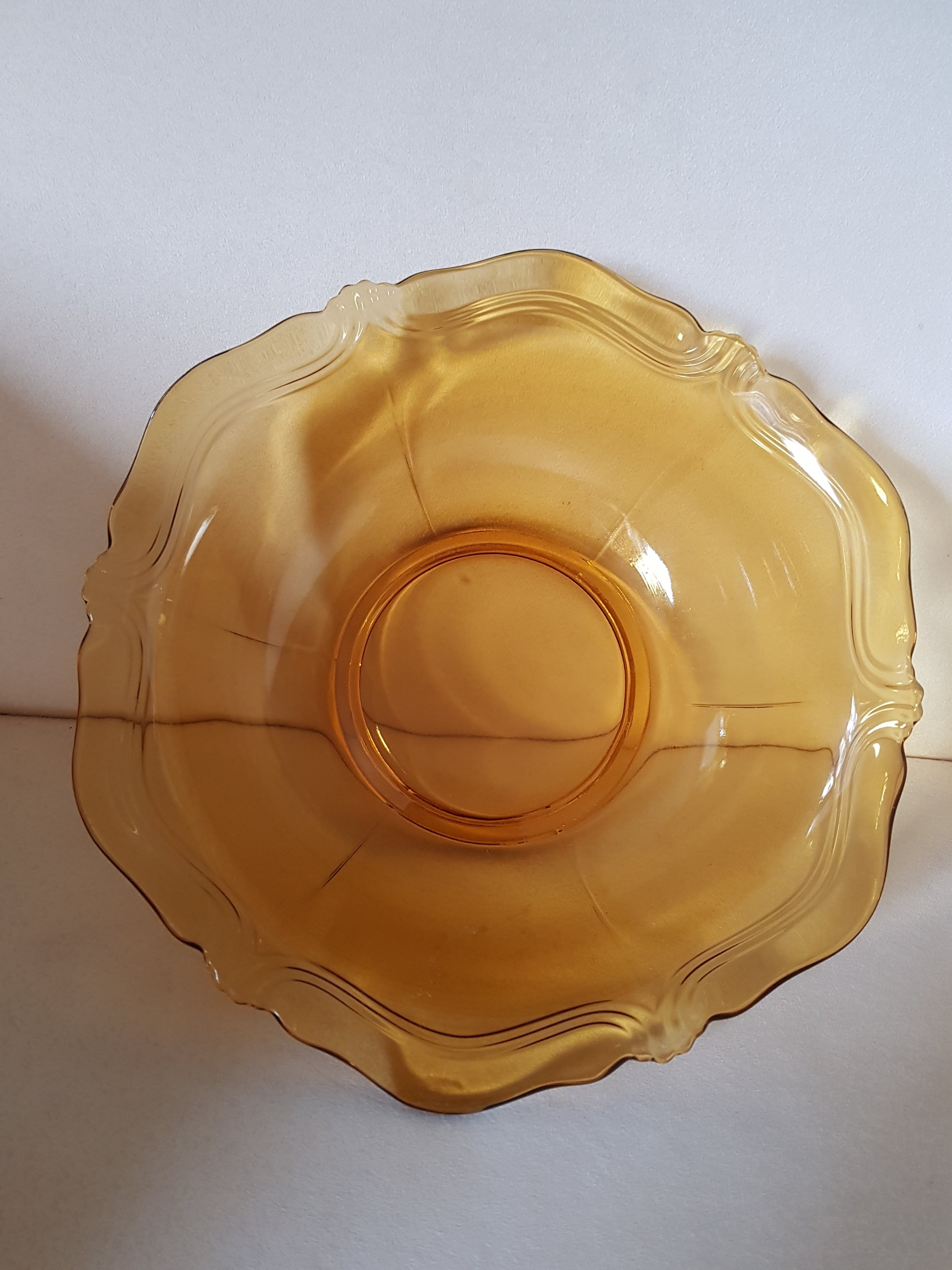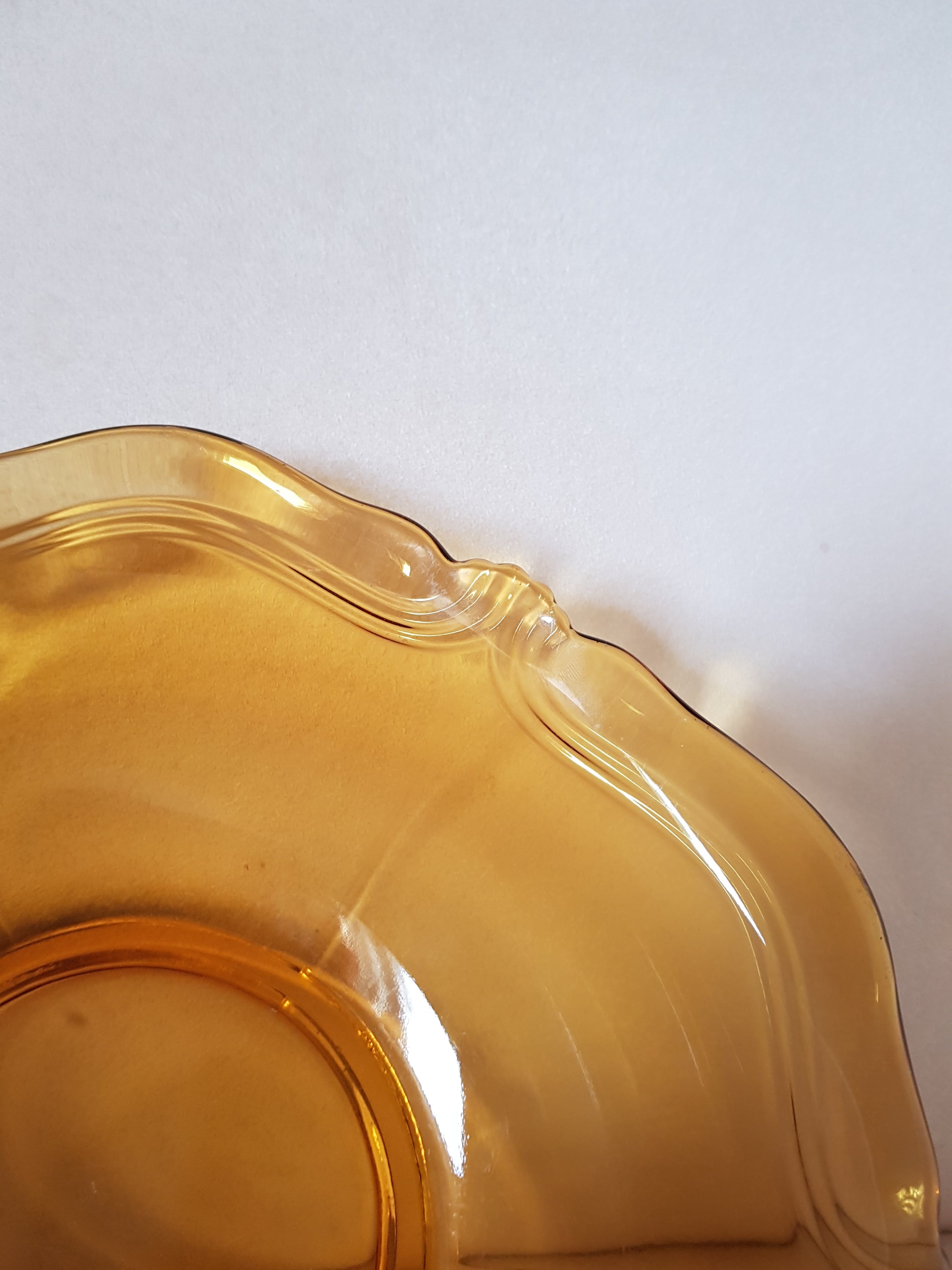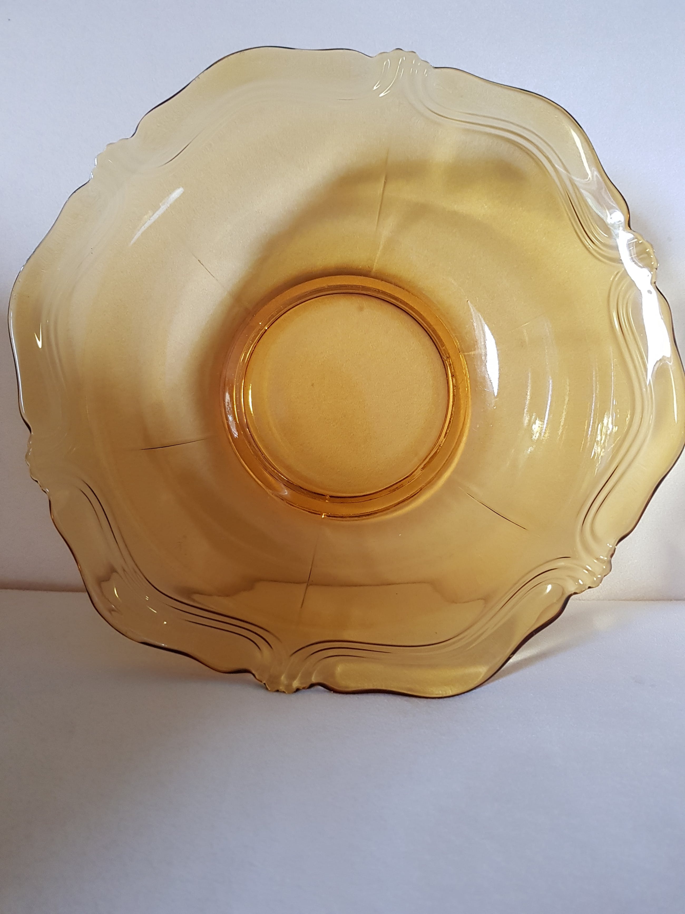 Oude Schaal, Pers Glas, Geel, in een mooie conditie. Beetje Retro Vintage, helemaal gaaf, Hoog 7cm, breed 23 cm. Mooie sierlijk afgewerkte bies.