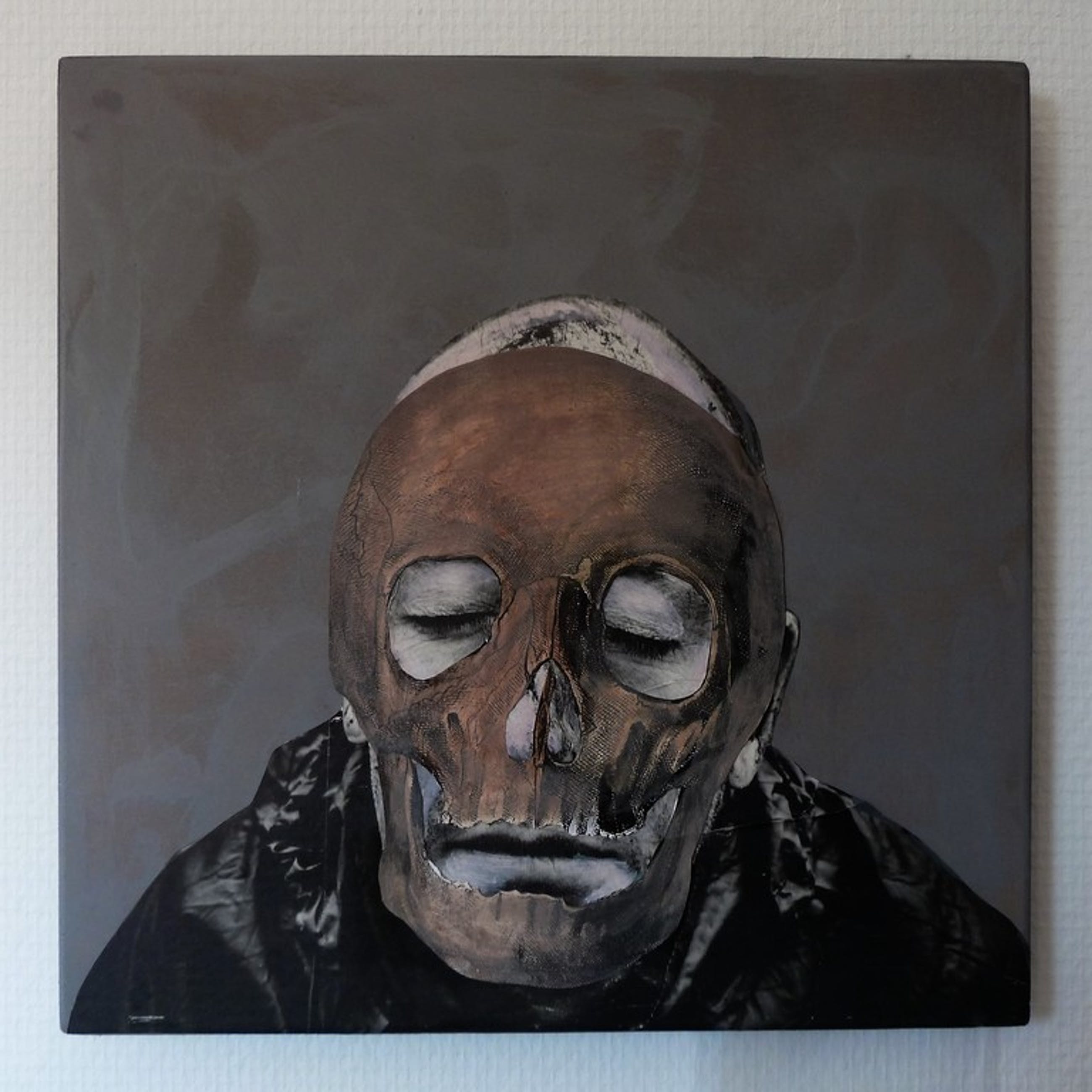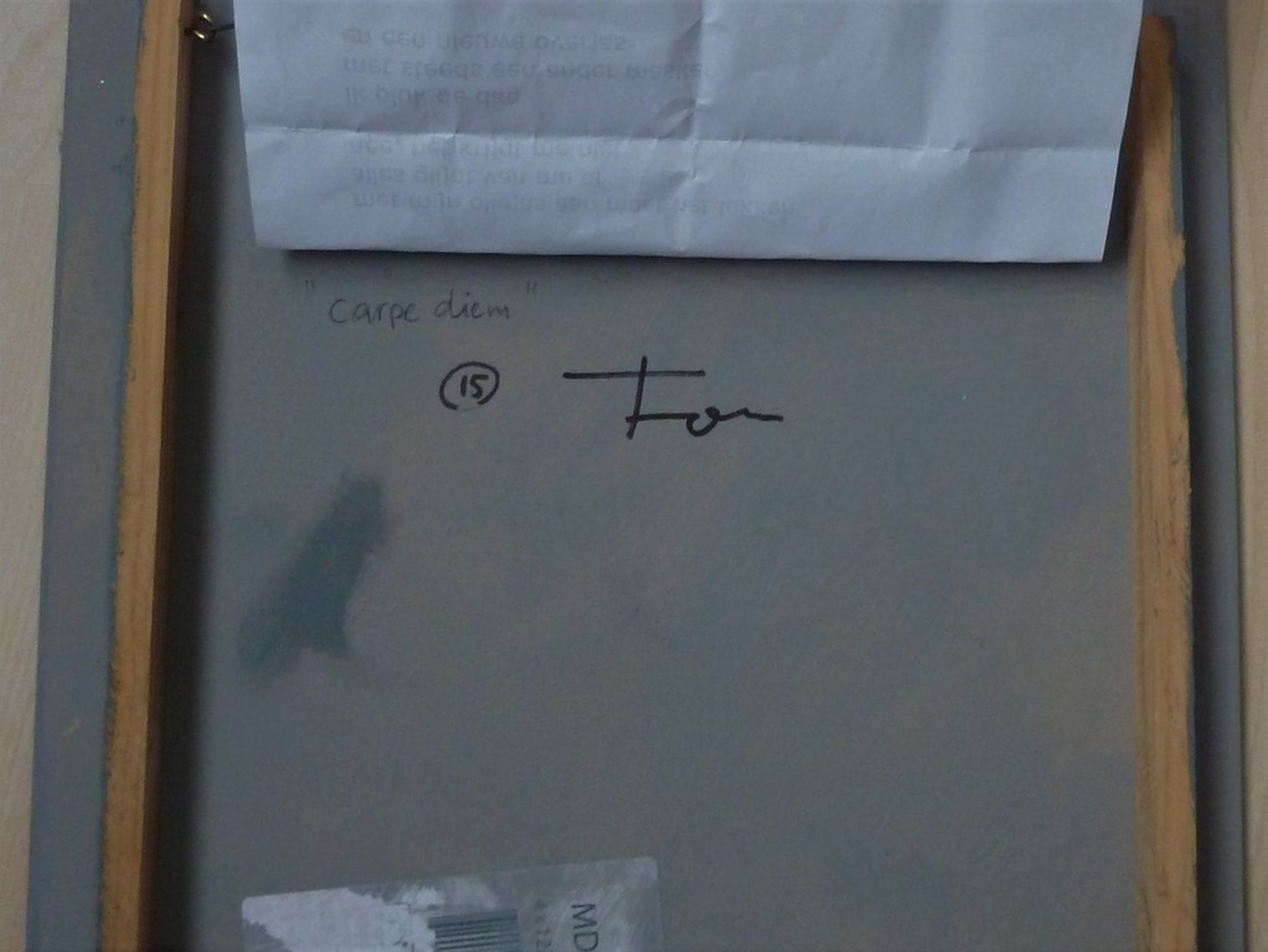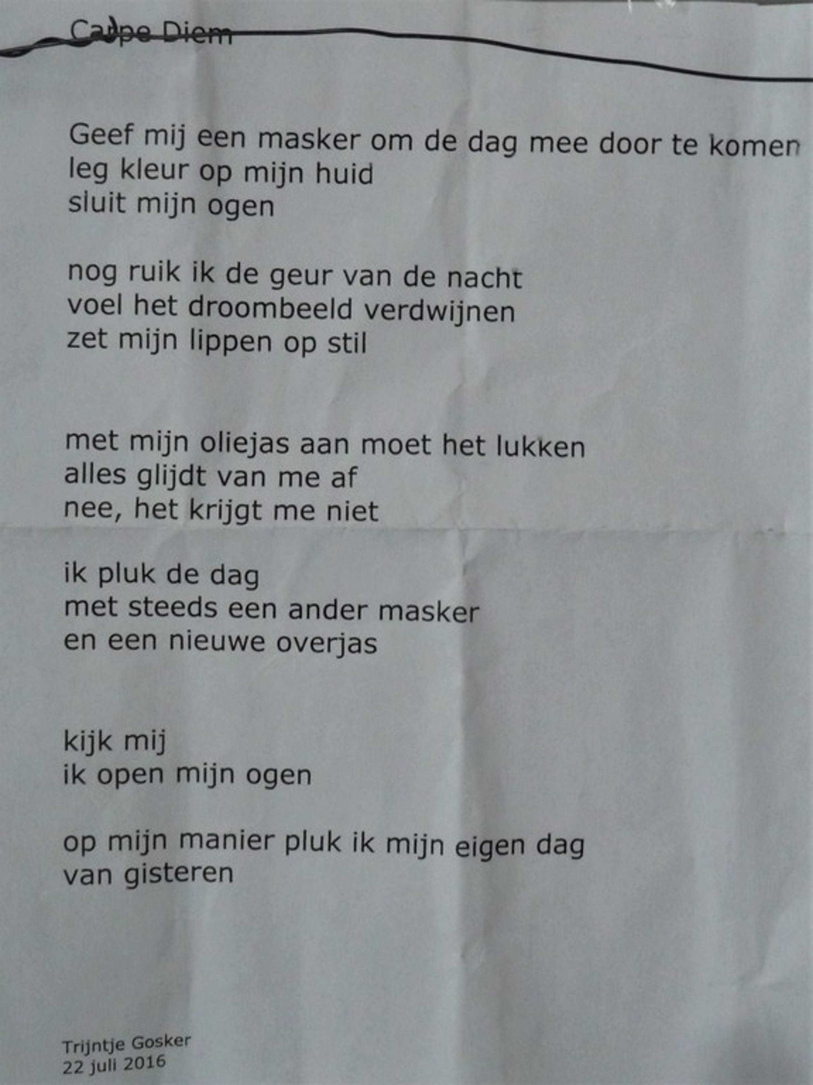 Gemengde techniek op paneel (collage+gouache). Afmetingen 30 x 30 cm. Jaartal w.s. 2015. Aan de achterzijde is een gedicht bevestigd van Trijntje Gosker met als titel 'Carpe Diem' dat kennelijk speciaal geschreven is voor dit werk. Mooie combinatie van beeldende kunst en poezie. Tevens gesigneerd aan de achterzijde. Kan zo aan de muur.
