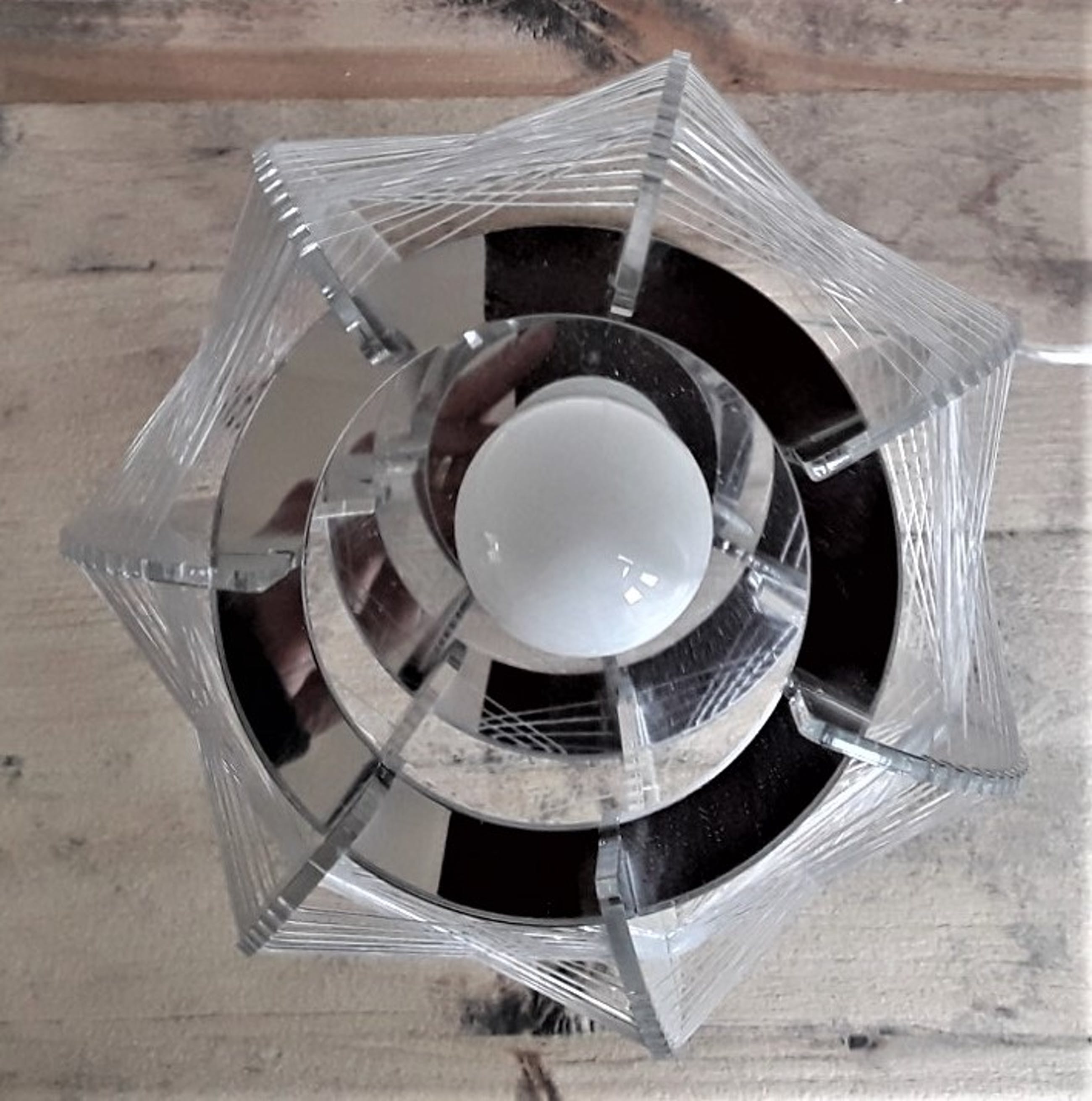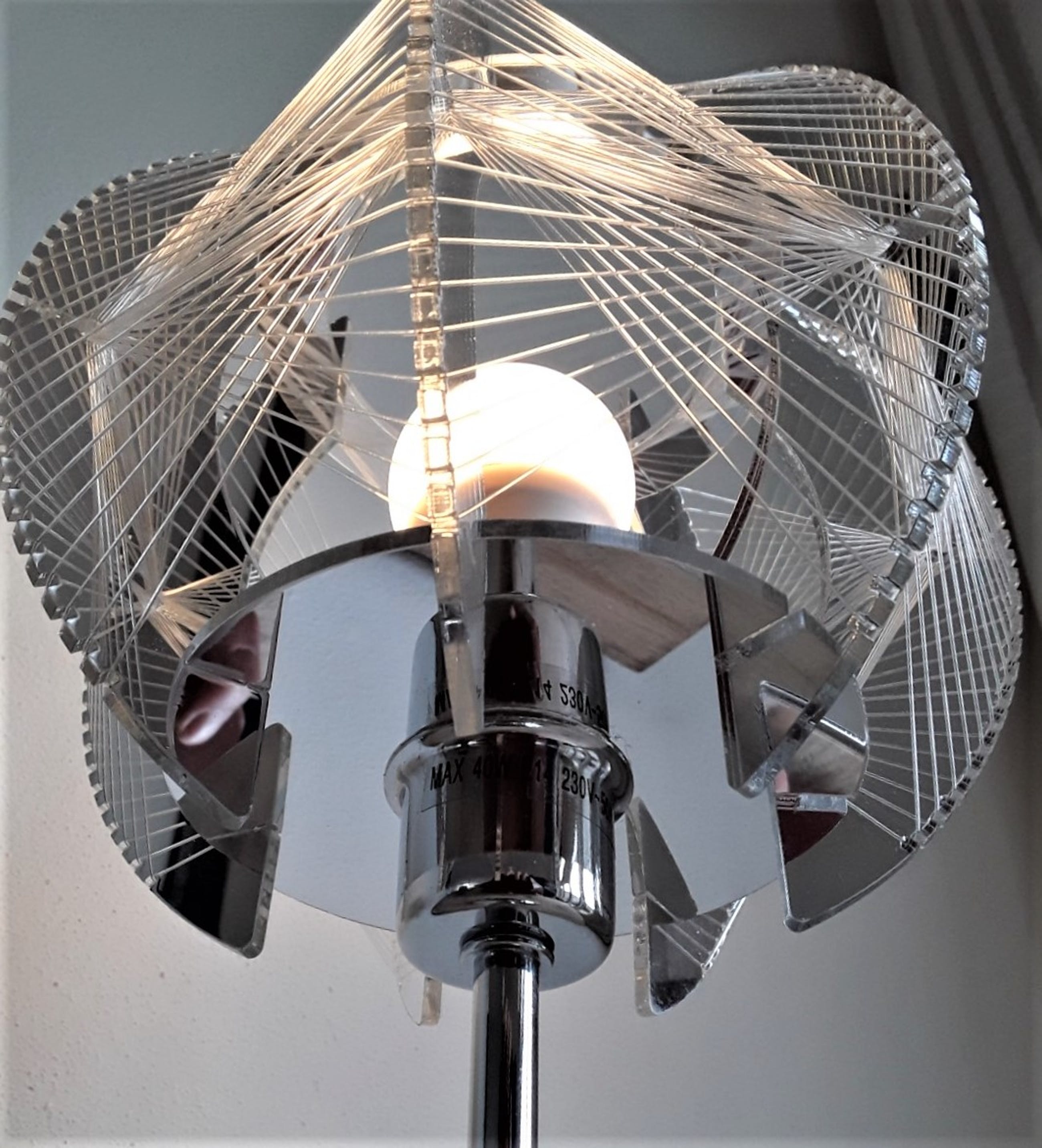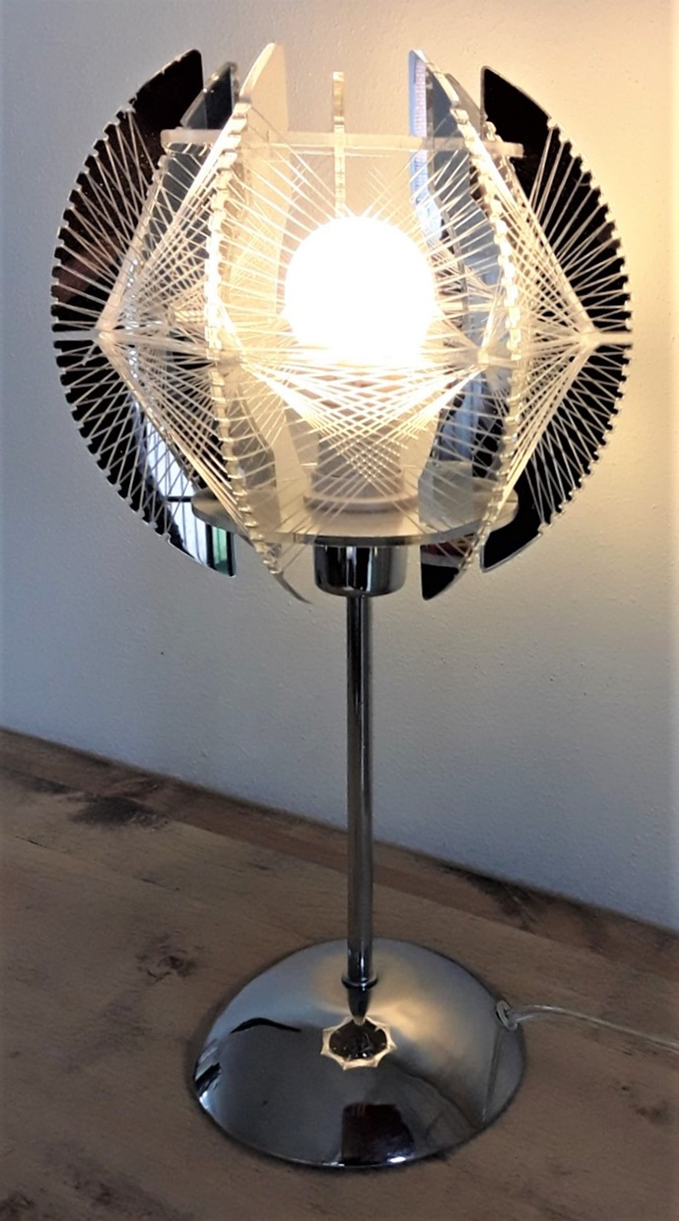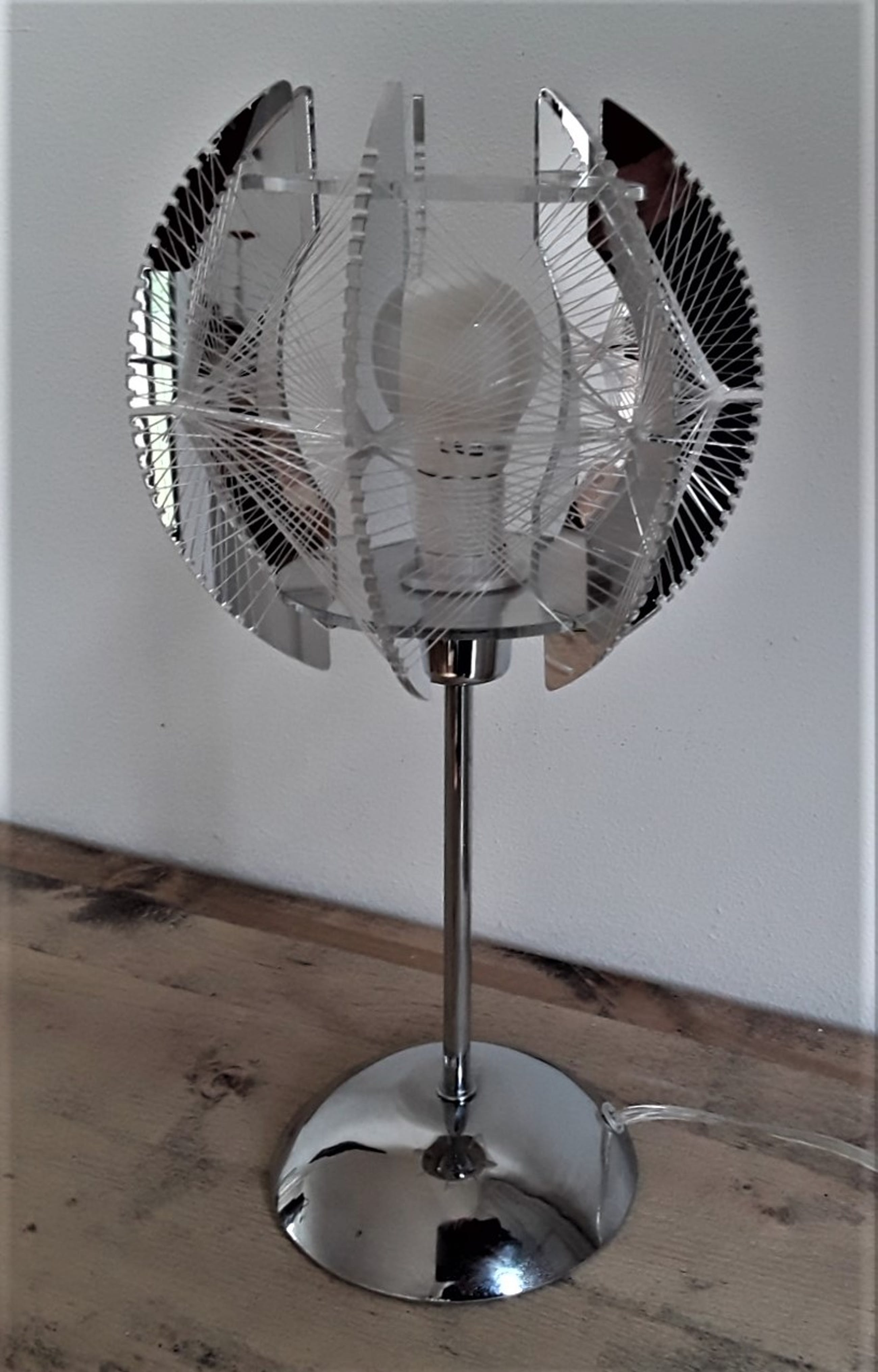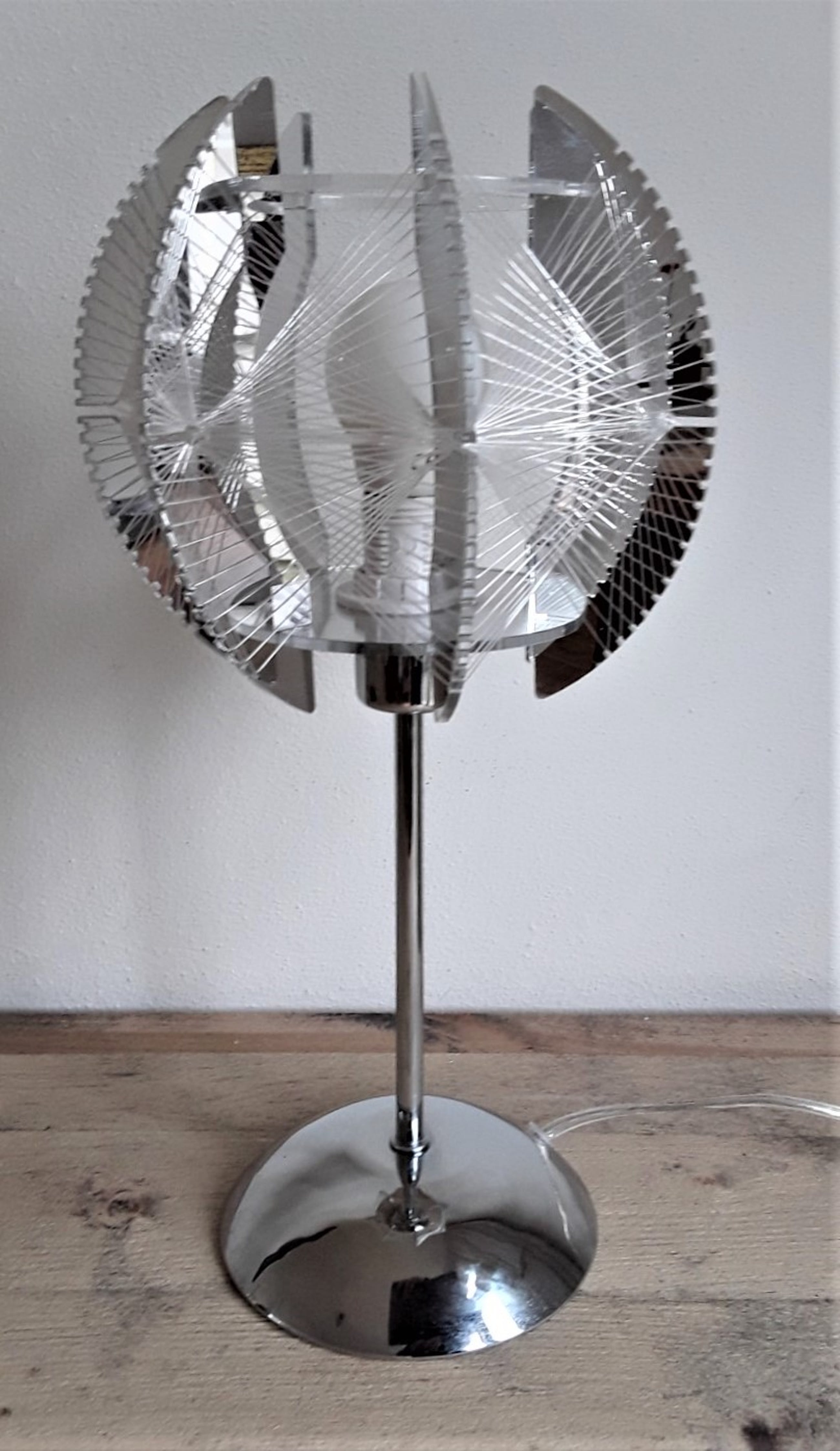 Gave tafellamp vermoedelijk ontworpen door de France ontwerper Paul Secon Swag Deze lamp is opgebouwd uit heldere plexiglazen en spiegel delen en is omspannen met helder nylondraad. De uitvoering van deze lamp geeft een "zilveren" romantische uitstraling. Deze lamp verkeert in een goede staat met enkele lichte gebruikerssporen. Getest en werkend, levering is incl. bijpassend lampje. De foto's geven een goed beeld van de lamp en zijn een onderdeel van de beschrijving.