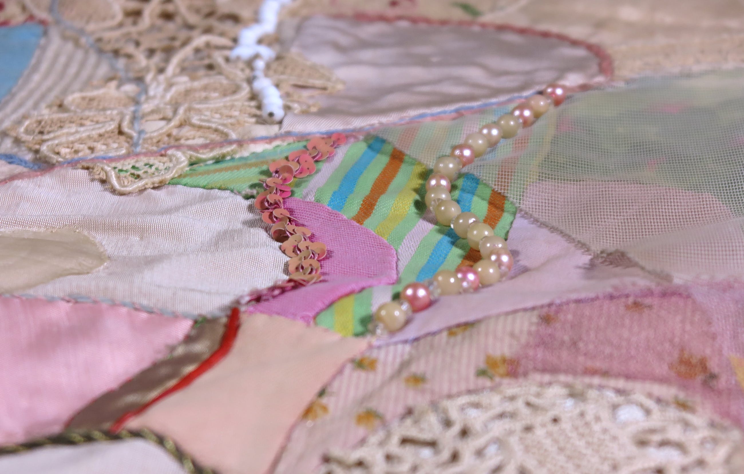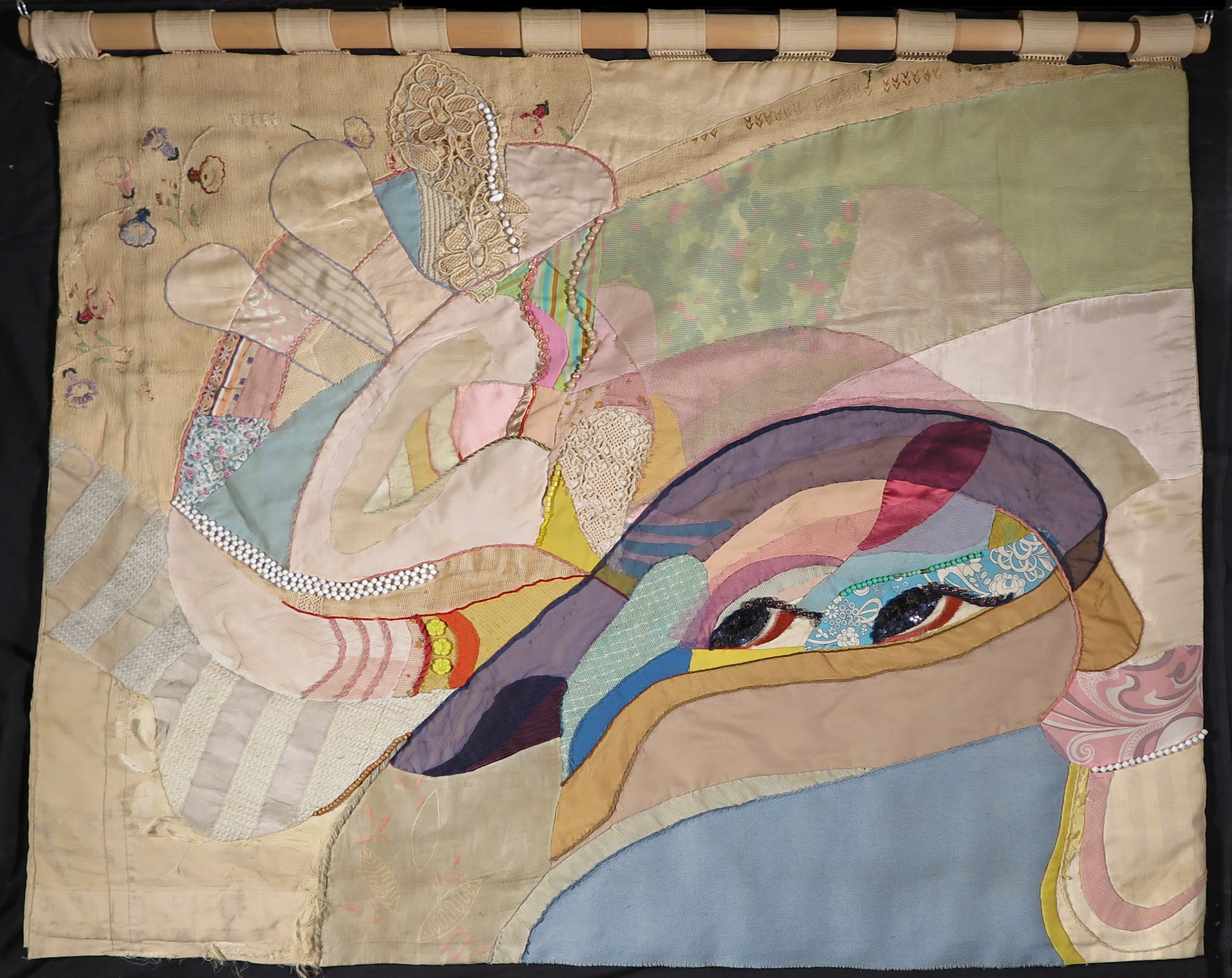 Het werk bevat niet alleen textiel, maar ook kralen, knopen en pailletten.