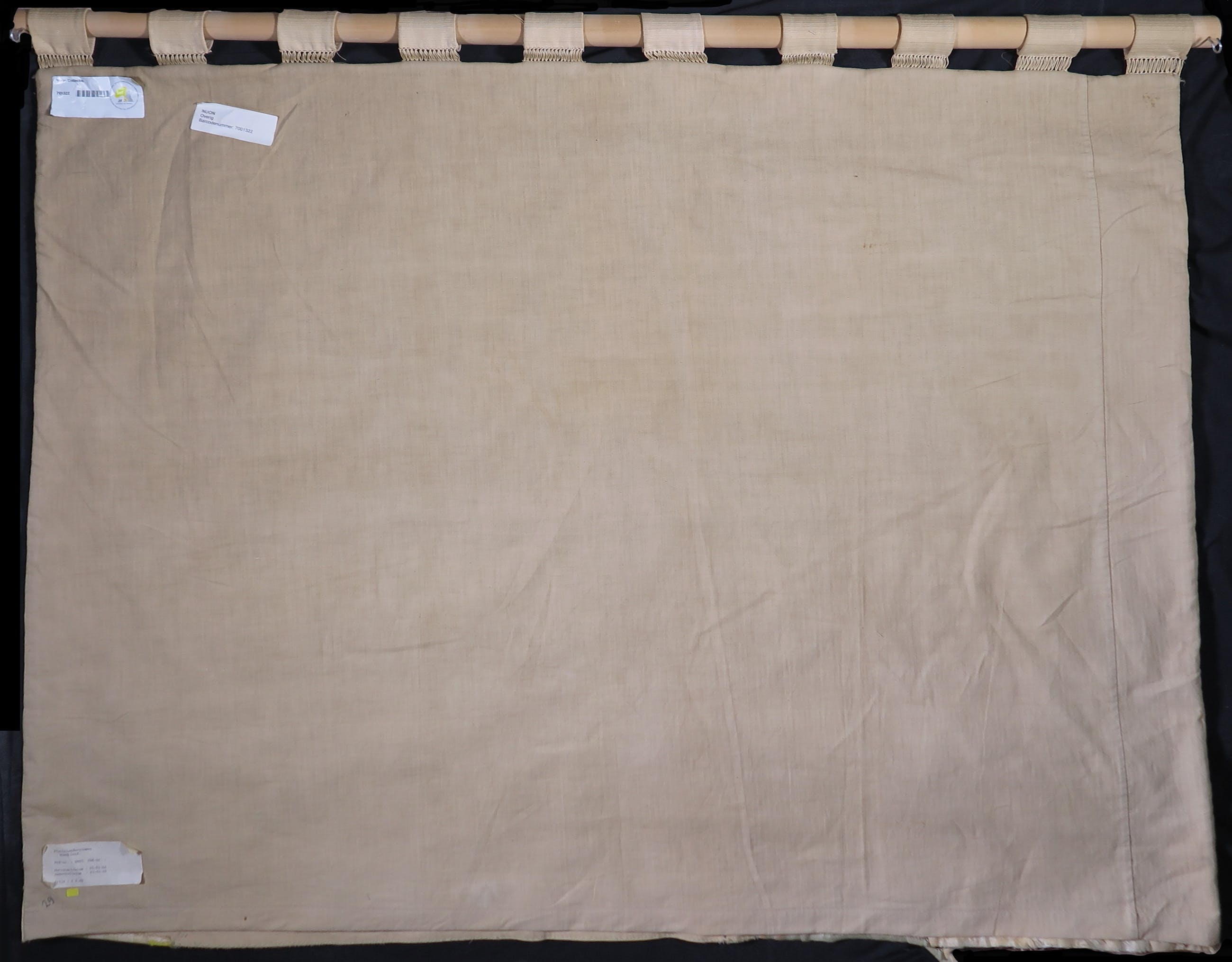 | Het is in redelijke staat, het textiel is verkleurd en het werk bevat op sommige plekken een ravelrand. | |||||||||||