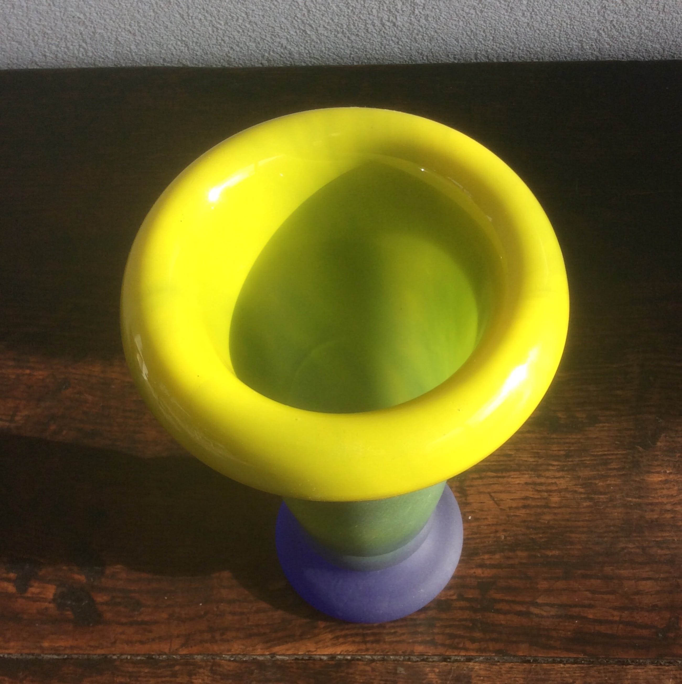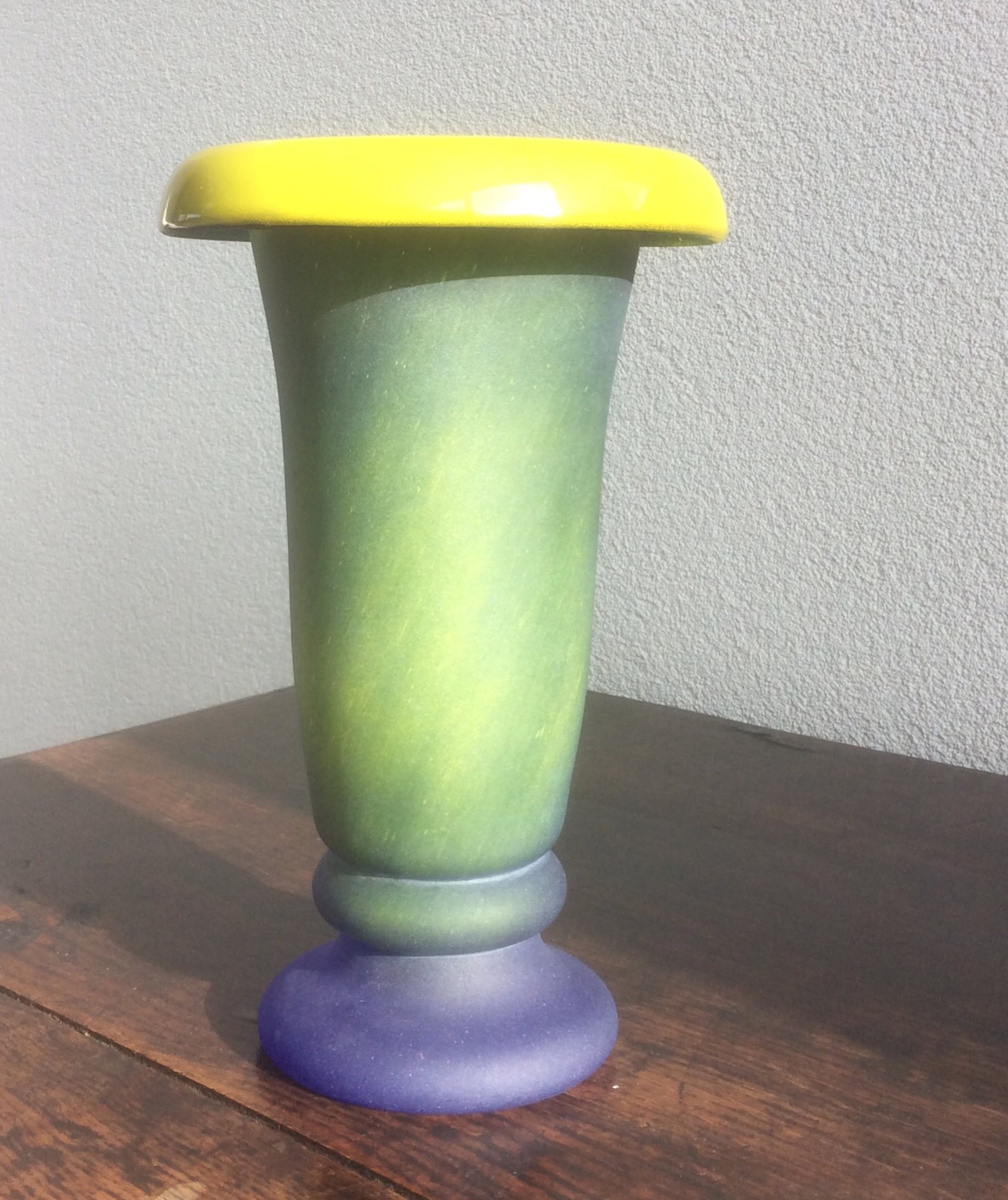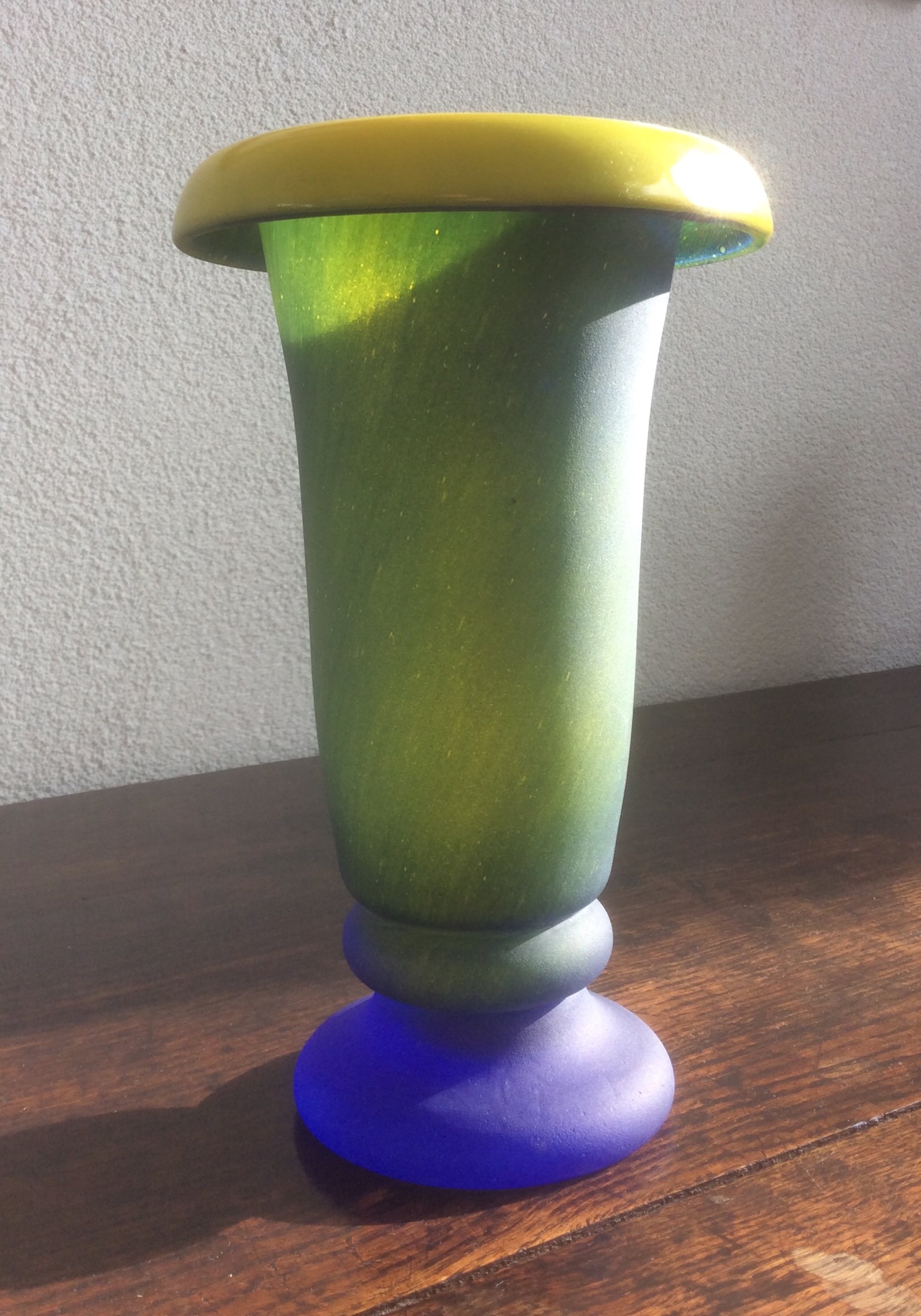 Een waardevolle vaas, waarvan je bijna zou zeggen: die heeft de oervorm van een vaas! Een glanzende geel-groene binnenzijde met een omgeslagen bovenrand. Een blauw-groen lichaam, prachtig gesatineerd, dat met een smalle rand overgaat in een stevige voet met een diepblauwe kleur.