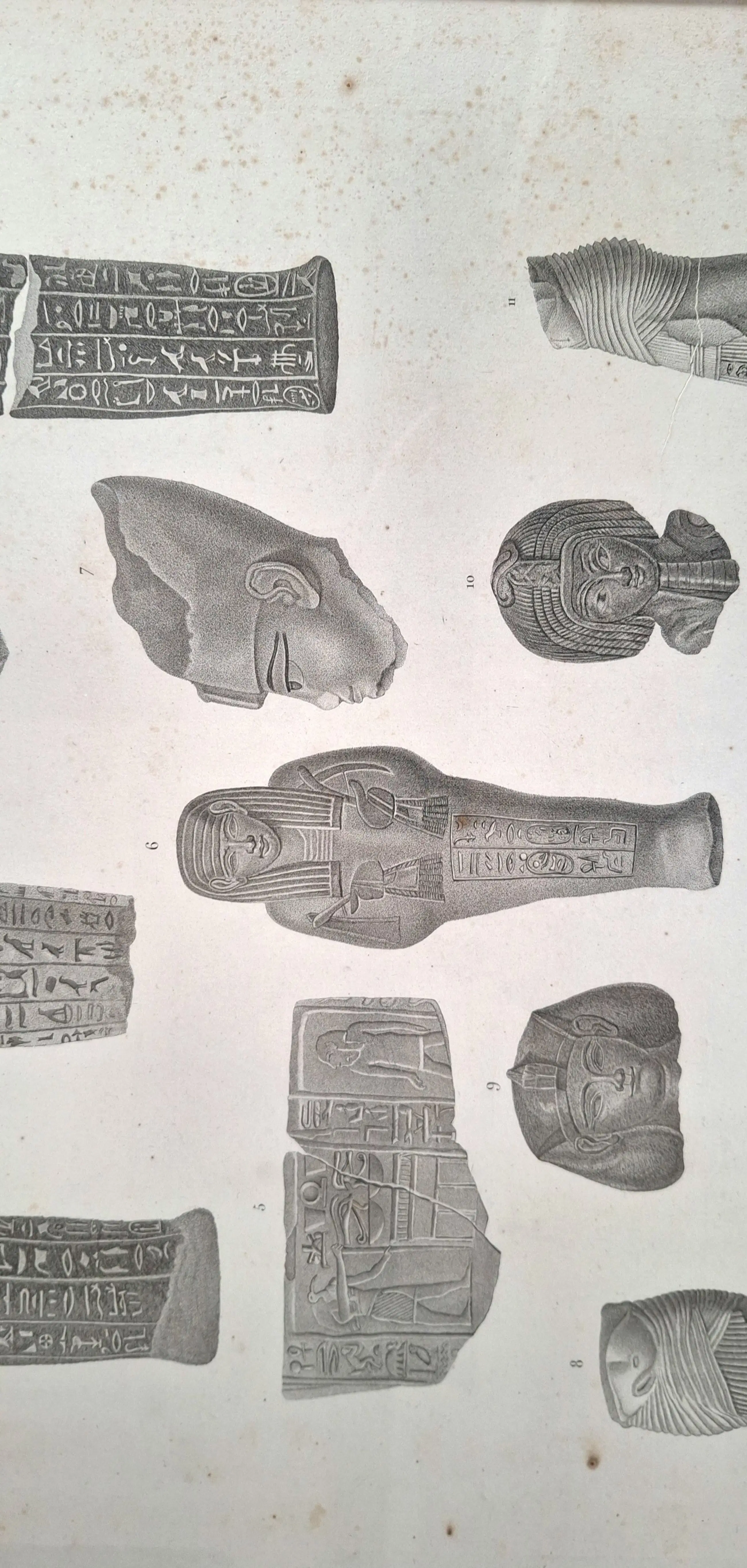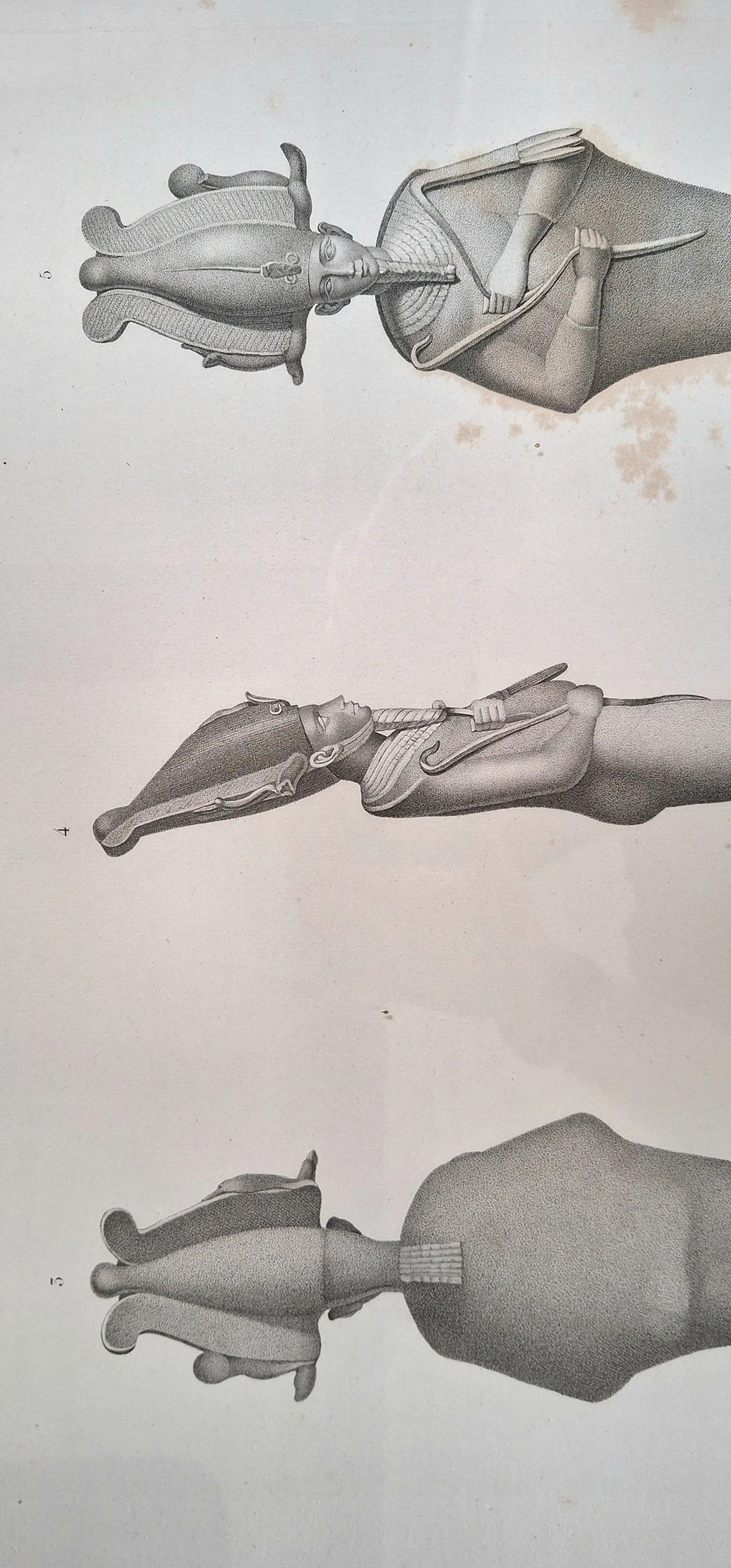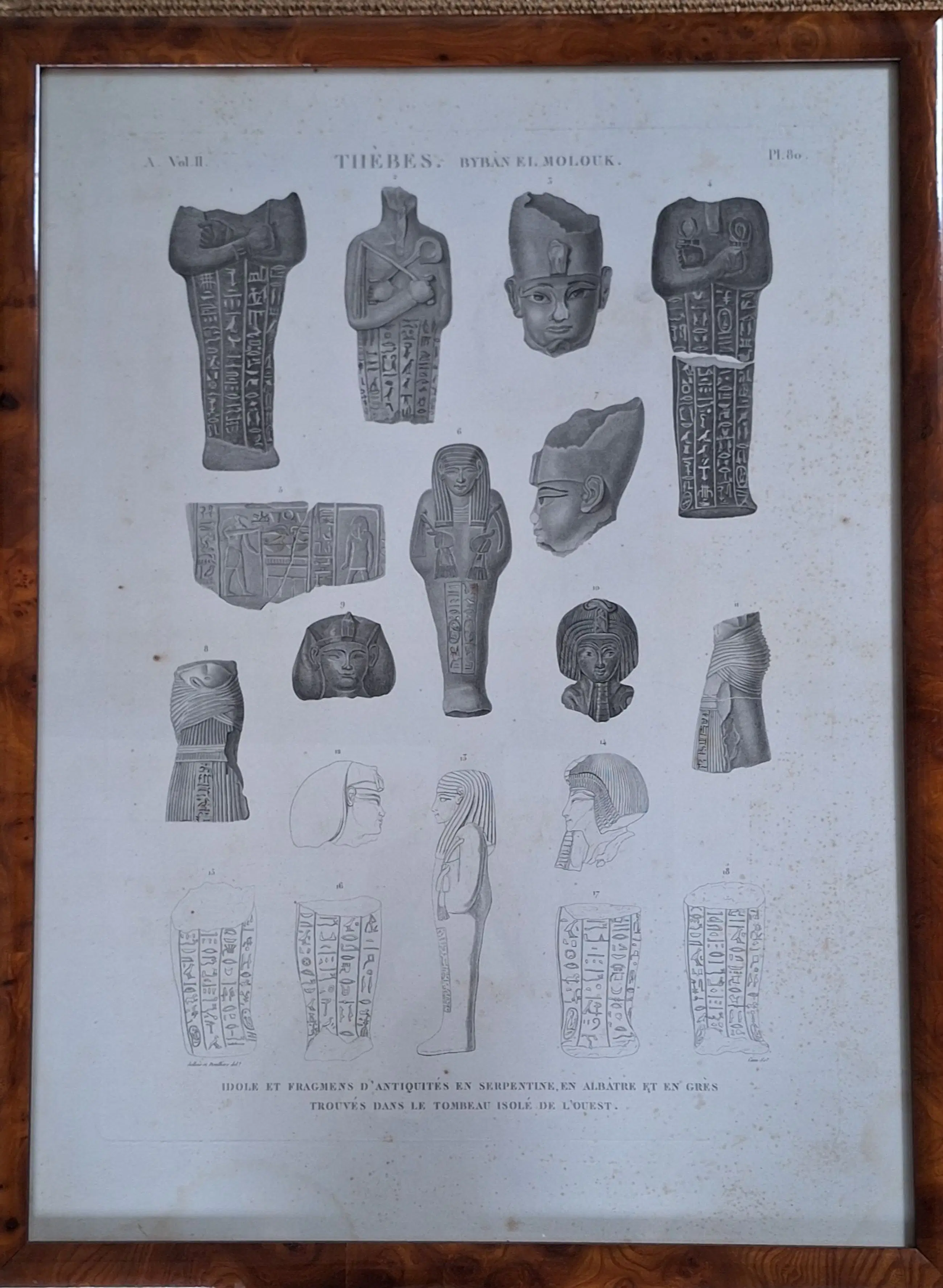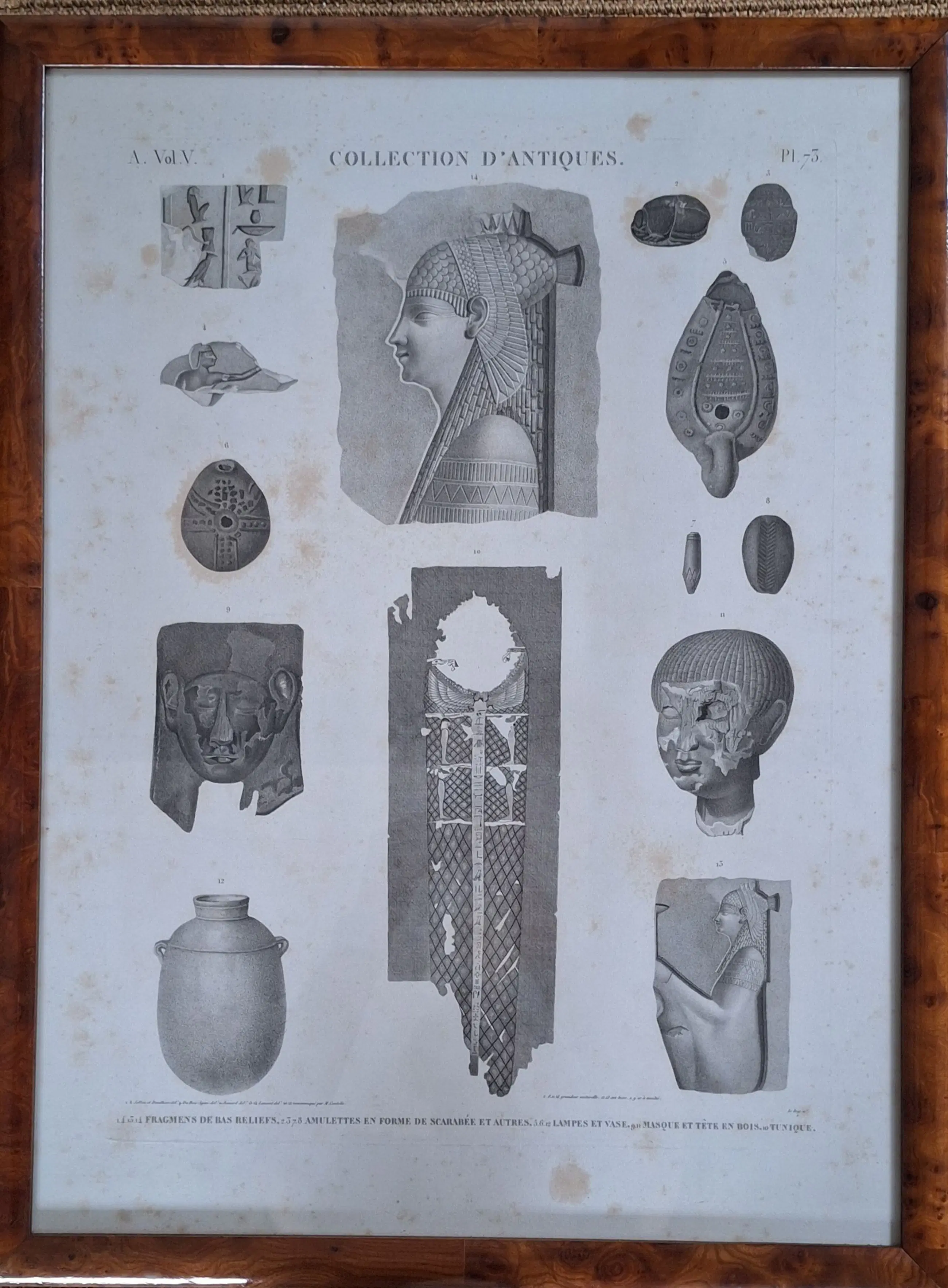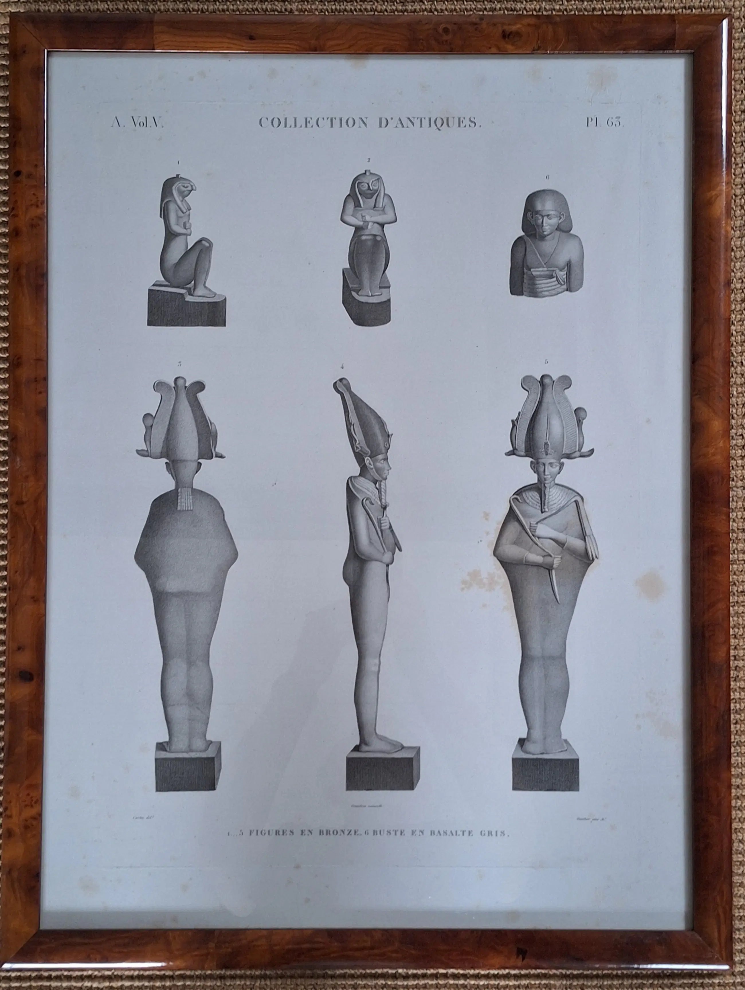 Drie originele, ingelijste gravures uit serie "Egypte- collection d'antiques" (Frankrijk, Parijs). Deze gravures maken deel uit van de "Keizerlijke editie" (Napoleon III) uit 1809. Het was de eerste keer dat prenten op zo een groot formaat konden worden gereproduceerd. Er zijn kleine roestvlekjes Gravures achter glas met stevige lijst in notenhout.