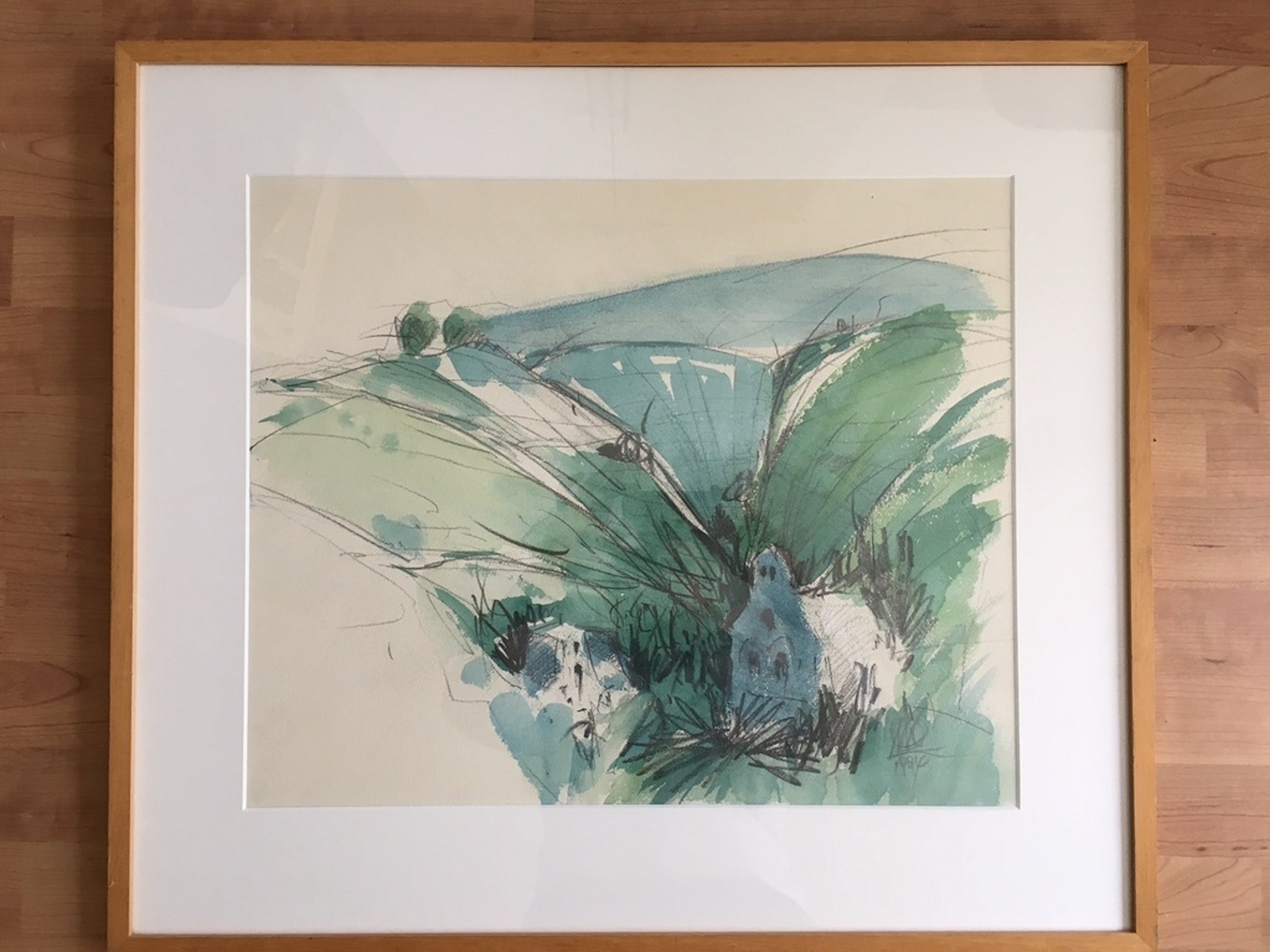 Mooi werk waarvan de kunstenaar helaas onbekend is. Mooie mat/groenblauwe invulling van een houtskoolwerk.