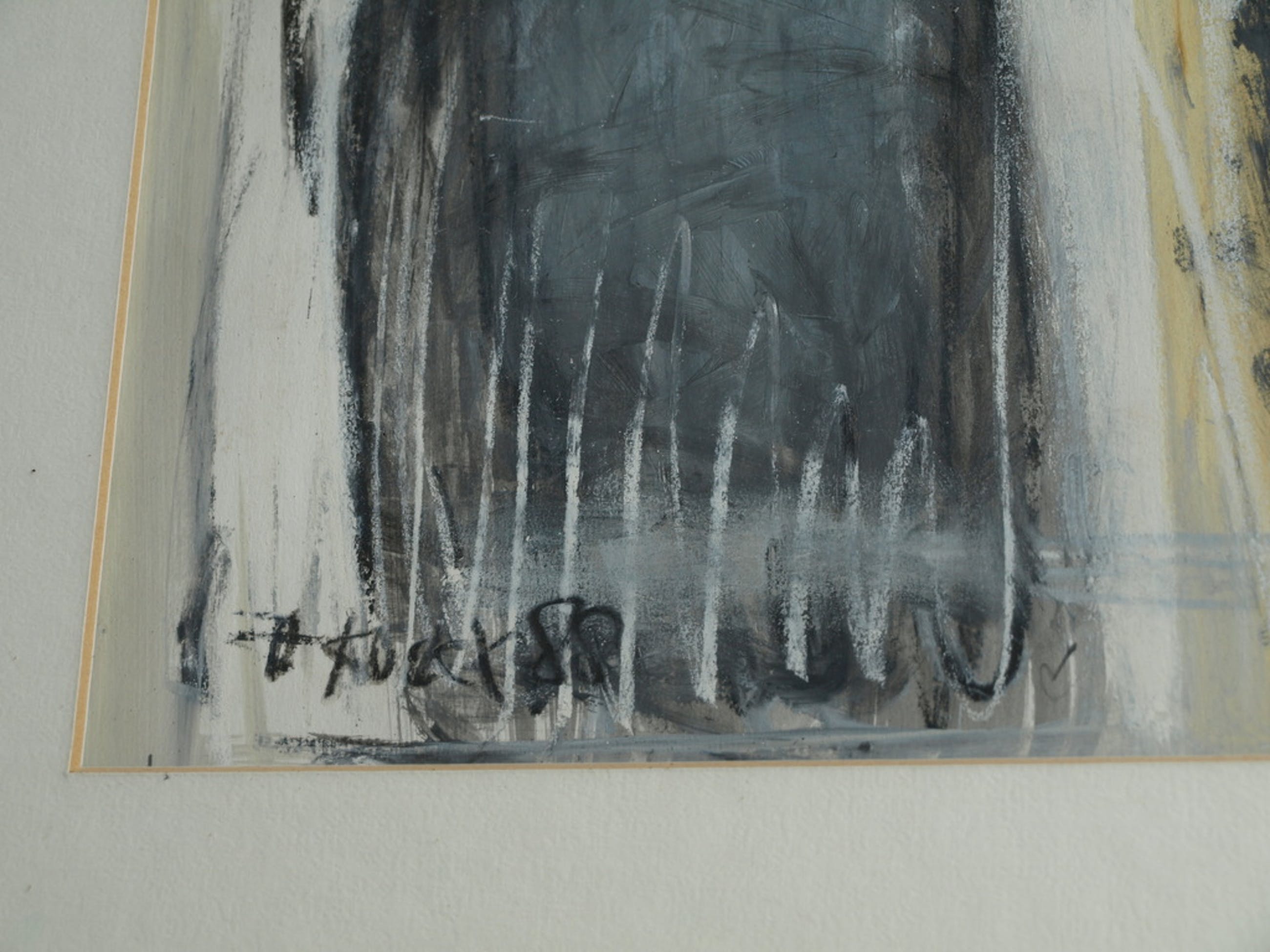 Het werk is ingelijst in een houten lijst met glasplaat en passe-partout.