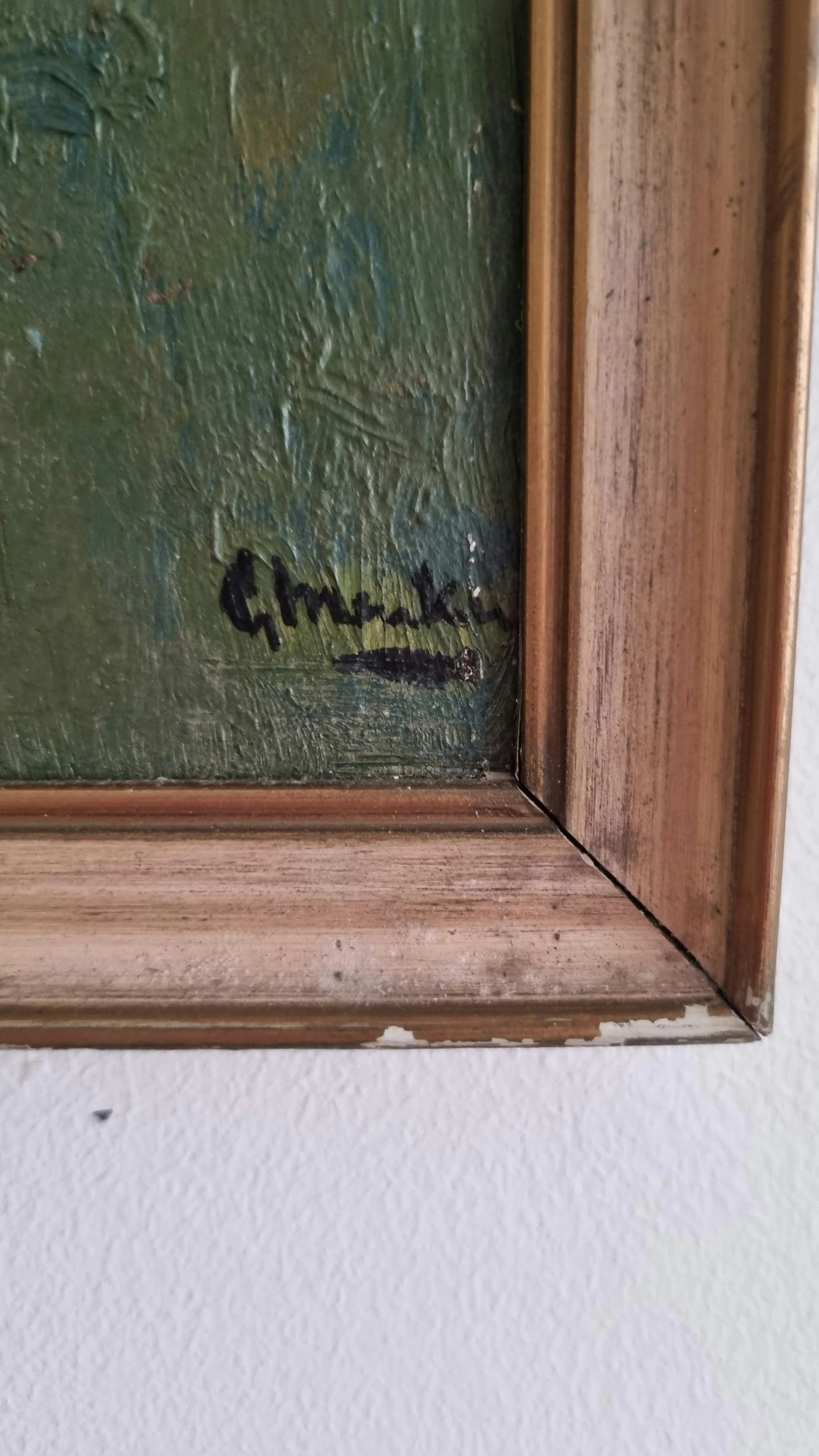 Het schilderij is ingelijst in een originele houten lijst met lichte slijtage aan de hoeken, passend bij de ouderdom en uitstraling van het werk.