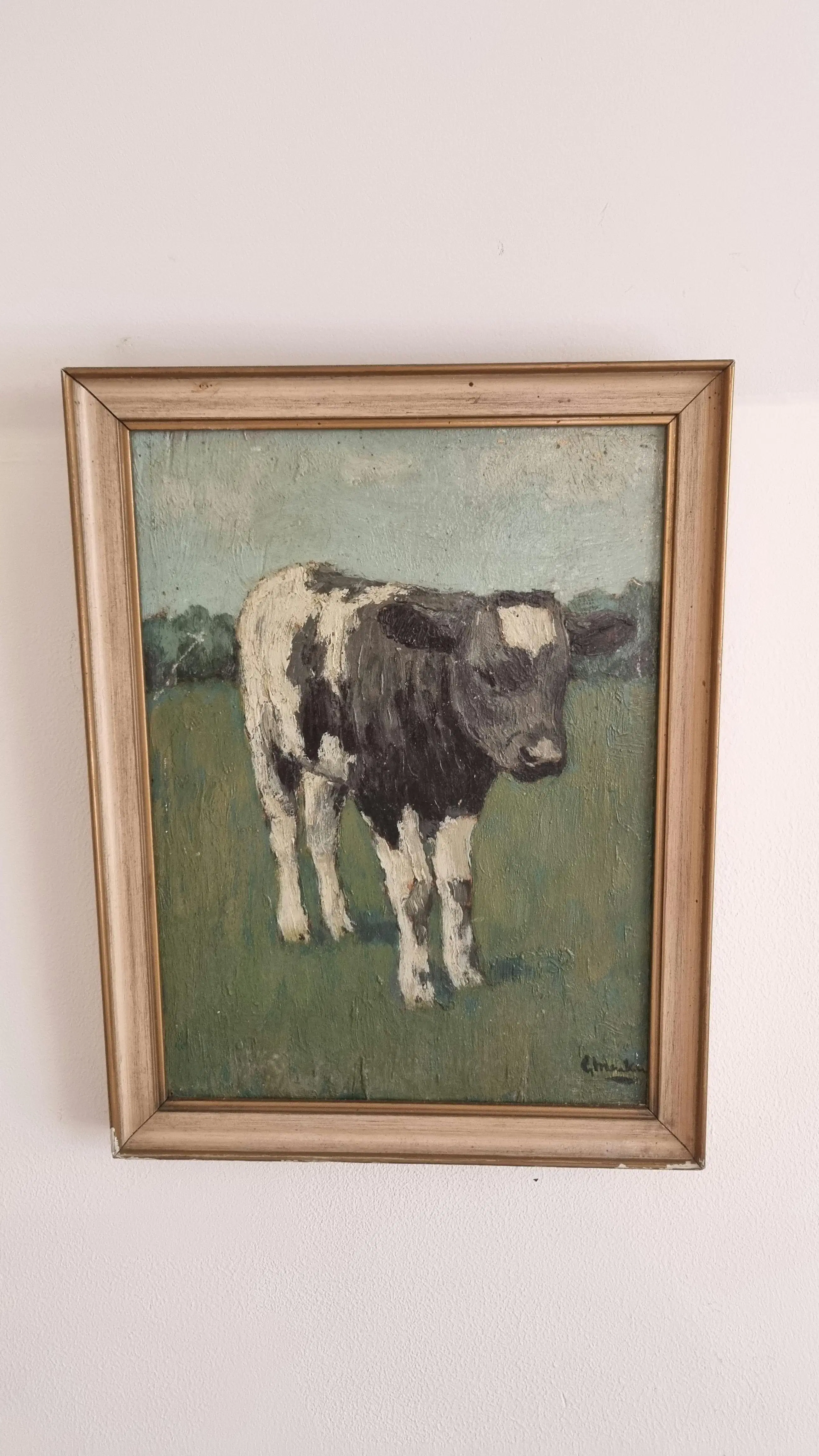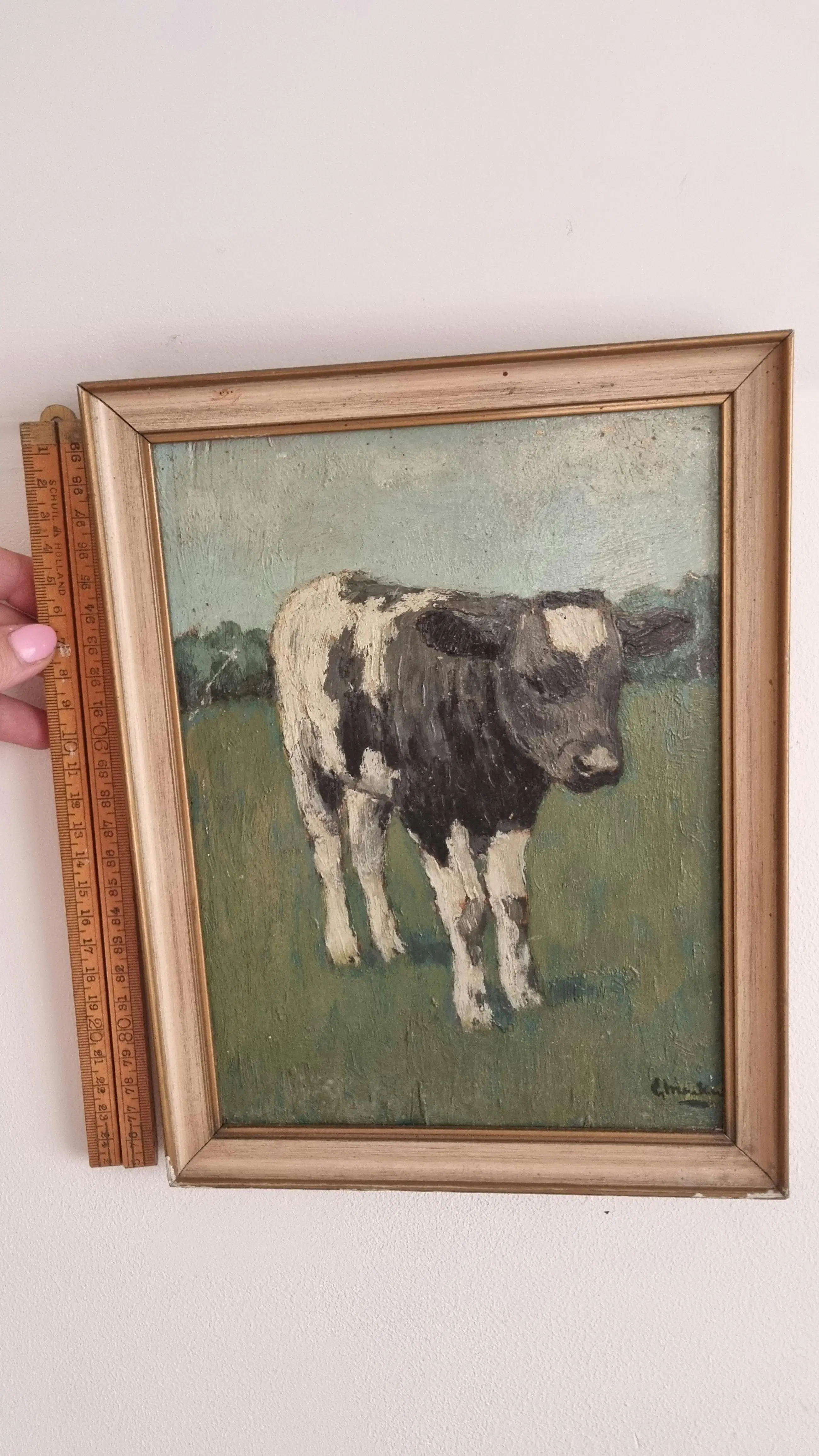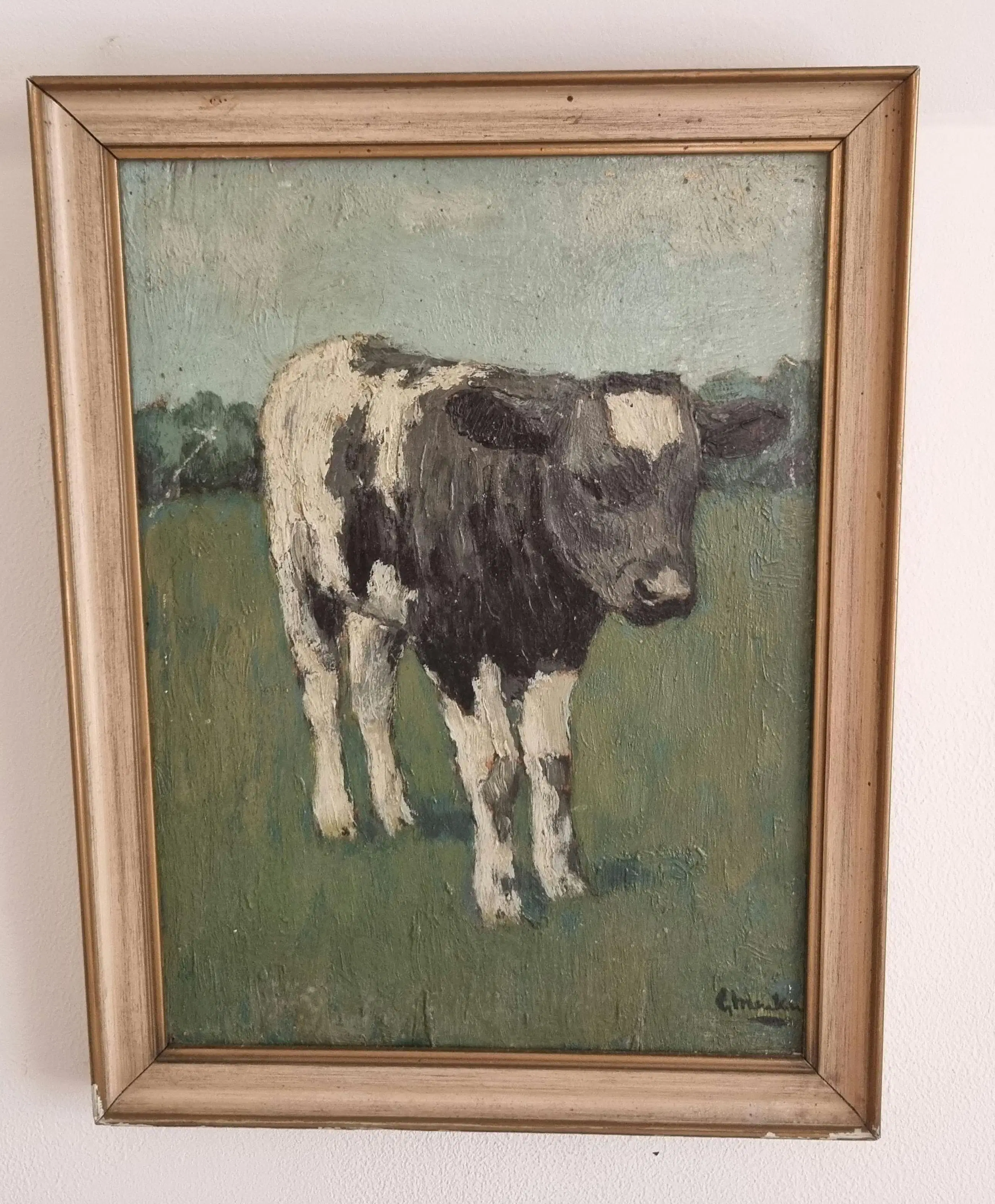 Te koop aangeboden: een charmant, rustiek olieverfschilderij van een zwartbonte kalf in een groene weide, onder een typisch Nederlands luchtlandschap. Het werk is geschilderd in een losse, expressieve stijl en is gesigneerd rechtsonder met “L. Meakin”. Vermoedelijk werk van de schilder Lewis Henry Meakin.