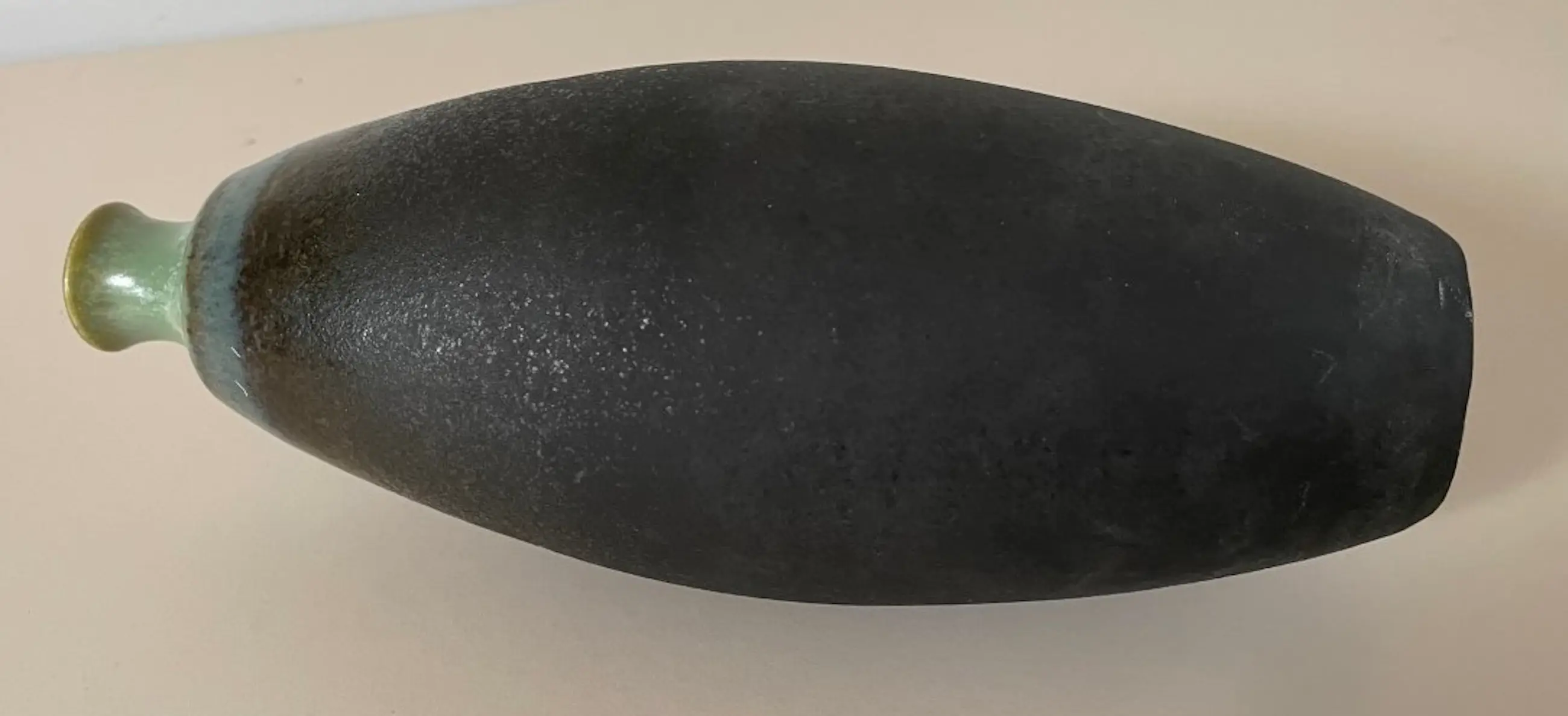 Mooi kunstaardewerken vaasje met mat basalt kleurig glazuur en aan de bovenzijde en groen en zandkleur. Voorzien van een ingedrukt merk aan de achterzijde. In onbeschadigde conditie.