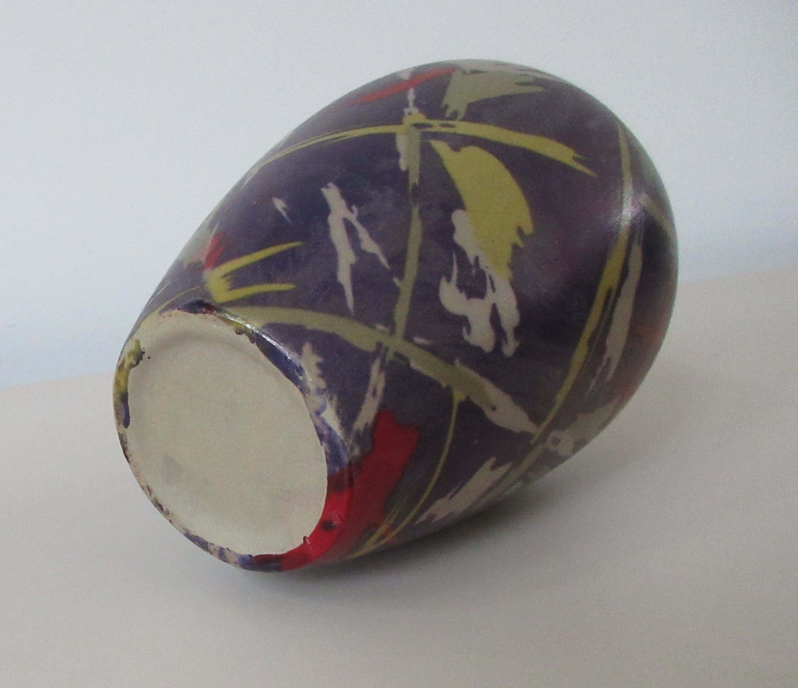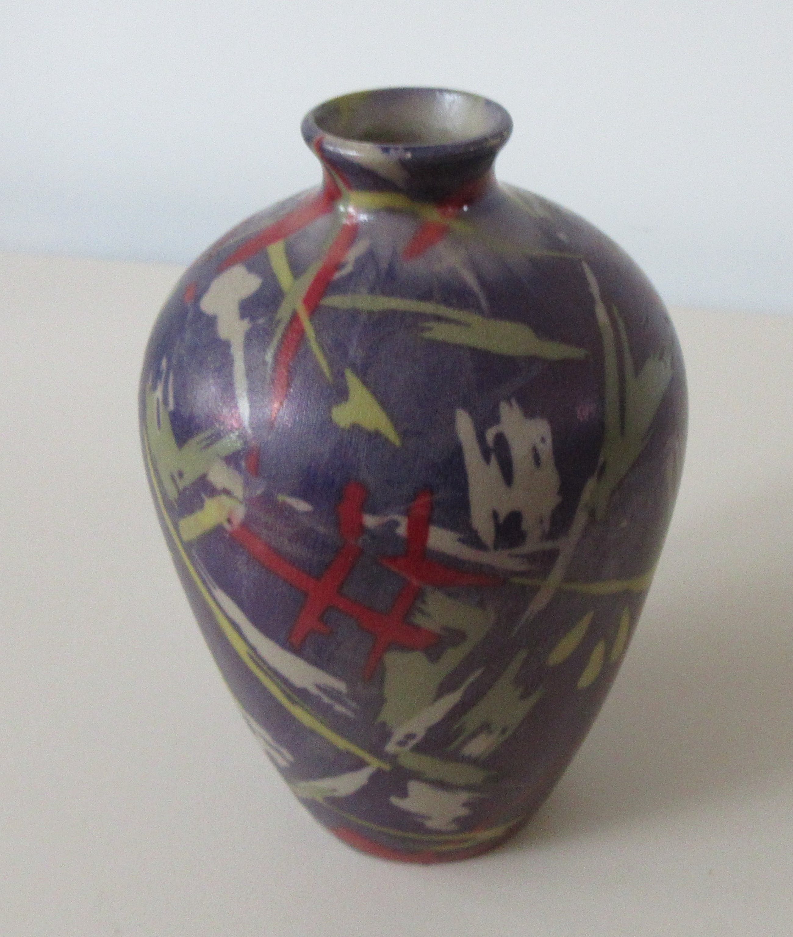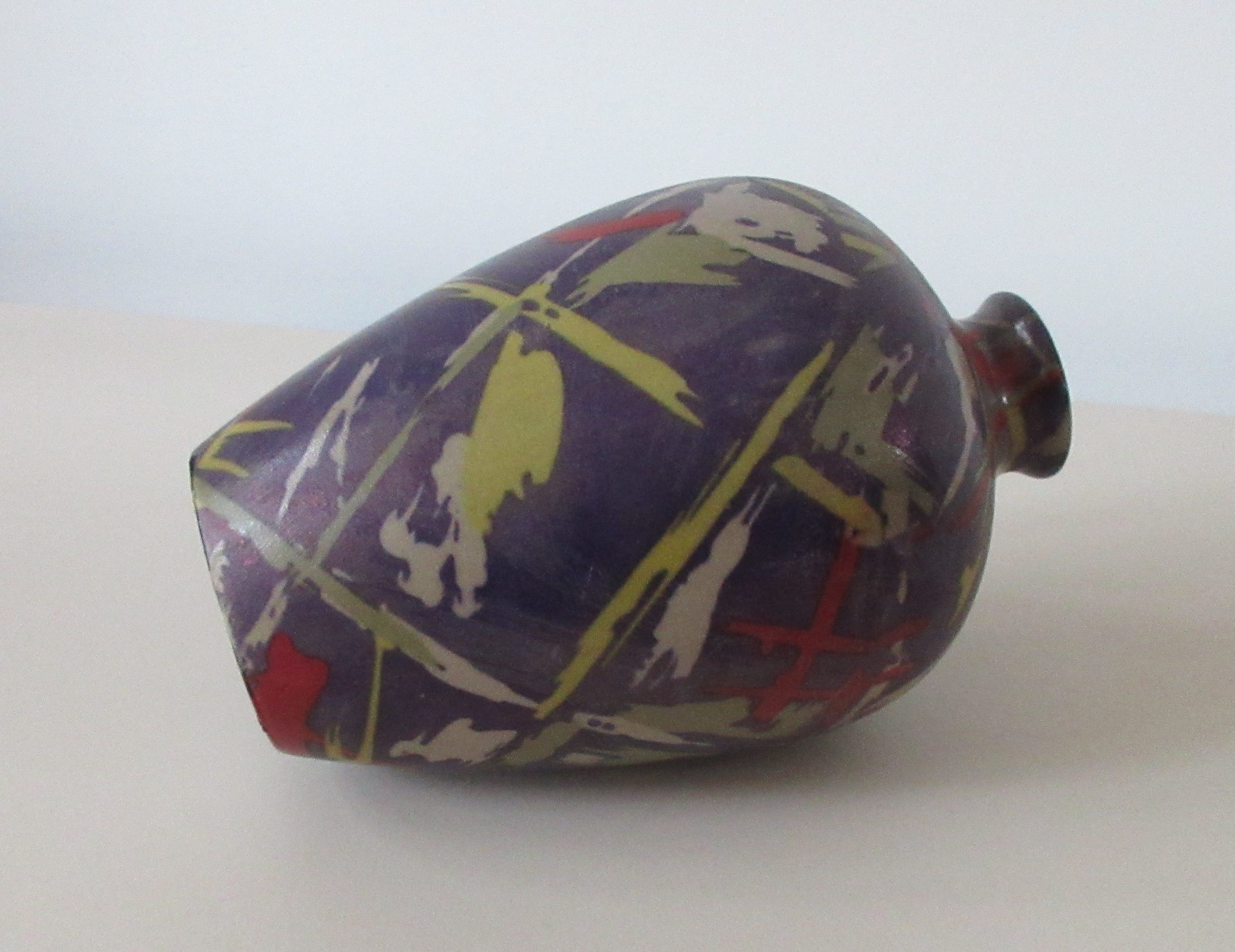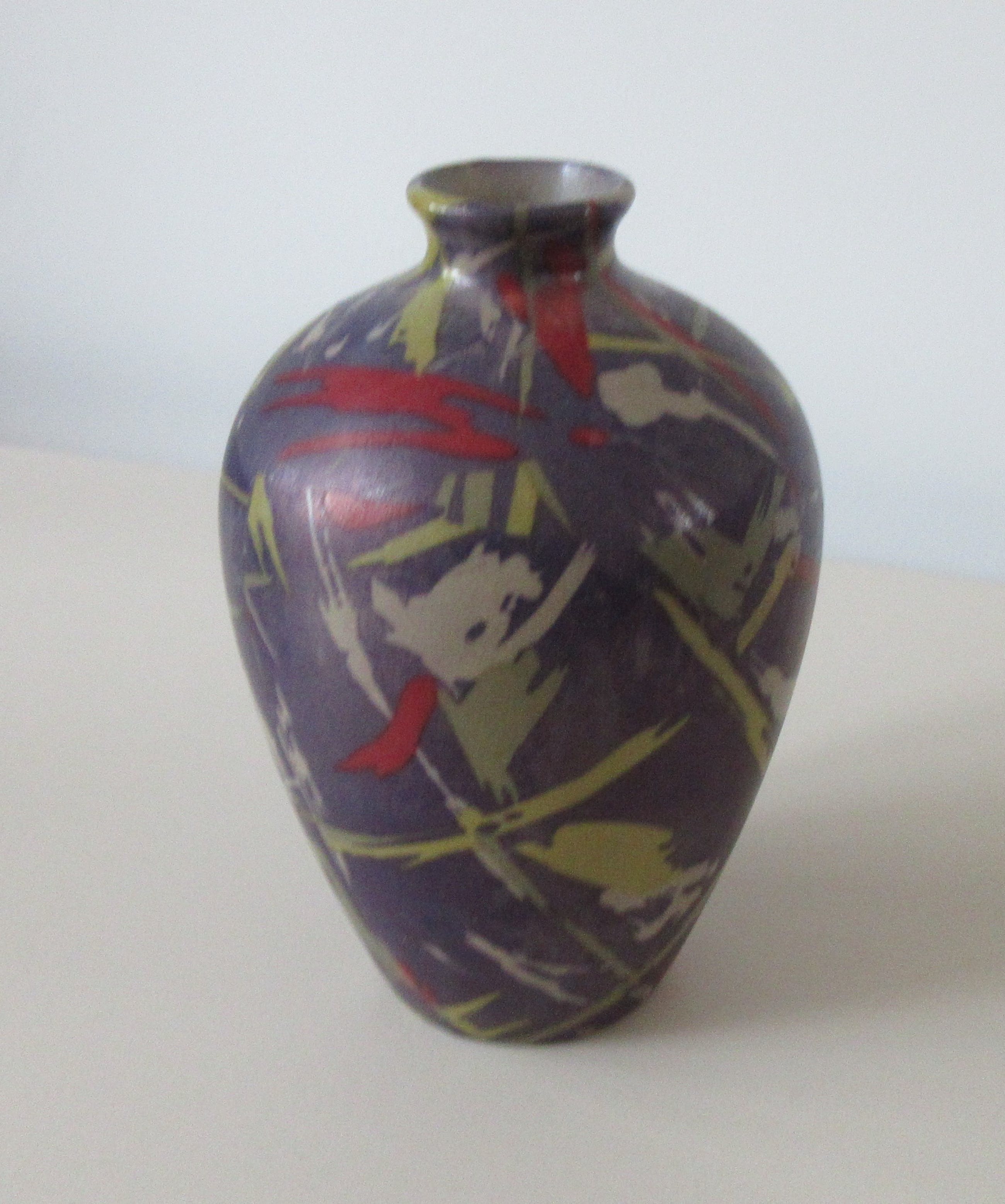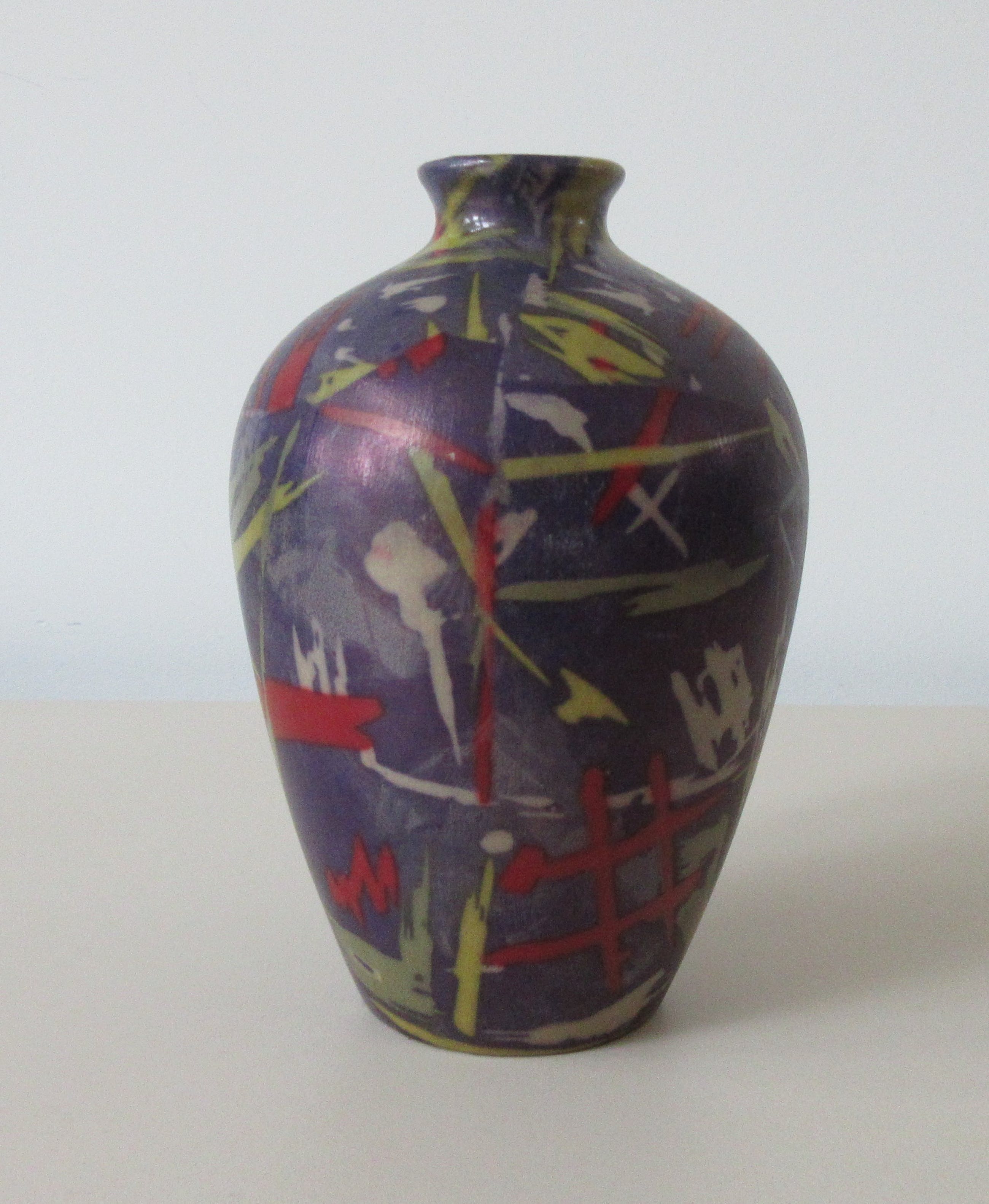 Studio Keramisch vaasje met abstract decor van rode, gele, groene en beige graffiti achtige vlekken op een paarse olieachtige achtergrond. Niet gemerkt of gesigneerd dus maker onbekend.