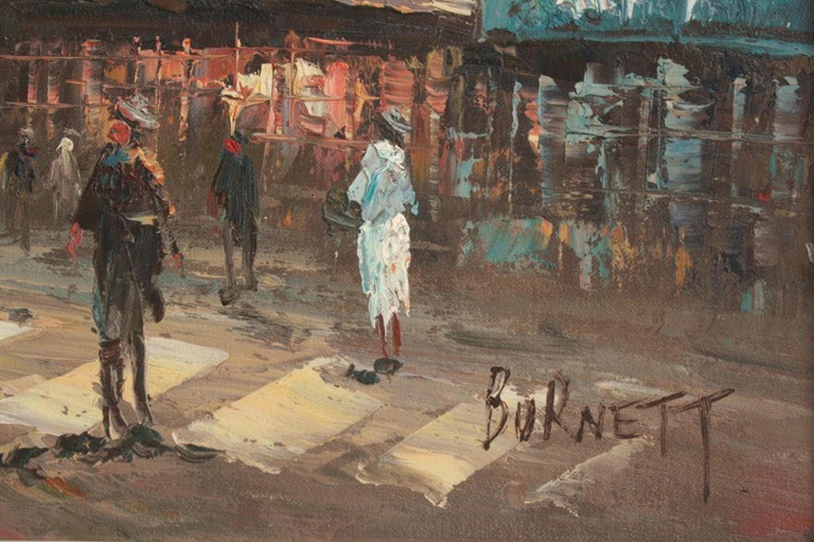 Olieverf op paneel in een houten lijst (met gebruikssporen). Schilderij van de Moulin Rouge in Parijs. Gesigneerd met Burnett. Er zijn (internationaal) meerdere kunstenaars met die naam.