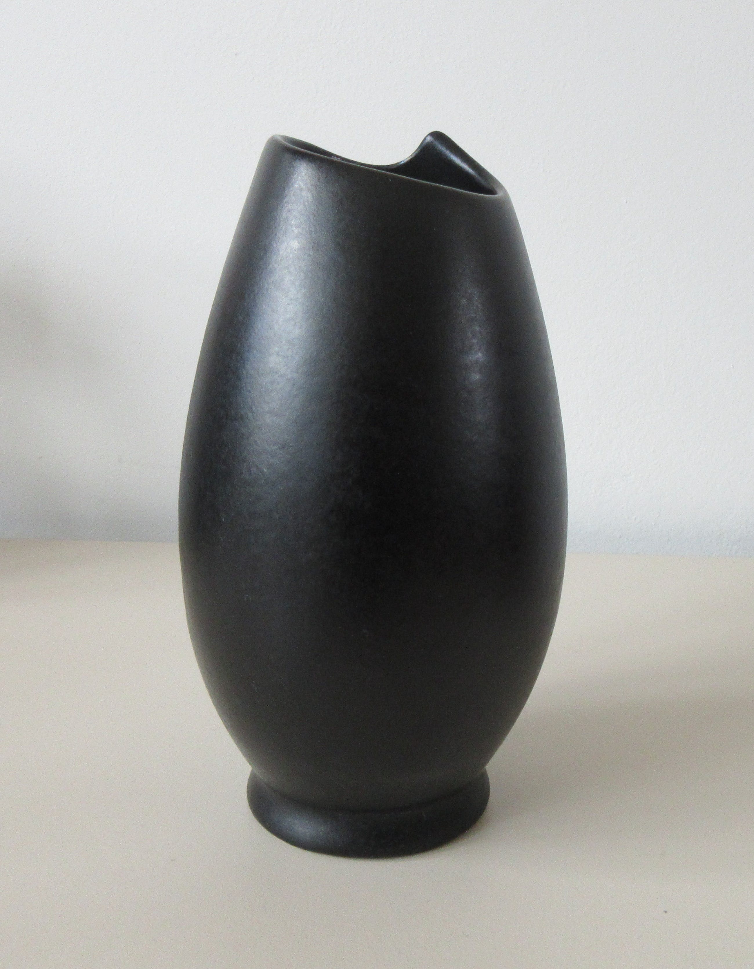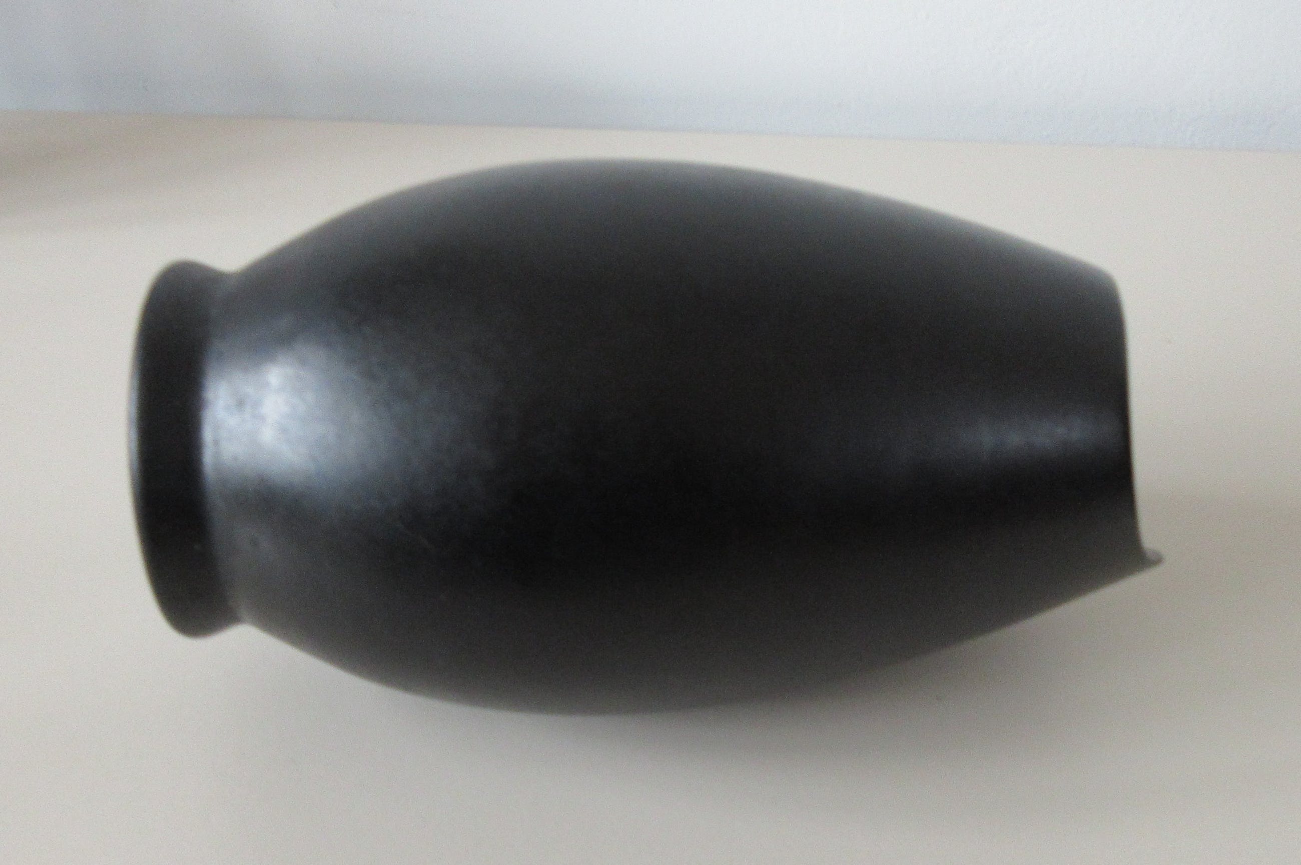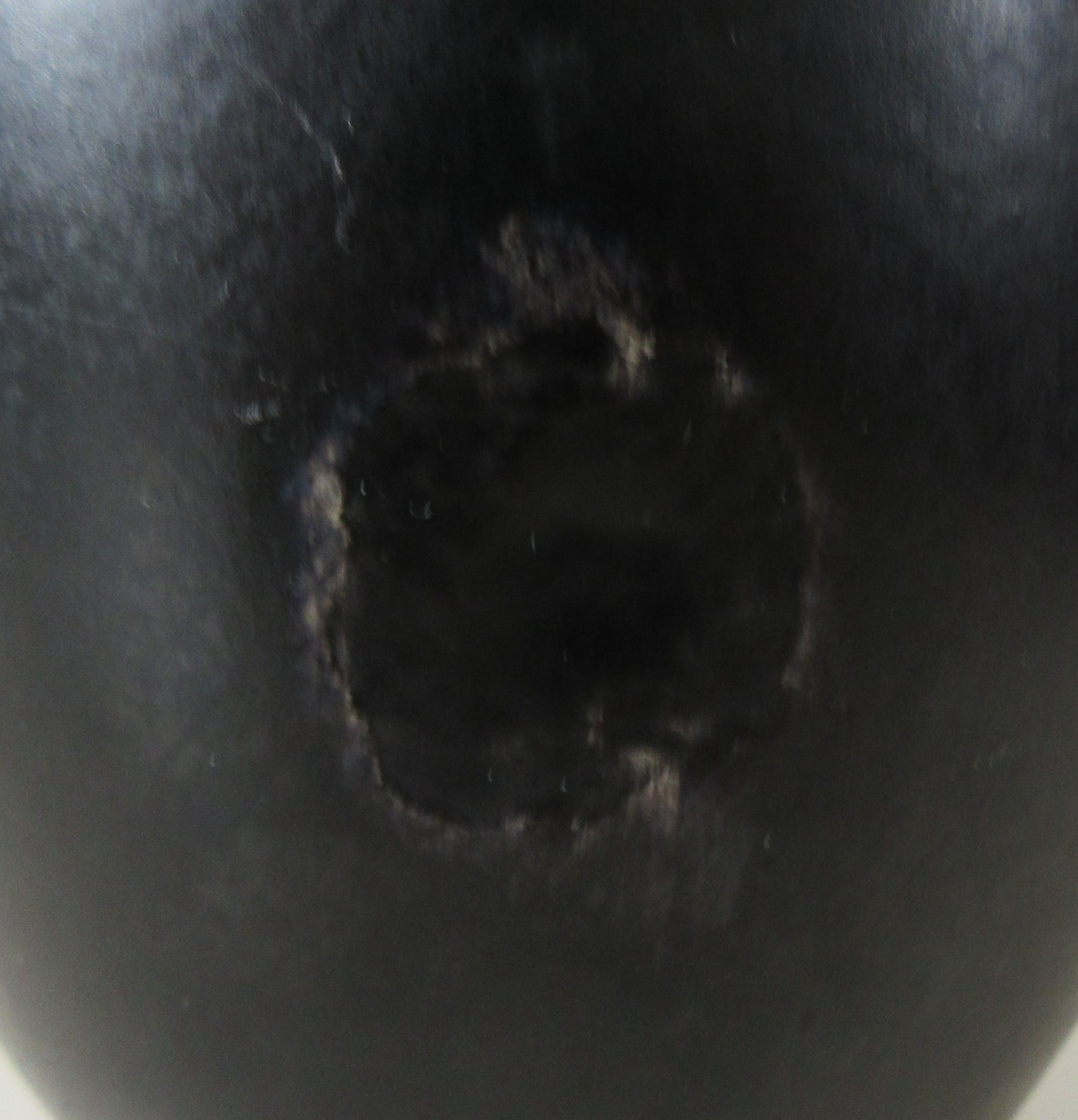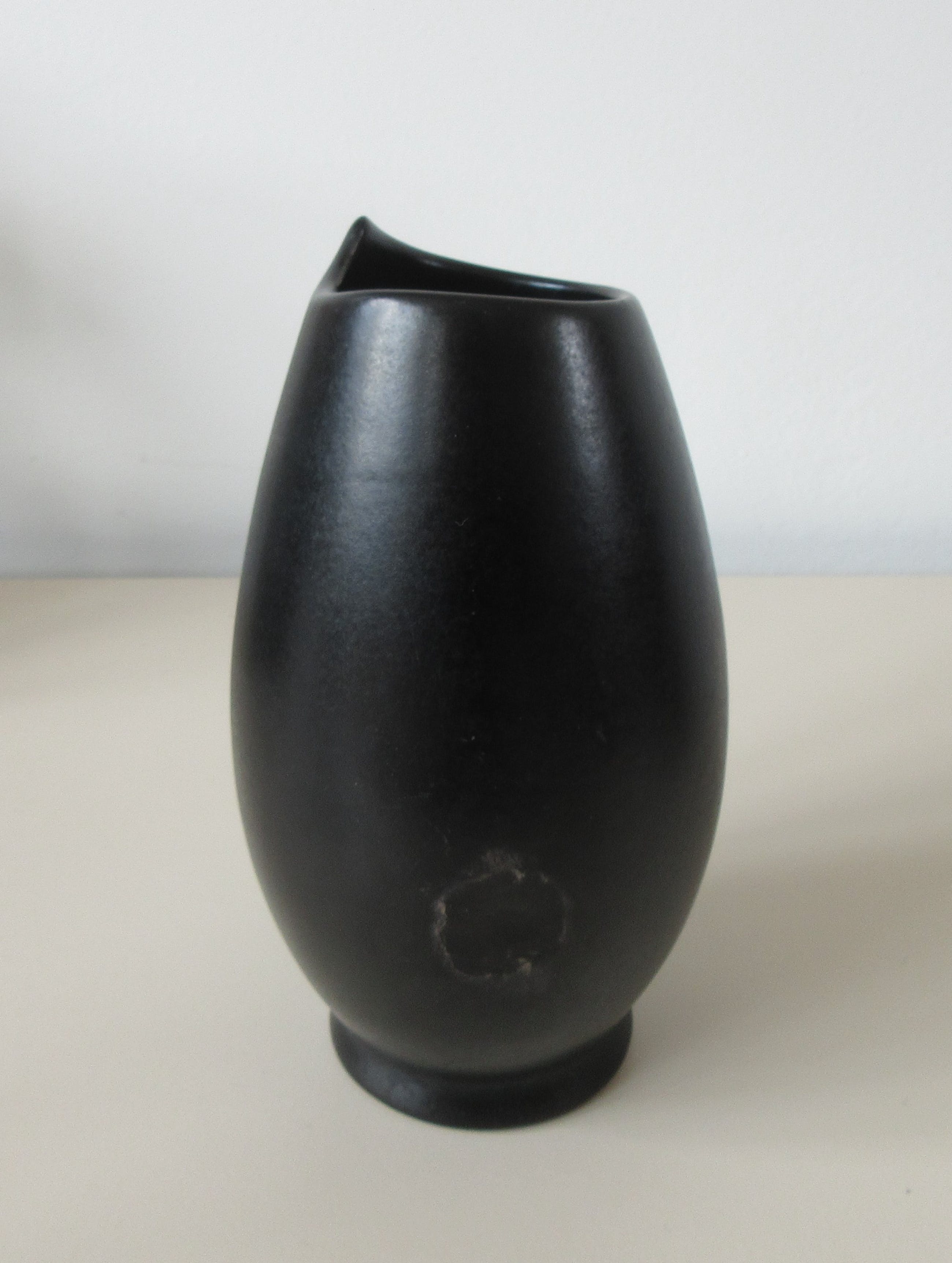 Mat zwart Art Deco platelen vaasje, zeer onduidelijk gemerkt met een nummer of mogelijk PS. Ontwerp mogelijk van Willem Stuurman voor de Zenith of ESKAF, maar mocht er PS dan is het vaasje gemaakt bij de plateelbakkerij Schoonhoven. Wie het weet mag het zeggen.