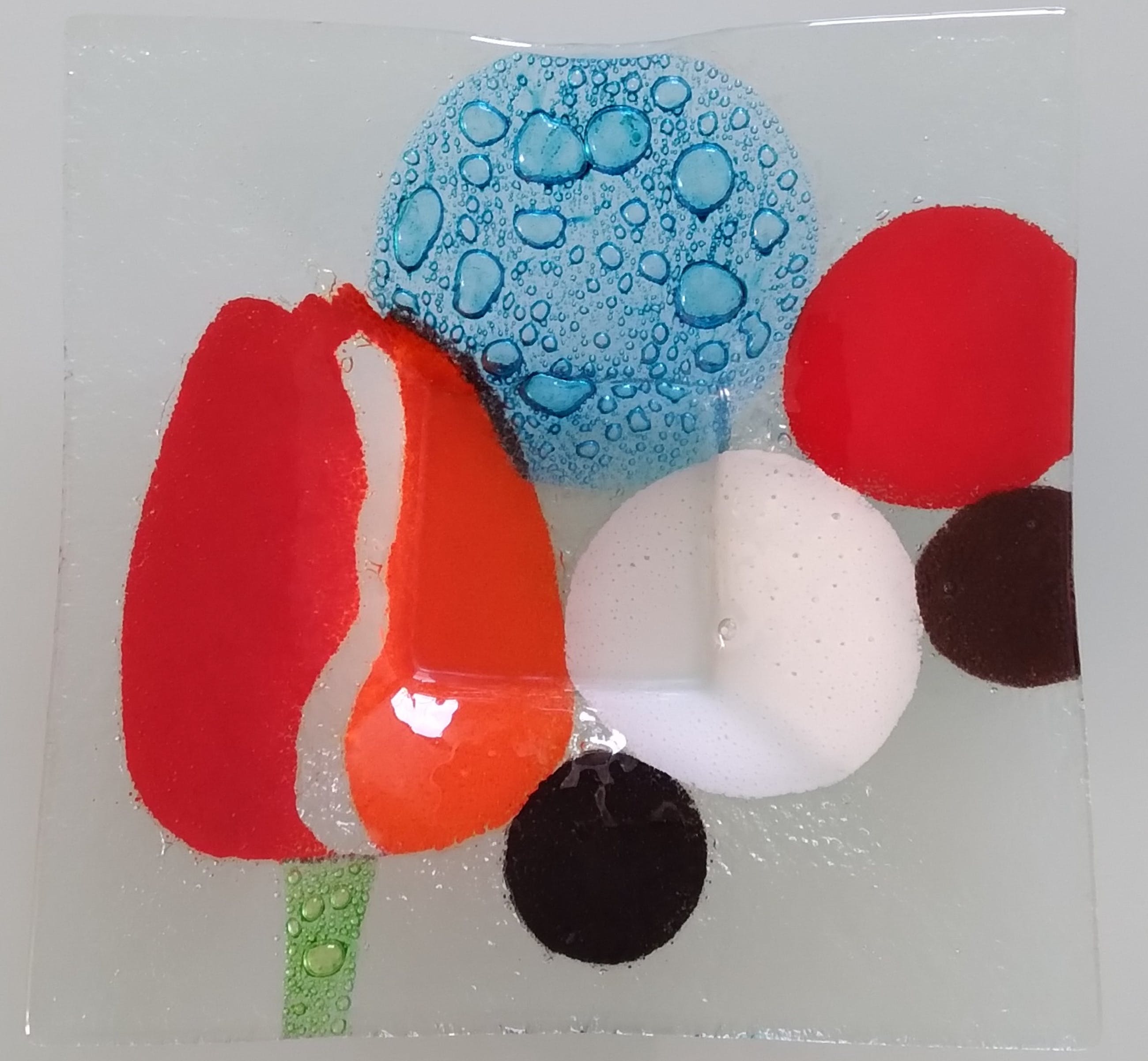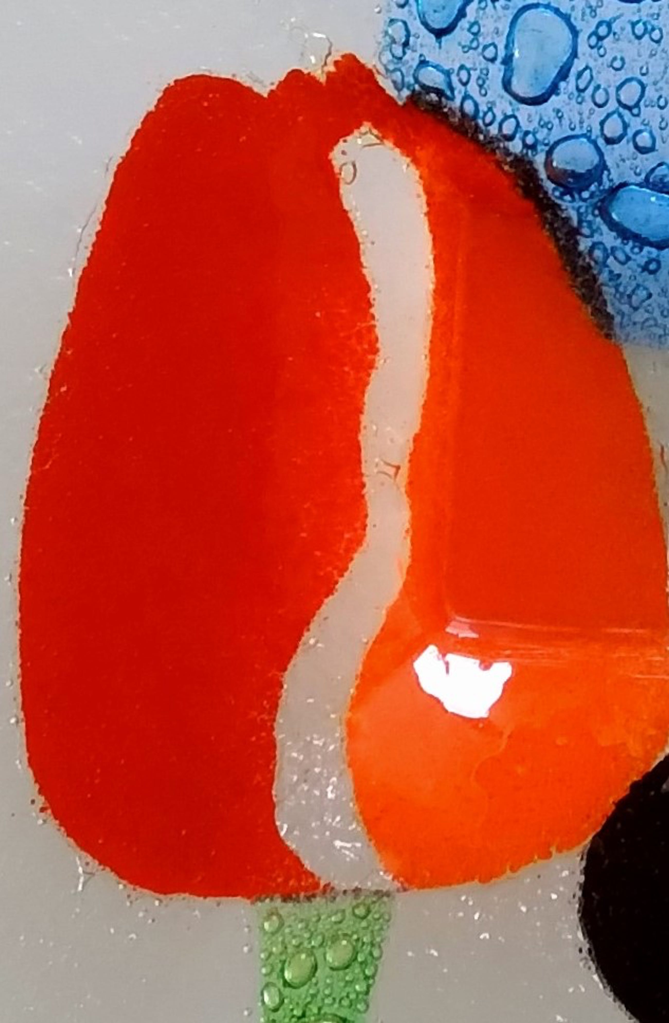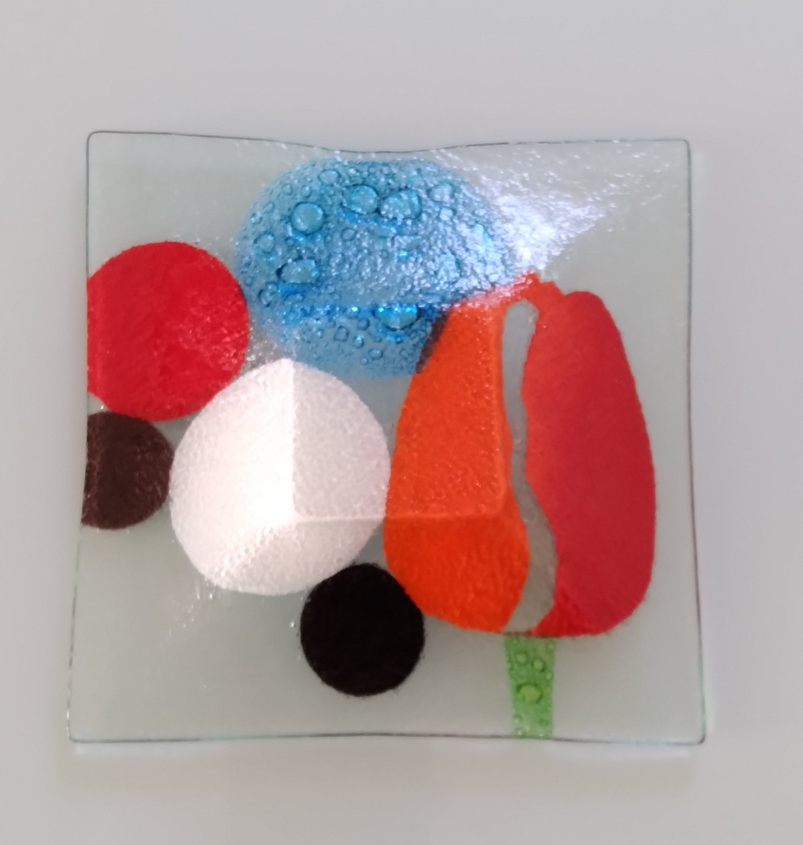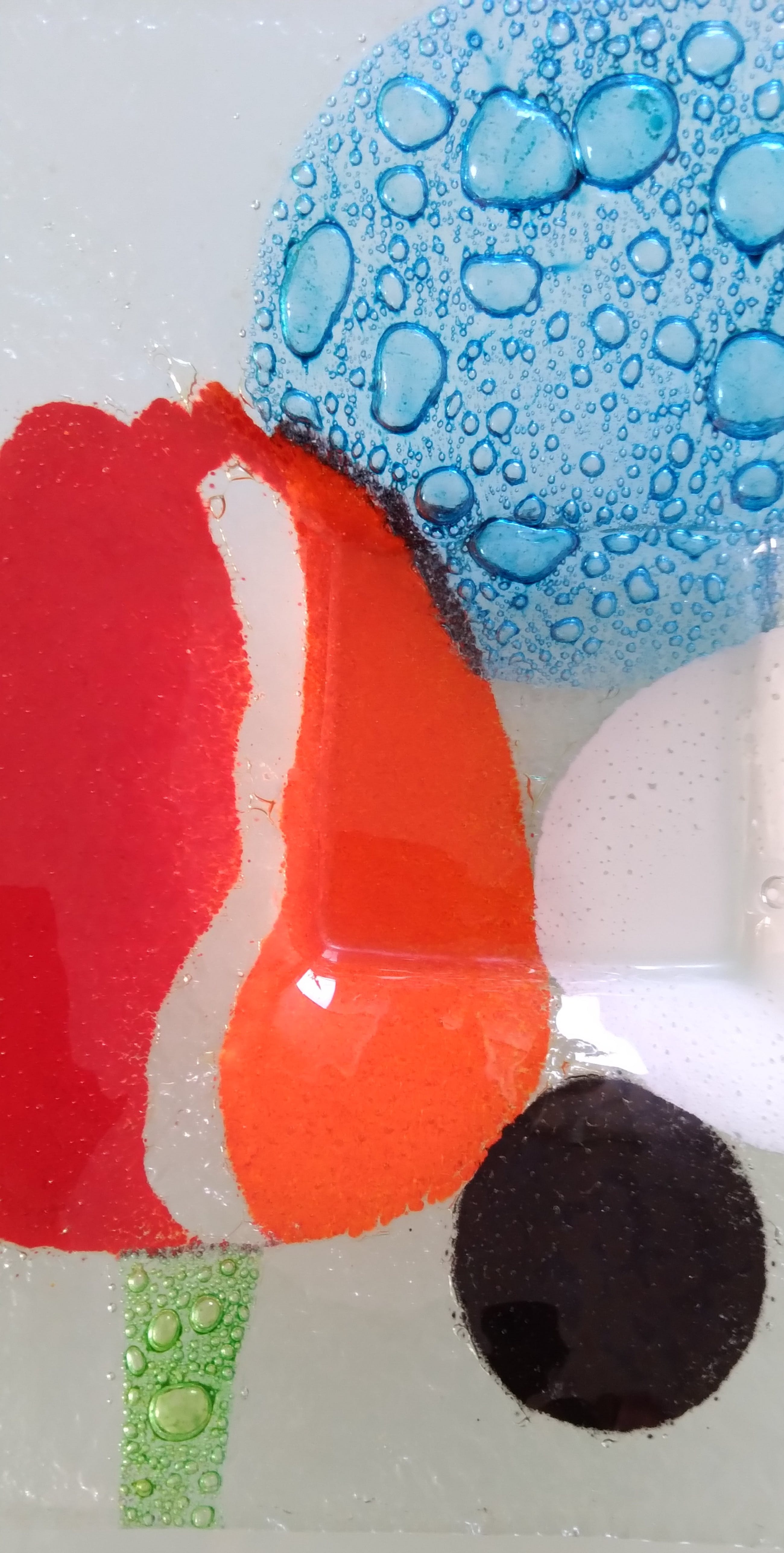 Speelse afwisseling van heldere kleuren, vormen en glasstructuren maken deze handgemaakte schaal een blikvanger.