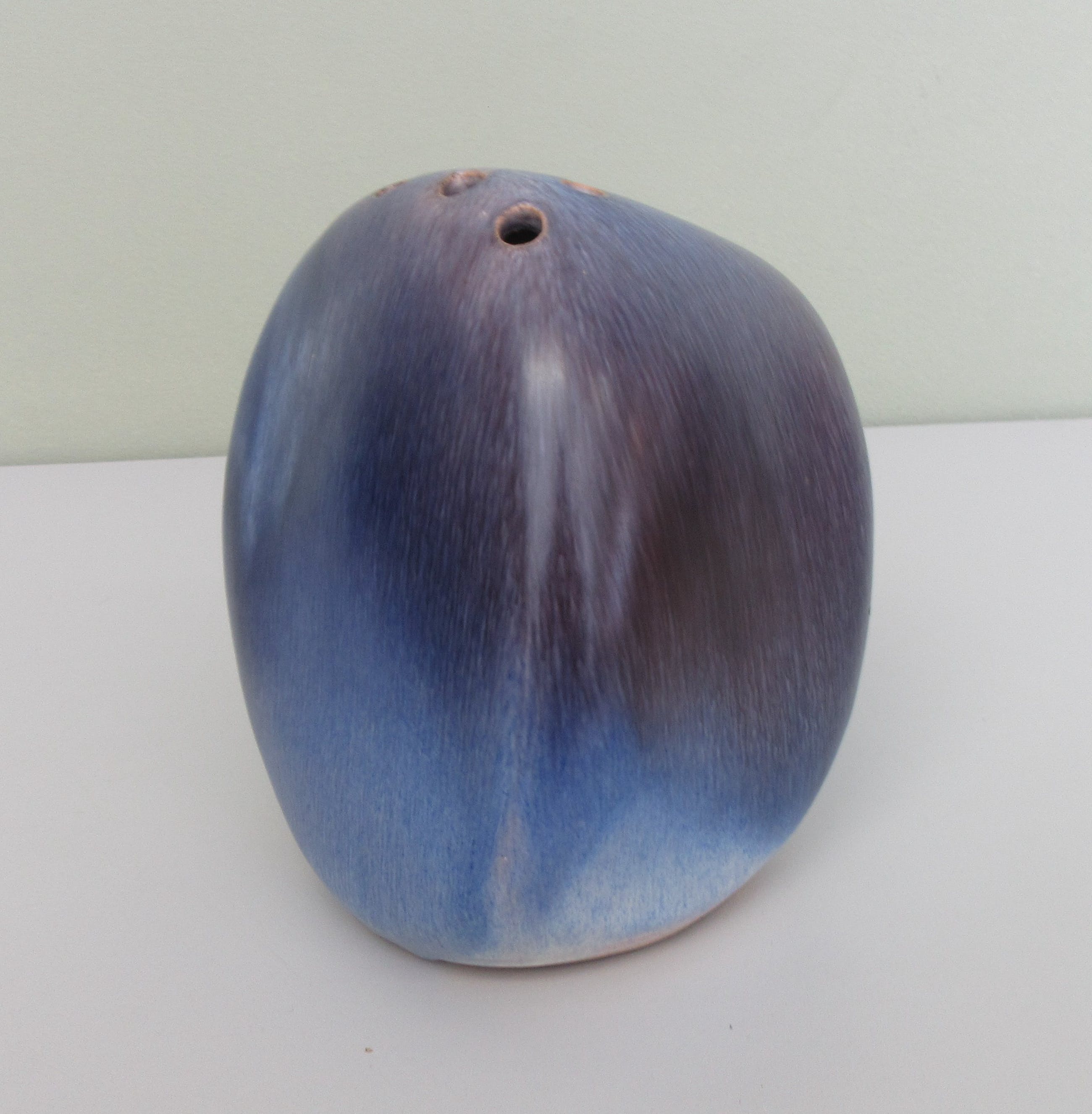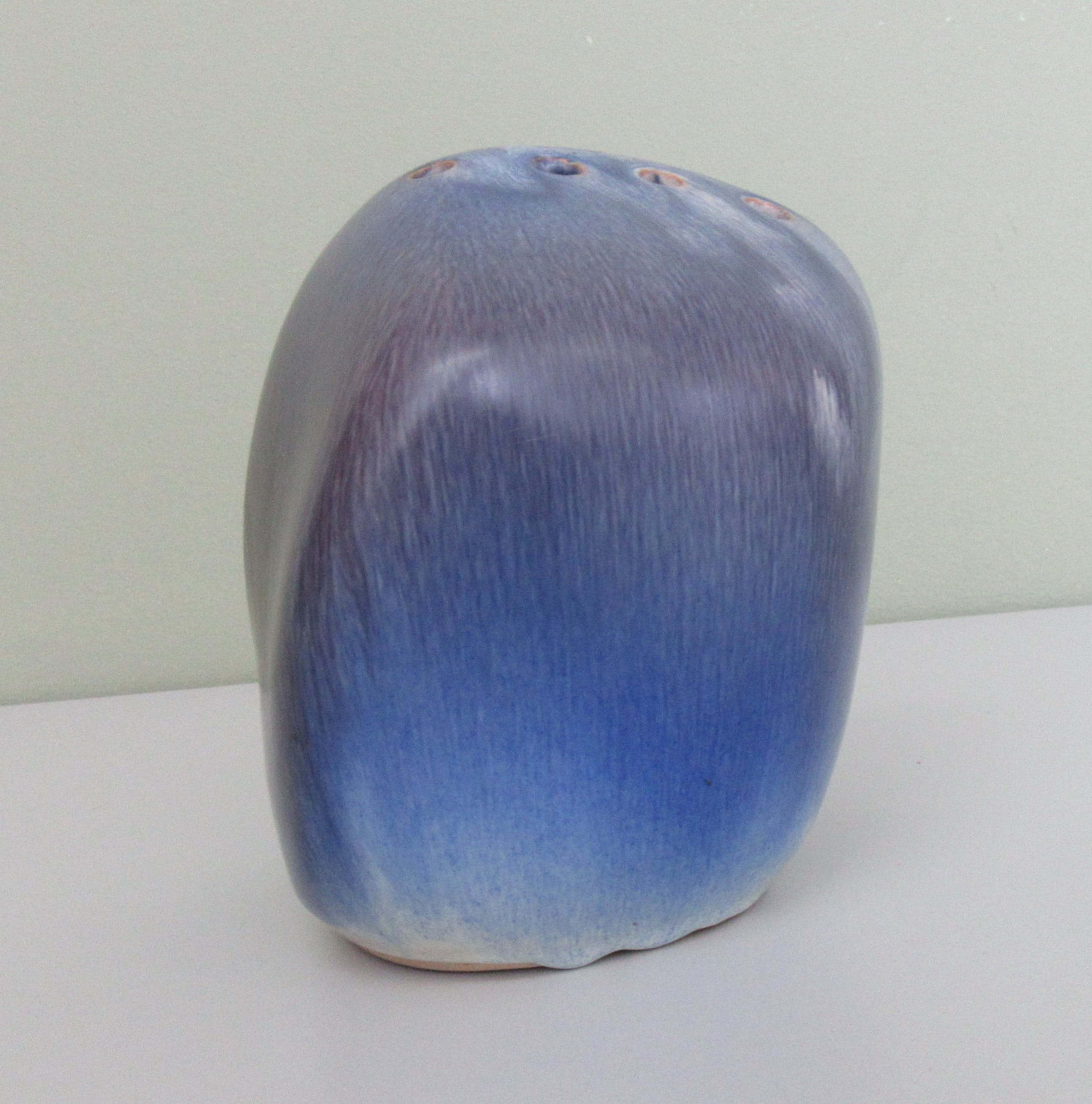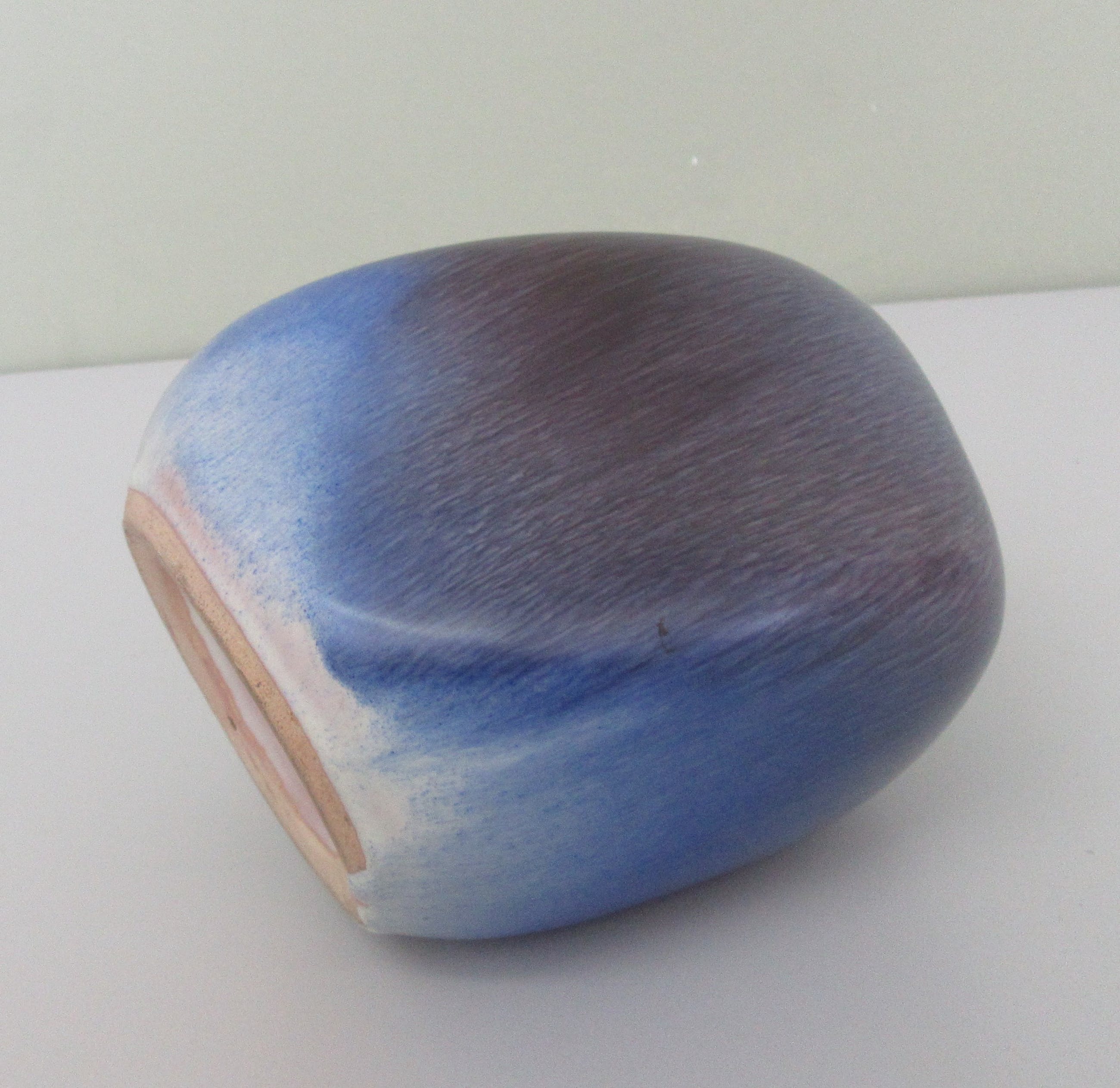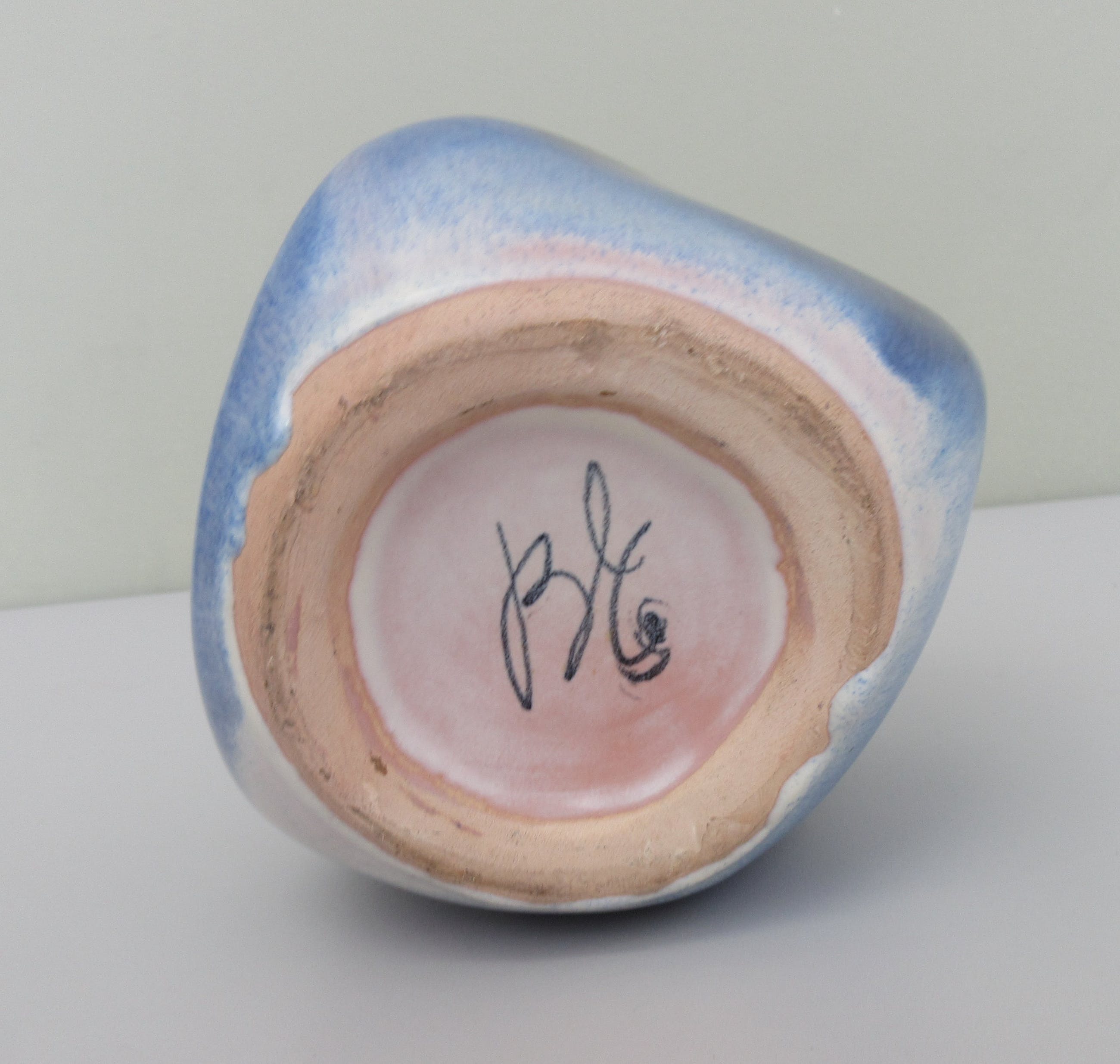 Modernistische aardewerken rozensteker (vaas) in de vorm van een kiezel en voorzien van mooi mat blauw, paars en creme stroomglazuur. Met de hand gesigneerd BLC oid. Kunstenaar of fabriek onbekend.
