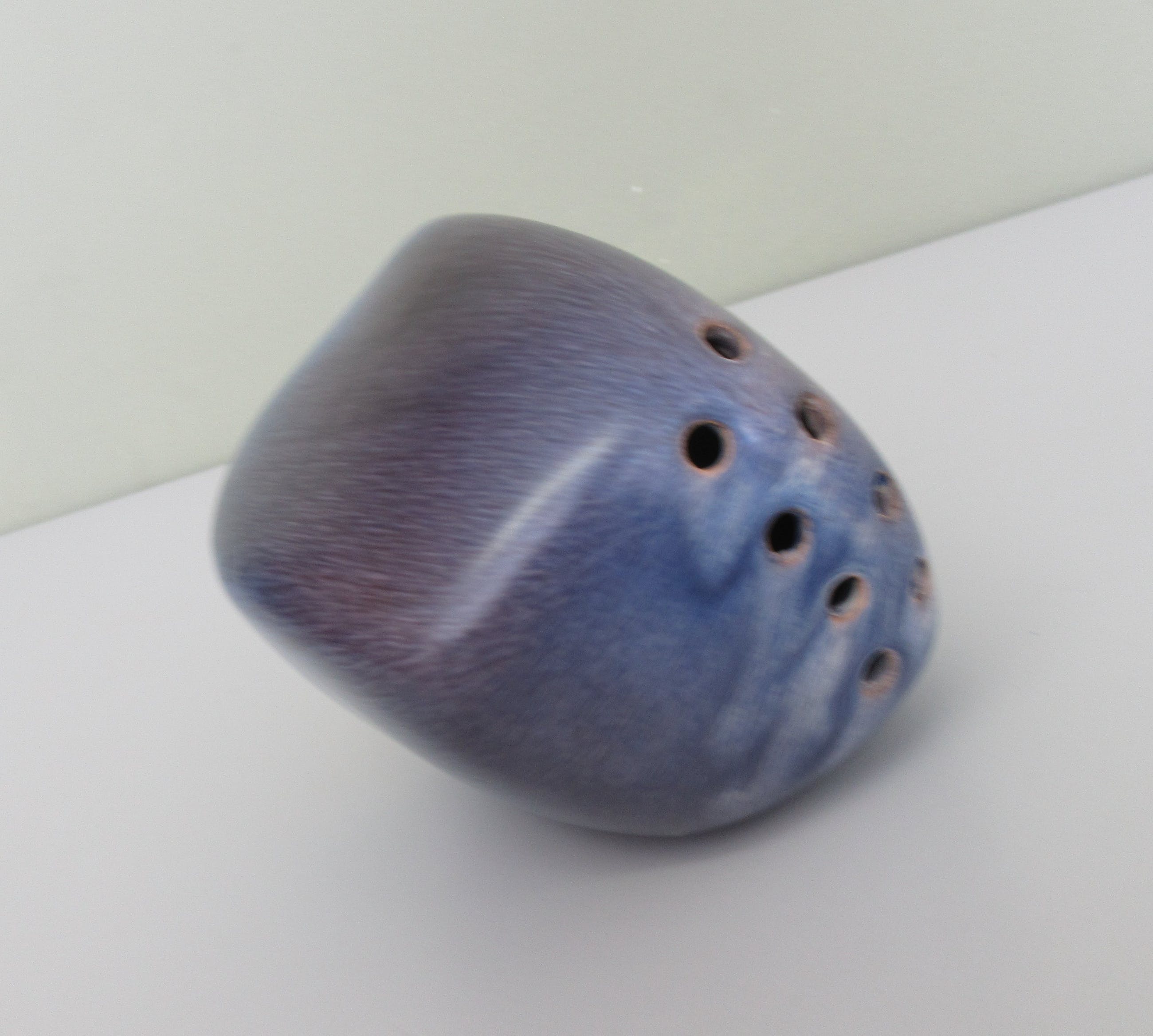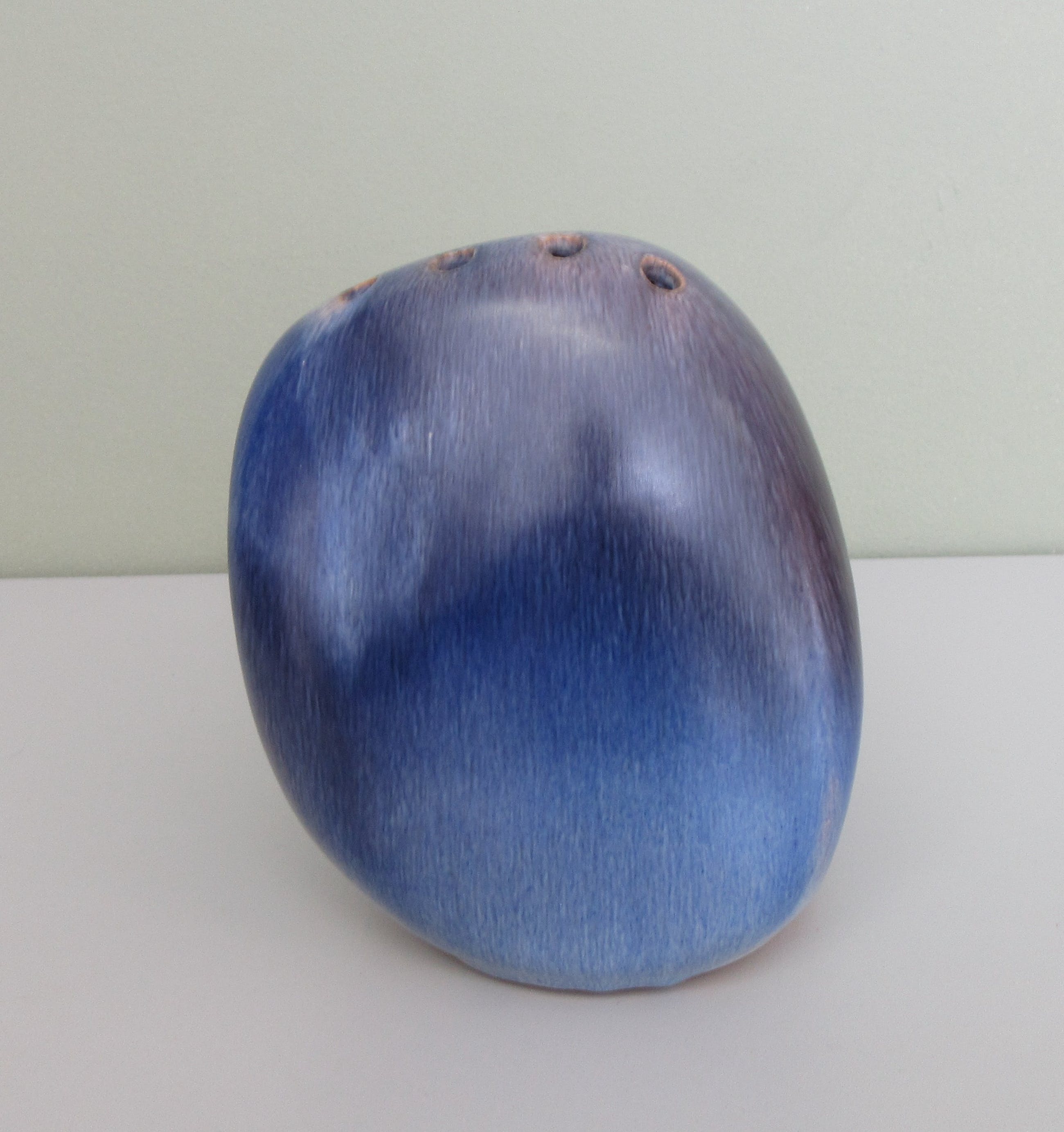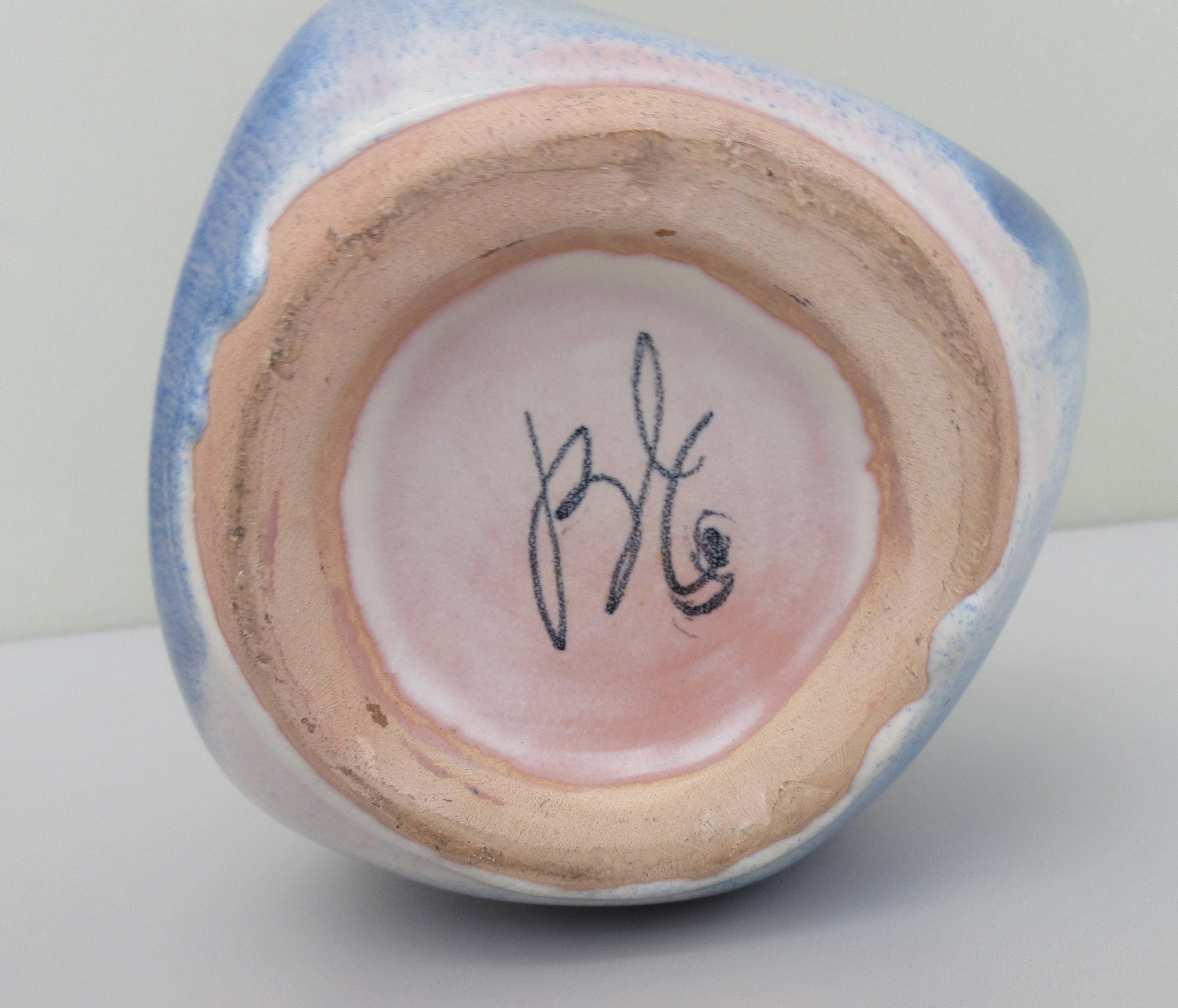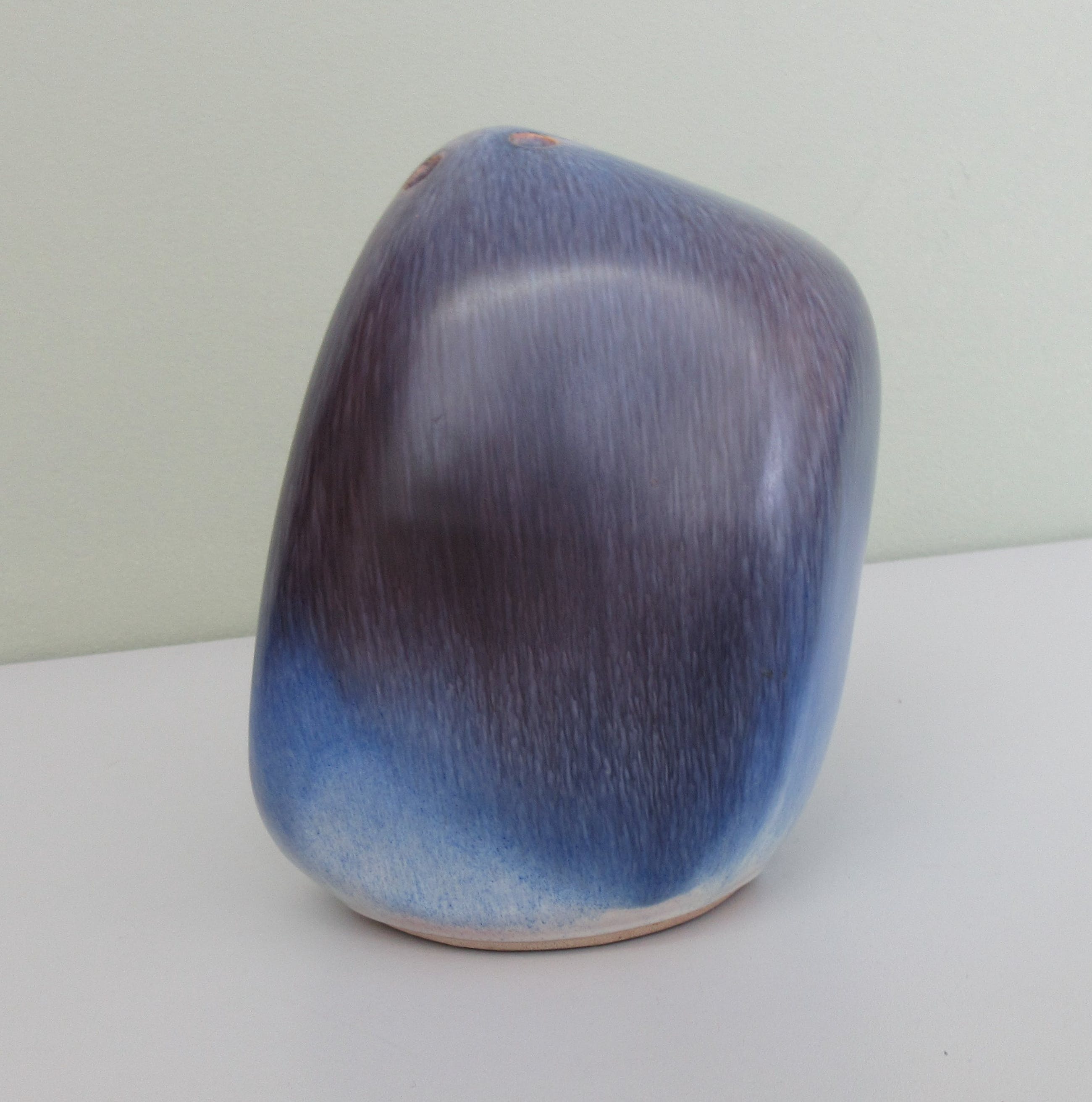 Modernistische aardewerken rozensteker (vaas) in de vorm van een kiezel en voorzien van mooi mat blauw, paars en creme stroomglazuur. Met de hand gesigneerd BLC oid. Kunstenaar of fabriek onbekend.