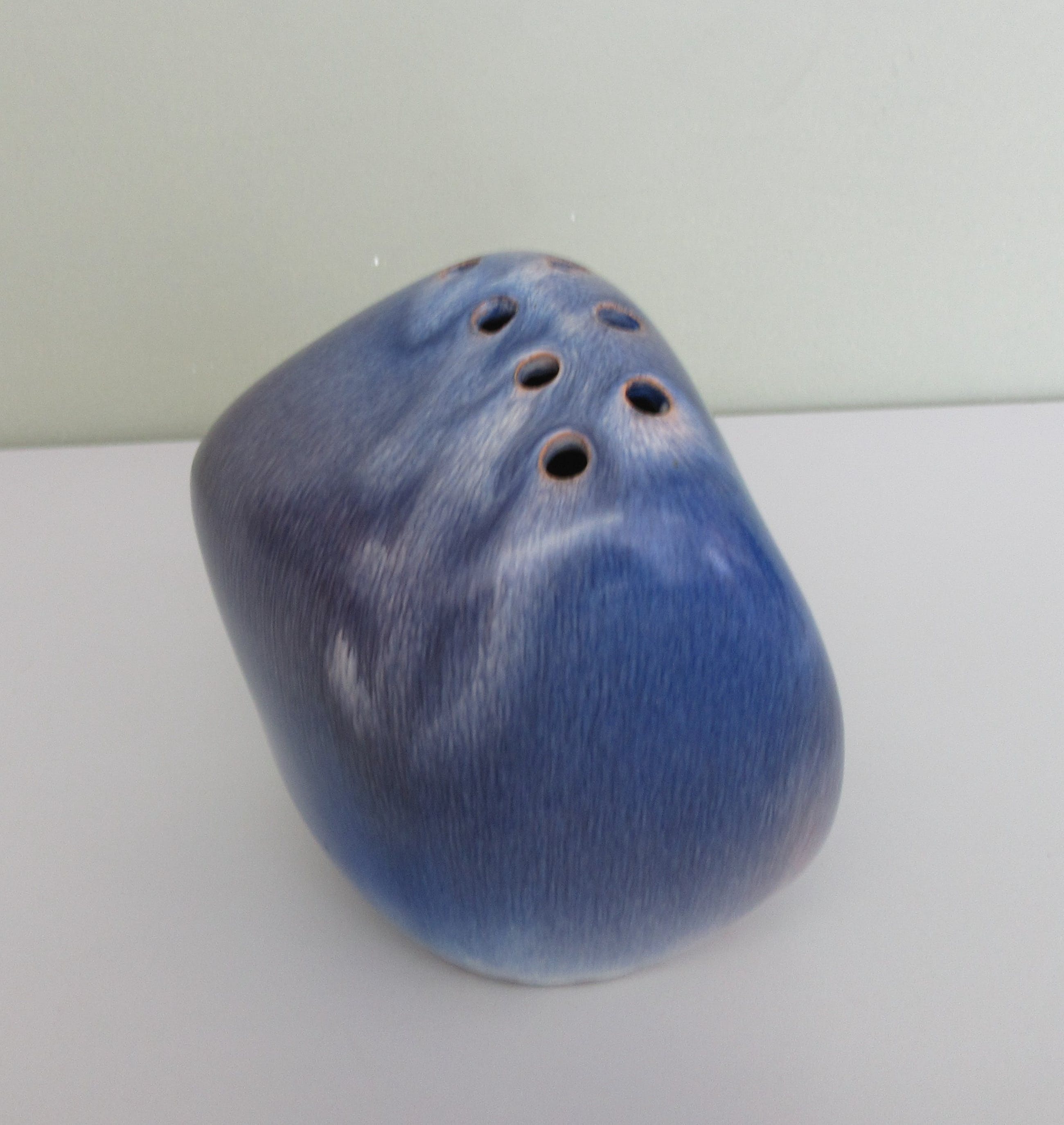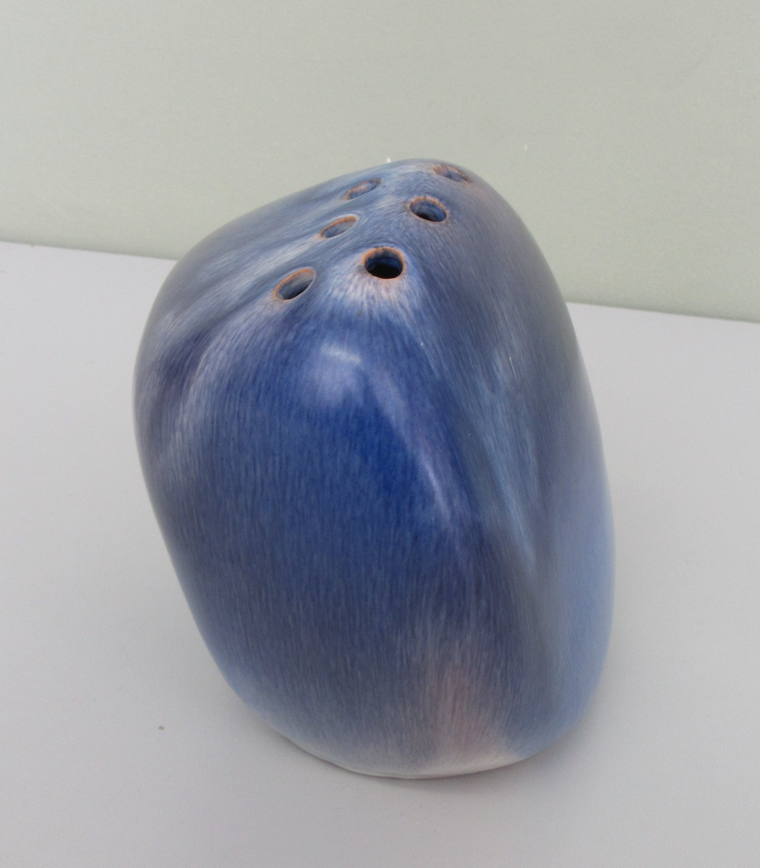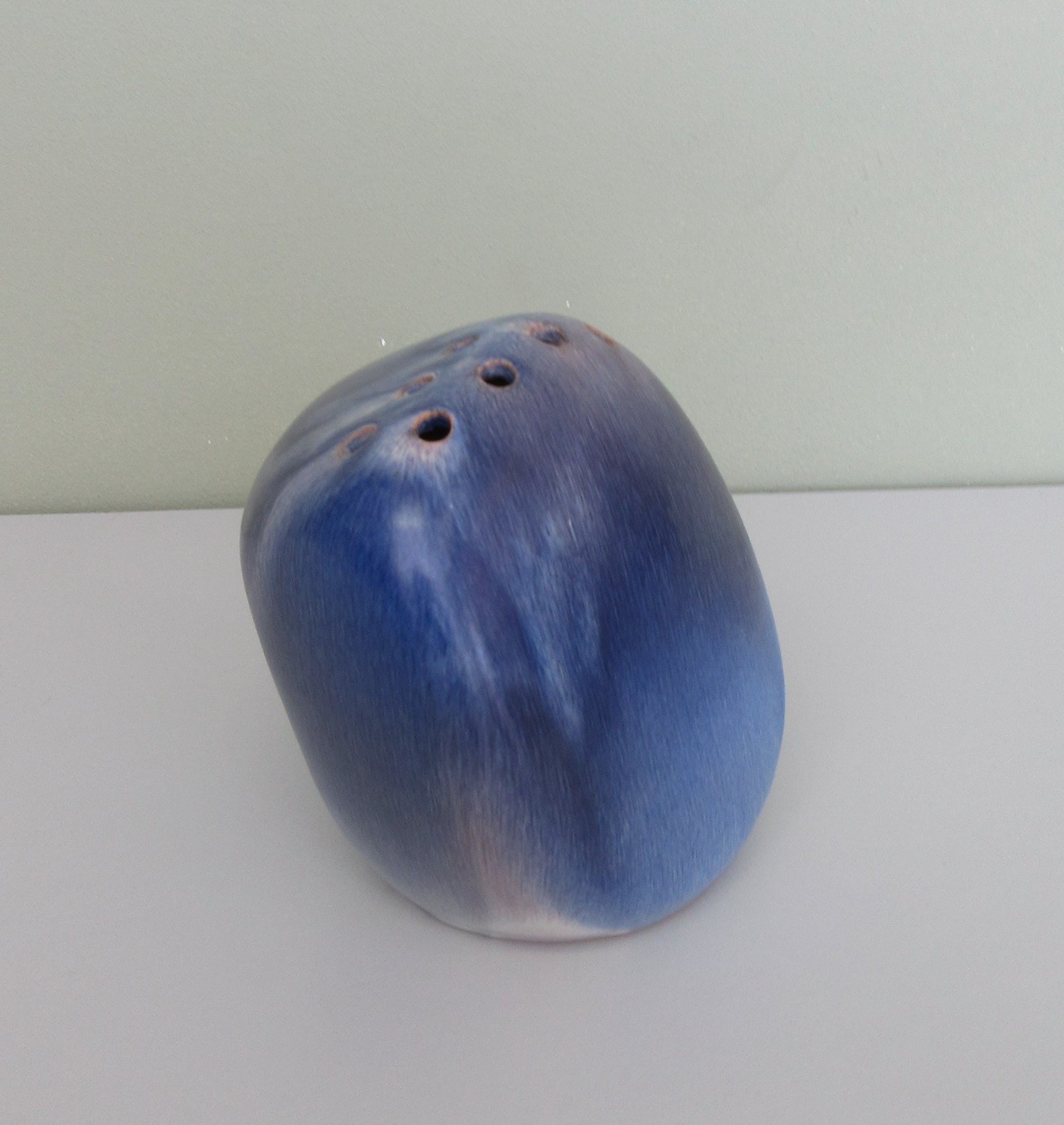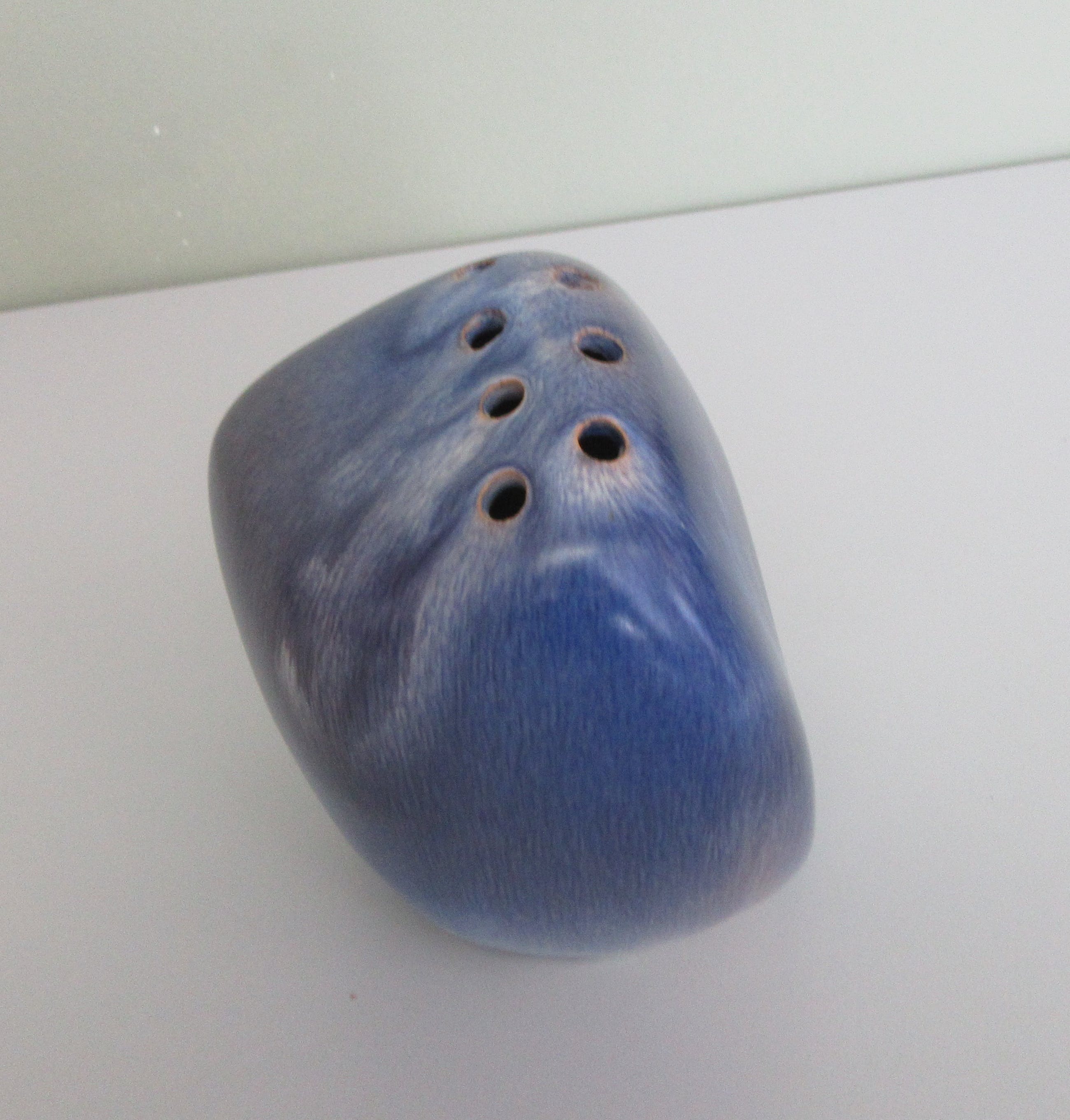 Modernistische aardewerken rozensteker (vaas) in de vorm van een kiezel en voorzien van mooi mat blauw, paars en creme stroomglazuur. Met de hand gesigneerd BLC oid. Kunstenaar of fabriek onbekend.