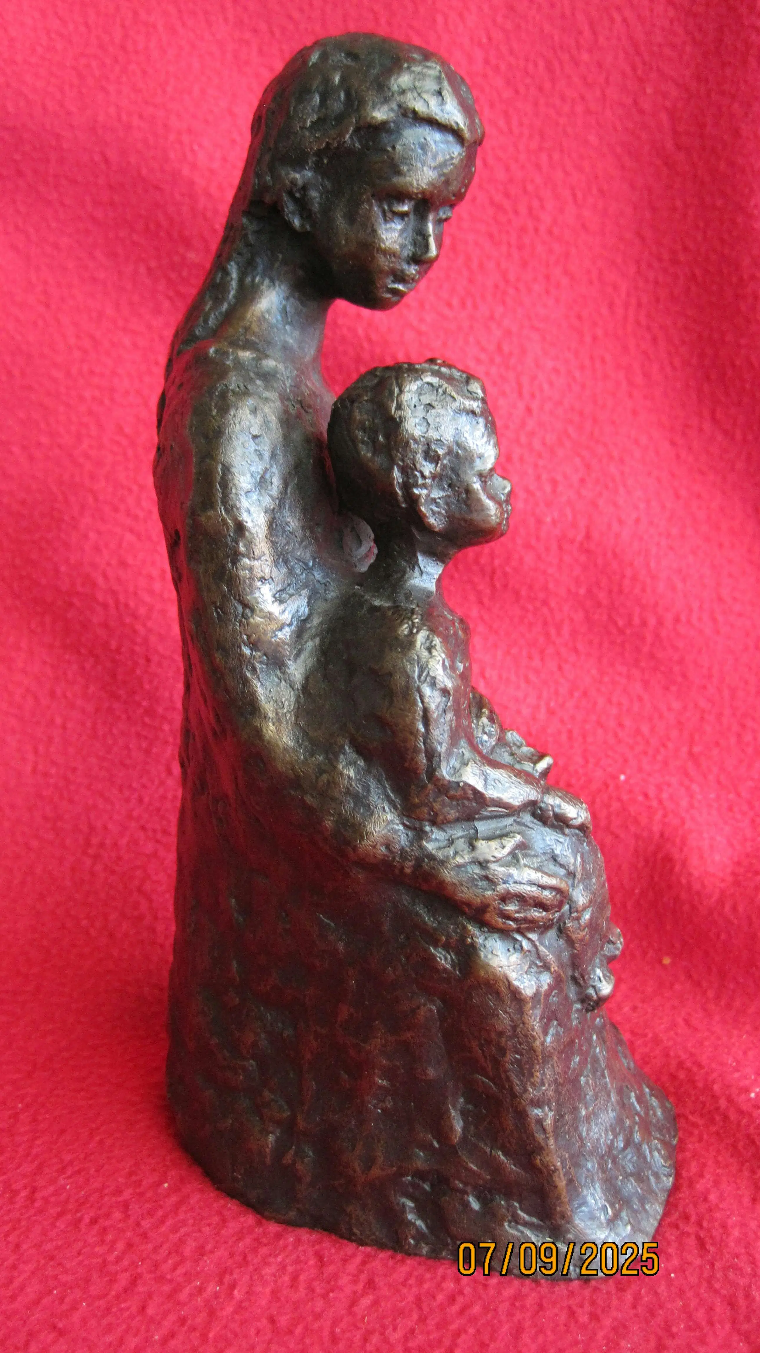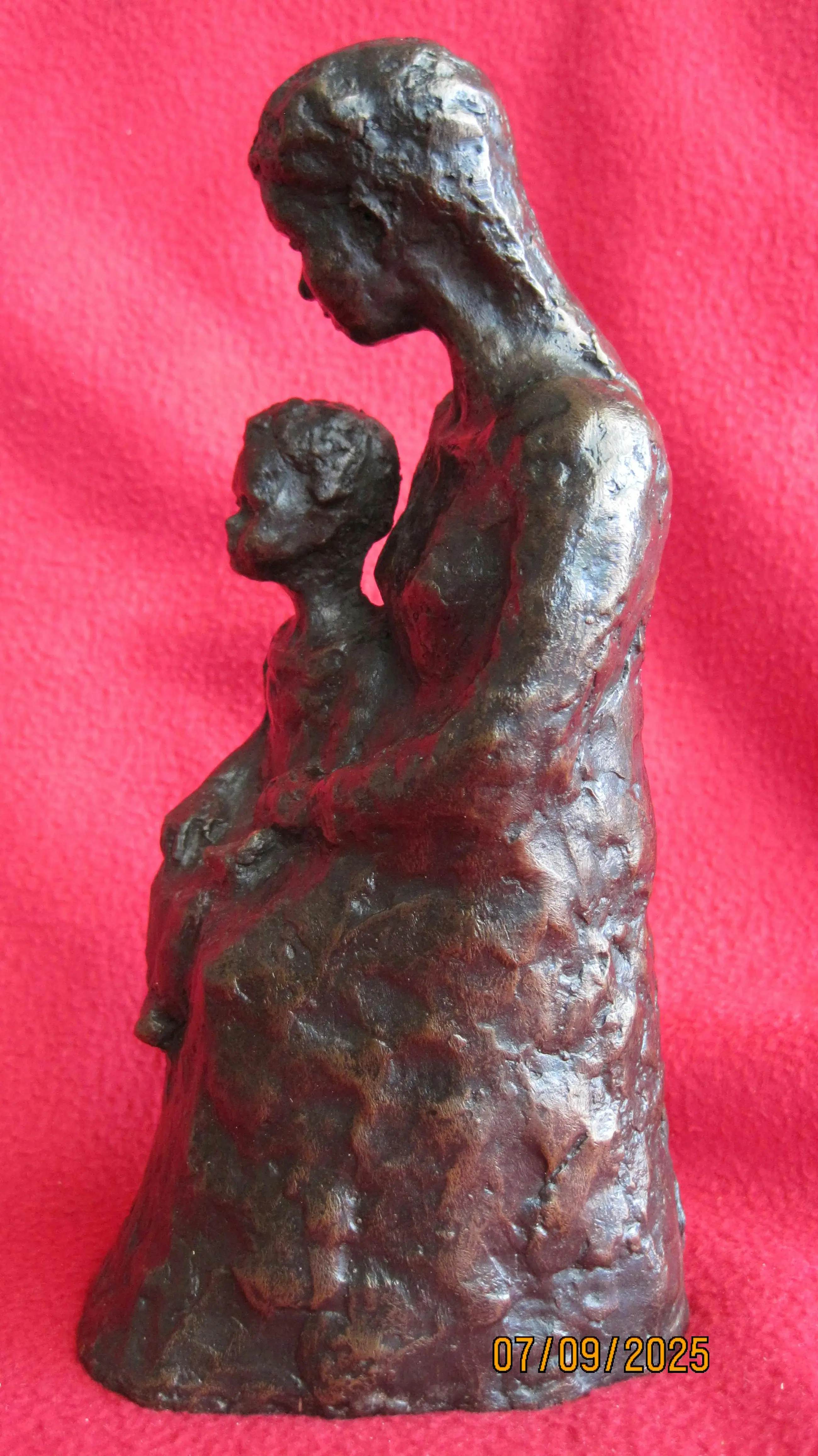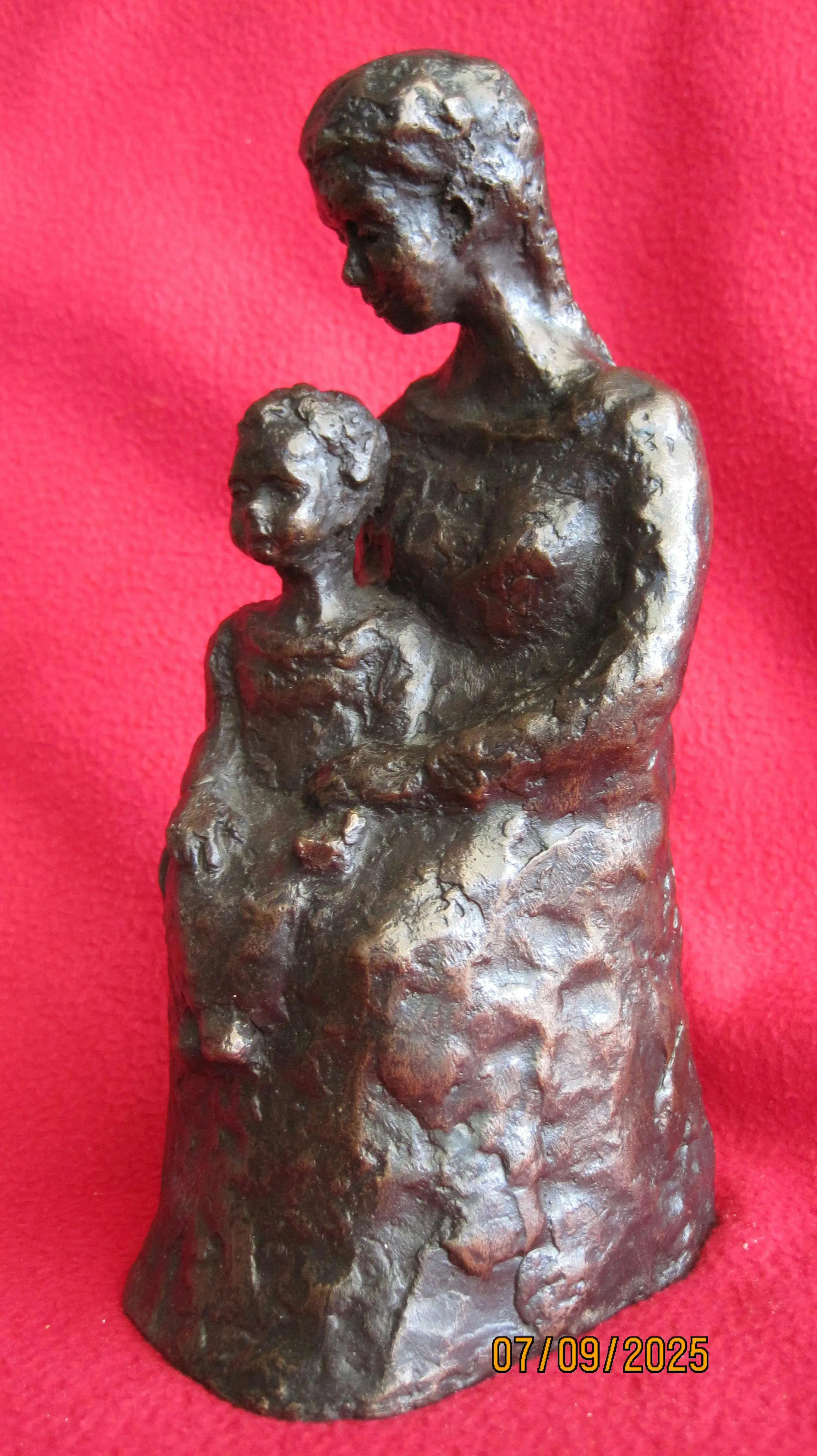 Bronzen beeld van een moeder met haar kind. Dit beeld straalt rust uit. Het is onduidelijk gesigneerd aan de zijkant. Het lijkt op een Z met een L. Helaas is de kunstenaar mij onbekend.