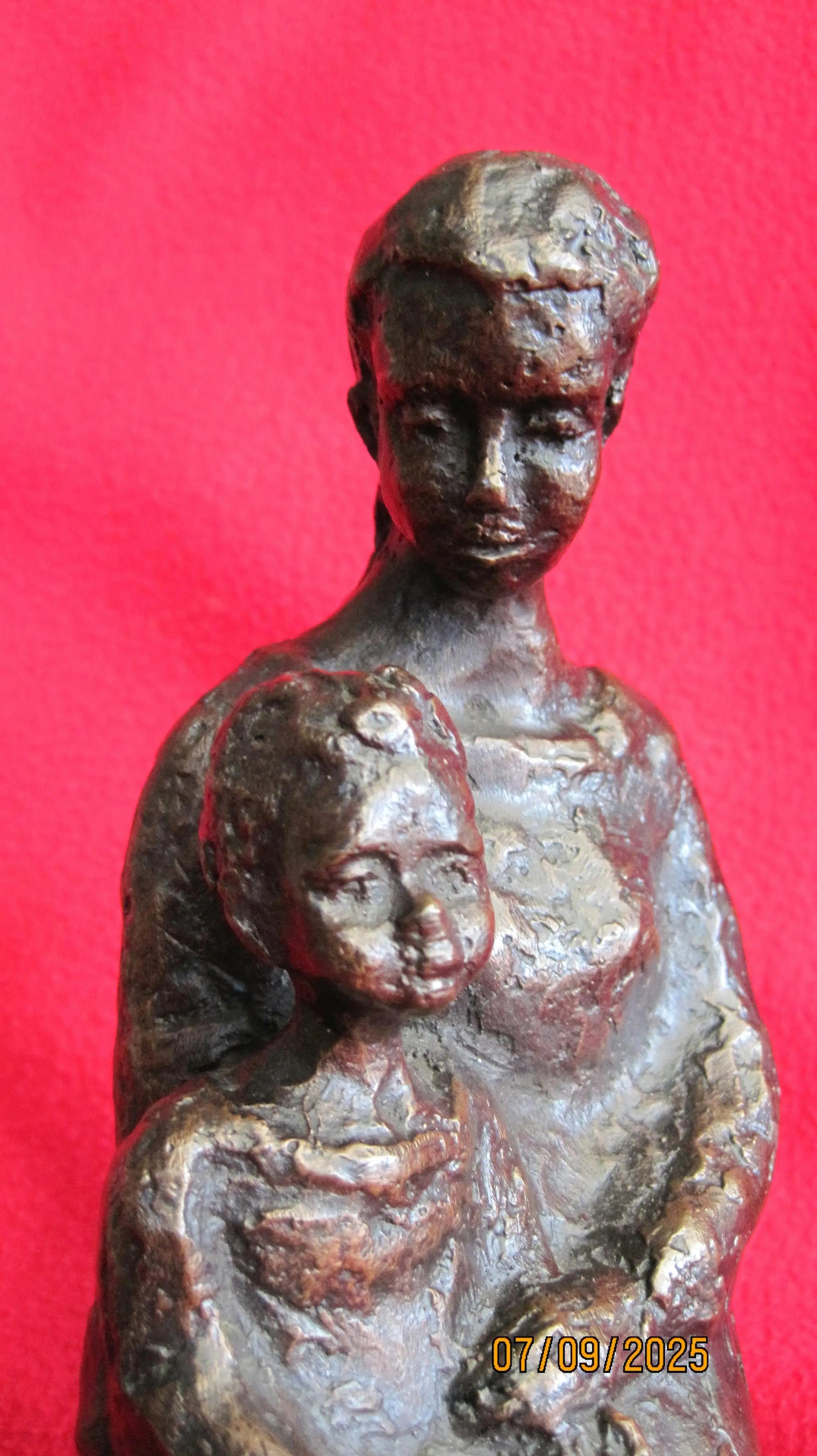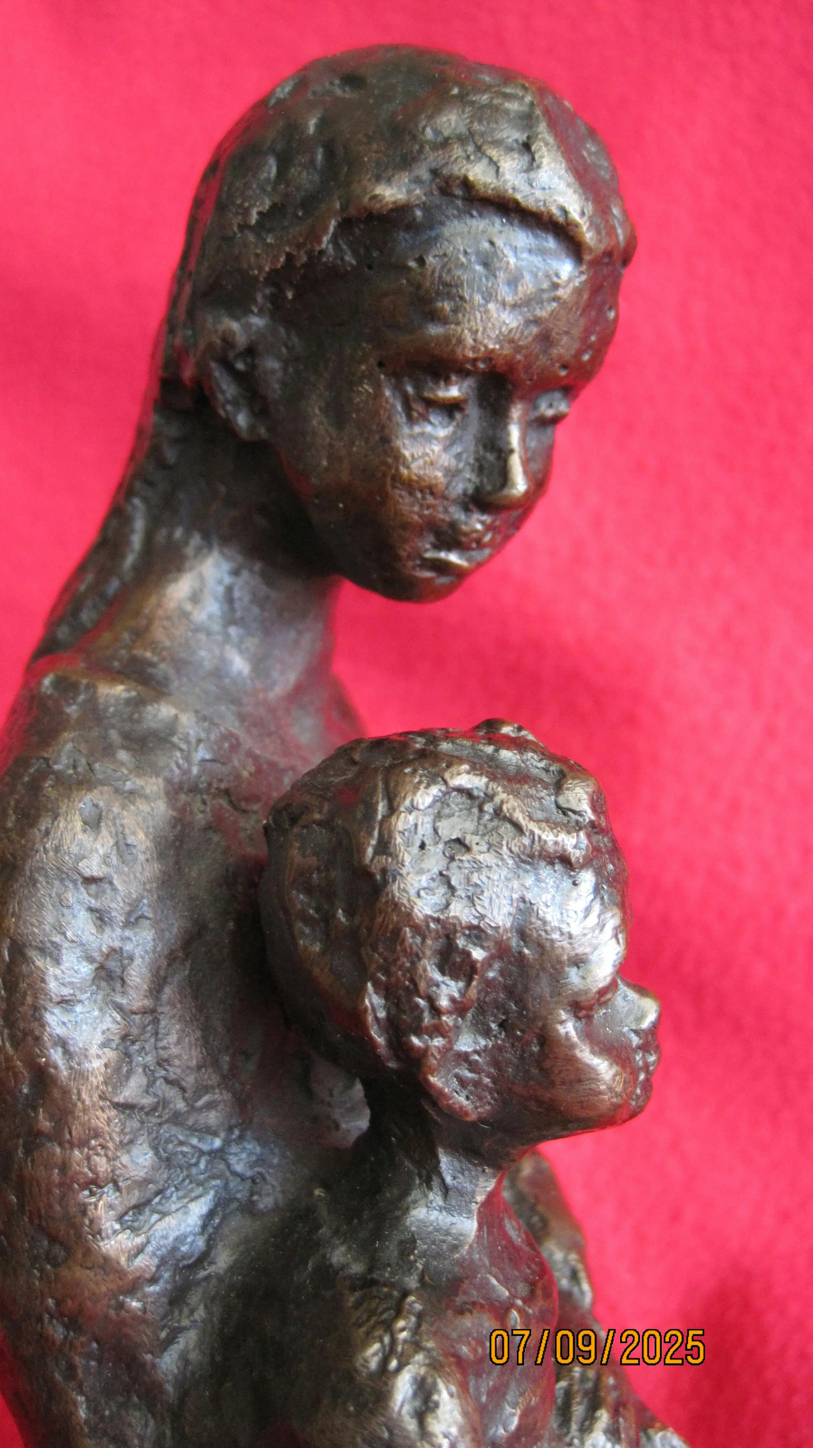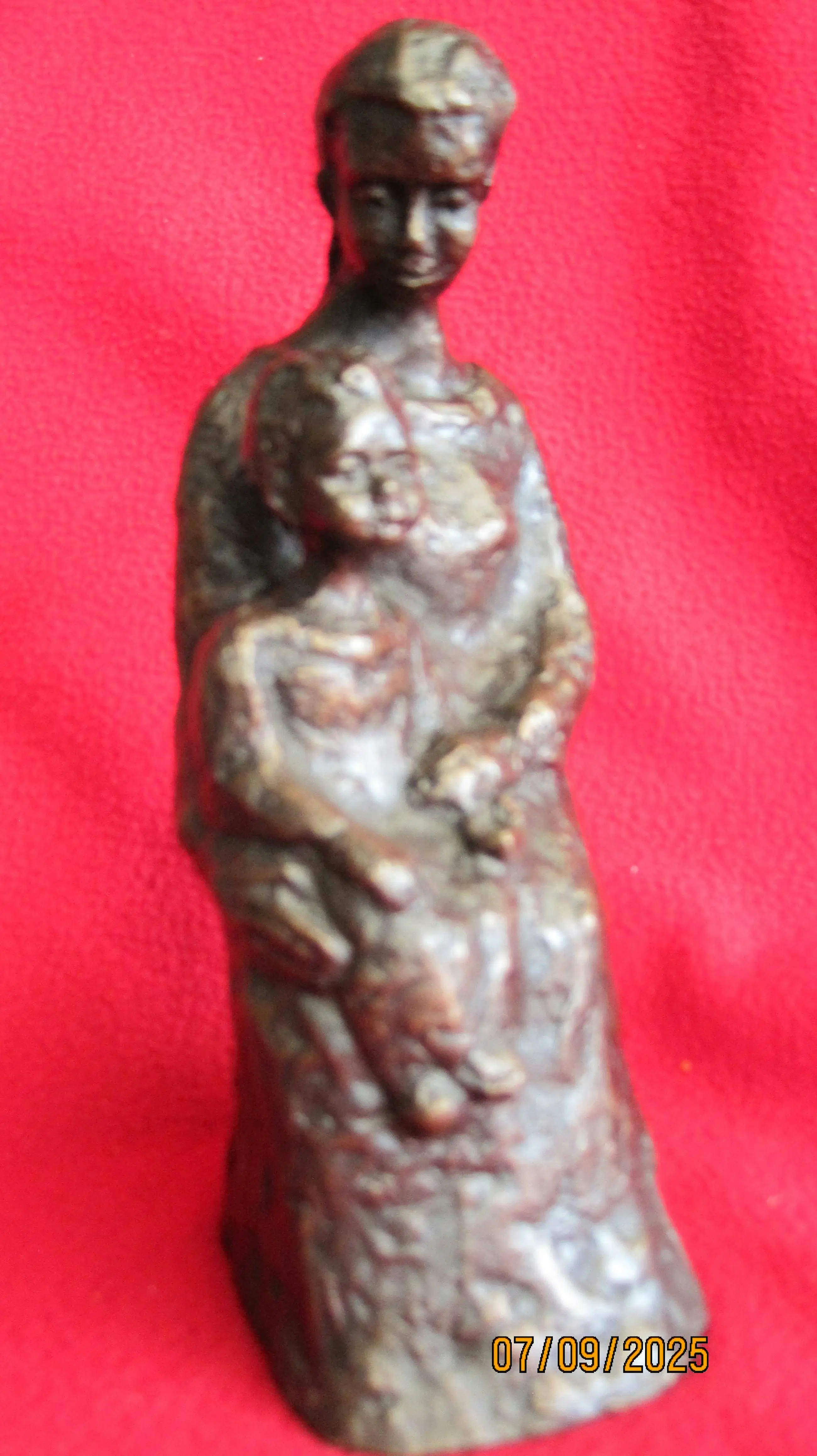 Bronzen beeld van een moeder met haar kind. Dit beeld straalt rust uit. Het is onduidelijk gesigneerd aan de zijkant. Het lijkt op een Z met een L. Helaas is de kunstenaar mij onbekend.