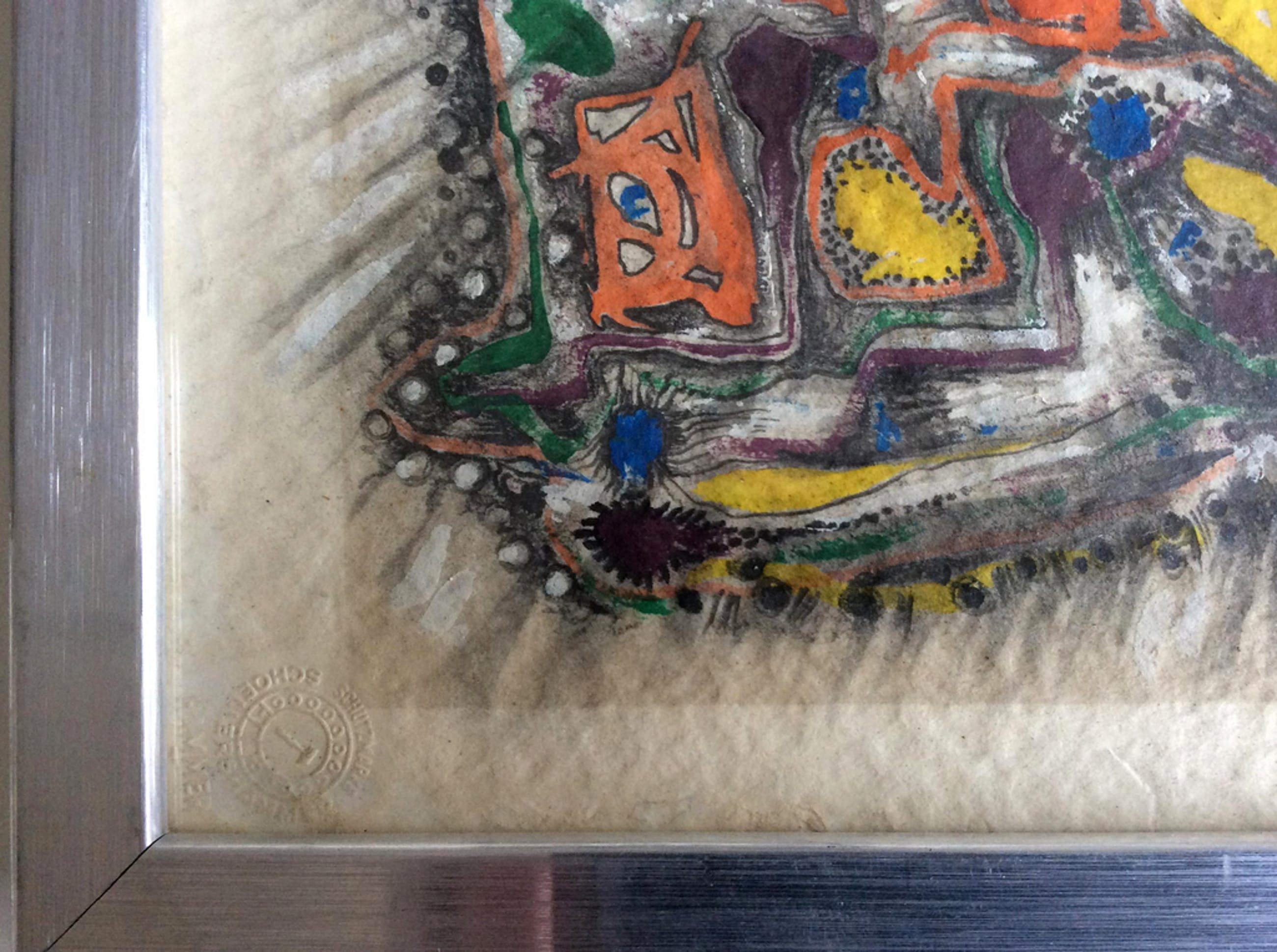 Van onbekende kunstenaar: abstract, gemengde techniek op Schoellershammer papier. Gesigneerd r.o. gedateerd 1975. In stevige houten lijst, formaat incl. 53 x 53 cm, grootte schilderij 44 x 44 cm.