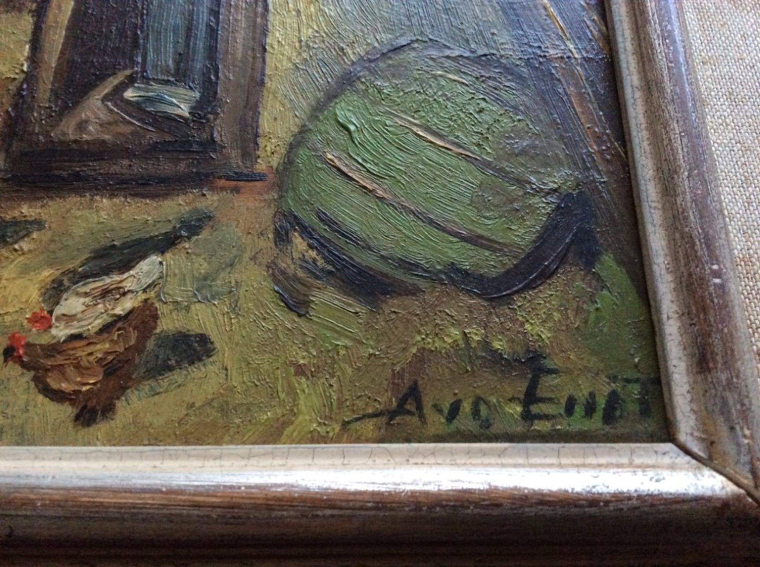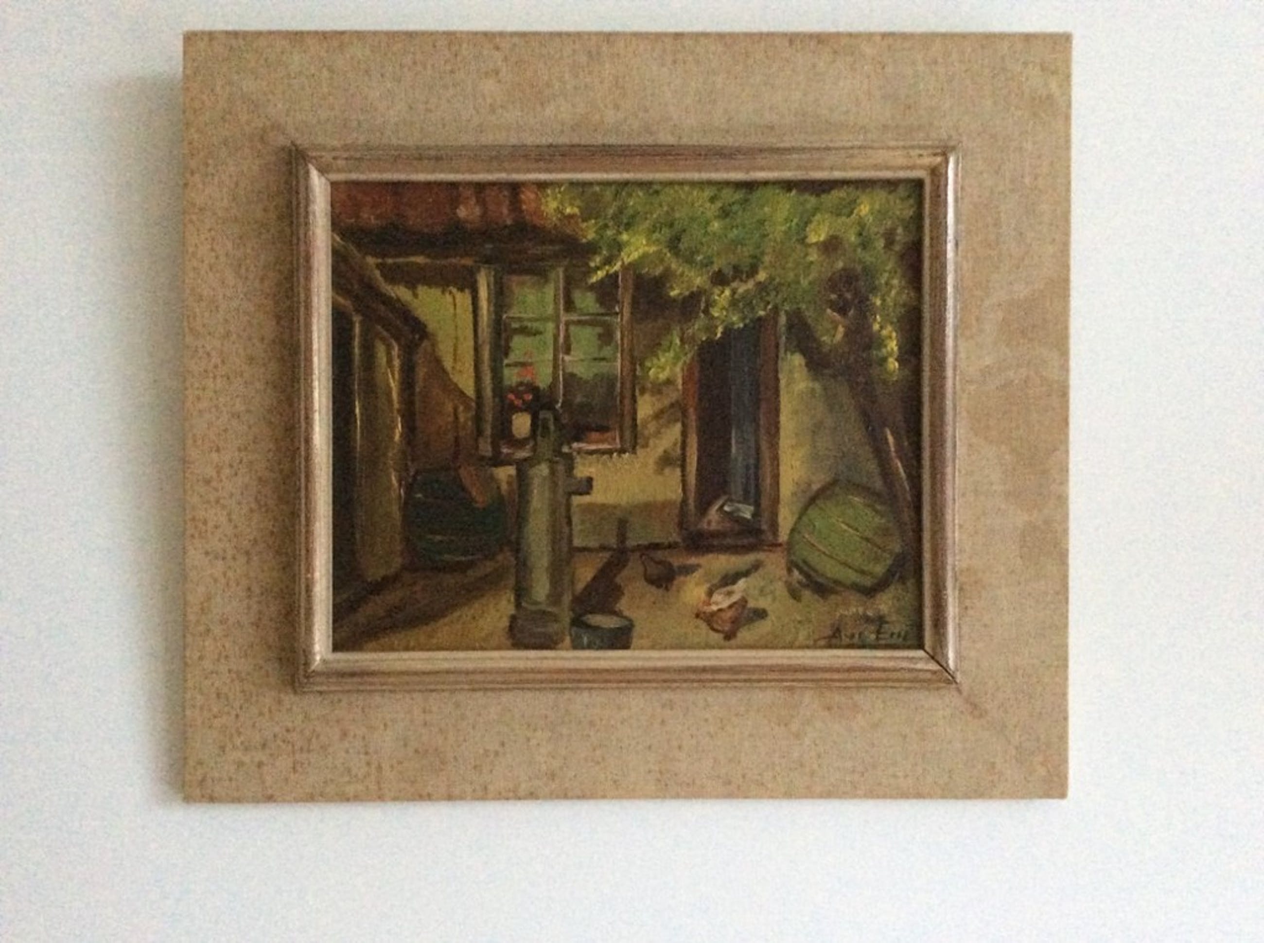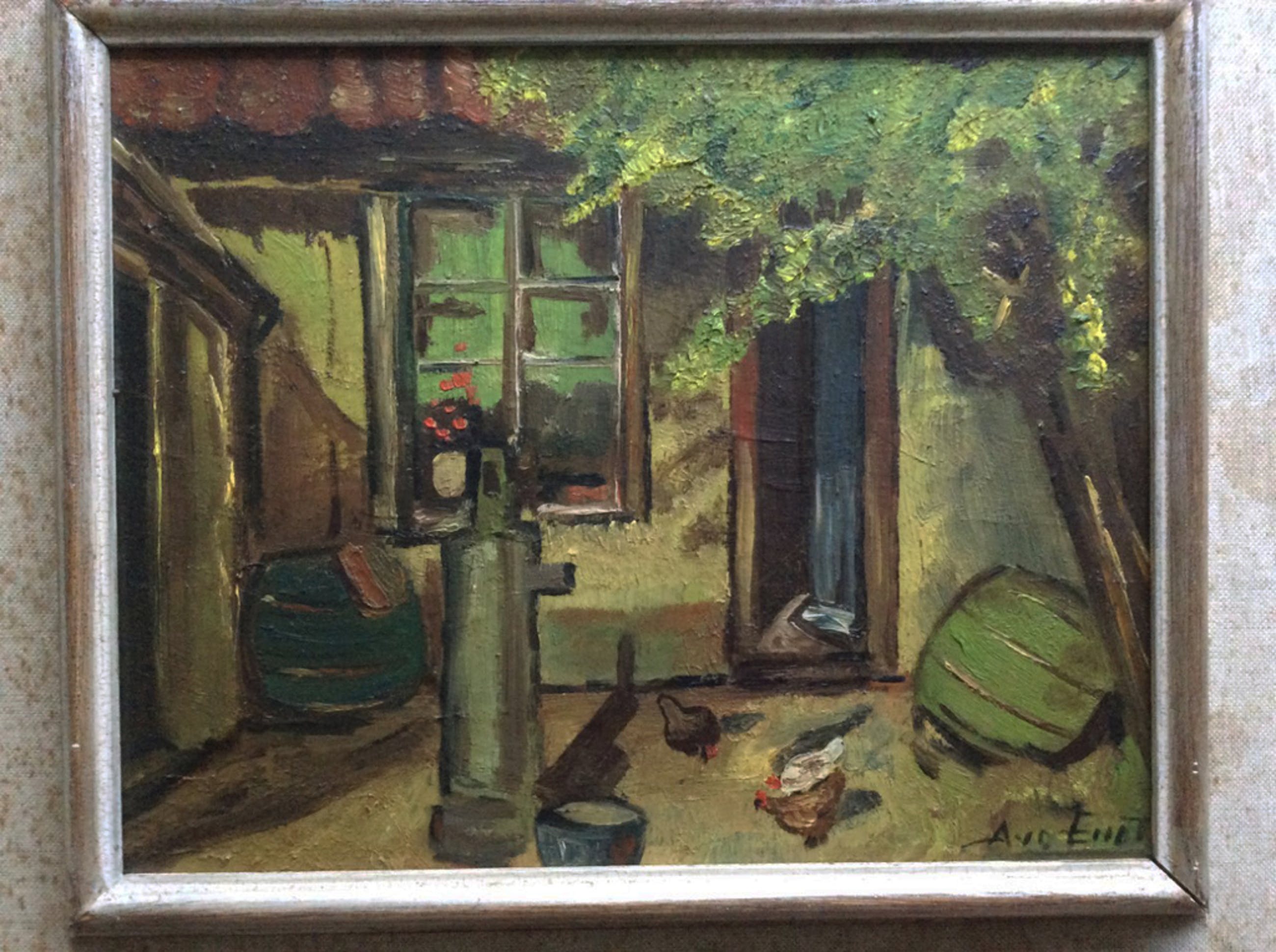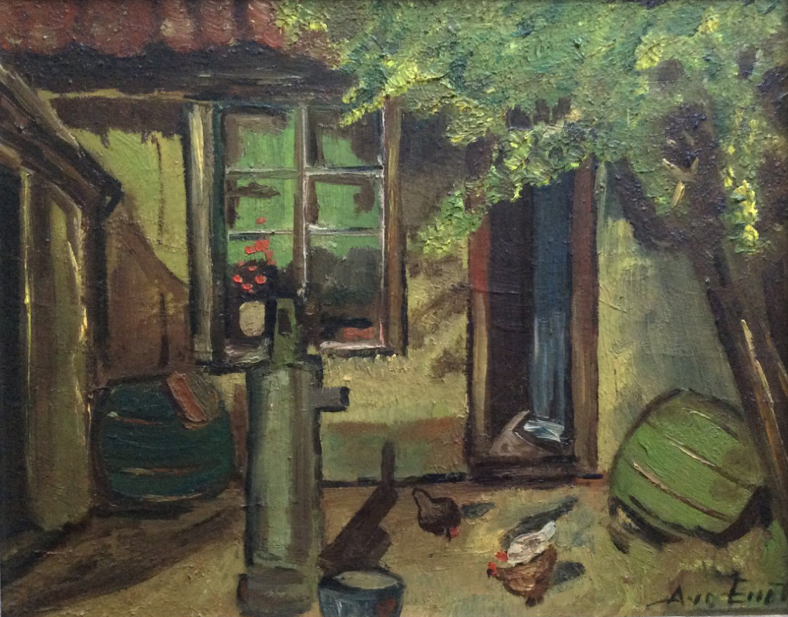 Van onbekende kunstenaar: olieverf op houten paneel, ca. 1940 of eerder. Voorstelling van 'binnenplaats' anno eerste helft 20e eeuw. Gesigneerd met A.v.d.Endt r.o. Formaat 26 x 21 cm. Incl. oorspronkelijke lijst 39 x 33,5 cm.