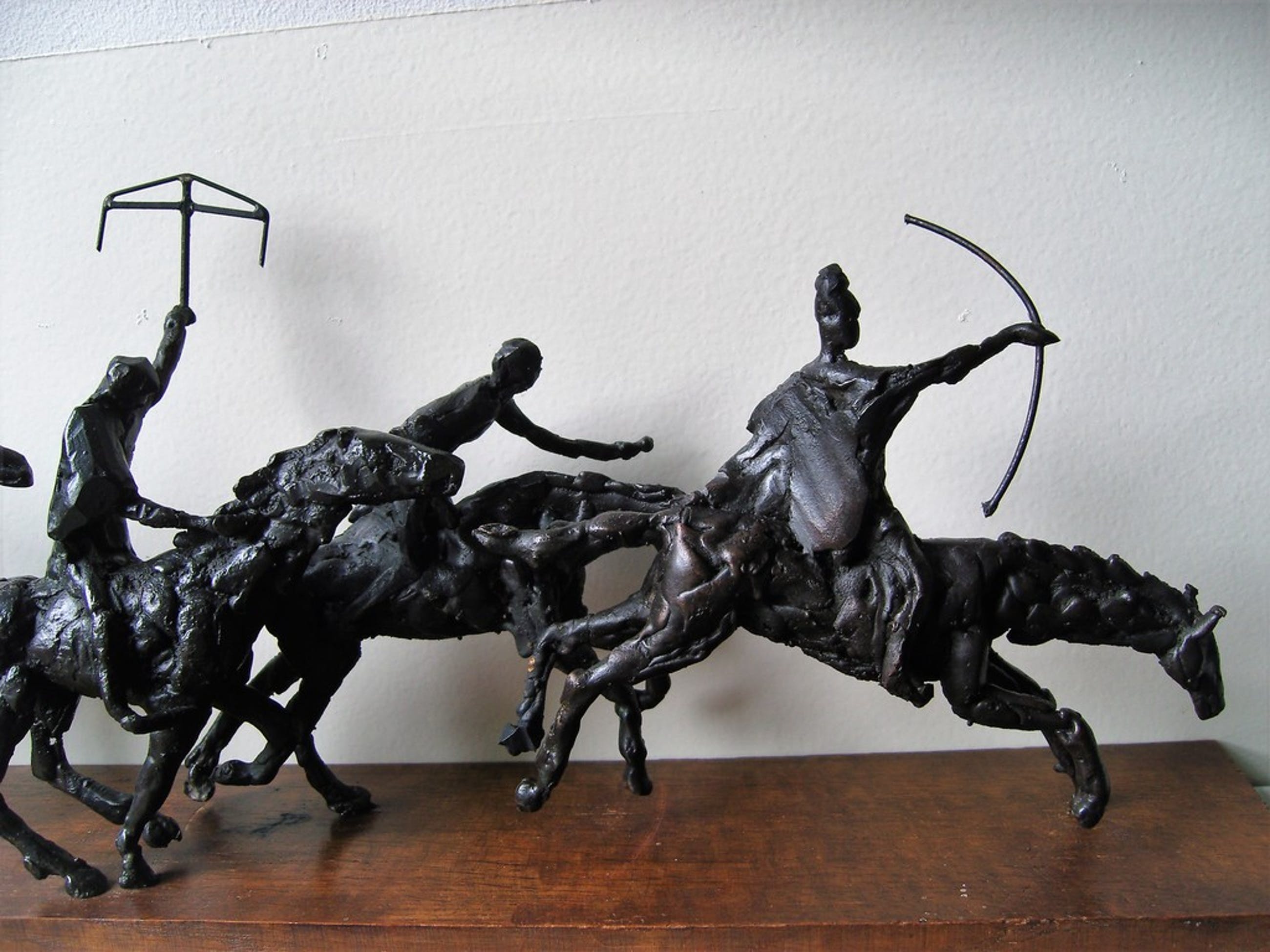 Zeer bijzonder bronzen beeld van de vier ruiters van de Apocalyps op eenvoudige houten basis.
