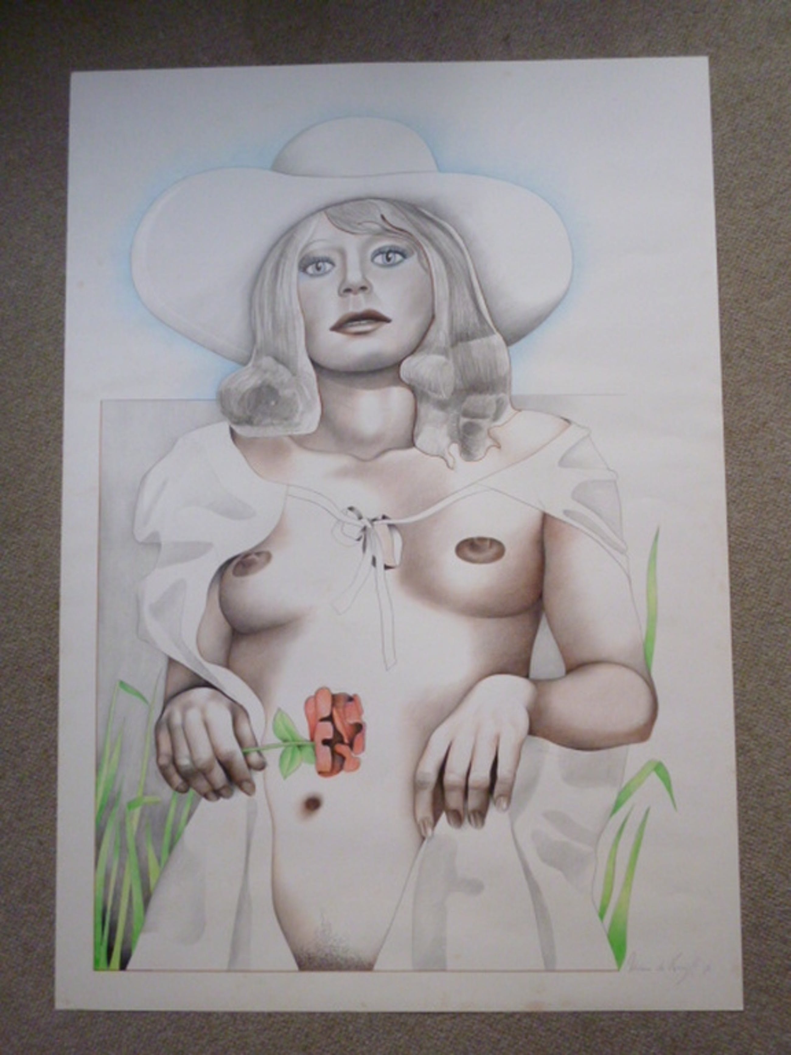 Gekleurde potloodtekening voorstellende een vrouwelijk naakt met hoed enb bloem.