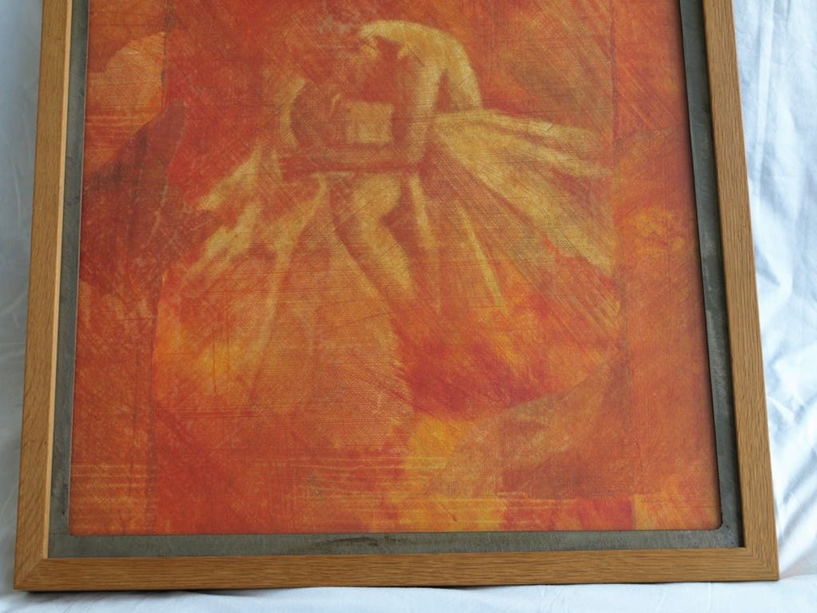 -Ingelijst op een bijzondere wijze: Een houten lijst met een metalen (lood?) passe-partout en een glasplaat.