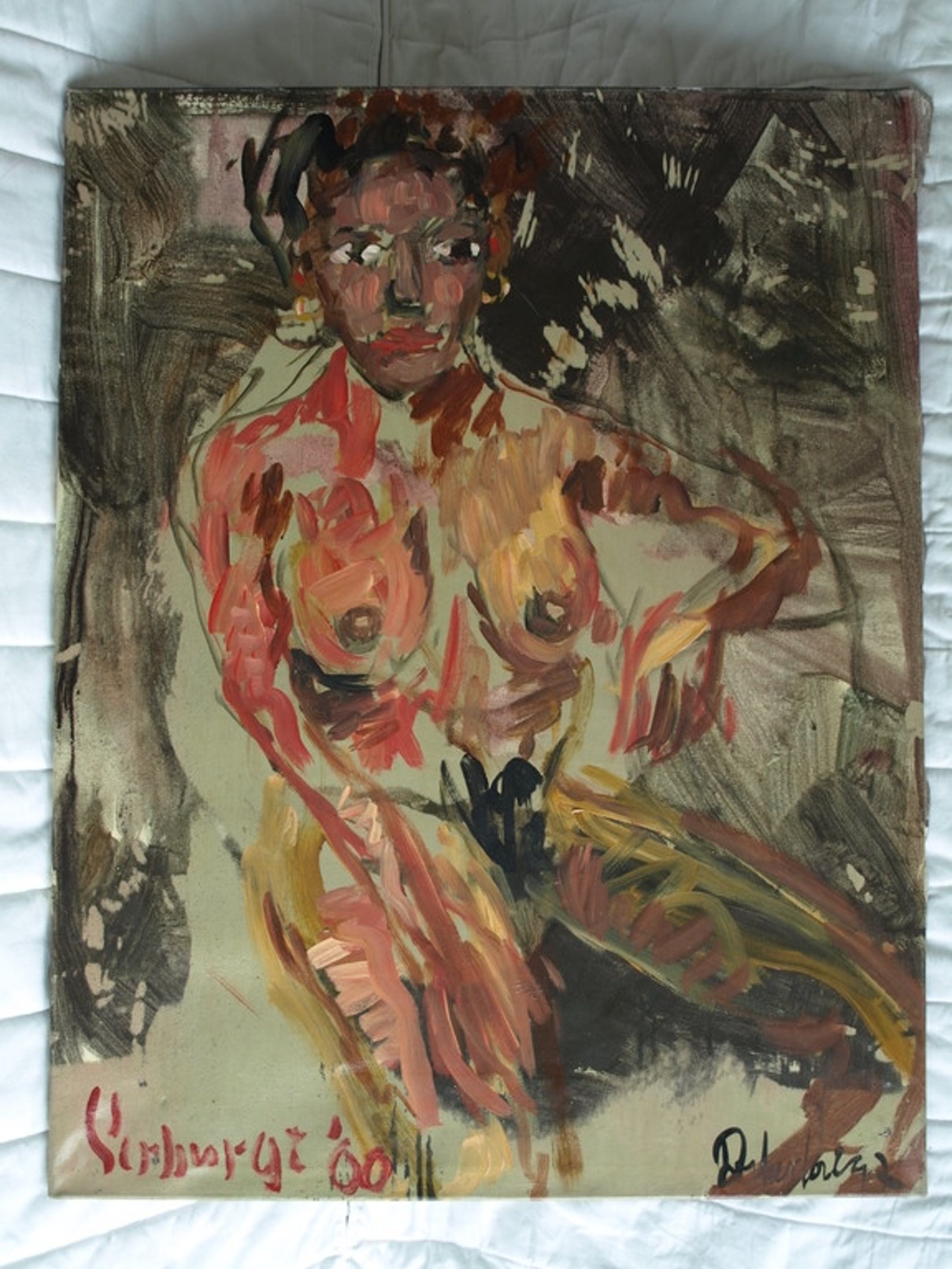 Een schilderij uit het jaar 2000 met een voorstelling van een naakte vrouw.
