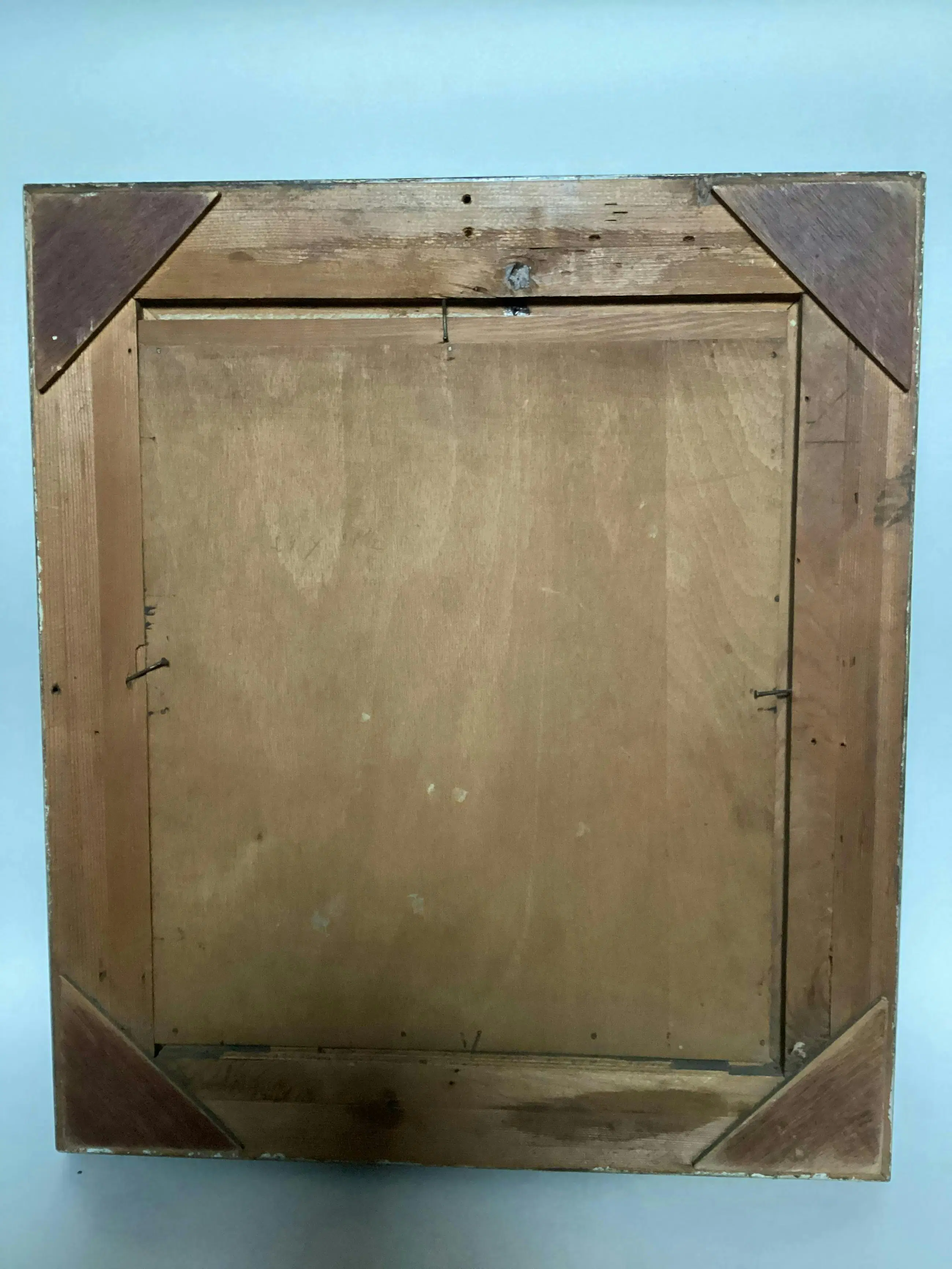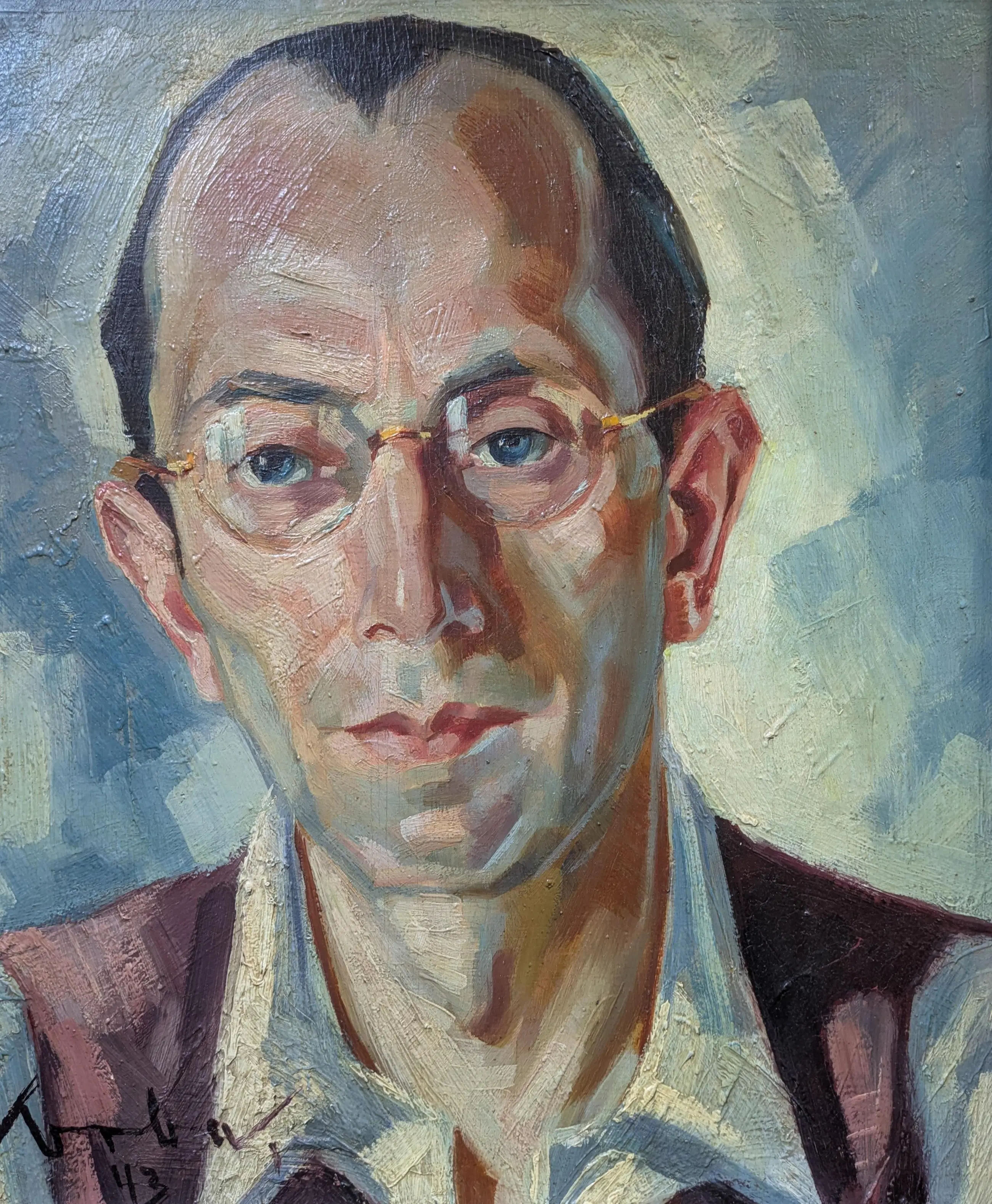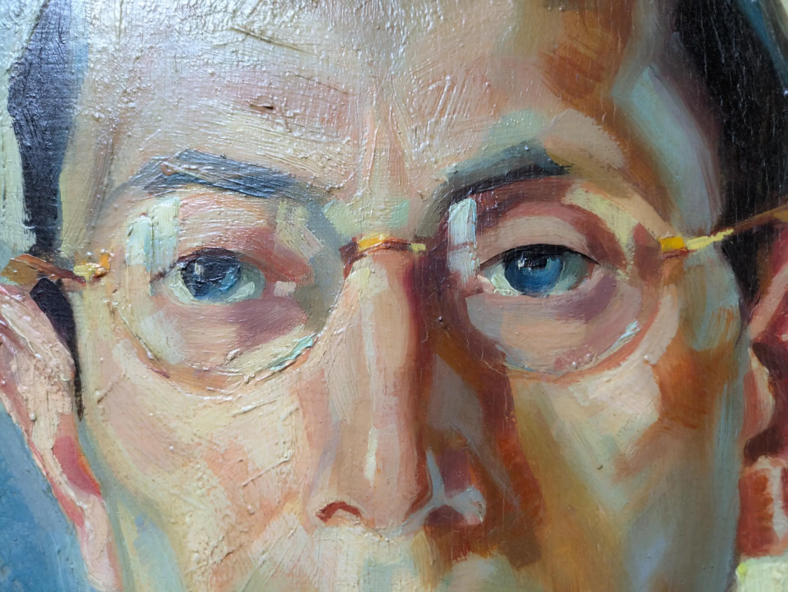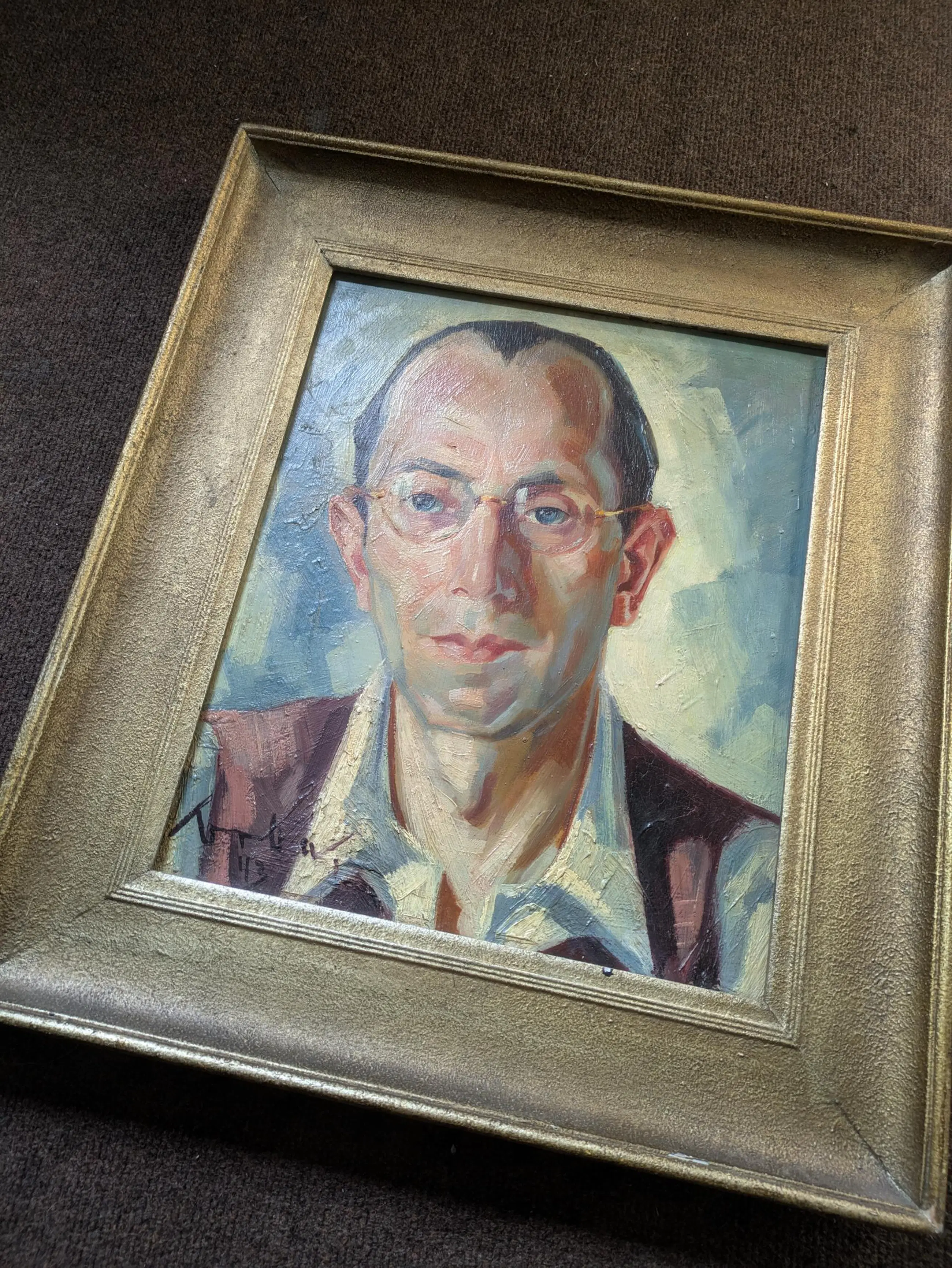 In mooie spontane toetsen geschilderd olieverf schilderij op eikenhouten paneel, technisch fraai uitgevoerd portret van man met bril. Links onderin gesigneerd en gedateerd '43. Onbekende kunstenaar. Formaat paneel 39 x 32 cm, incl sfeervolle originele houten lijst 56 x 49 cm.