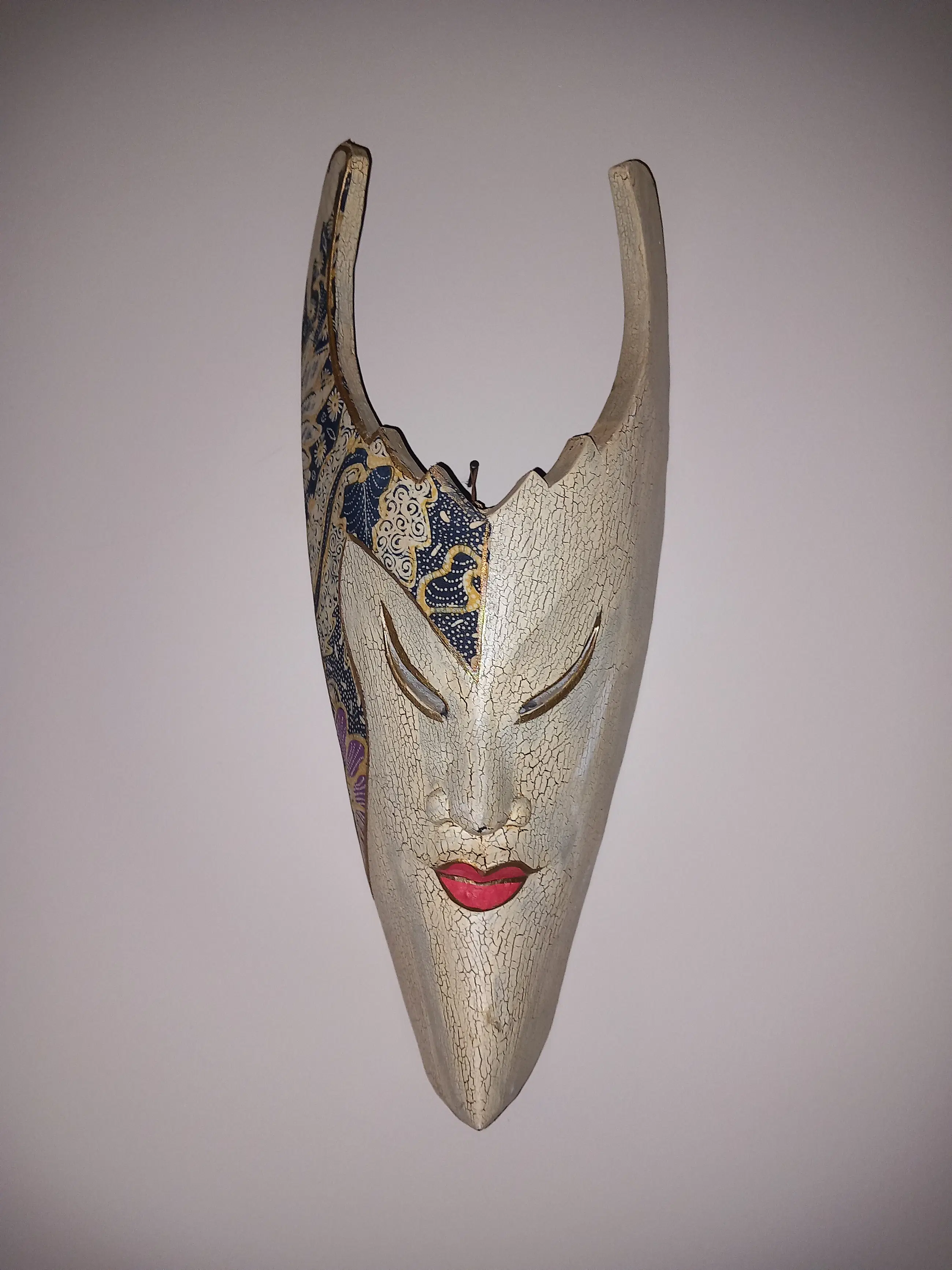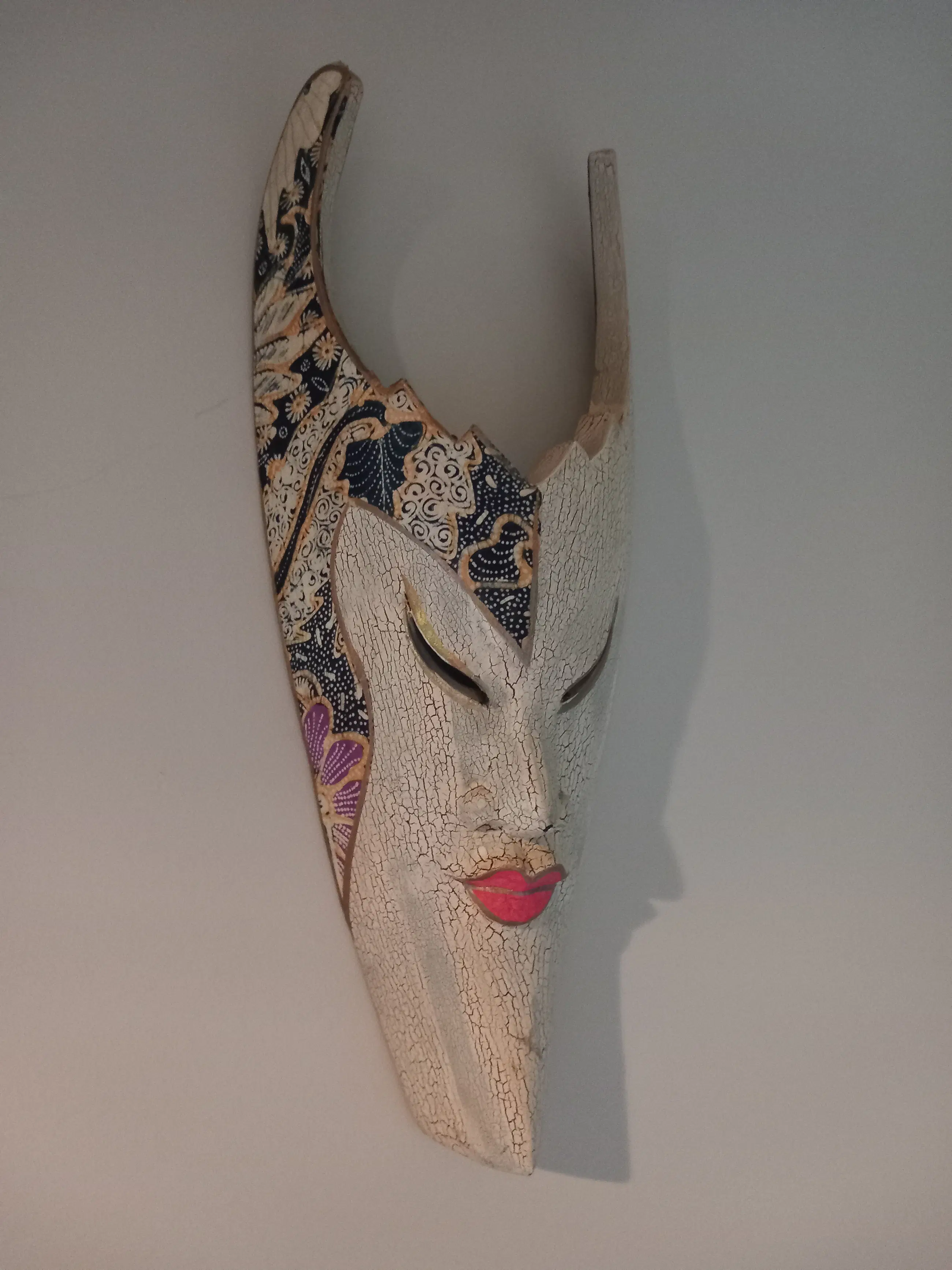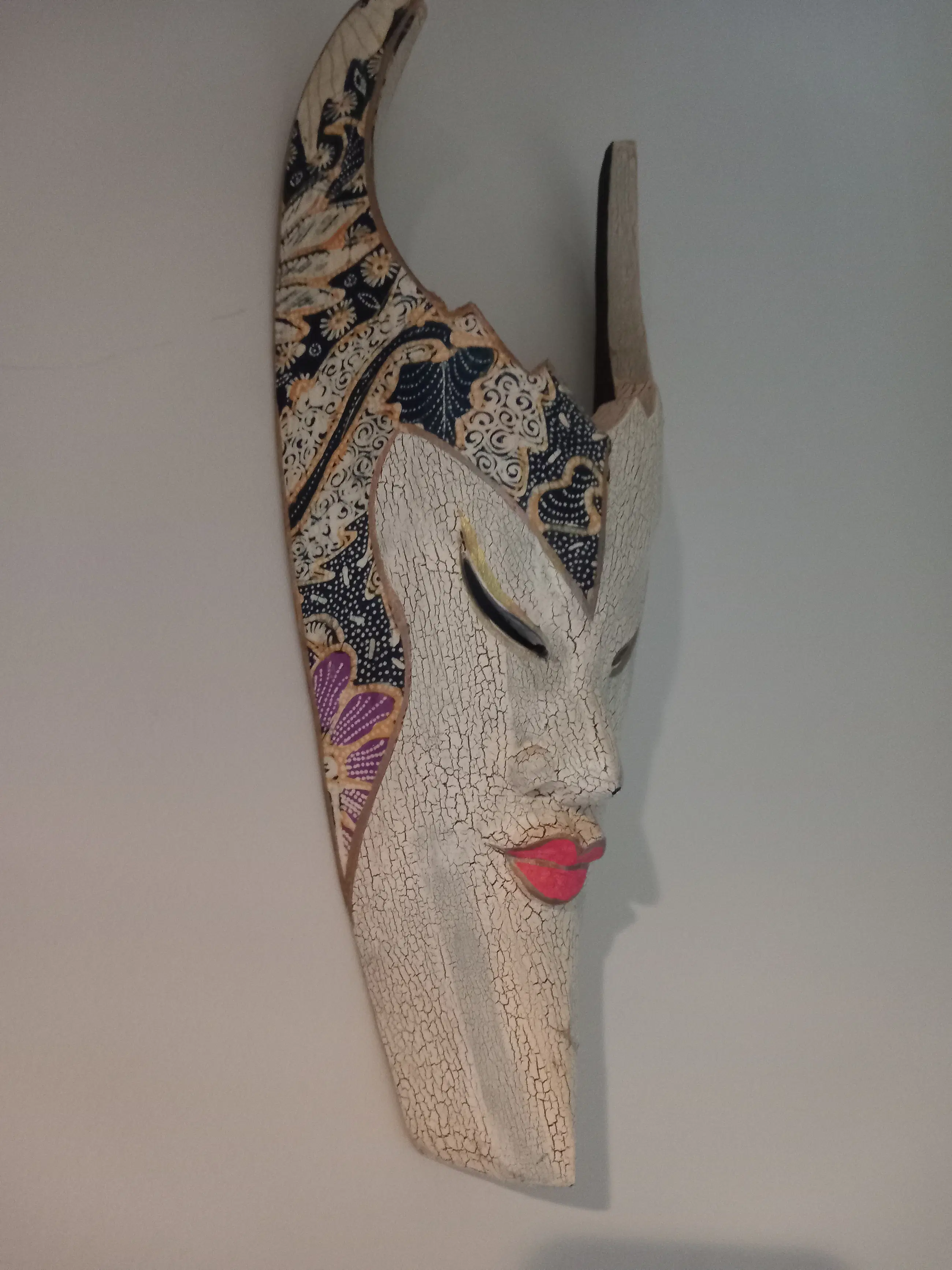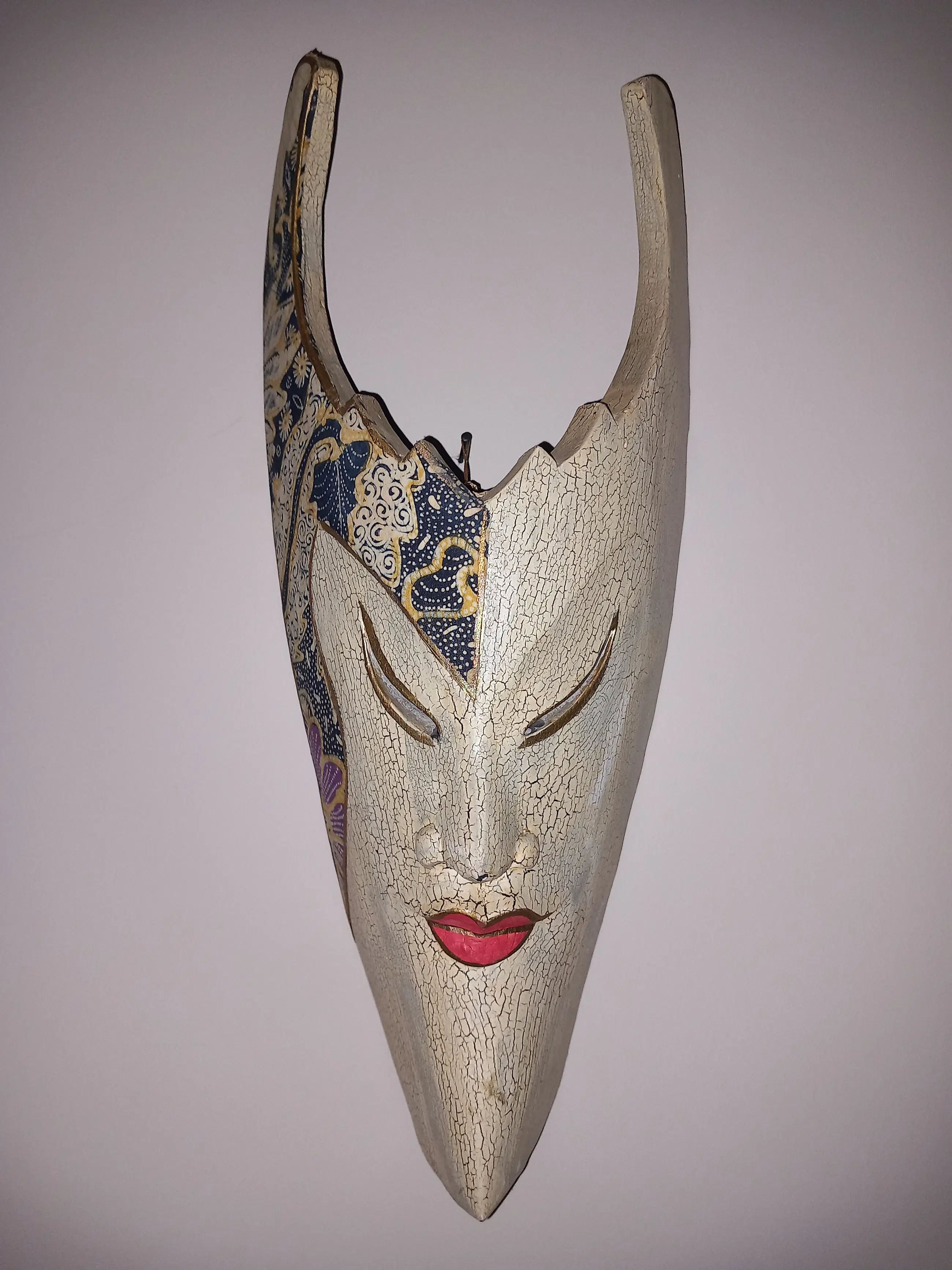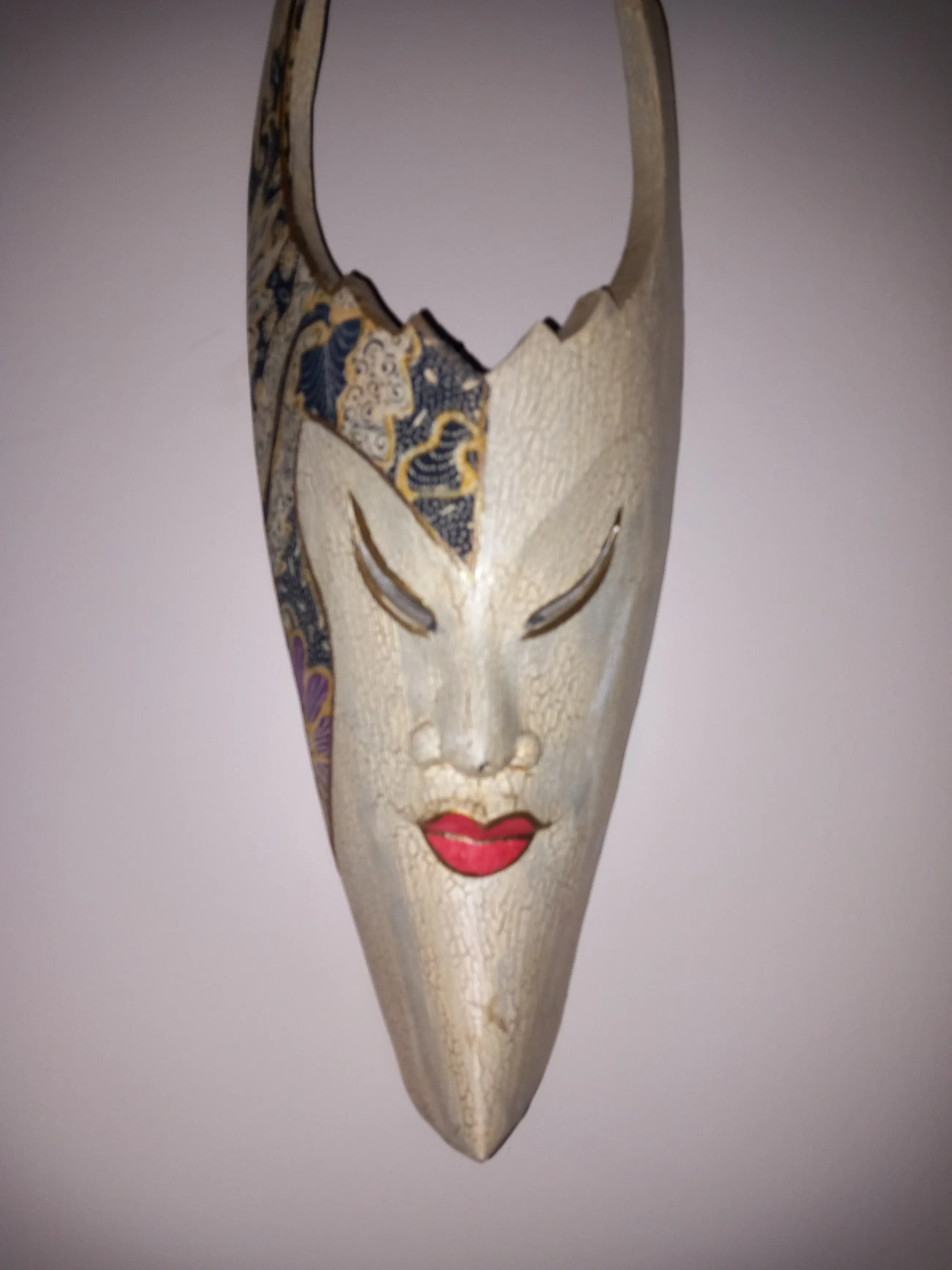 Prachtig etnisch stammenmasker uit Indonesië gesneden in vlamhout met mooie beschilderingen. In goede staat met minimale gebruikerssporen, niet storend in zijn geheel. Zie foto's, deze maken onderdeel uit van de presentatie