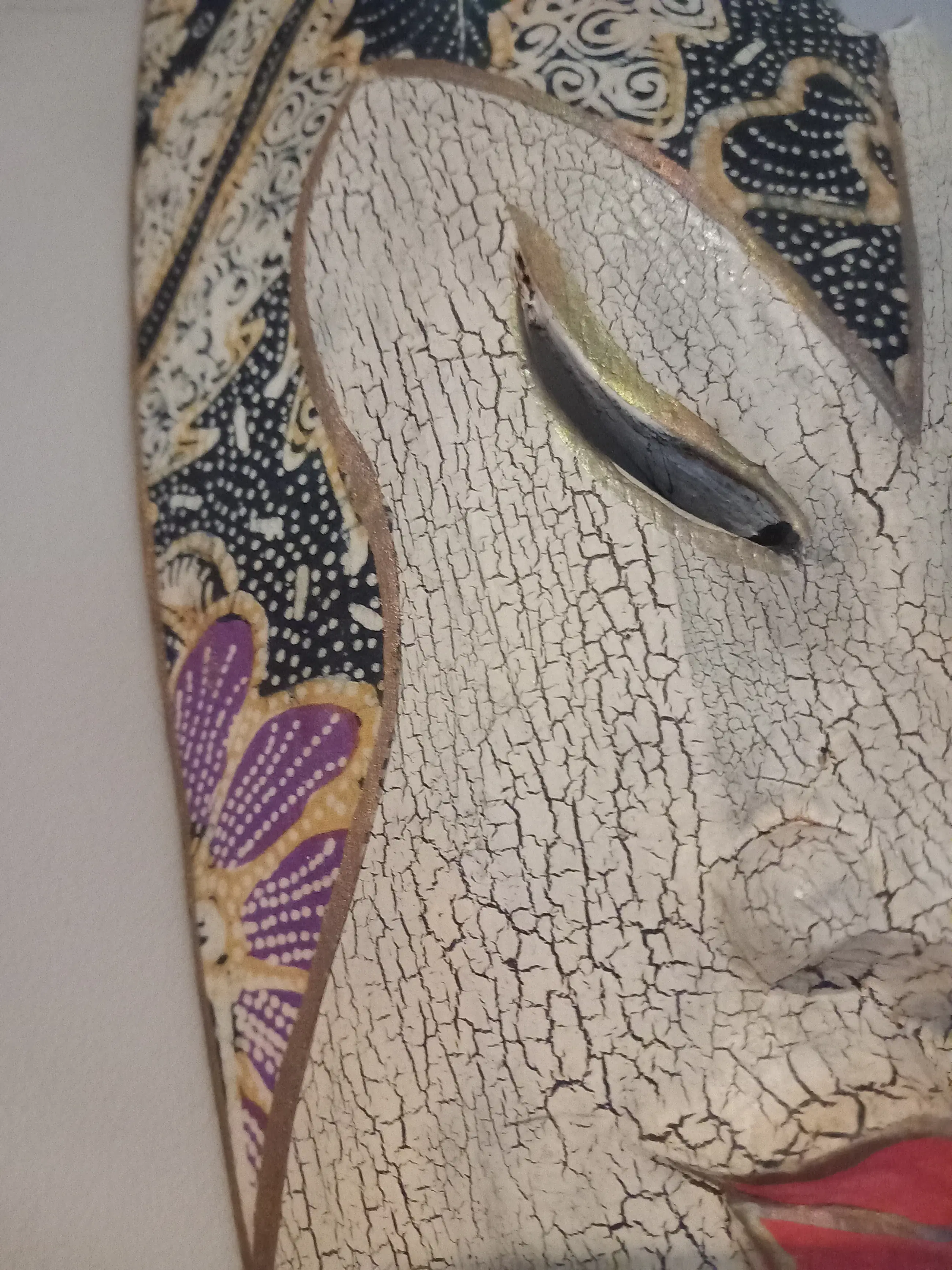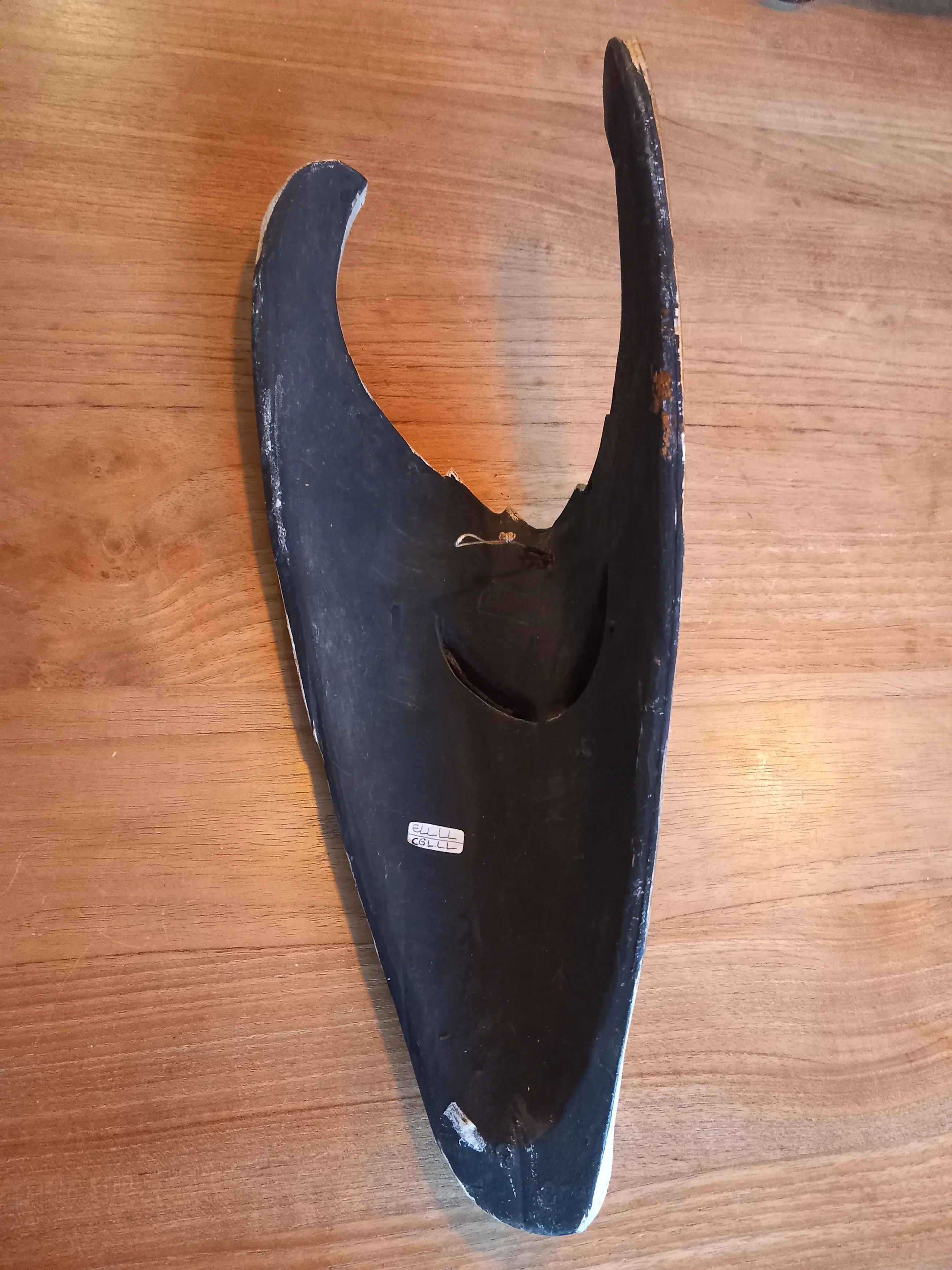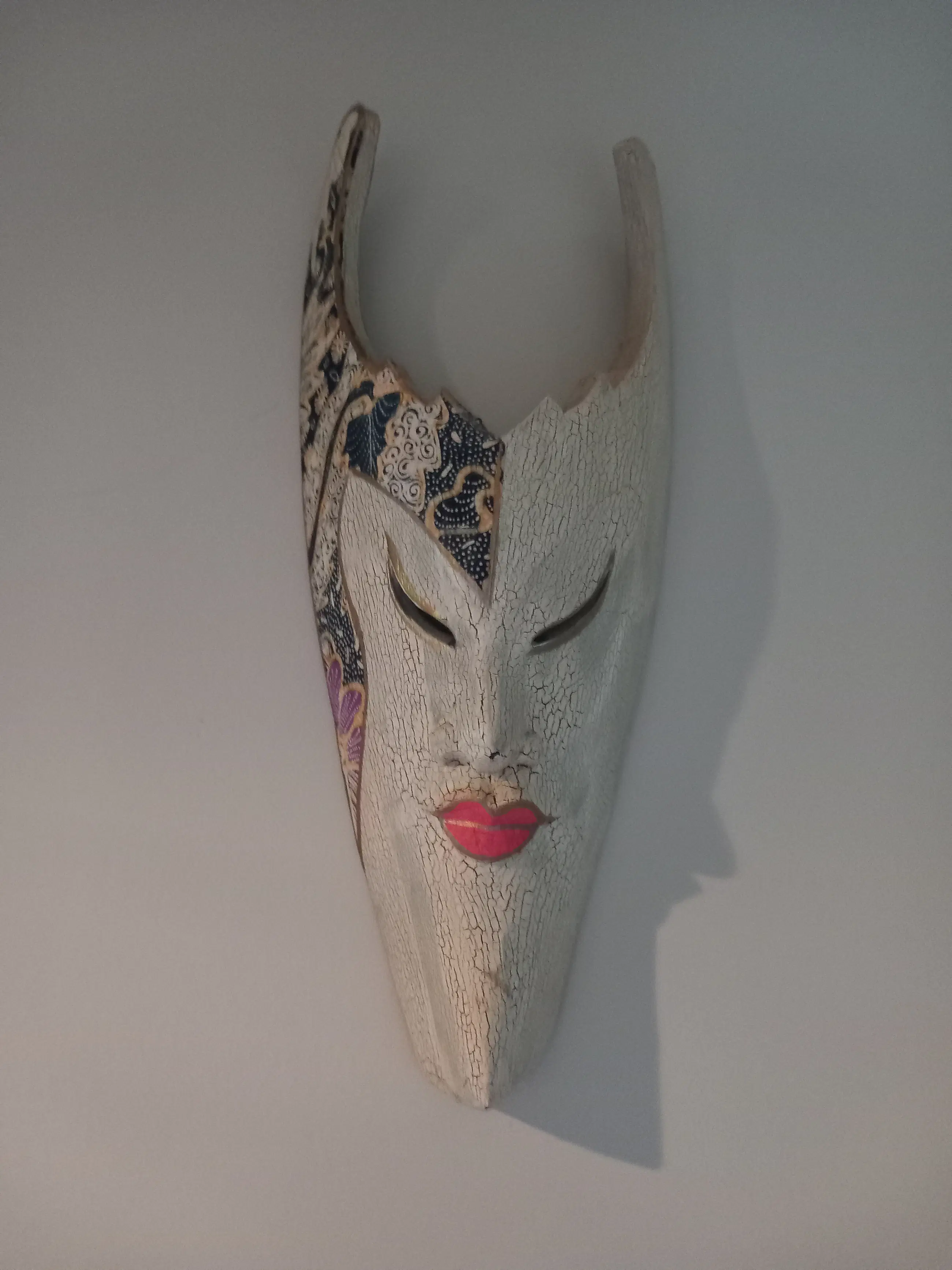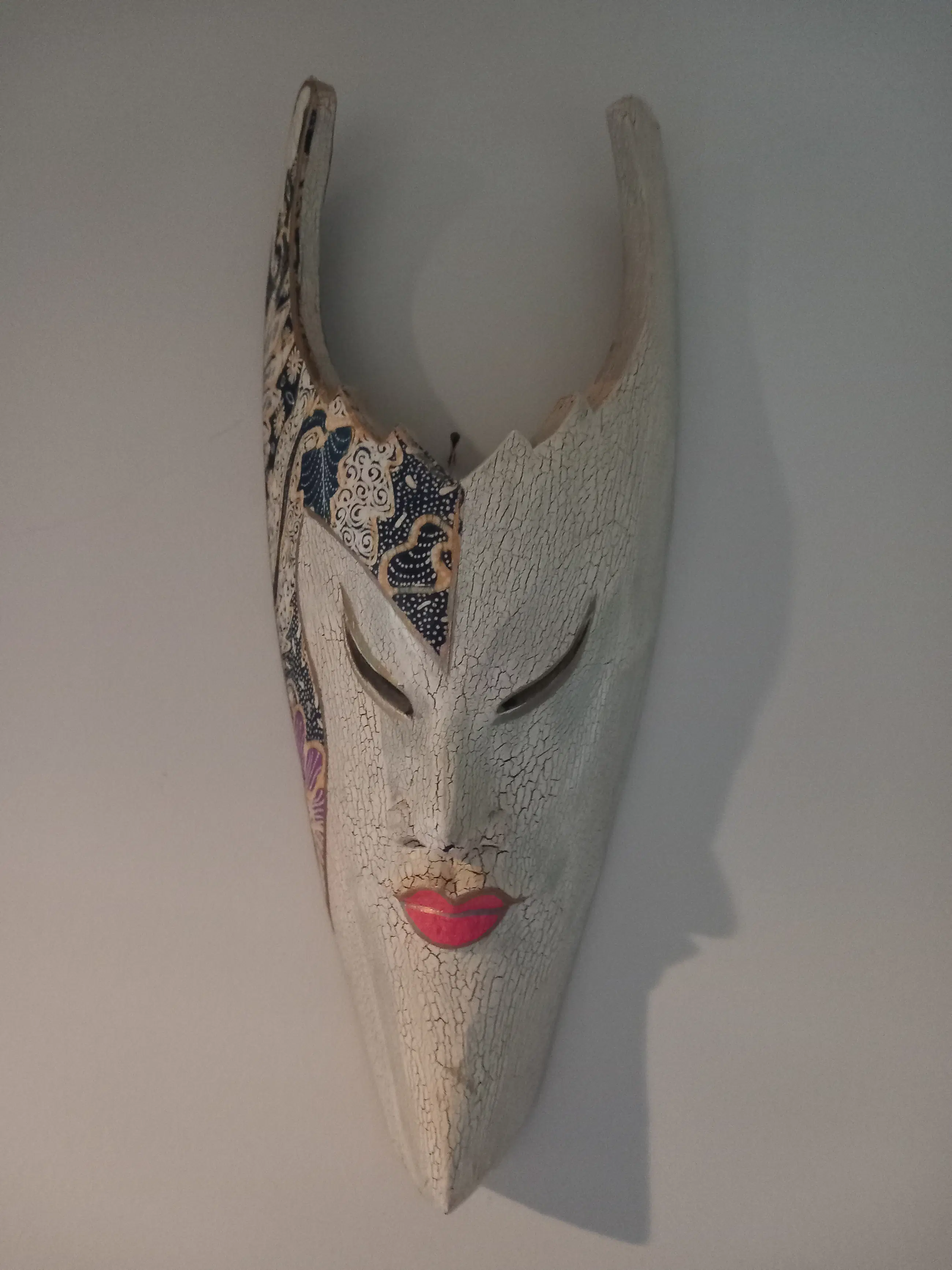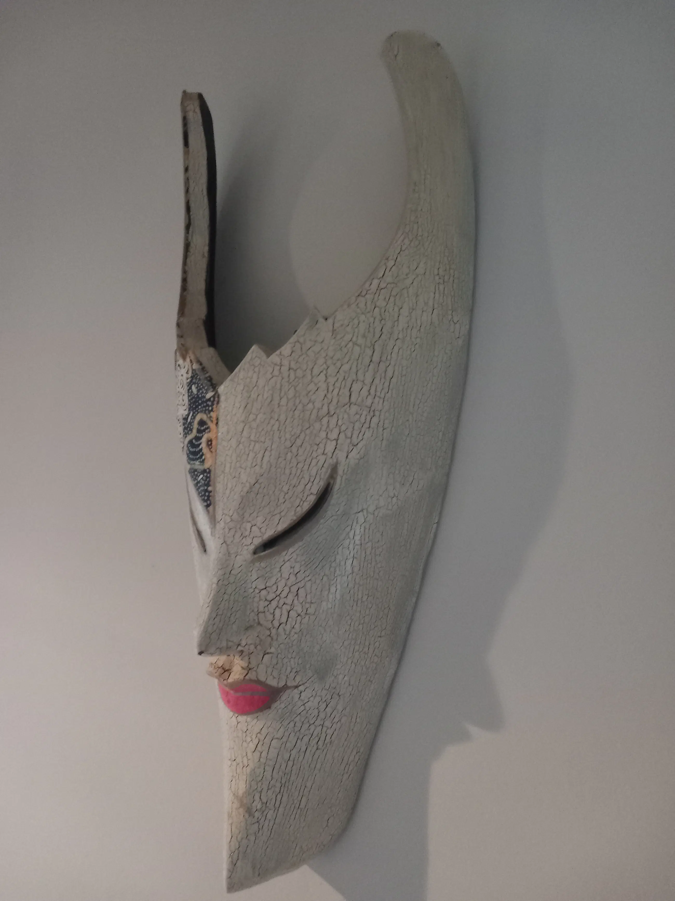 Prachtig etnisch stammenmasker uit Indonesië gesneden in vlamhout met mooie beschilderingen. In goede staat met minimale gebruikerssporen, niet storend in zijn geheel. Zie foto's, deze maken onderdeel uit van de presentatie