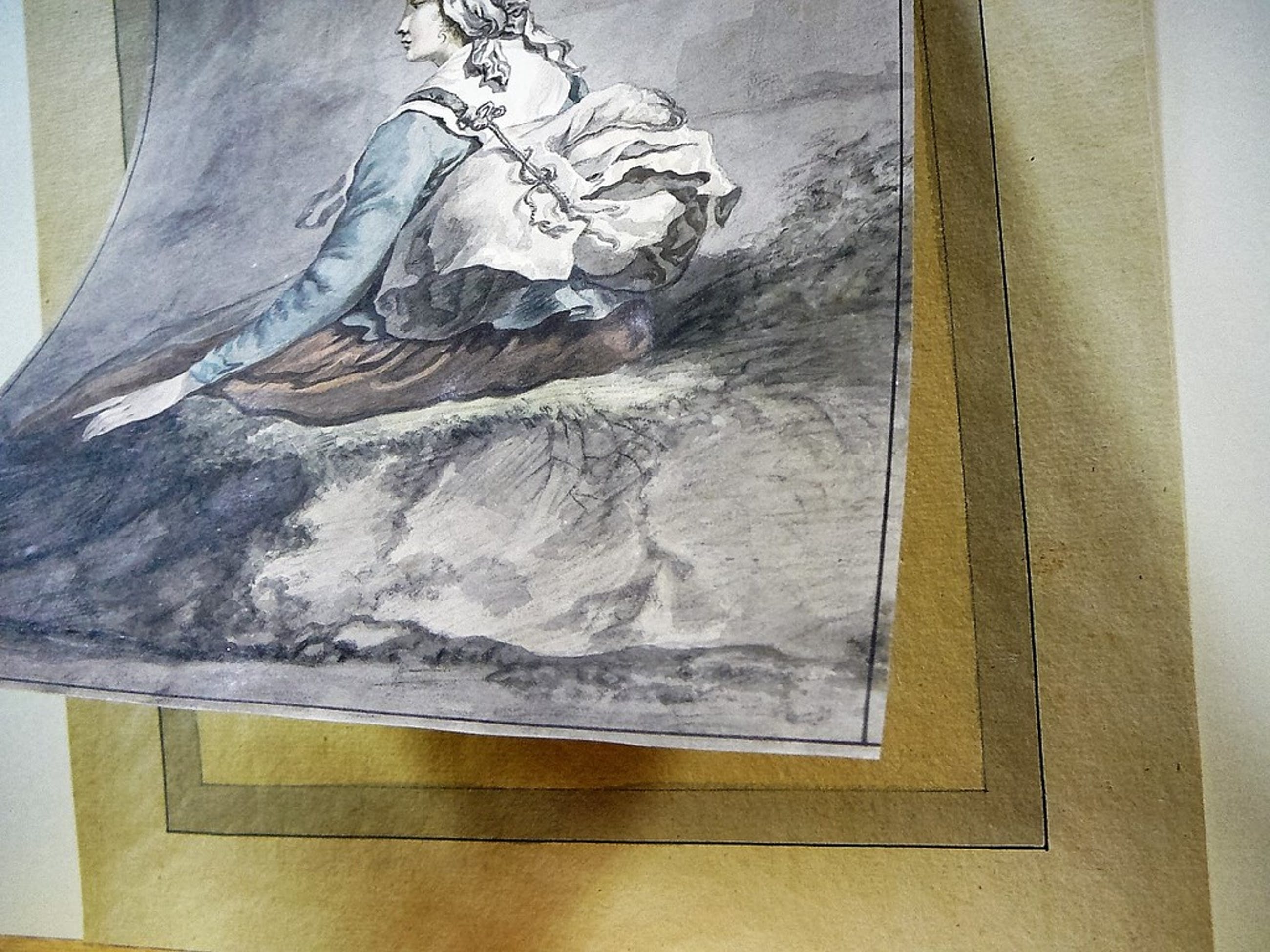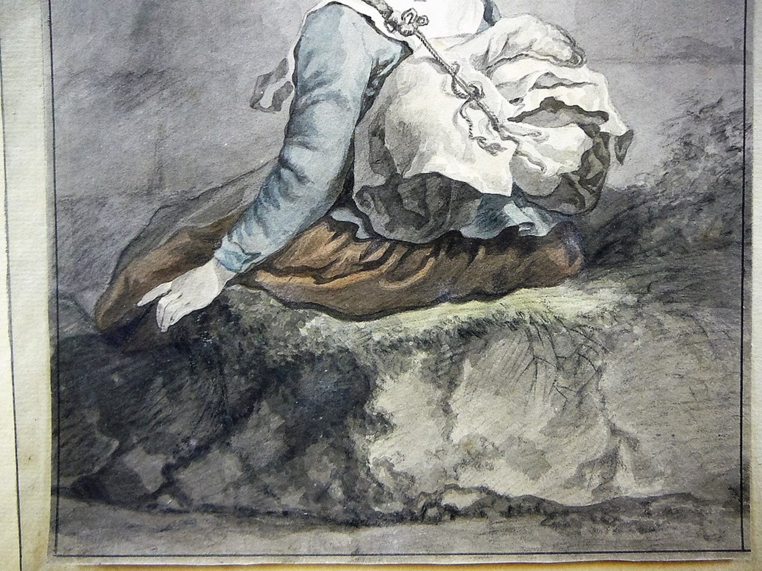 Prachtige Aquarel Meisje op rots met rugzak begin 19e eeuw