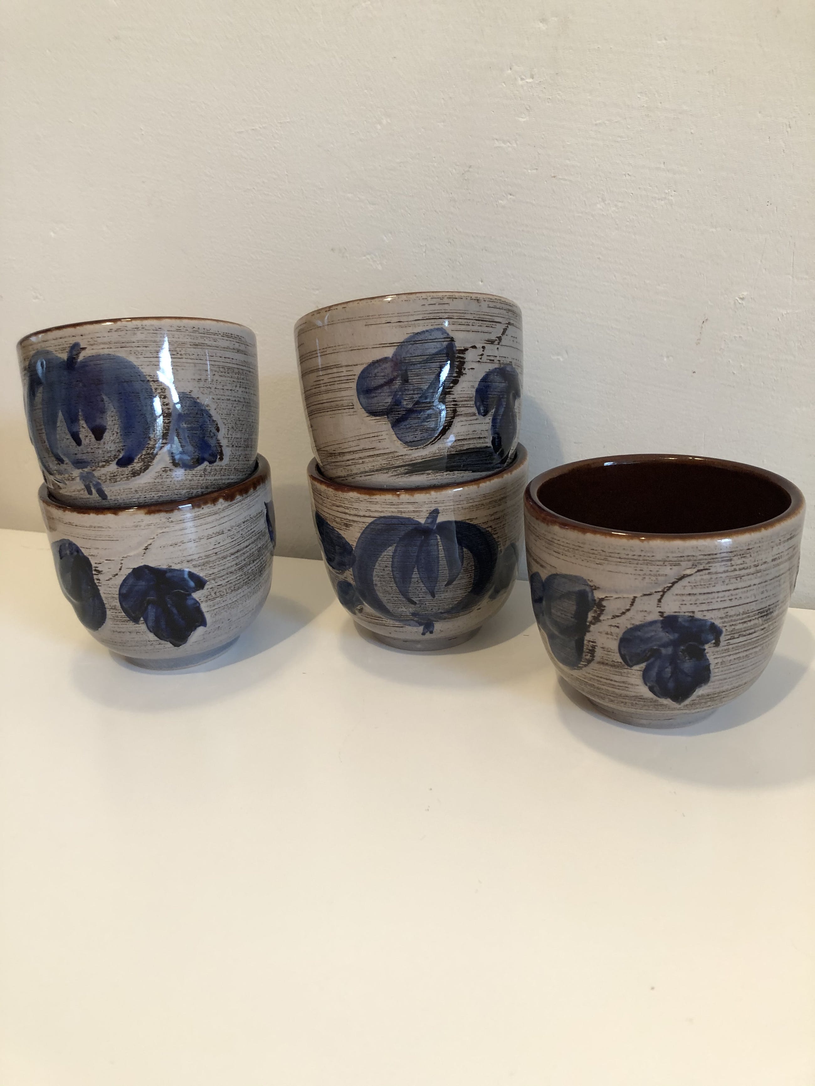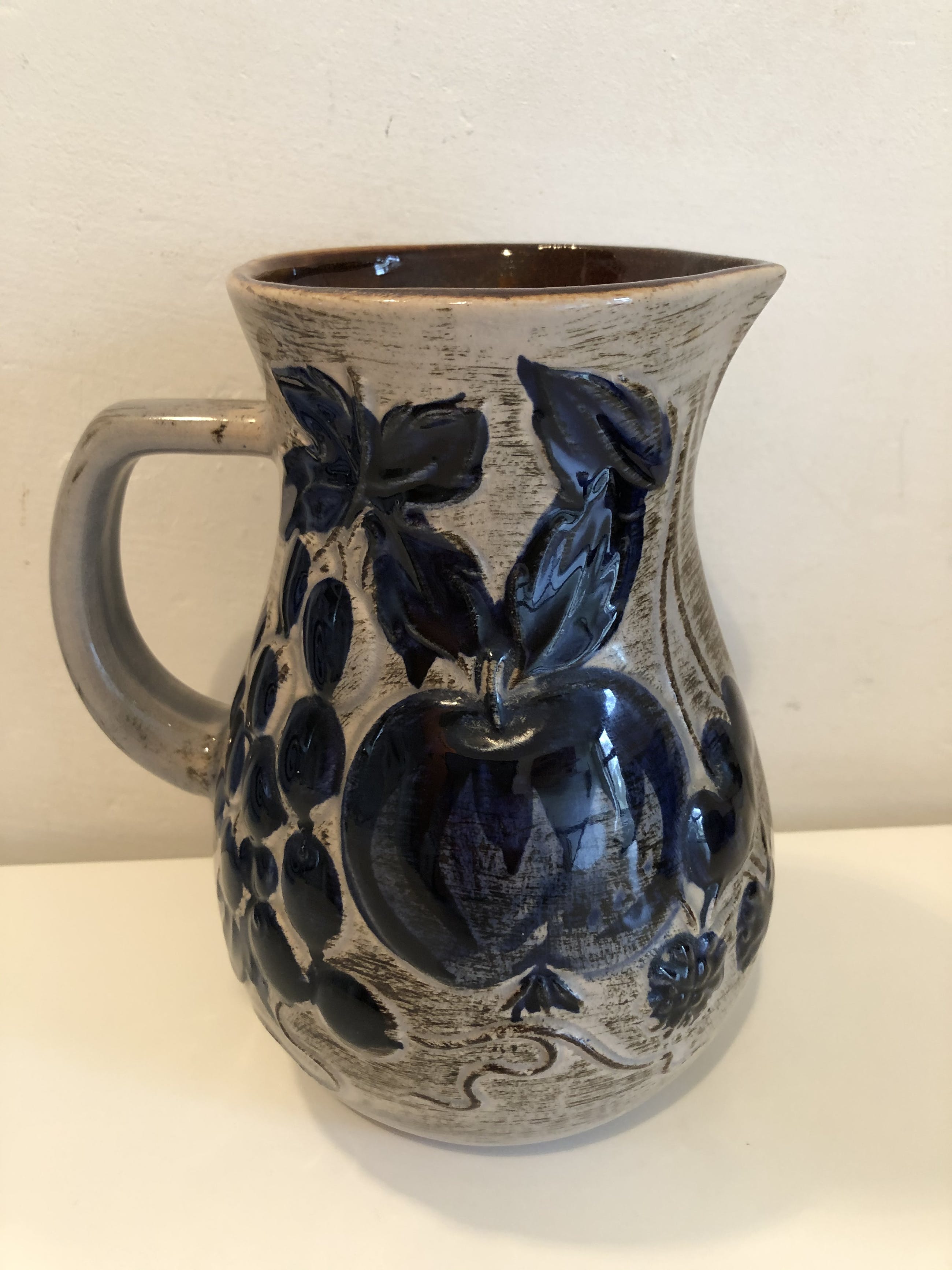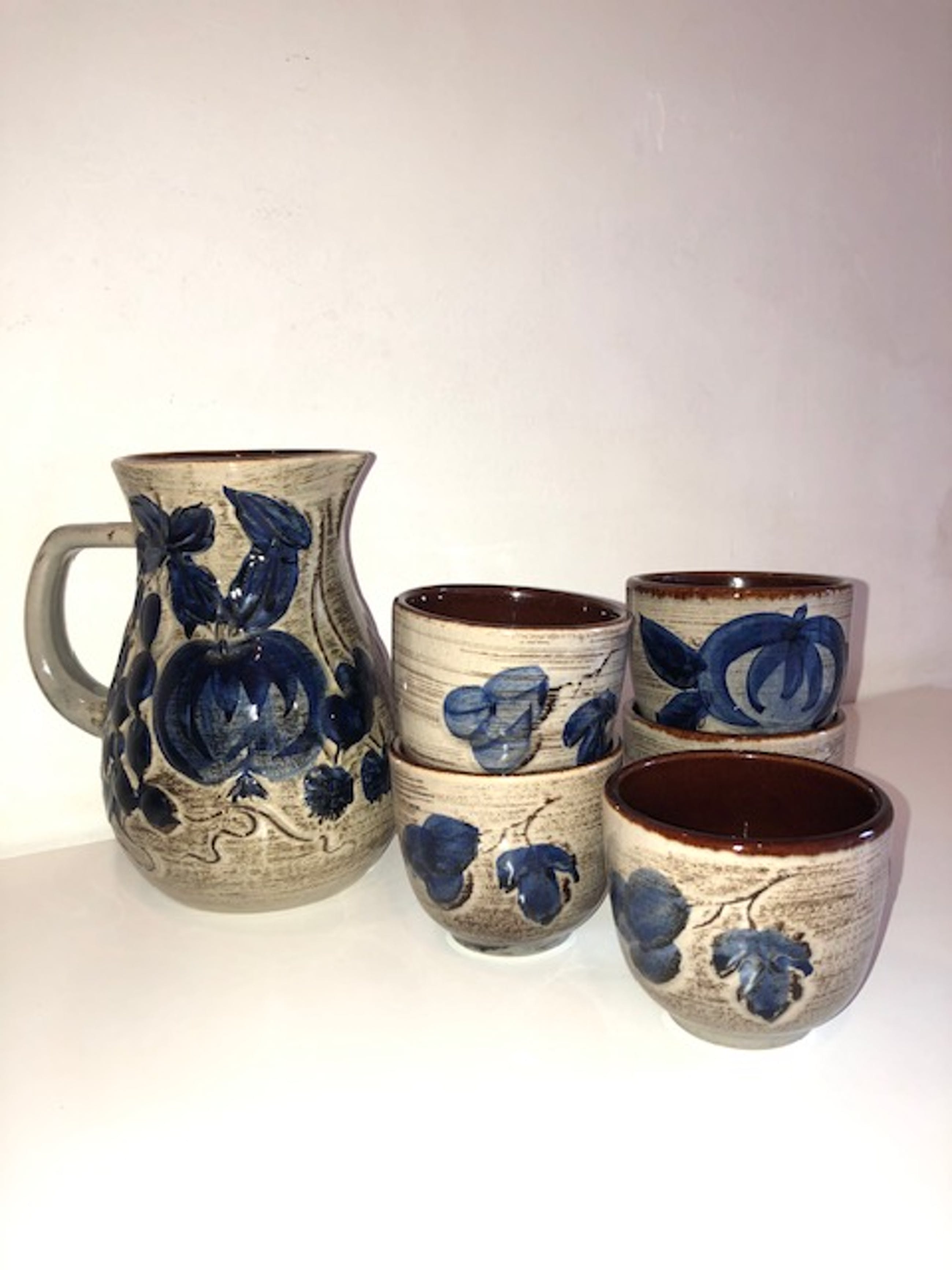 Prachtige kan en 5 mokken van keramiek, W-Germany, in nieuw staat. Uit de jaren 80 van de vorige eeuw met een heel mooi fruit motief, in hoofdzakelijk verschillende kleuren blauw. Geen barsten of beschadigingen.