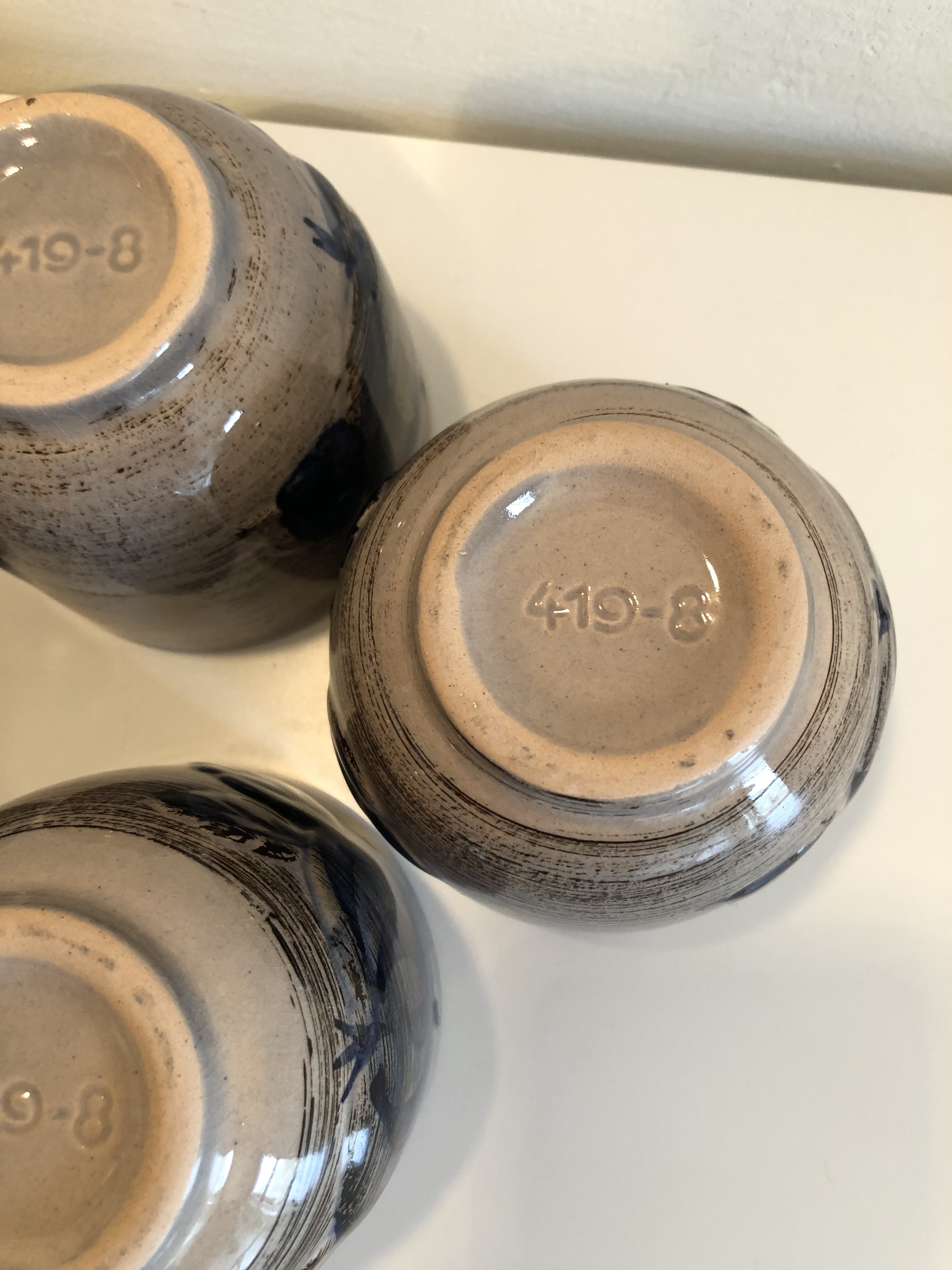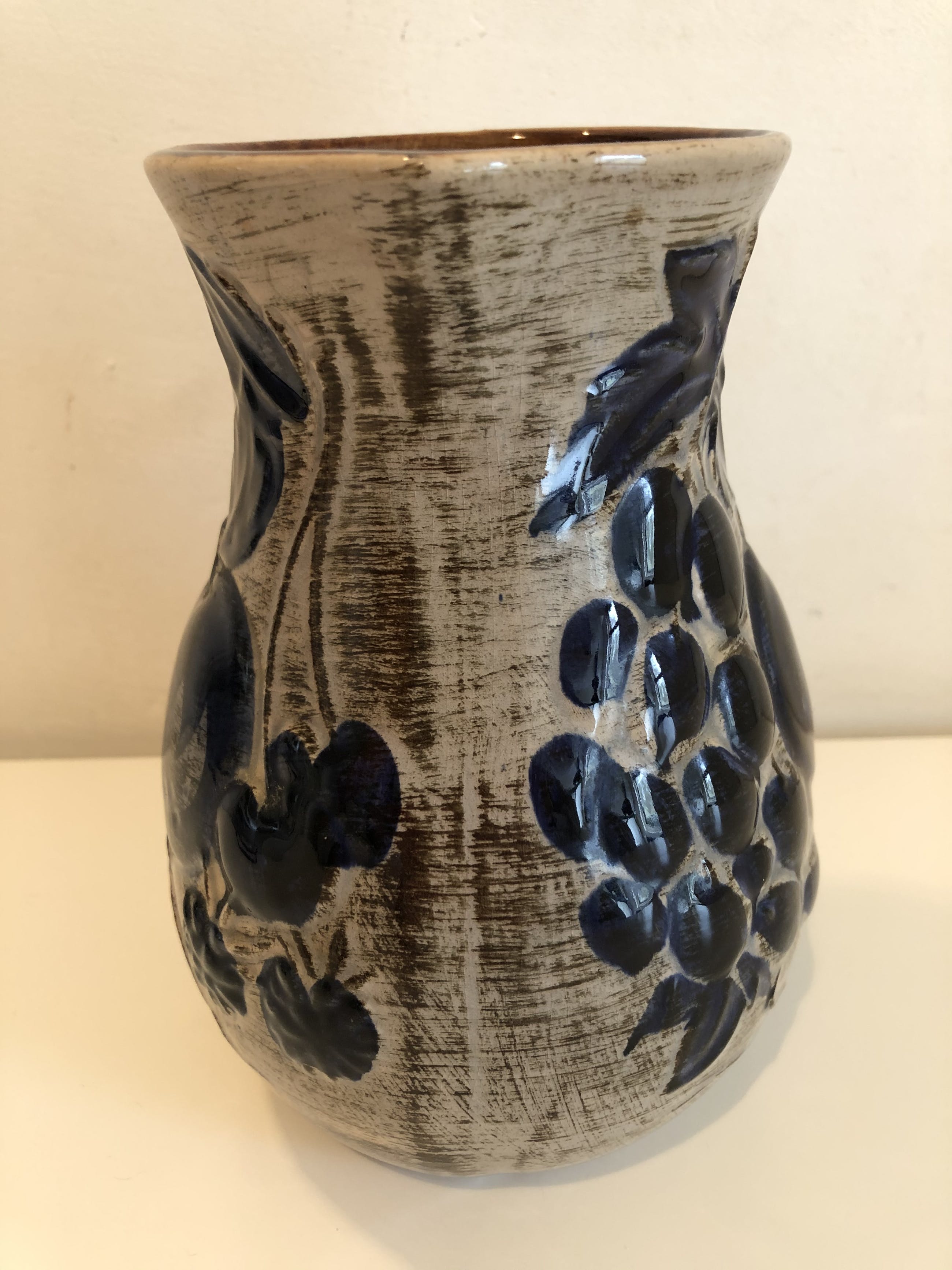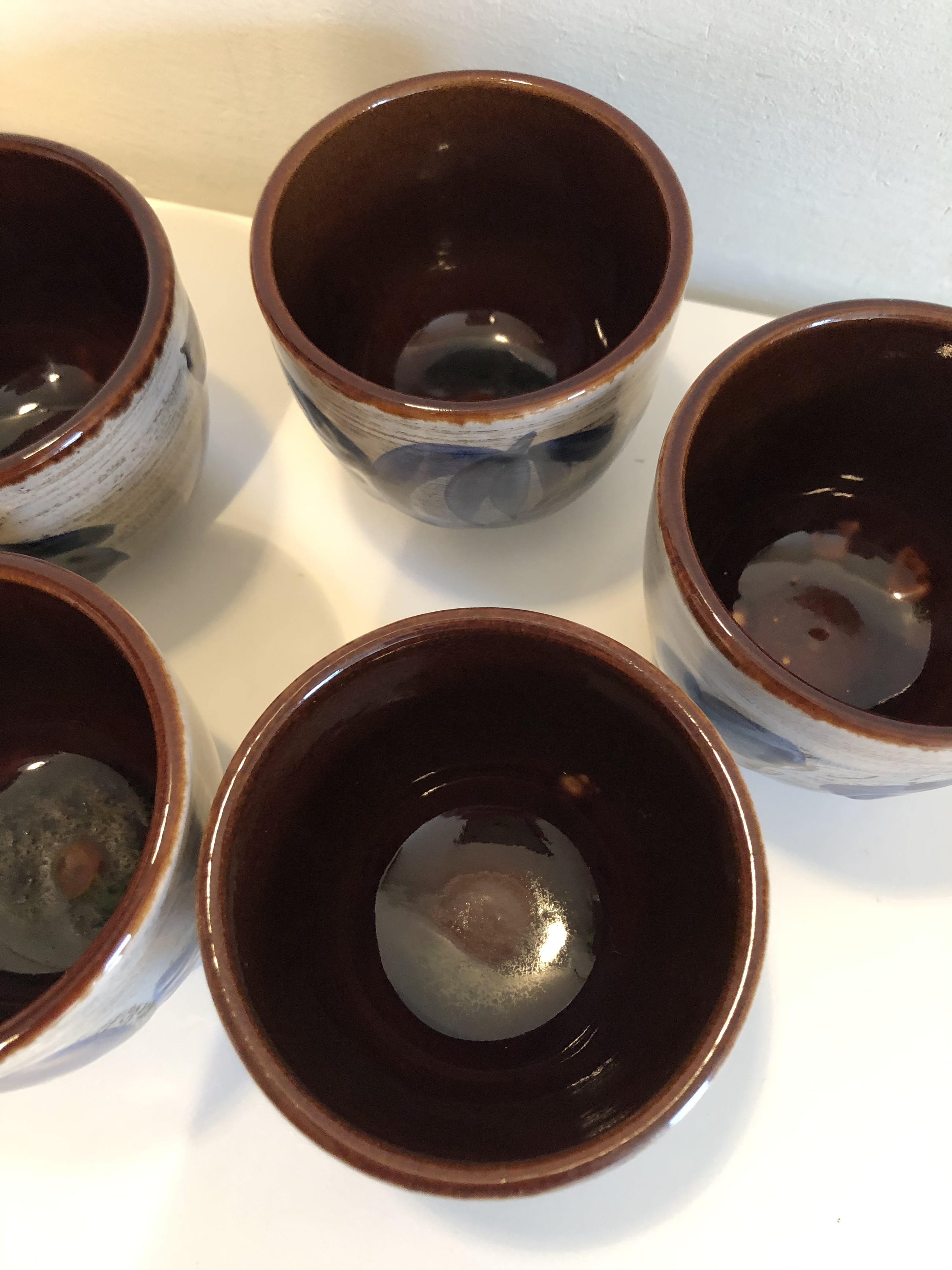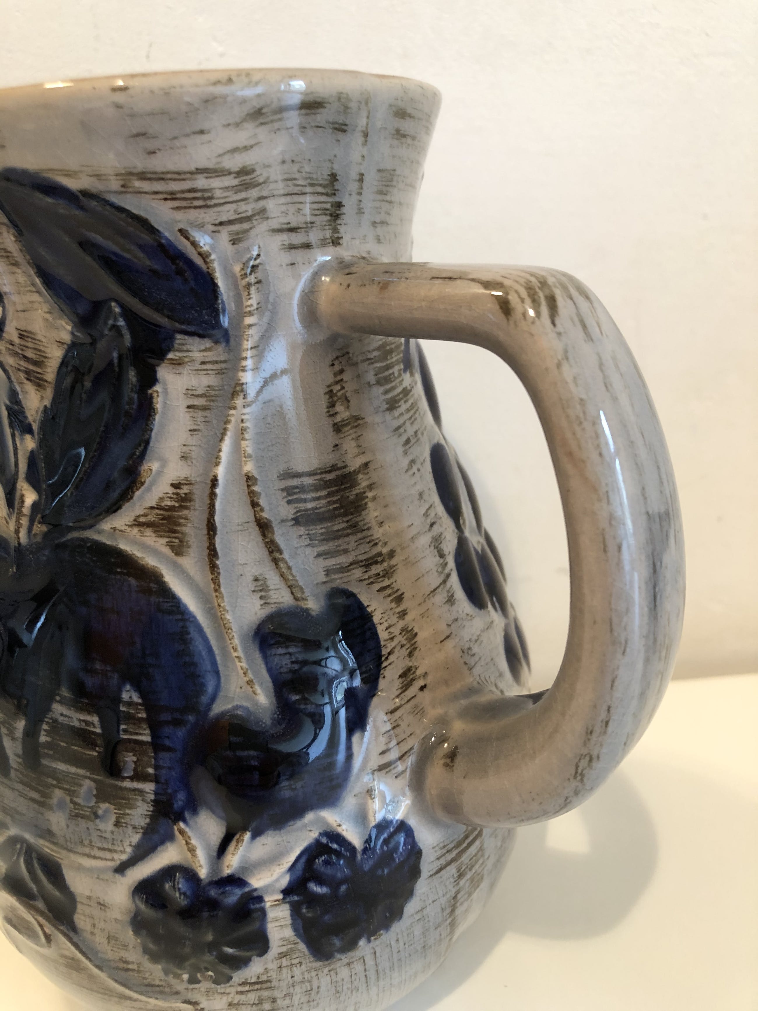 Prachtige kan en 5 mokken van keramiek, W-Germany, in nieuw staat. Uit de jaren 80 van de vorige eeuw met een heel mooi fruit motief, in hoofdzakelijk verschillende kleuren blauw. Geen barsten of beschadigingen.