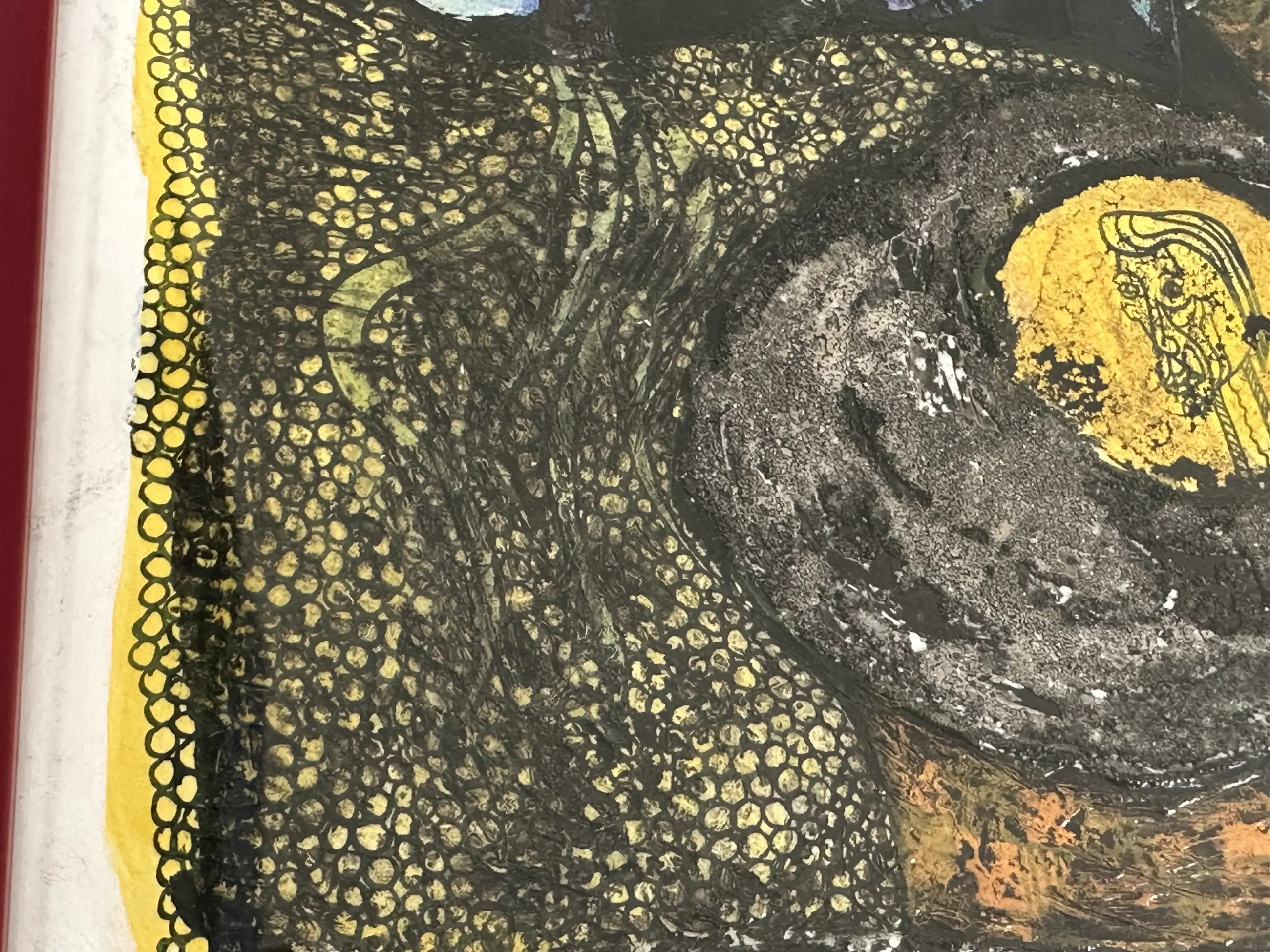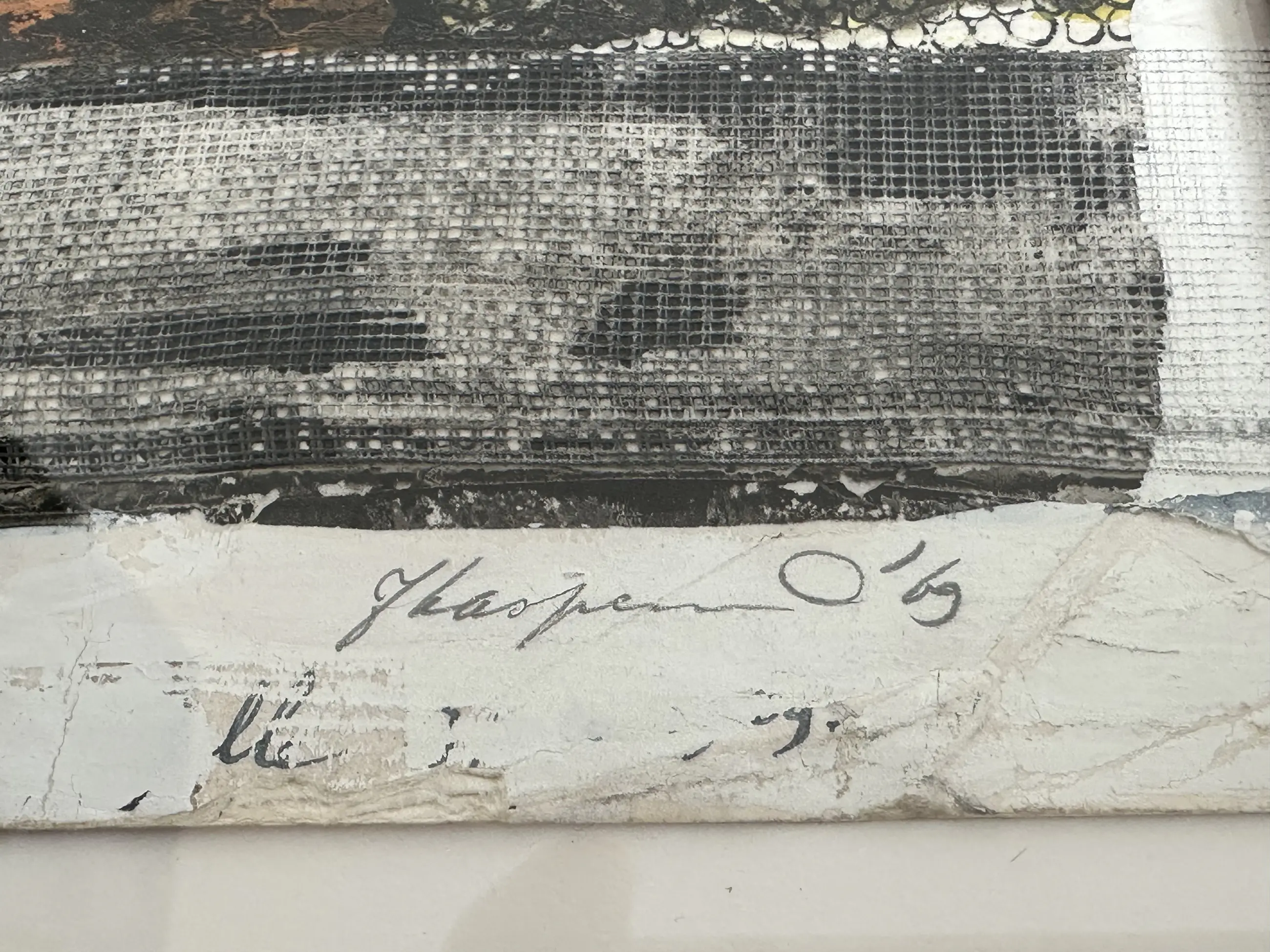 Bijzonder aansprekend kunstwerk waarvan de signatuur moeilijk is te lezen. Uit de titel valt af te leiden dat het zijn oorsprong vindt in Friesland in 1969. Het is nummer 6 uit een oplage van 7. Er zit het nodige relief in het werk en er is gebruikt gemaakt van diverse materialen, wat het werk een zeer levendige uitstraling geeft. Gezien de gemengde technieken moet elk werk afzonderlijk zijn gemaakt en m.i. ondanks de nummering uniek.