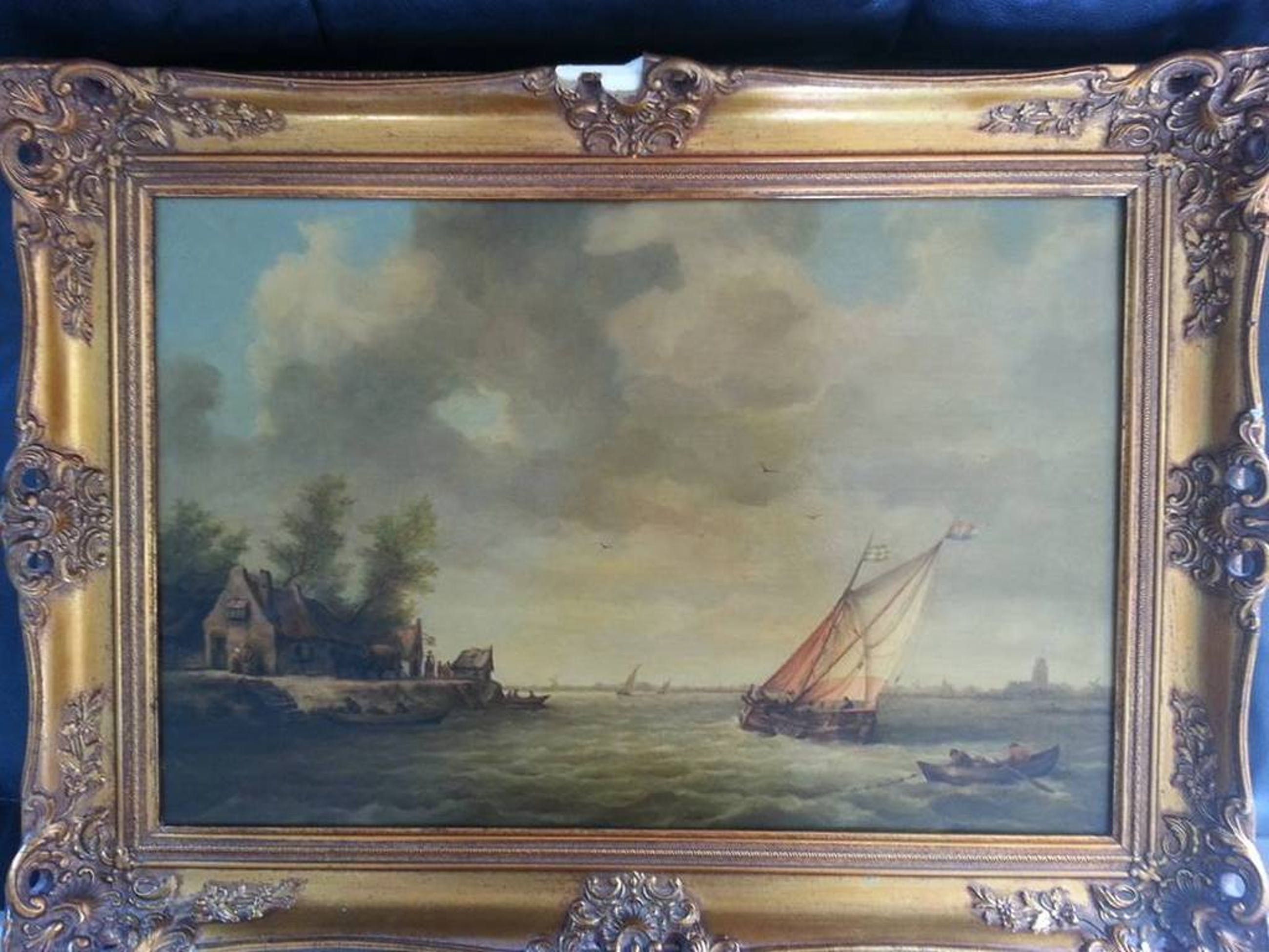 Schitterend werk van enkele schepen voor de kust. Met op de achtergrond een dorp en aan de linkerkant wat huizen met personen.Helaas is het niet gesigneerd maar de kwaliteit straalt er vanaf.