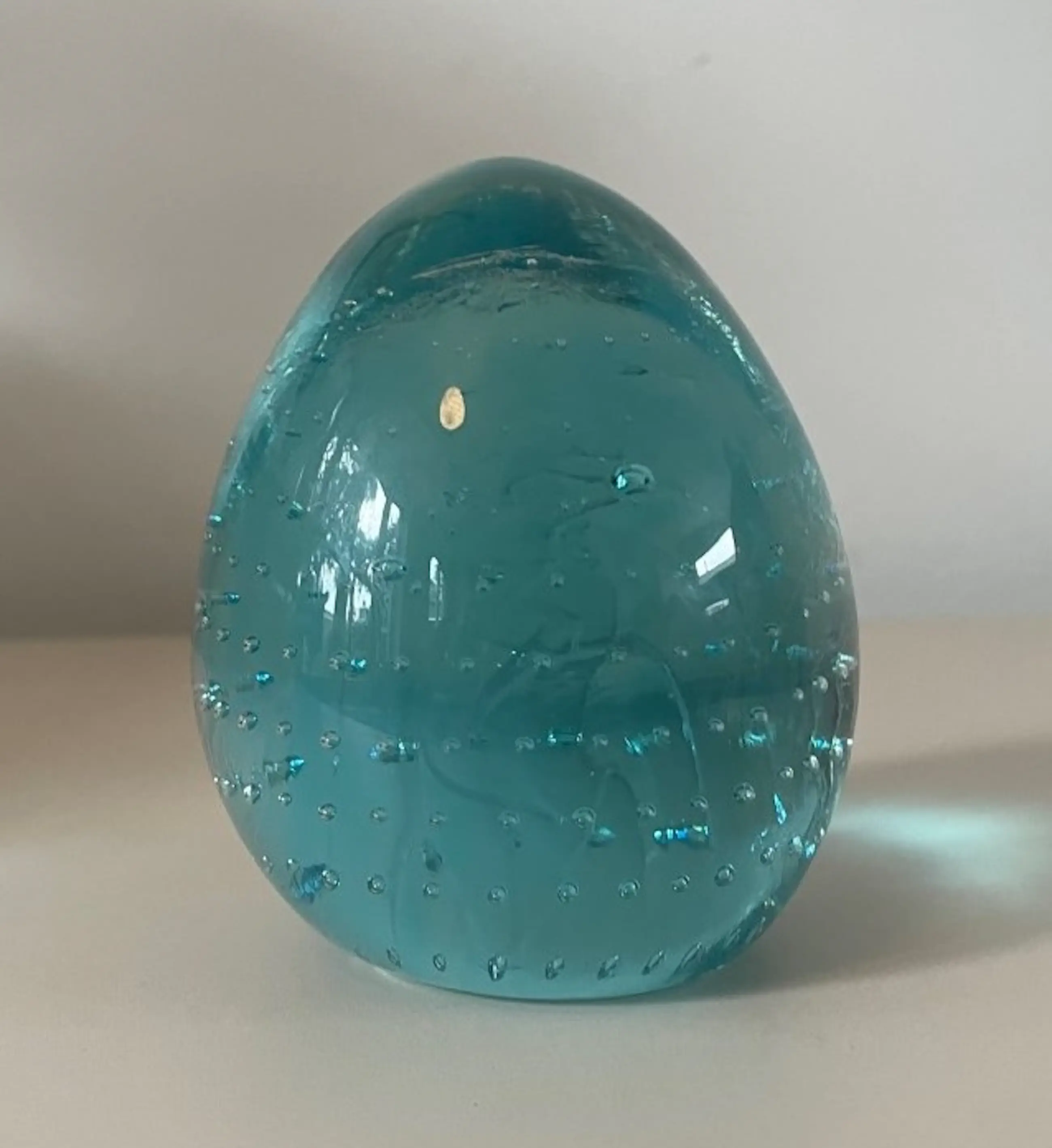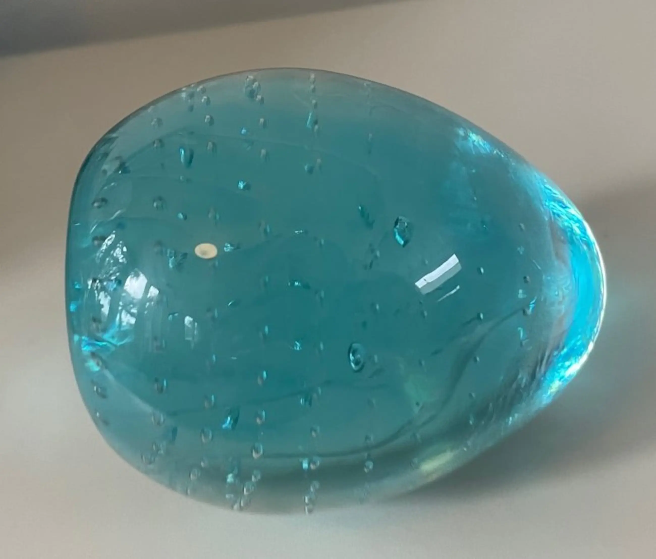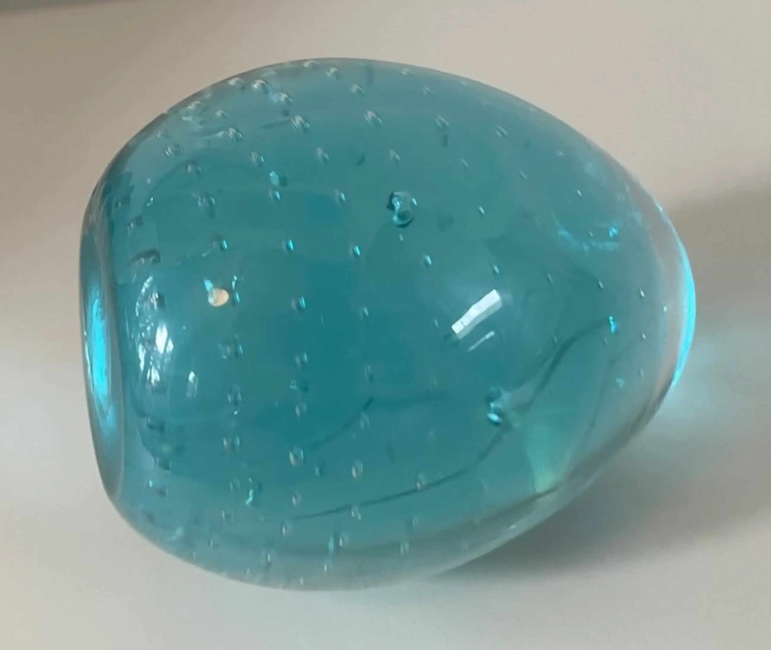 Studio lichtblauw glazen eivormige presse papier met aan de binnenzijde bullicante luchtbellen die van boven naar beneden steeds iets groter worden en blank kleurige kwal aan de binnenzijde. In perfecte nieuw conditie. Onderaan met diamantpen gesigneerd Wils en gedateerd 2004.