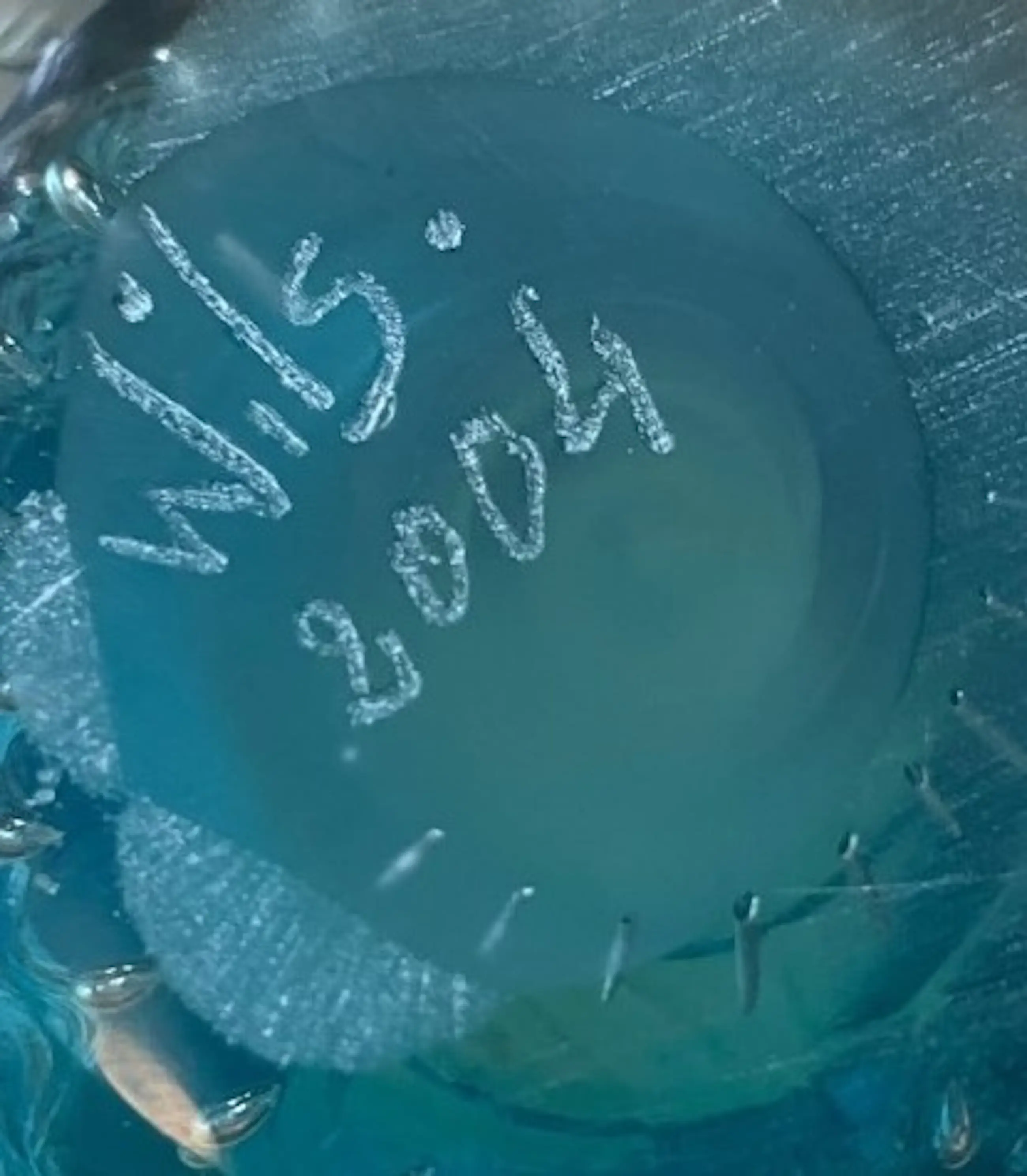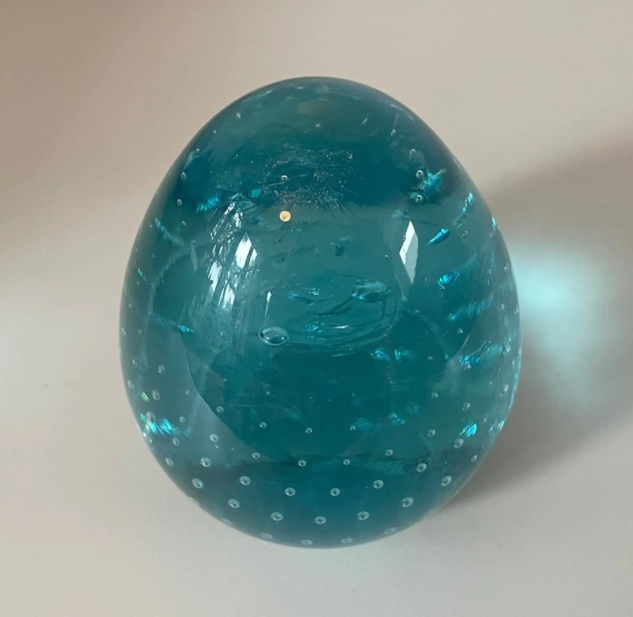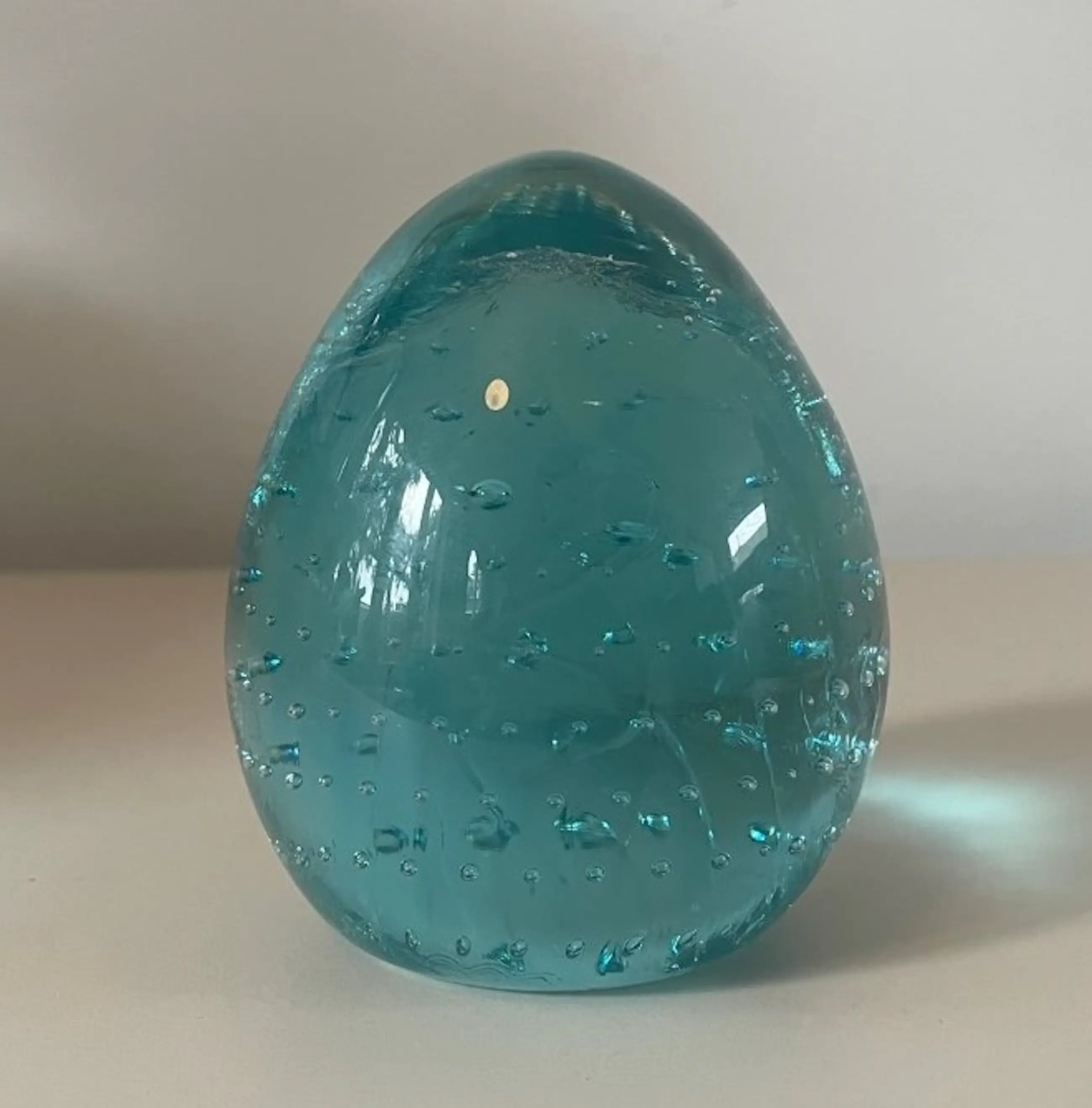 Studio lichtblauw glazen eivormige presse papier met aan de binnenzijde bullicante luchtbellen die van boven naar beneden steeds iets groter worden en blank kleurige kwal aan de binnenzijde. In perfecte nieuw conditie. Onderaan met diamantpen gesigneerd Wils en gedateerd 2004.