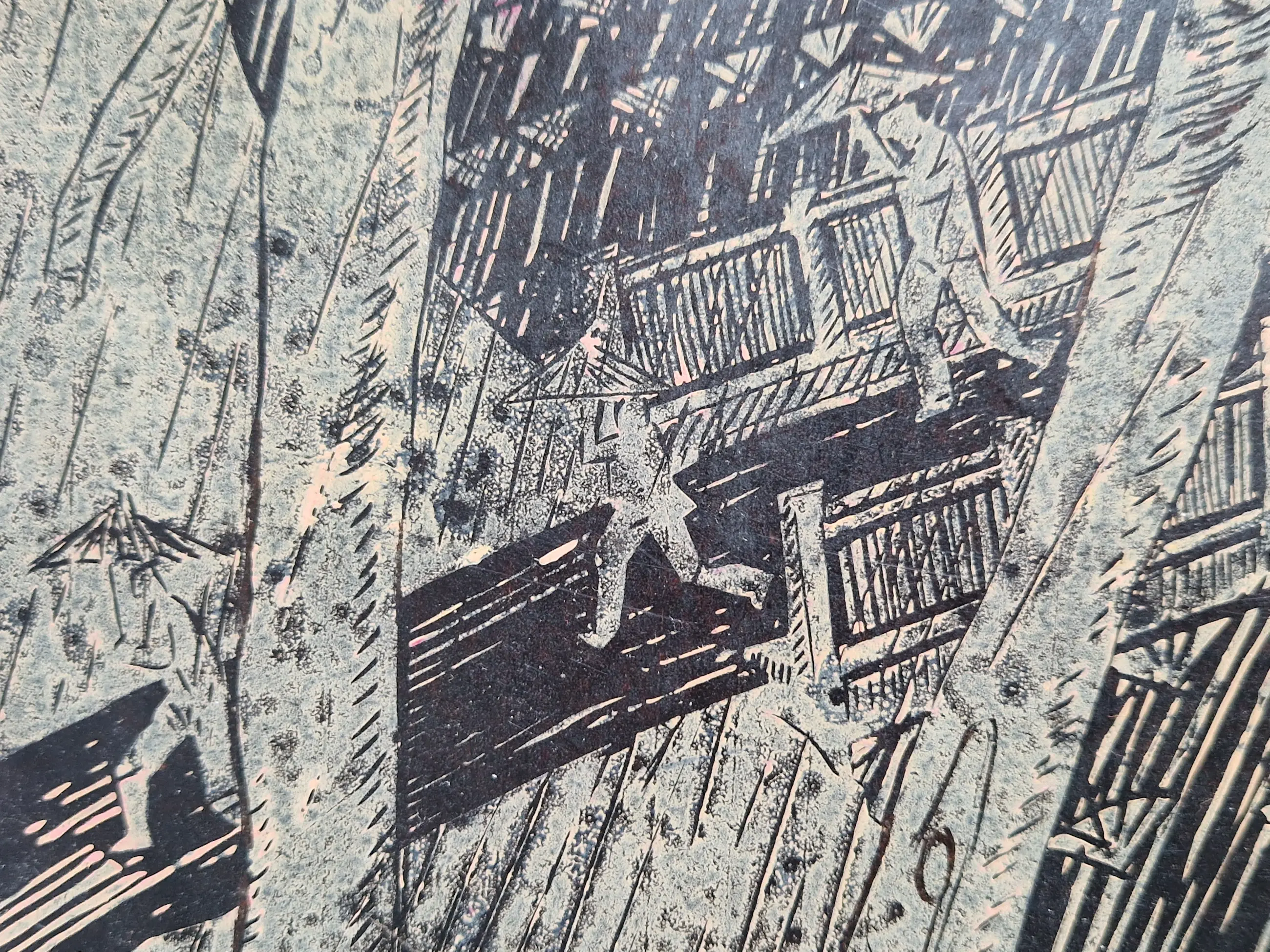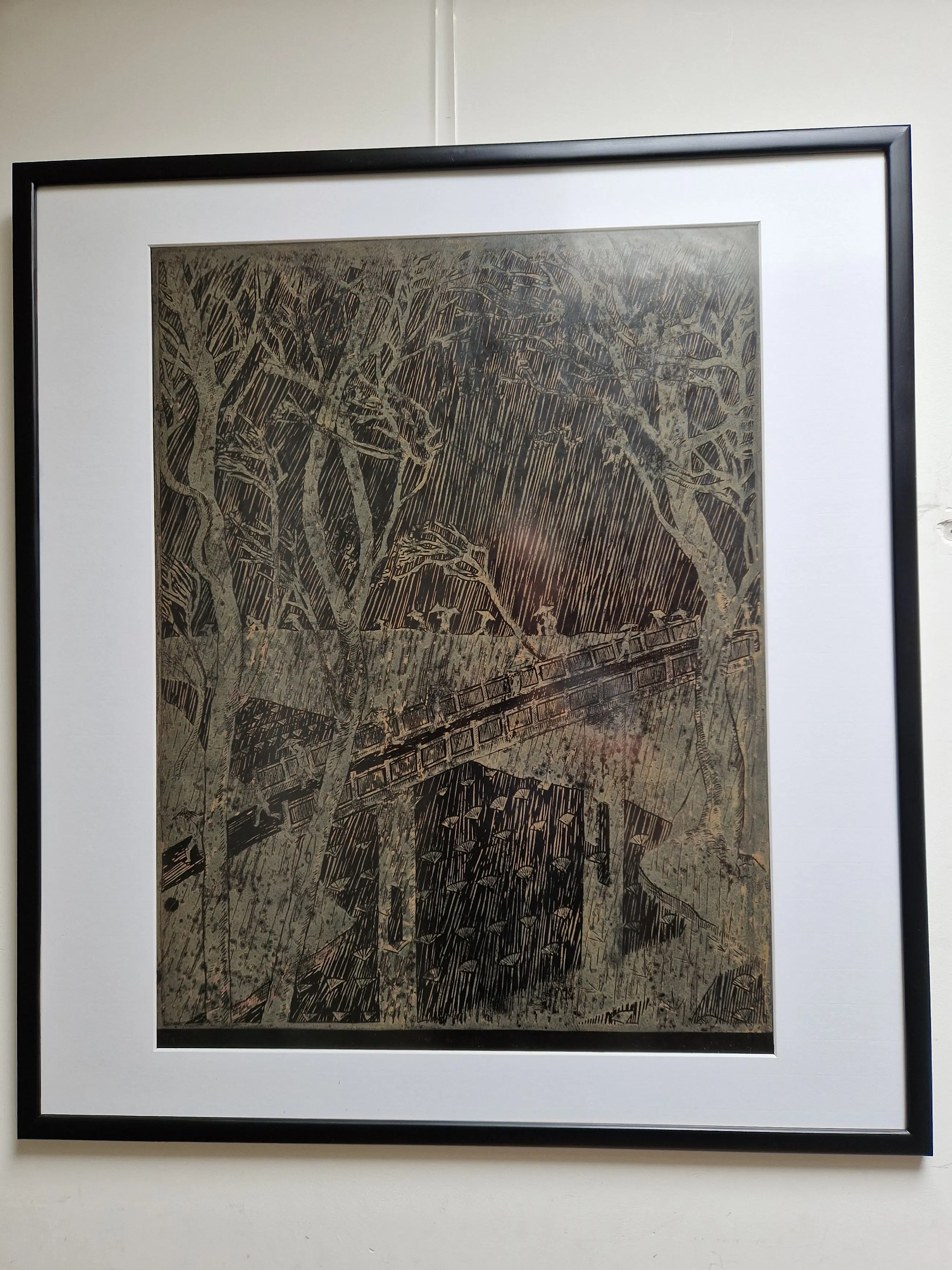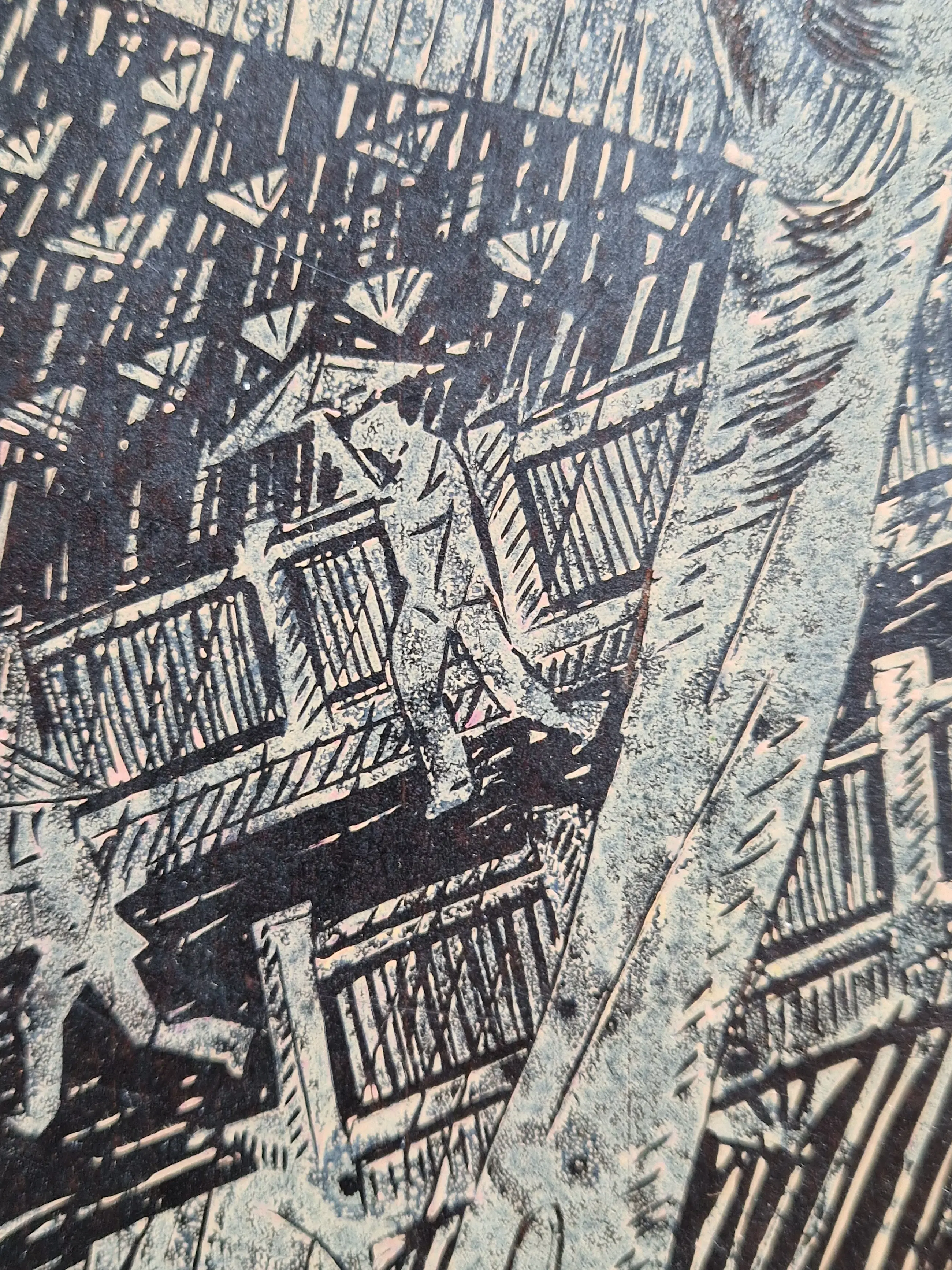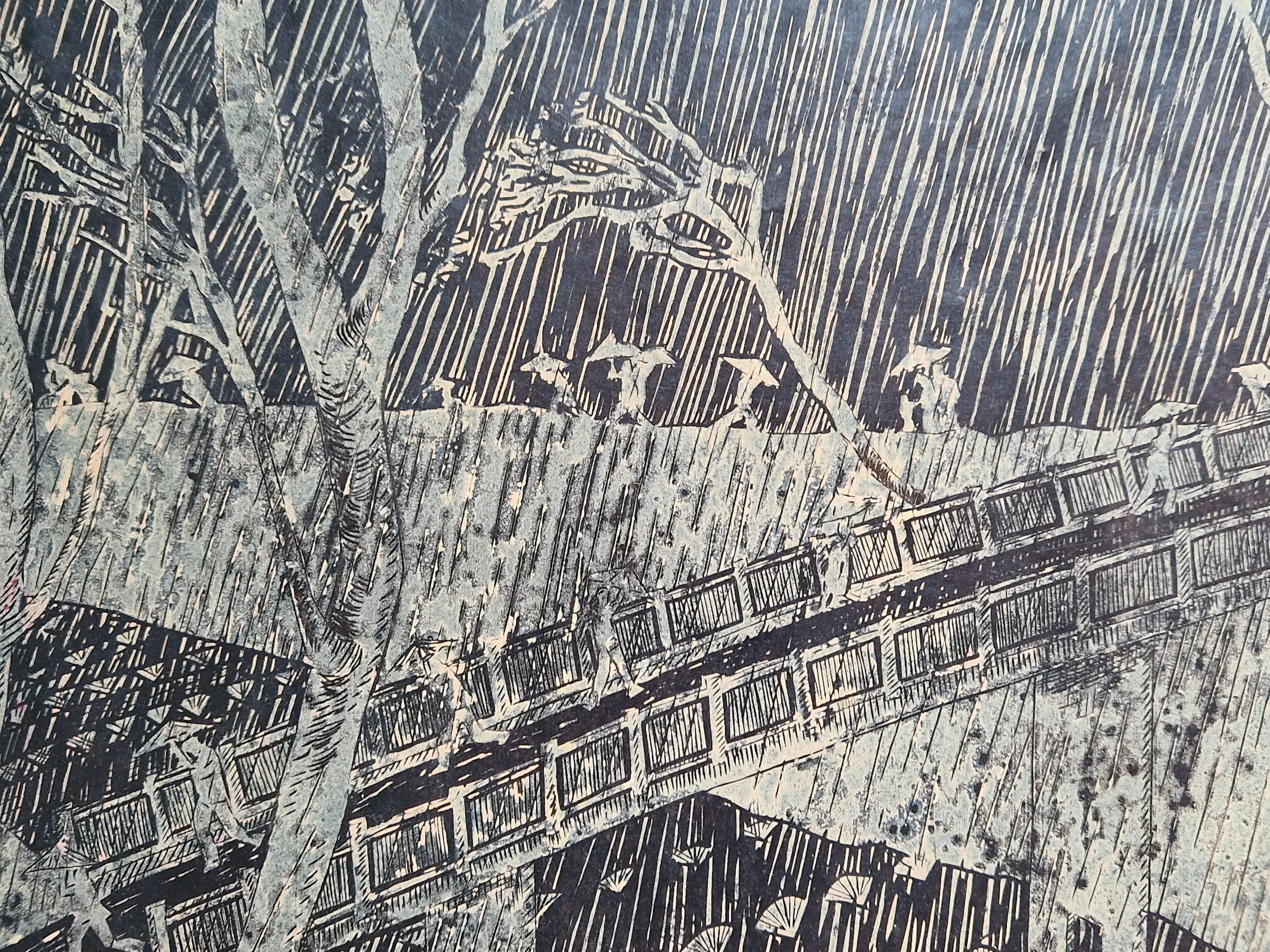 Imposante en intrigerende lino- of houtsnede van een Japanse kunstenaar. Het werk is rechtsonder gesigneerd, maar de signatuur is voor mij niet goed leesbaar (Hado - Alvar?).