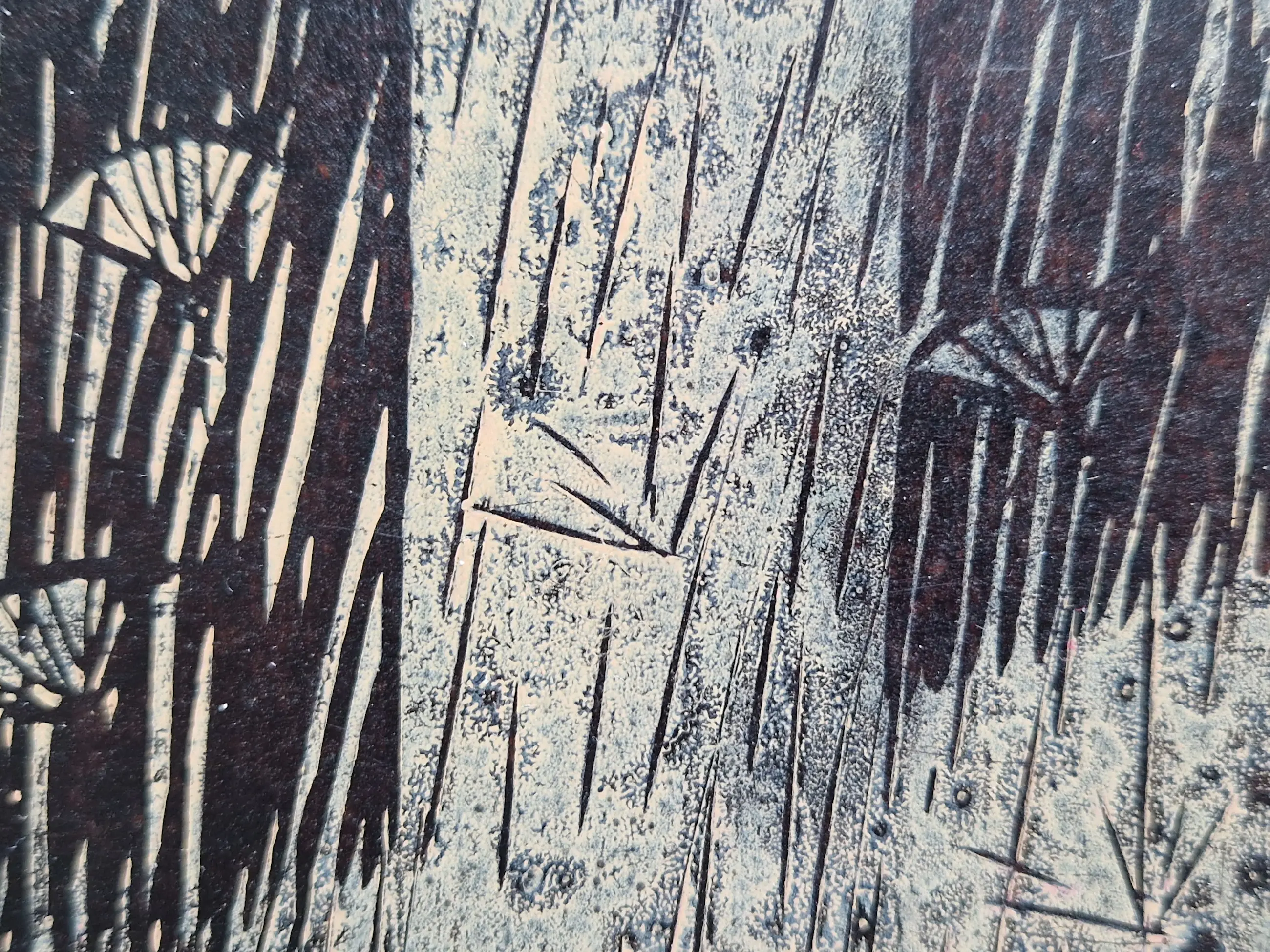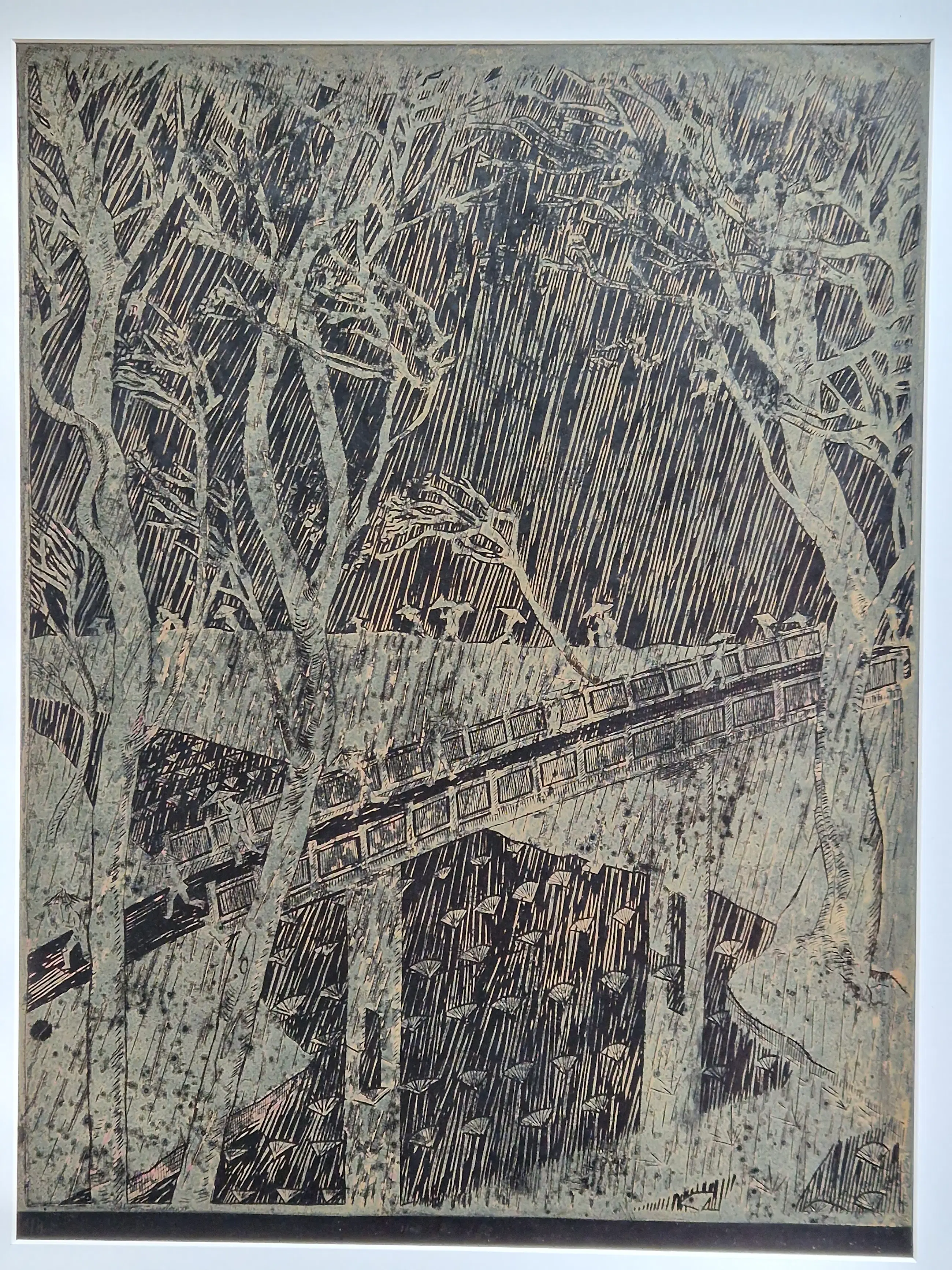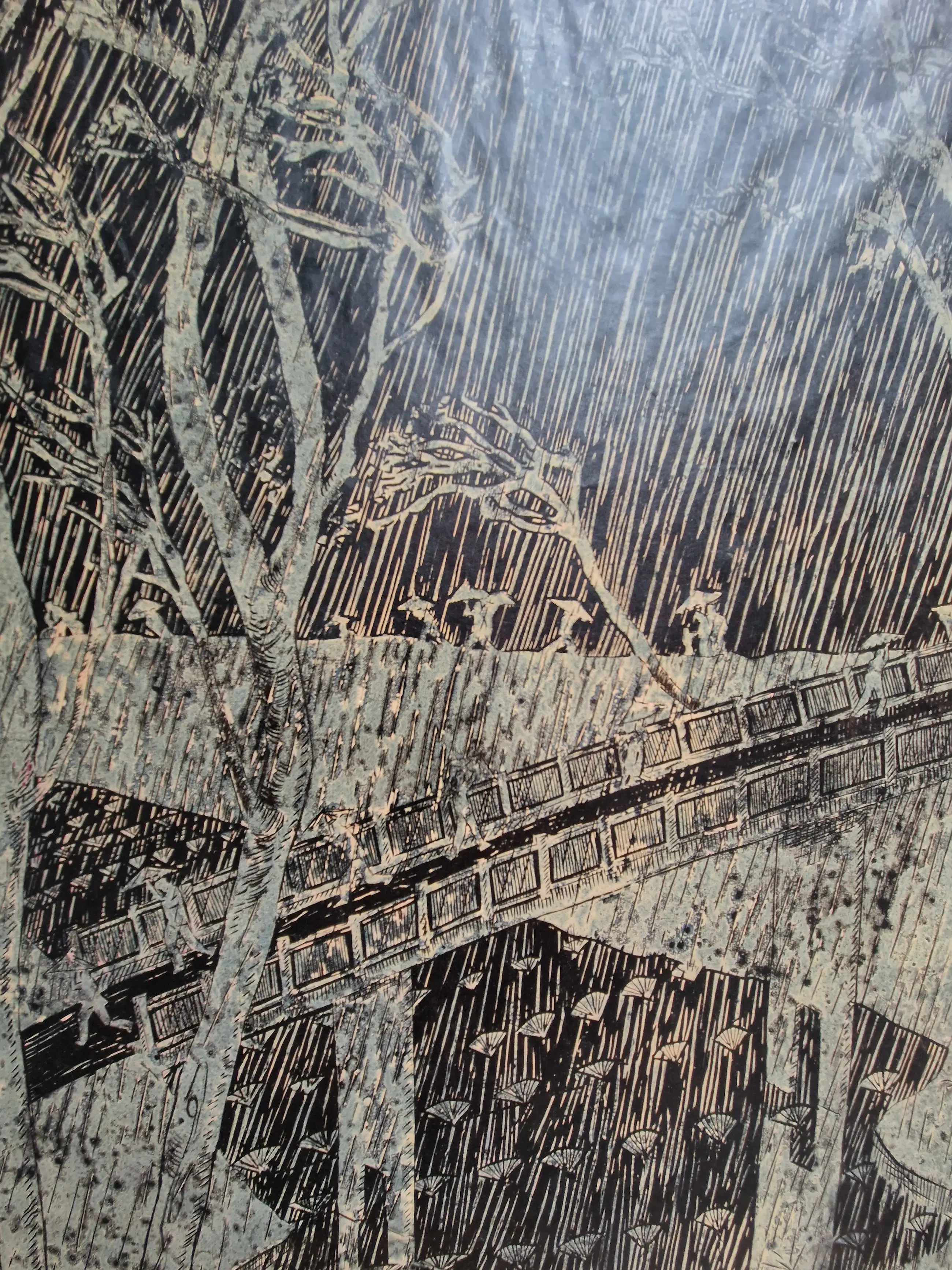 Imposante en intrigerende lino- of houtsnede van een Japanse kunstenaar. Het werk is rechtsonder gesigneerd, maar de signatuur is voor mij niet goed leesbaar (Hado - Alvar?).