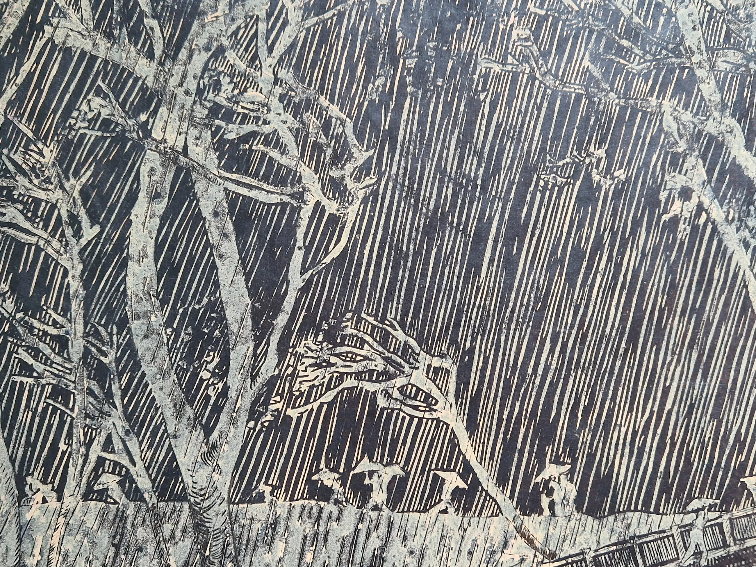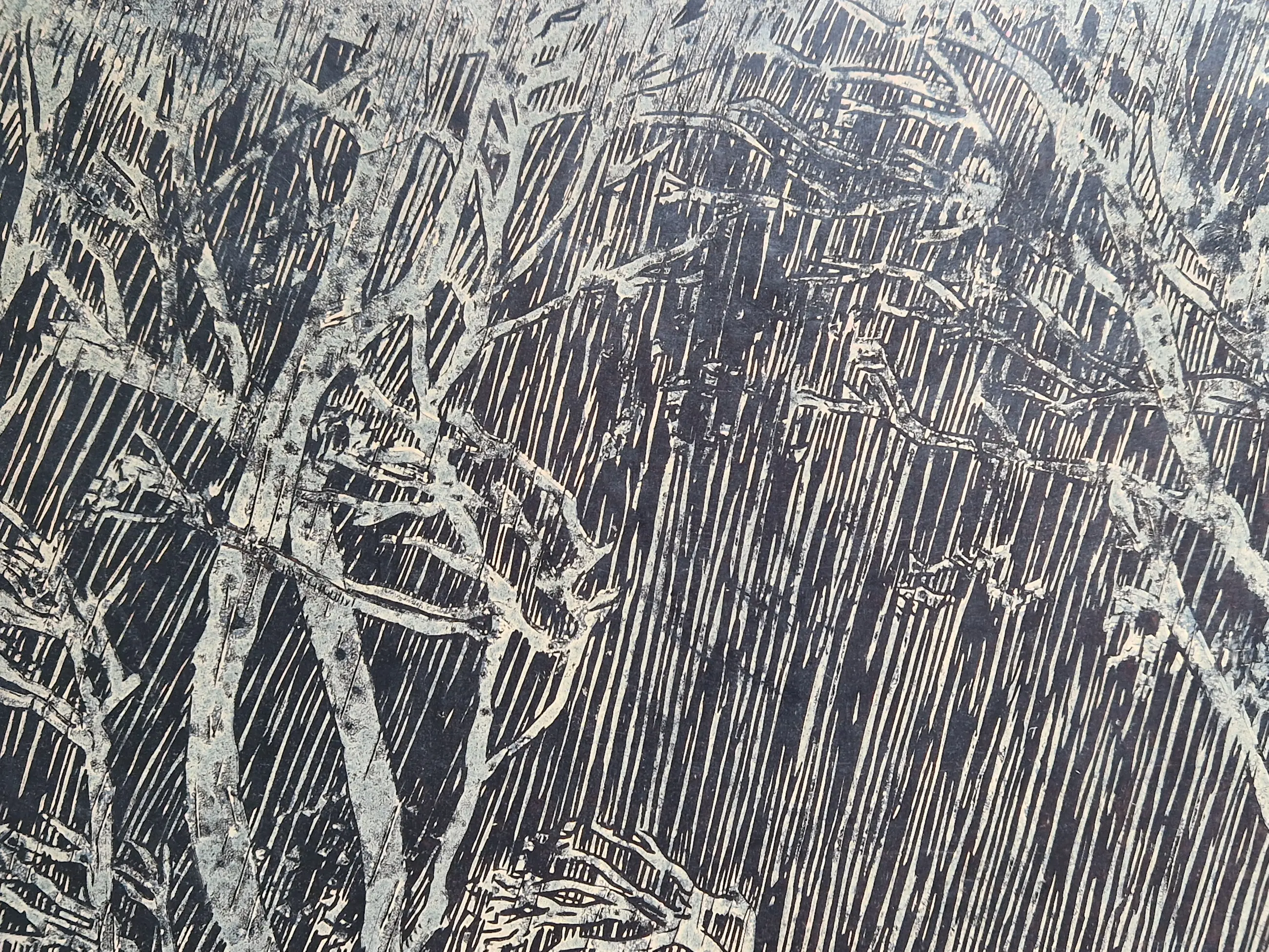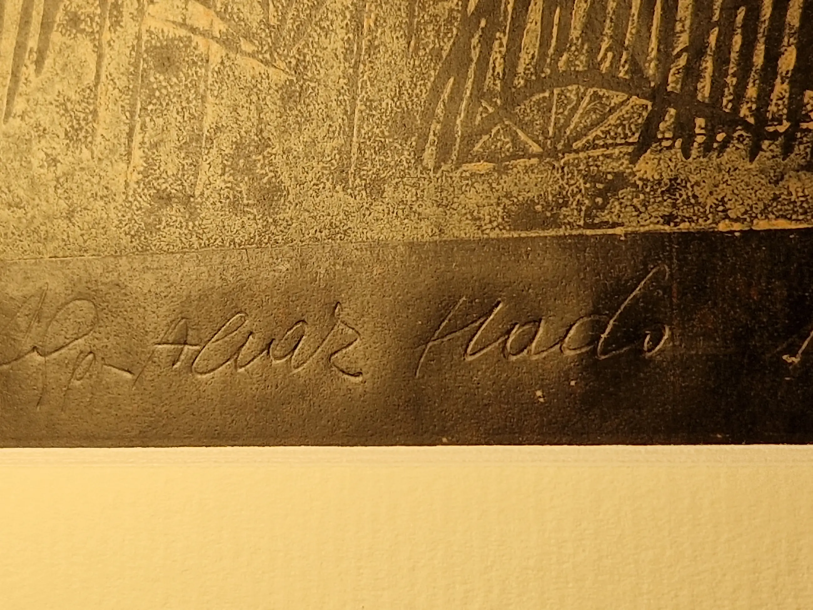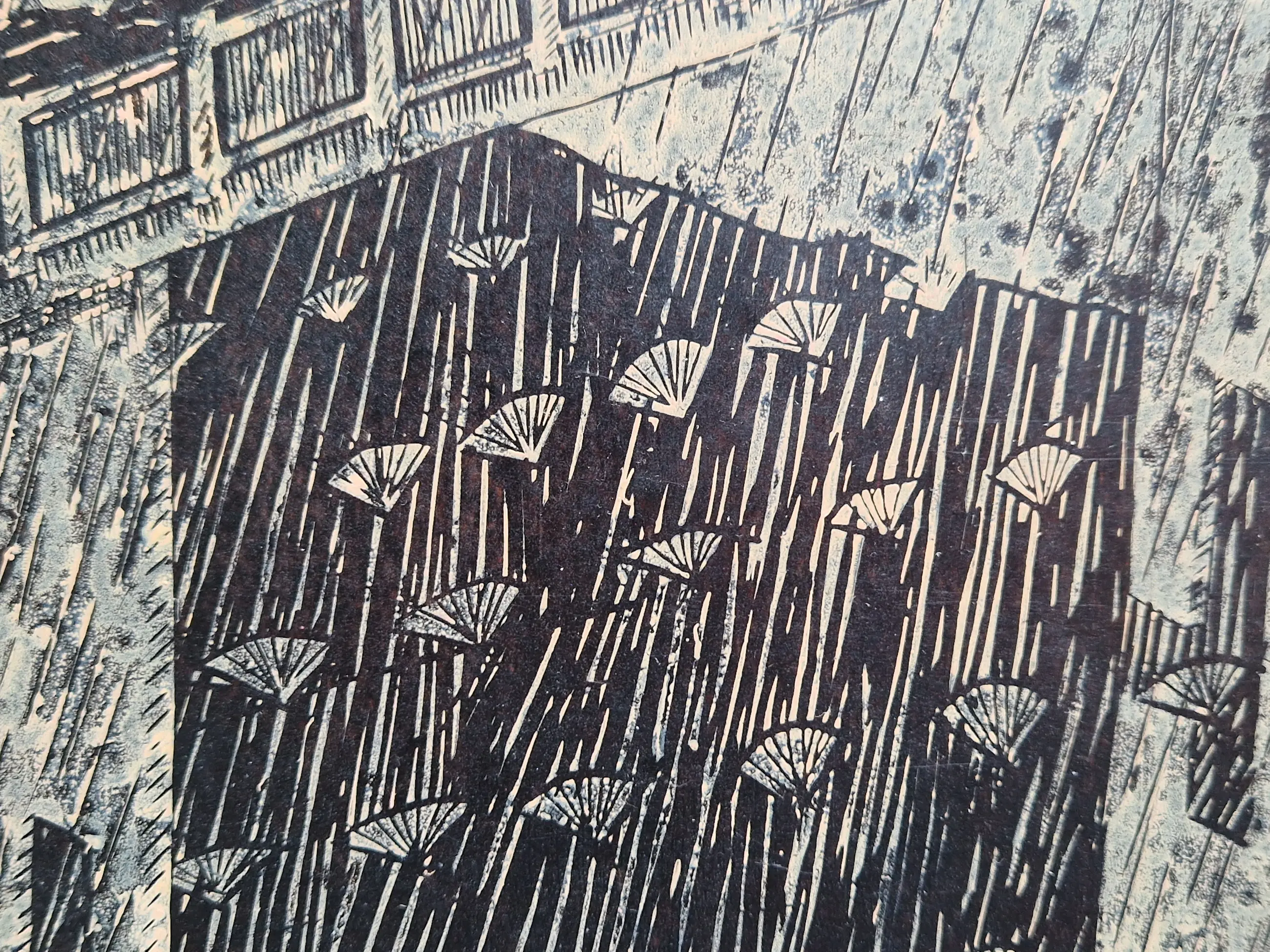 Imposante en intrigerende lino- of houtsnede van een Japanse kunstenaar. Het werk is rechtsonder gesigneerd, maar de signatuur is voor mij niet goed leesbaar (Hado - Alvar?).