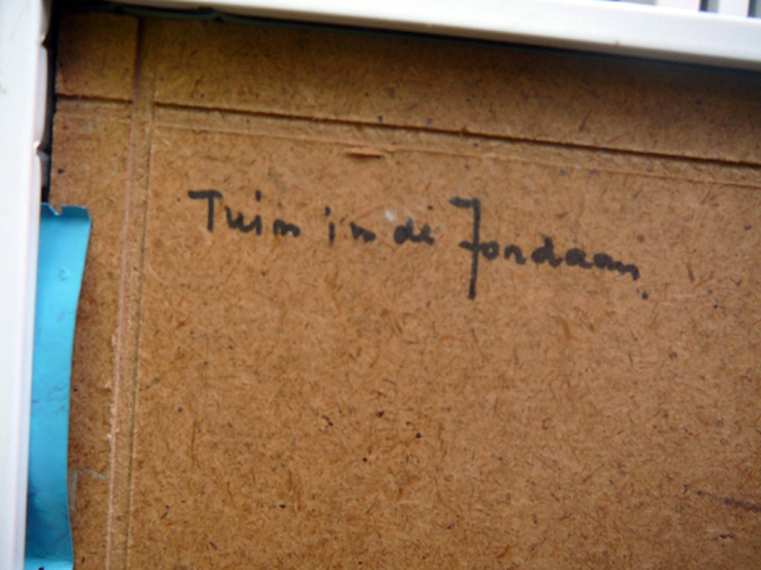 Briljante zomerse aquarel aan de achterzijde betiteld 'Tuin in de Jordaan'. De kunstenaar is mij helaas onbekend, rechtsonder onduidelijk gesigneerd. Het geheel verkeert in staat van nieuw en is voorzien van een degelijke wit gelakte alluminium wissellijst.