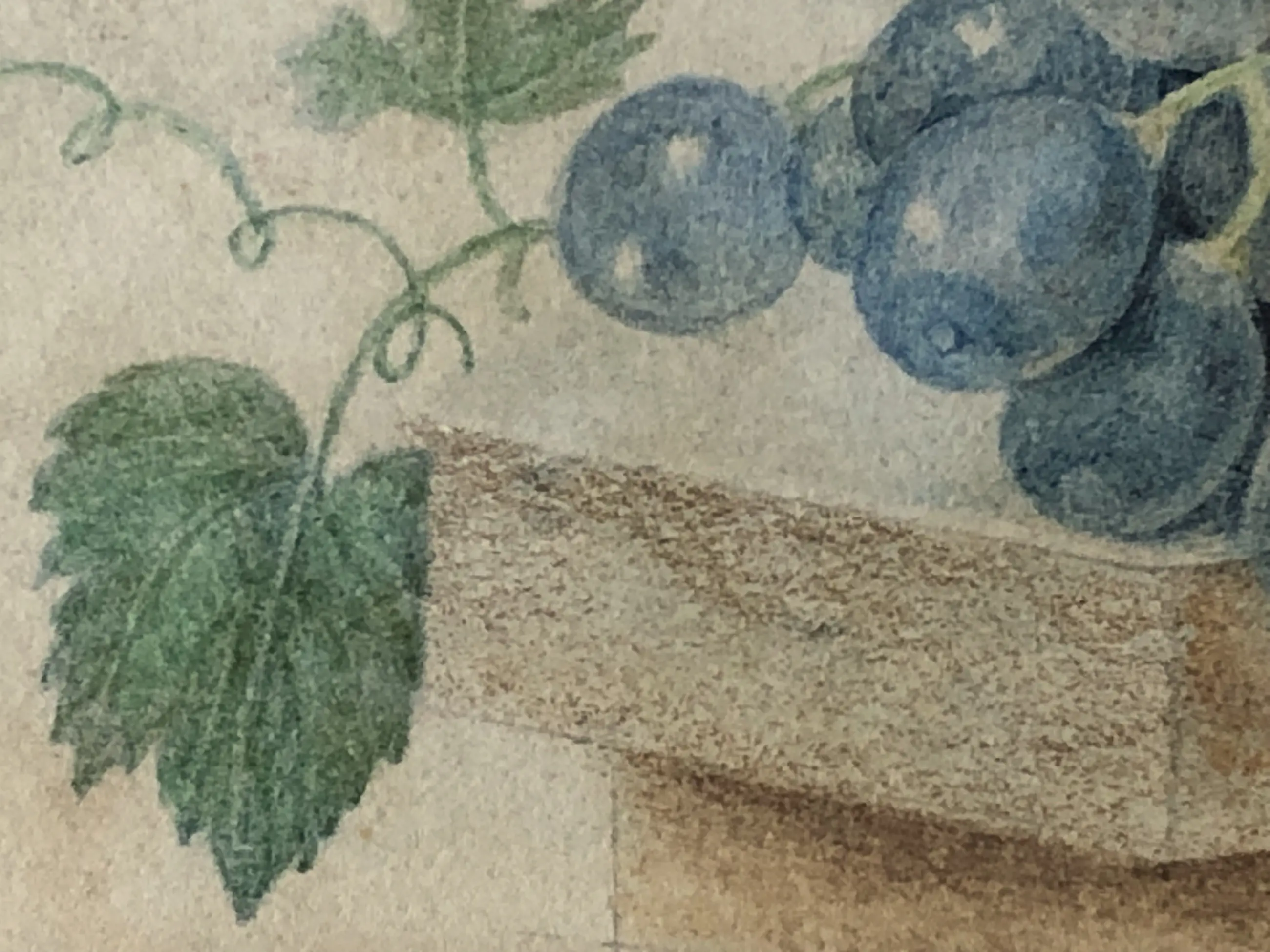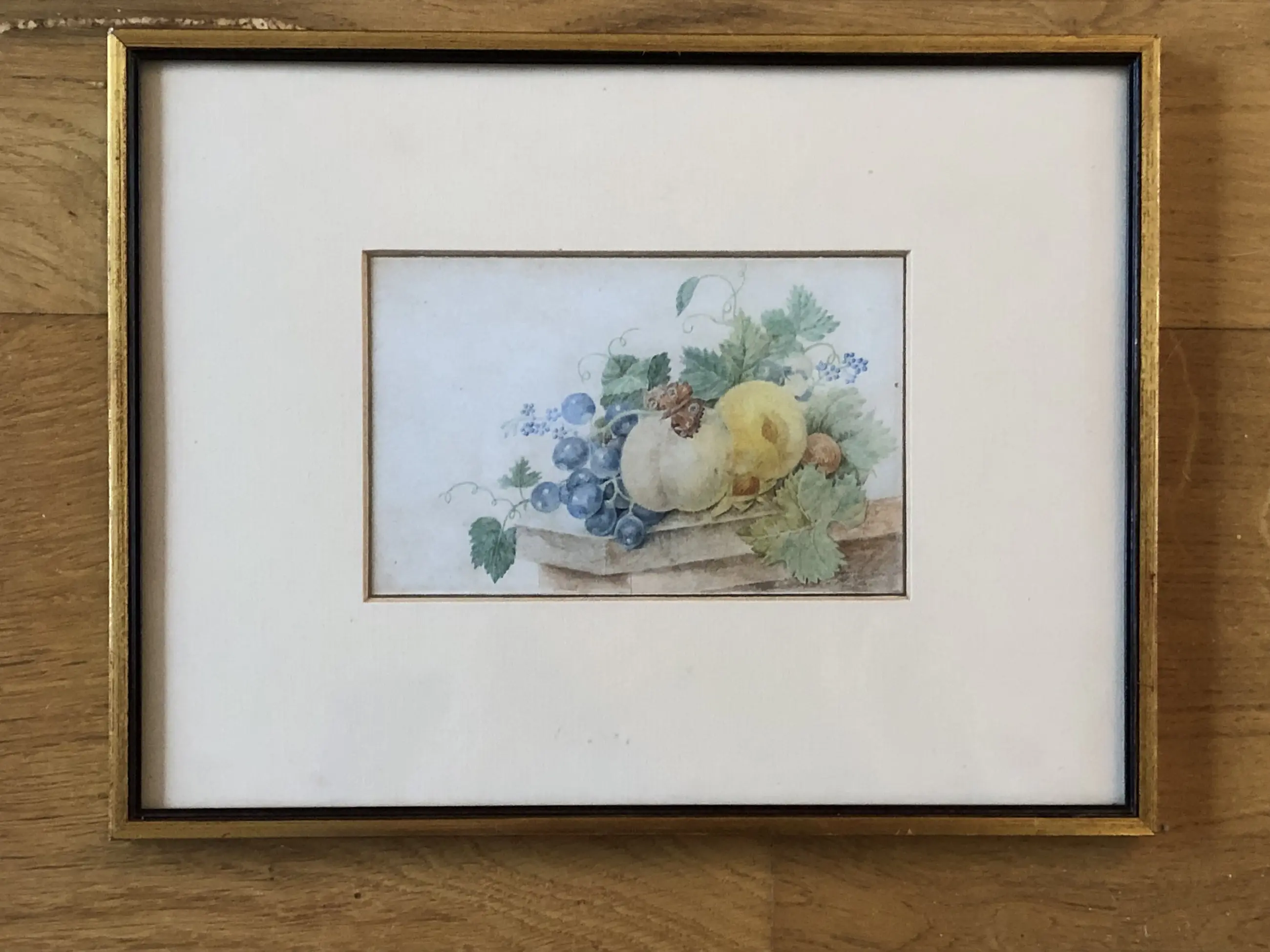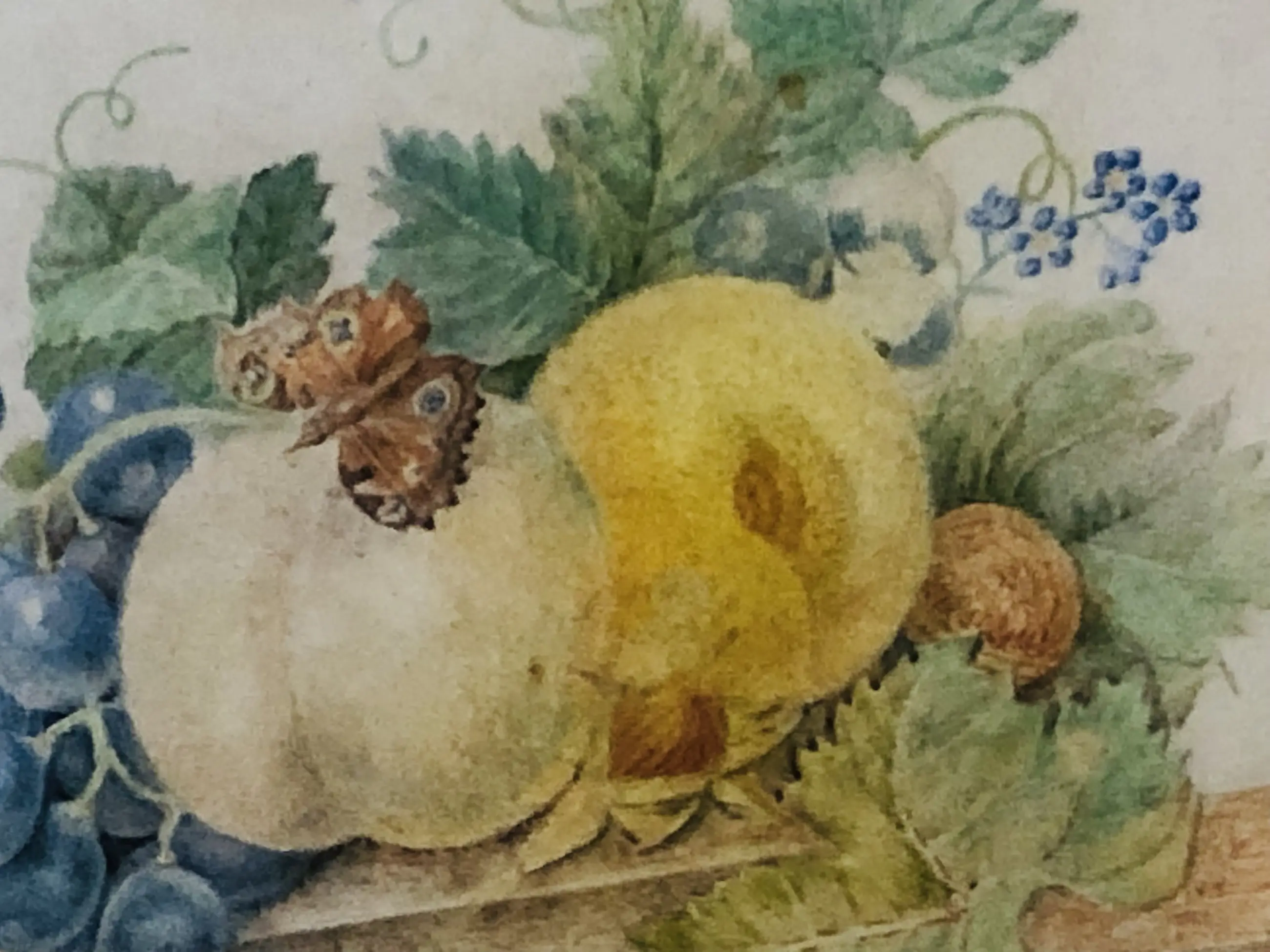 1. een stilleven met fruit en insecten in gemengde techniek van grafiet, kleurpotlood en aquarel. Afmeting 9x14 cm, lijst 20,5 x 27 cm. Enkele langere lijnen in grafiet, de meeste inkleuring en contouren in kleurpotlood, enkele toetsen in aquarel.