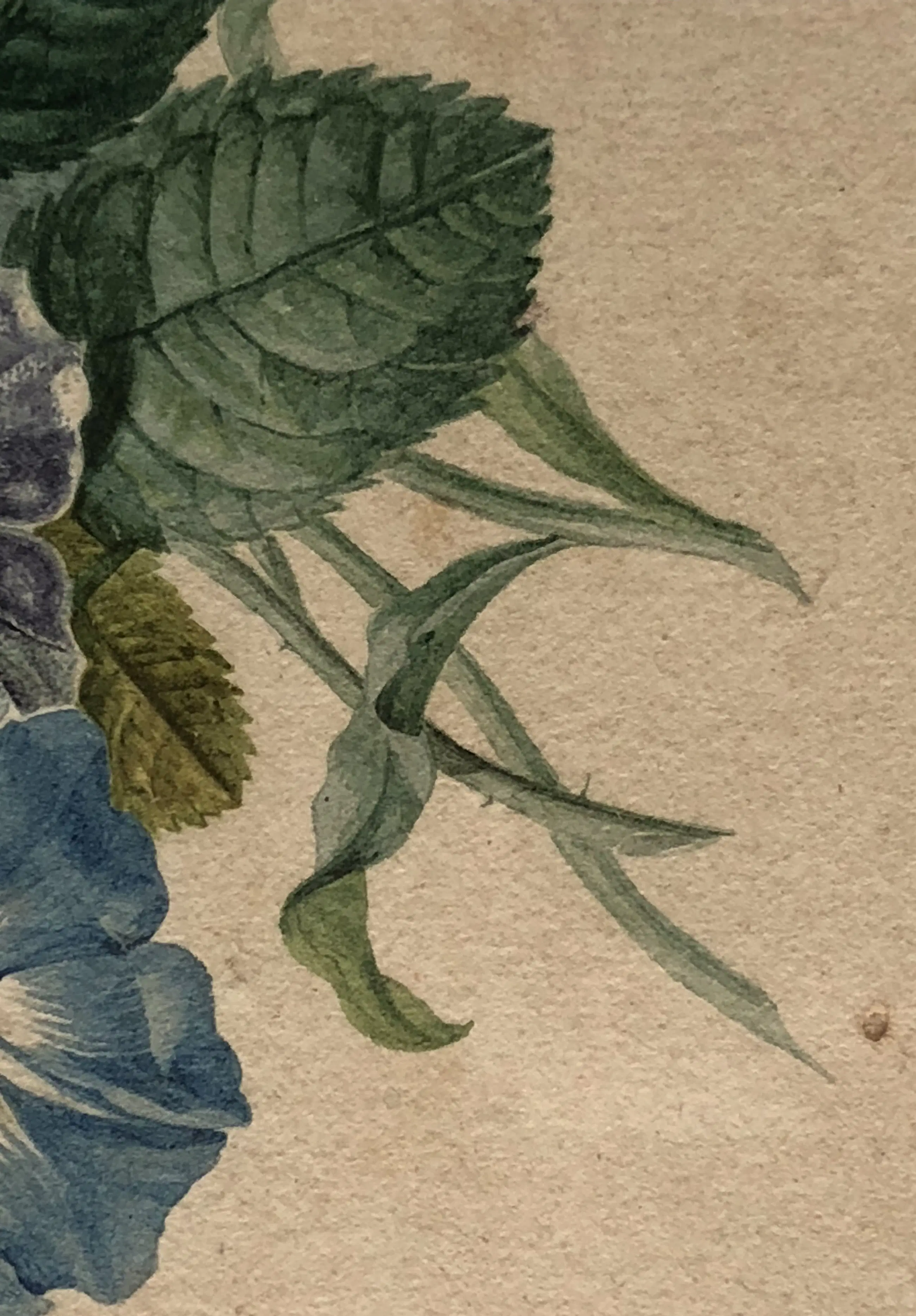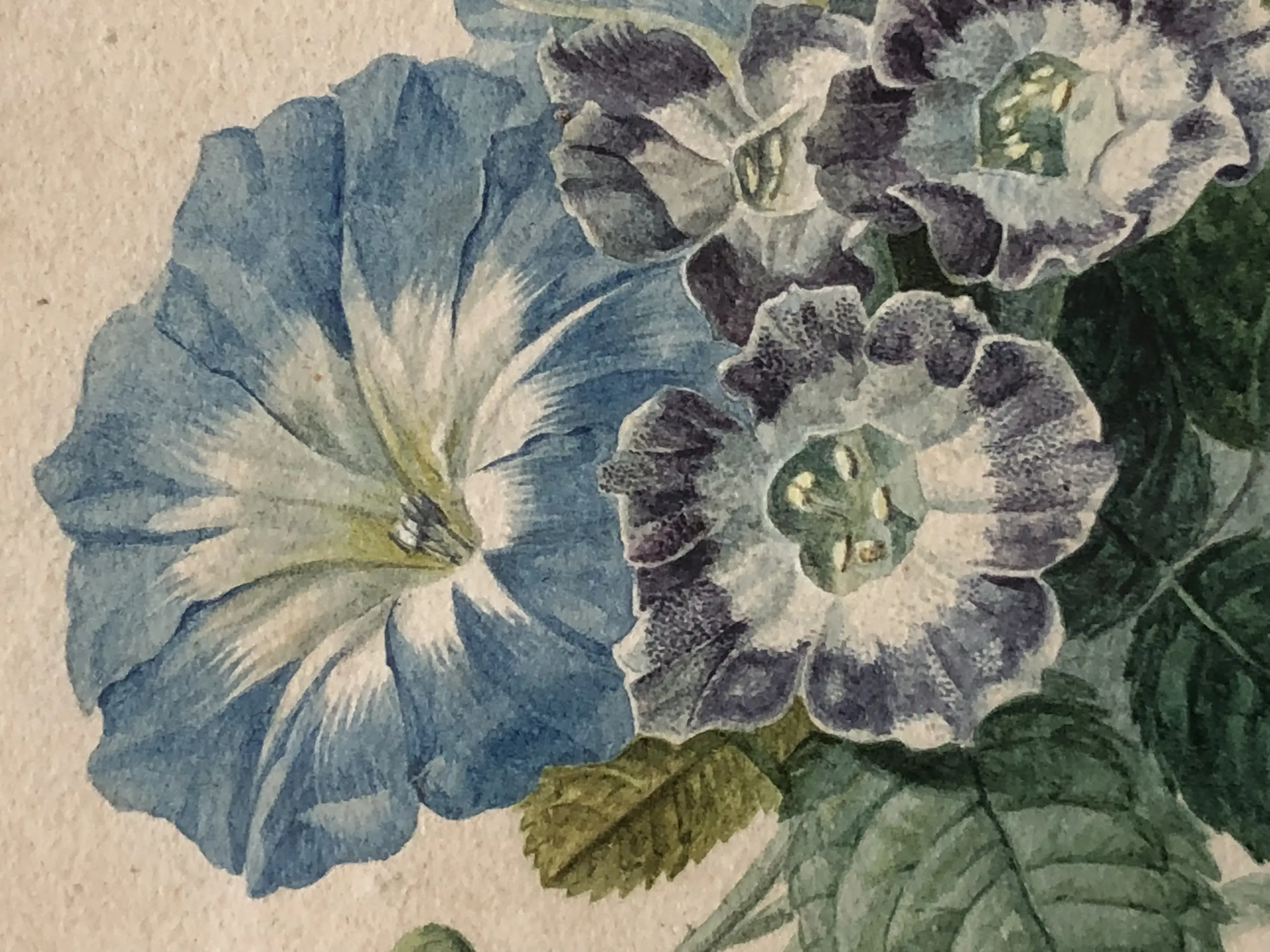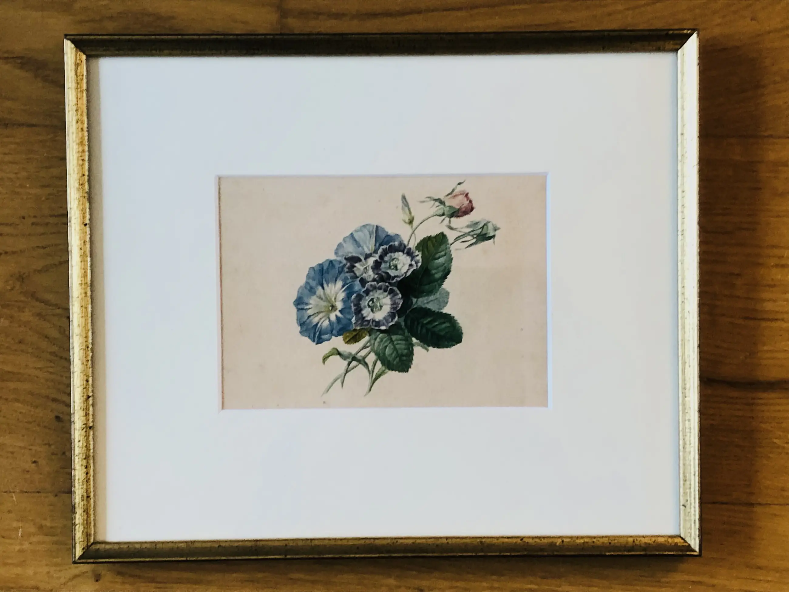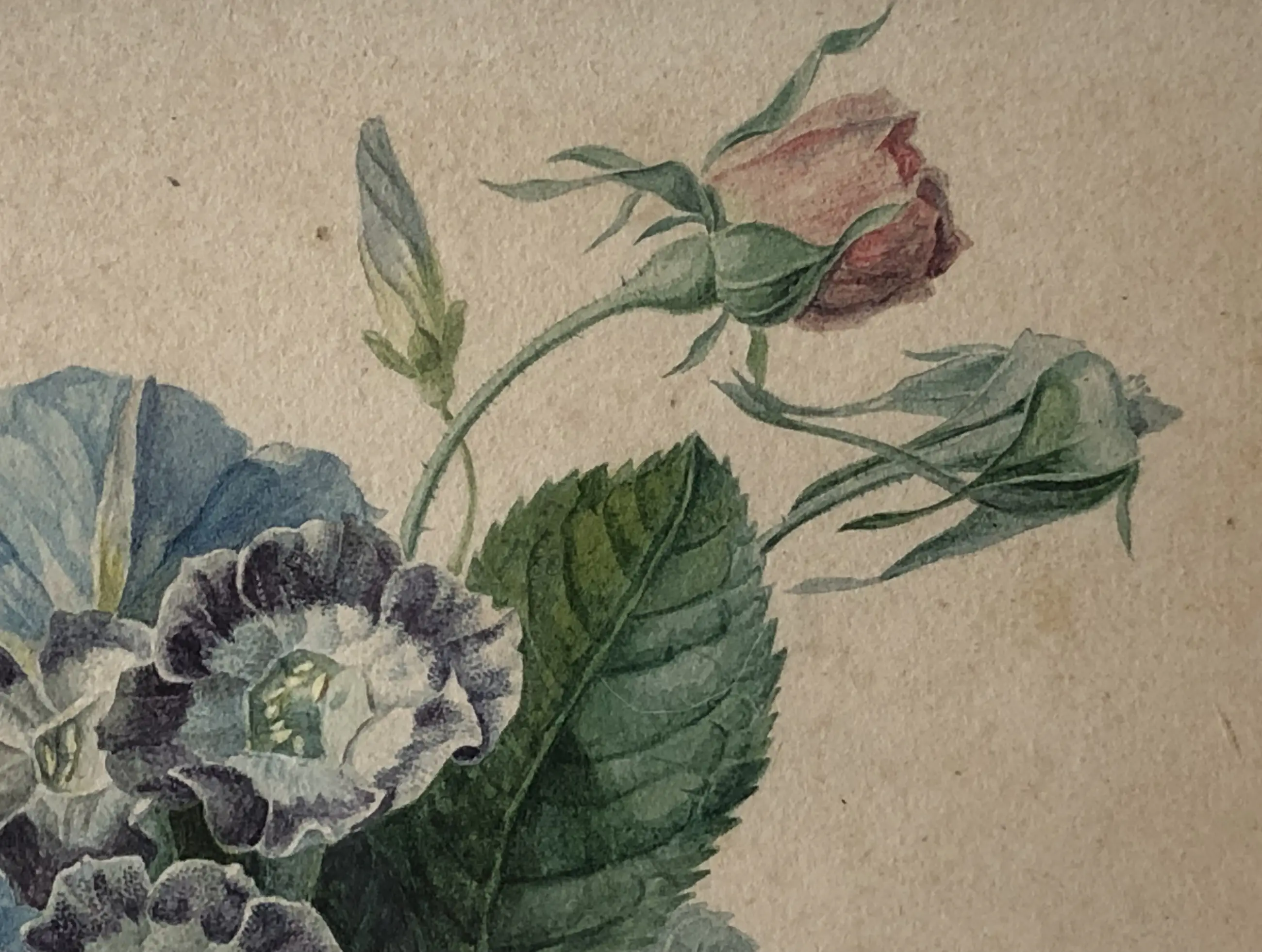 2. een bloemstilleven in aquarel. Afmeting aquarel 12x16,5 cm, lijst 26x31 cm. Zeer fijn geschilderd met uiterst dunne penseel.